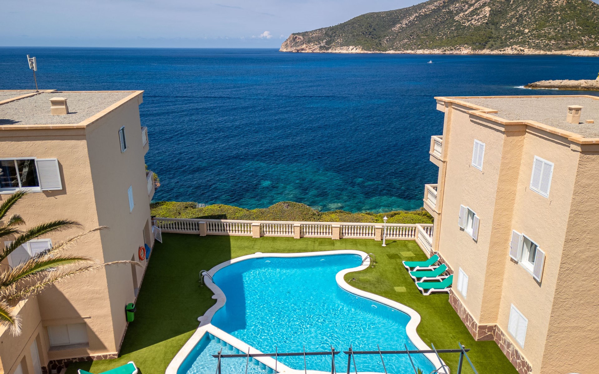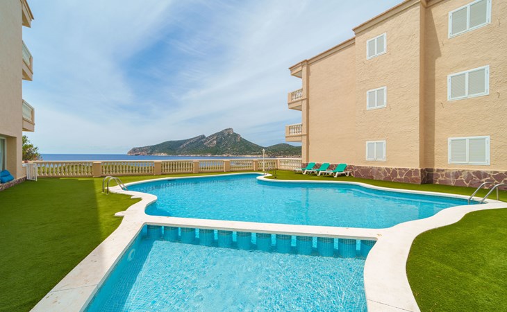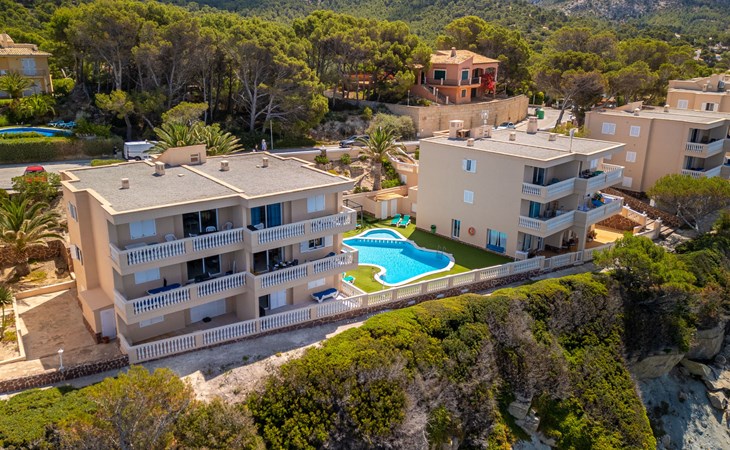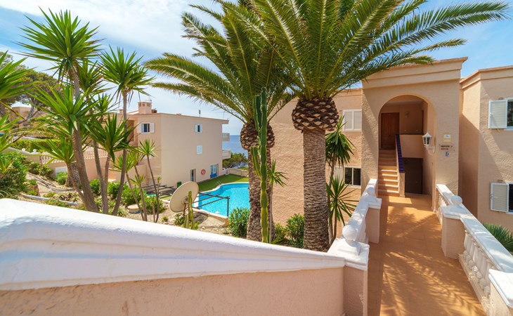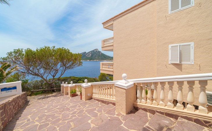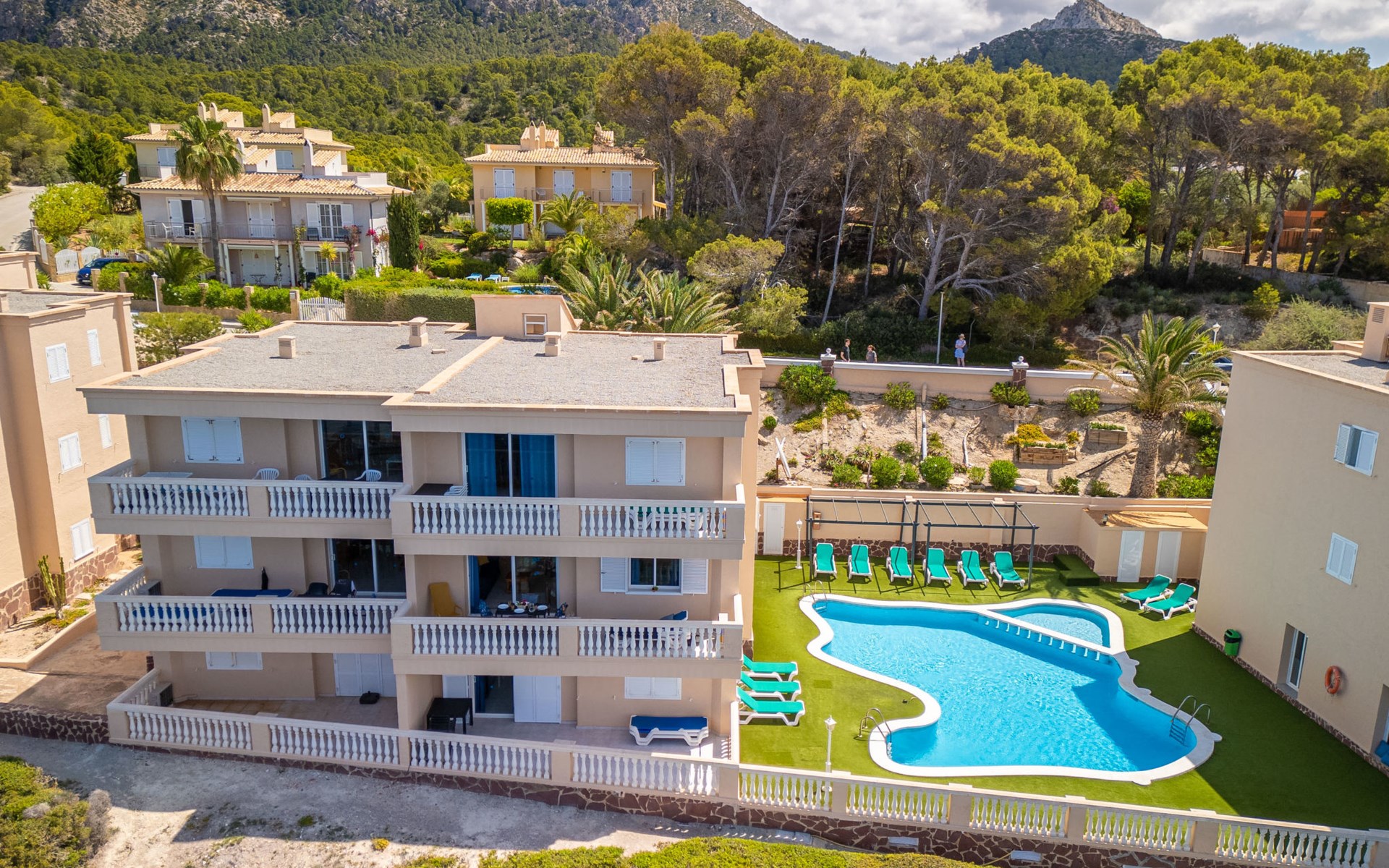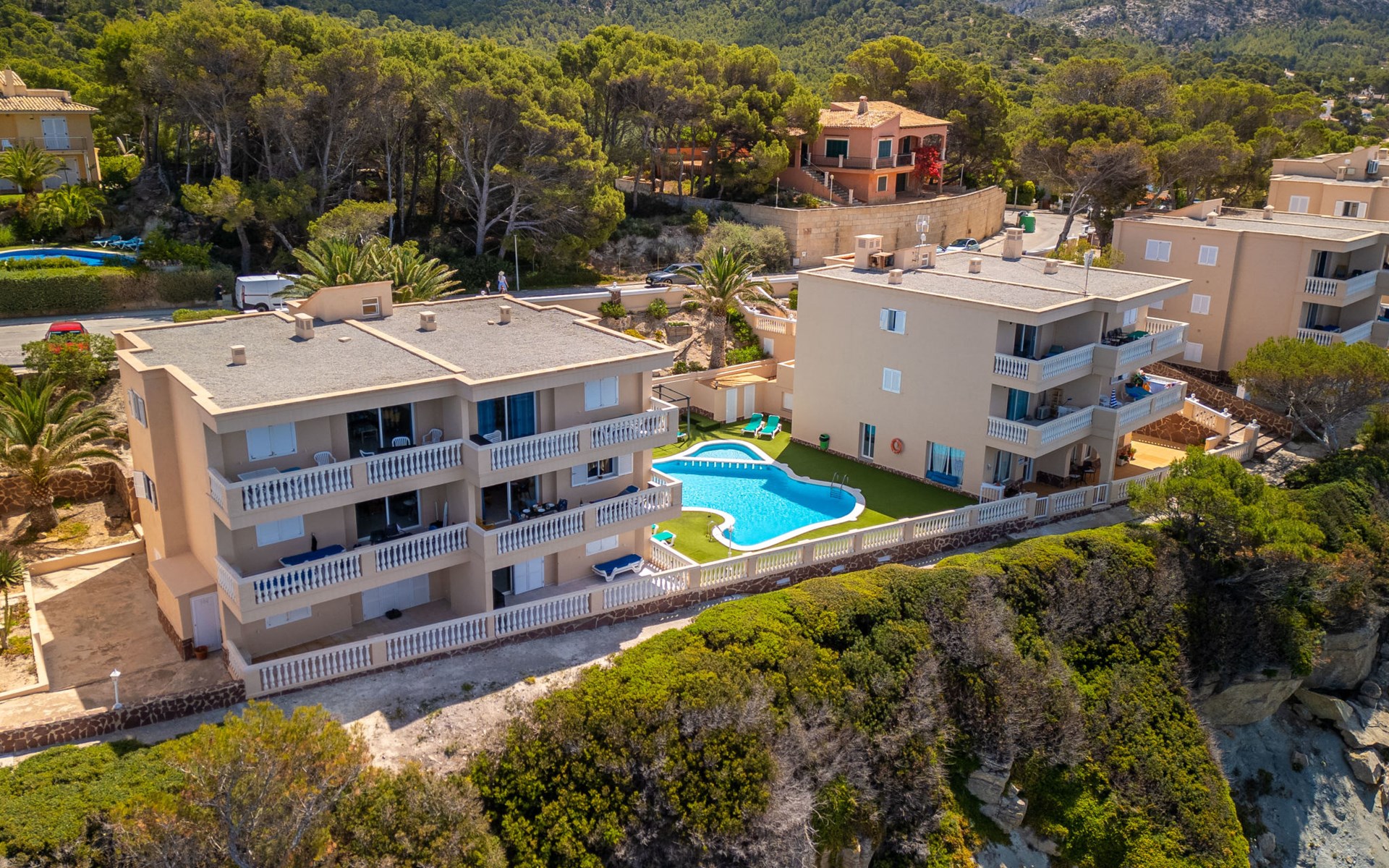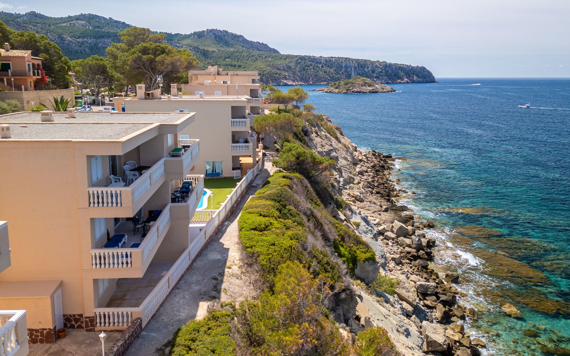 Sant Elm 10 km van Andratx: Mooi, eenvoudig vakantiecomplex "Apartamentos Amores", van 3 verdiepingen. 5 huizen in de plaats. In de plaats, 1 km van het centrum van San Telmo, aan de rand van de plaats, 11 km van het centrum van Andratx, 37 km van het centrum van Palma, zonnige ligging, 100 m van de bosrand, 15 m van zee, directe toegang tot het strand, op het zuidwesten. Voor medegebruik: openluchtzwembad (70 m2, 90 - 150 cm diepte, seizoensgebonden beschikbaarheid: 15.Mrt. - 15.Nov.). Kinderzwembad, buitendouche, onderhoud zwembad door de eigenaar/tuinman. In het complex: receptie, Internet (WiFi). Openbare parkeerplaatsen in de straat. Winkel 1 km, levensmiddelenwinkel 1 km, supermarkt 1 km, winkelcentrum 10 km, restaurant, bar 500 m, bakkerij 1 km, bushalte 1 km, zandstrand "Playa des Geperut" 1.1 km, rotsstrand "Cala s'Algar" 300 m. Jachthaven 10 km, jachthaven 10 km, golfterrein (18 holes) 30 km, surfschool 10 km, zeilschool 10 km, tennis 28 km, manege 14 km, wandelroutes 8 km vanaf het huis, fietspad 2 km. Attracties in de buurt: Galatzó 30 km, Valldemossa 50 km, Sa Dragonera 1 km. Wandelgebied La Trapa 5 km. Auto noodzakelijk.