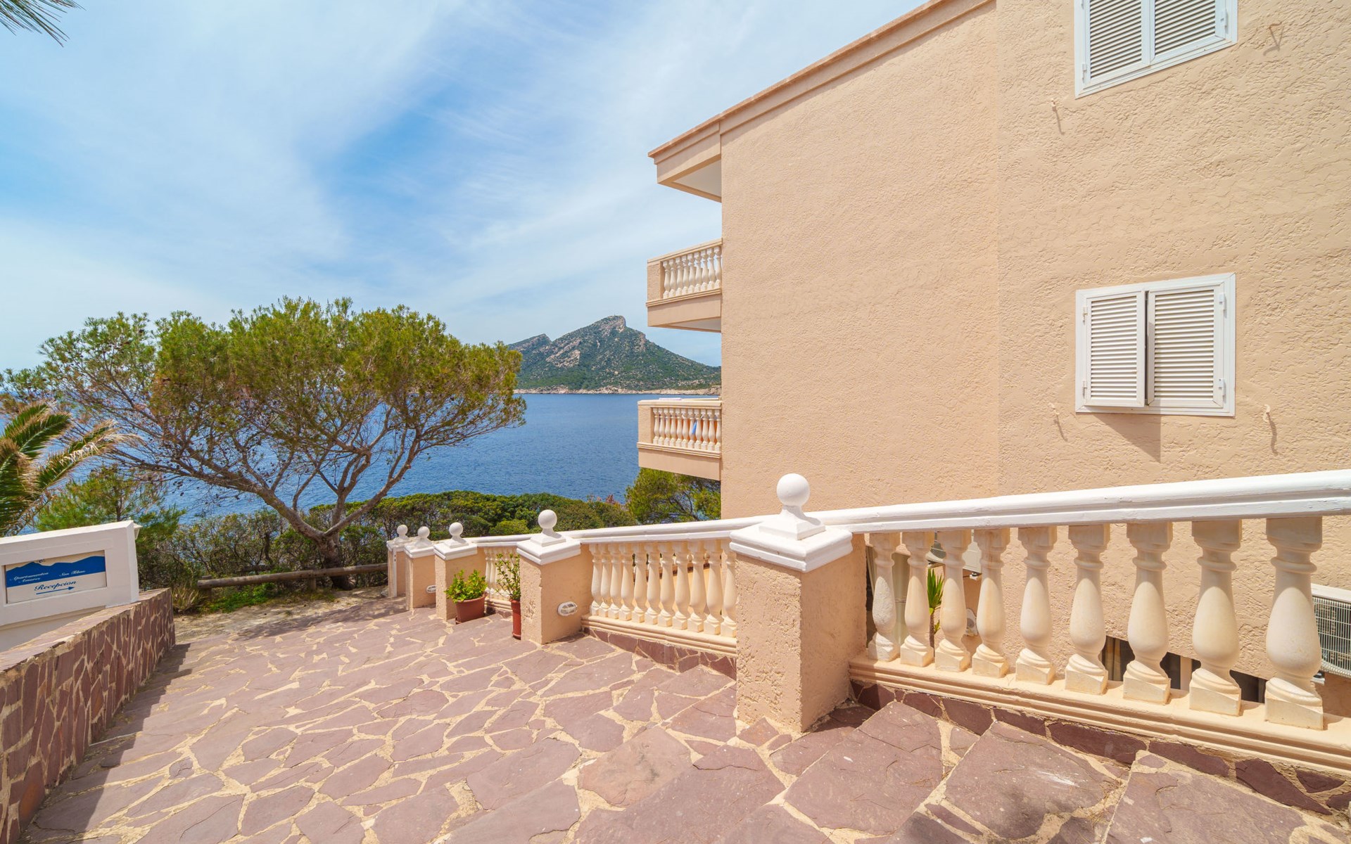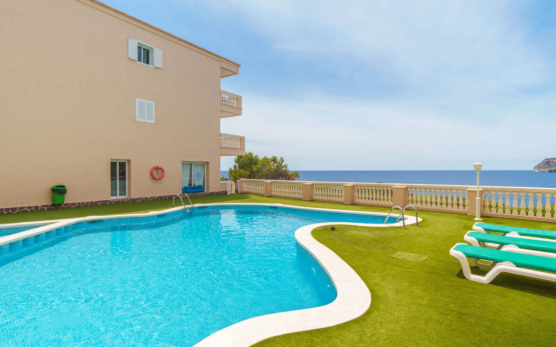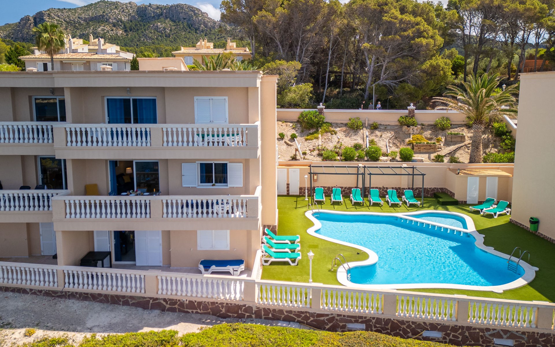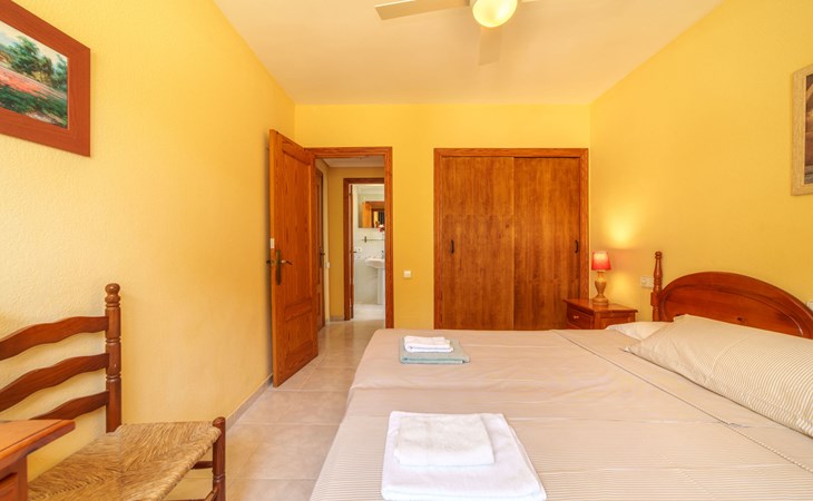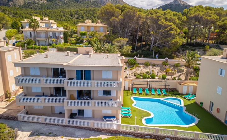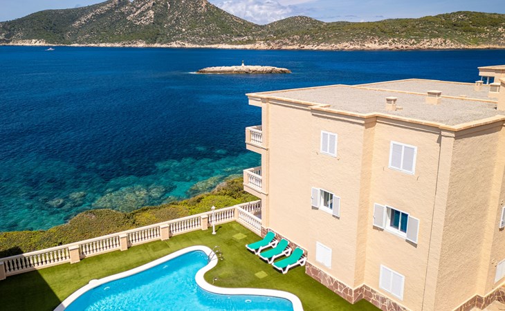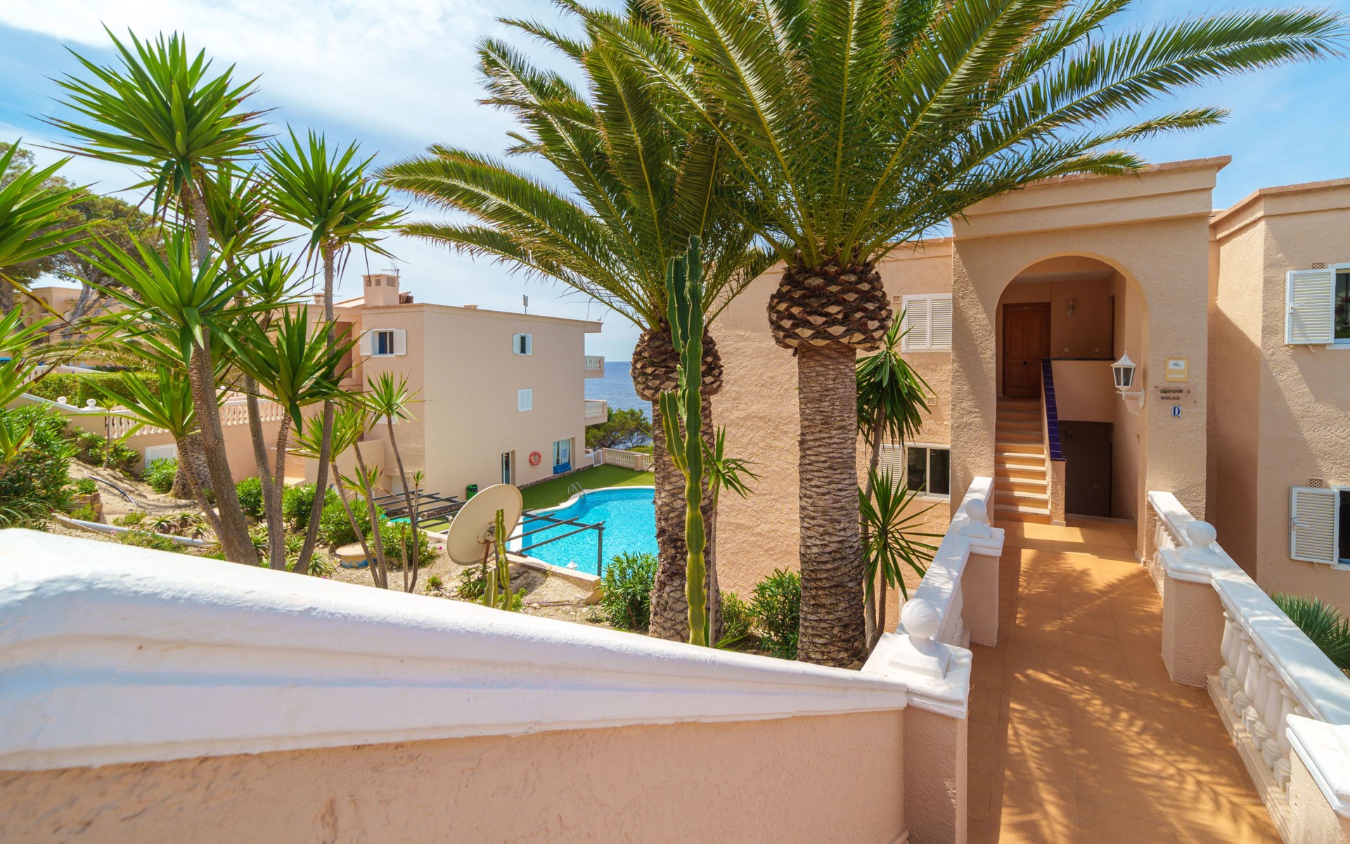 Sant Elm 10 km van Andratx: Mooi, eenvoudig vakantiecomplex "Apartamentos Amores", van 3 verdiepingen. 5 huizen in de plaats. In de plaats, 1 km van het centrum van San Telmo, aan de rand van de plaats, 11 km van het centrum van Andratx, 37 km van het centrum van Palma, zonnige ligging, 100 m van de bosrand, 15 m van zee, directe toegang tot het strand, op het zuidwesten. Voor medegebruik: openluchtzwembad (70 m2, 90 - 150 cm diepte, seizoensgebonden beschikbaarheid: 15.Mrt. - 15.Nov.). Kinderzwembad, buitendouche, onderhoud zwembad door de eigenaar/tuinman. In het complex: receptie, Internet (WiFi). Openbare parkeerplaatsen in de straat. Winkel 1 km, levensmiddelenwinkel 1 km, supermarkt 1 km, winkelcentrum 10 km, restaurant, bar 500 m, bakkerij 1 km, bushalte 1 km, zandstrand "Playa des Geperut" 1.1 km, rotsstrand "Cala s'Algar" 300 m. Jachthaven 10 km, jachthaven 10 km, golfterrein (18 holes) 30 km, surfschool 10 km, zeilschool 10 km, tennis 28 km, manege 14 km, wandelroutes 8 km vanaf het huis, fietspad 2 km. Attracties in de buurt: Galatzó 30 km, Valldemossa 50 km, Sa Dragonera 1 km. Wandelgebied La Trapa 5 km. Auto noodzakelijk.