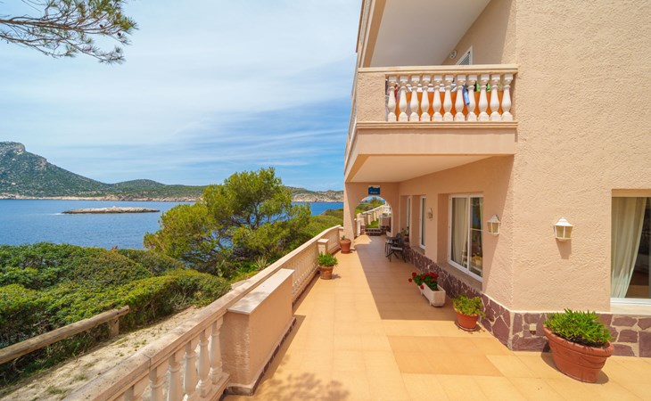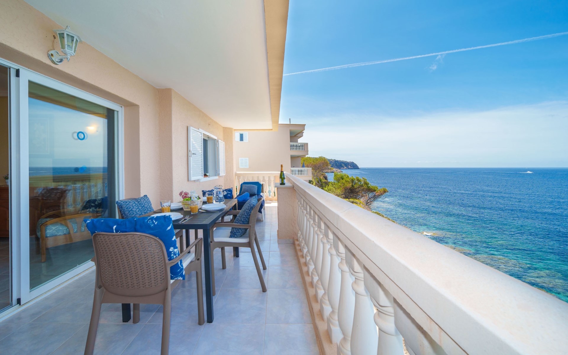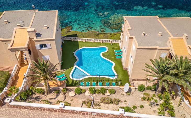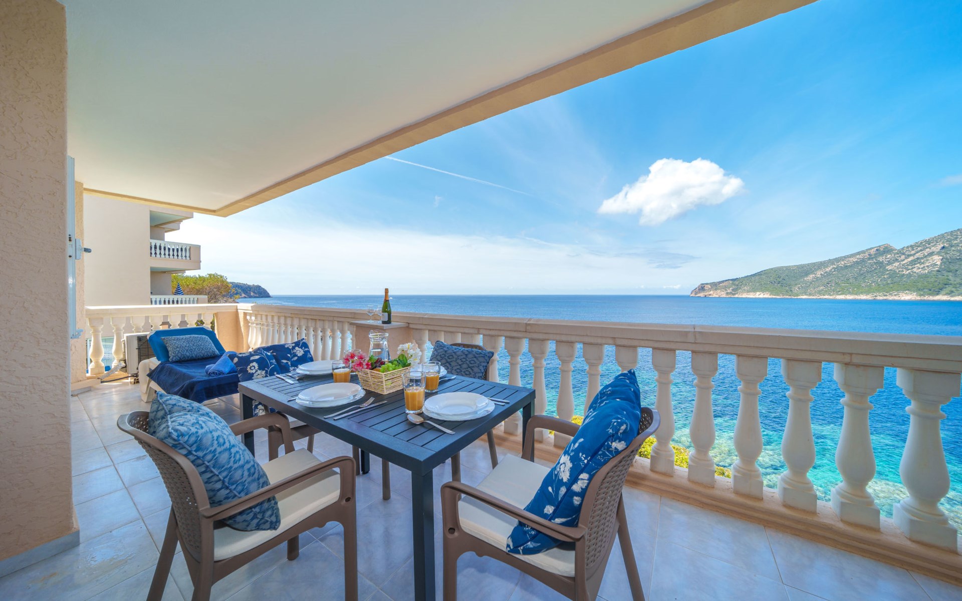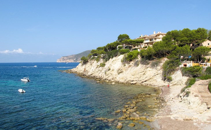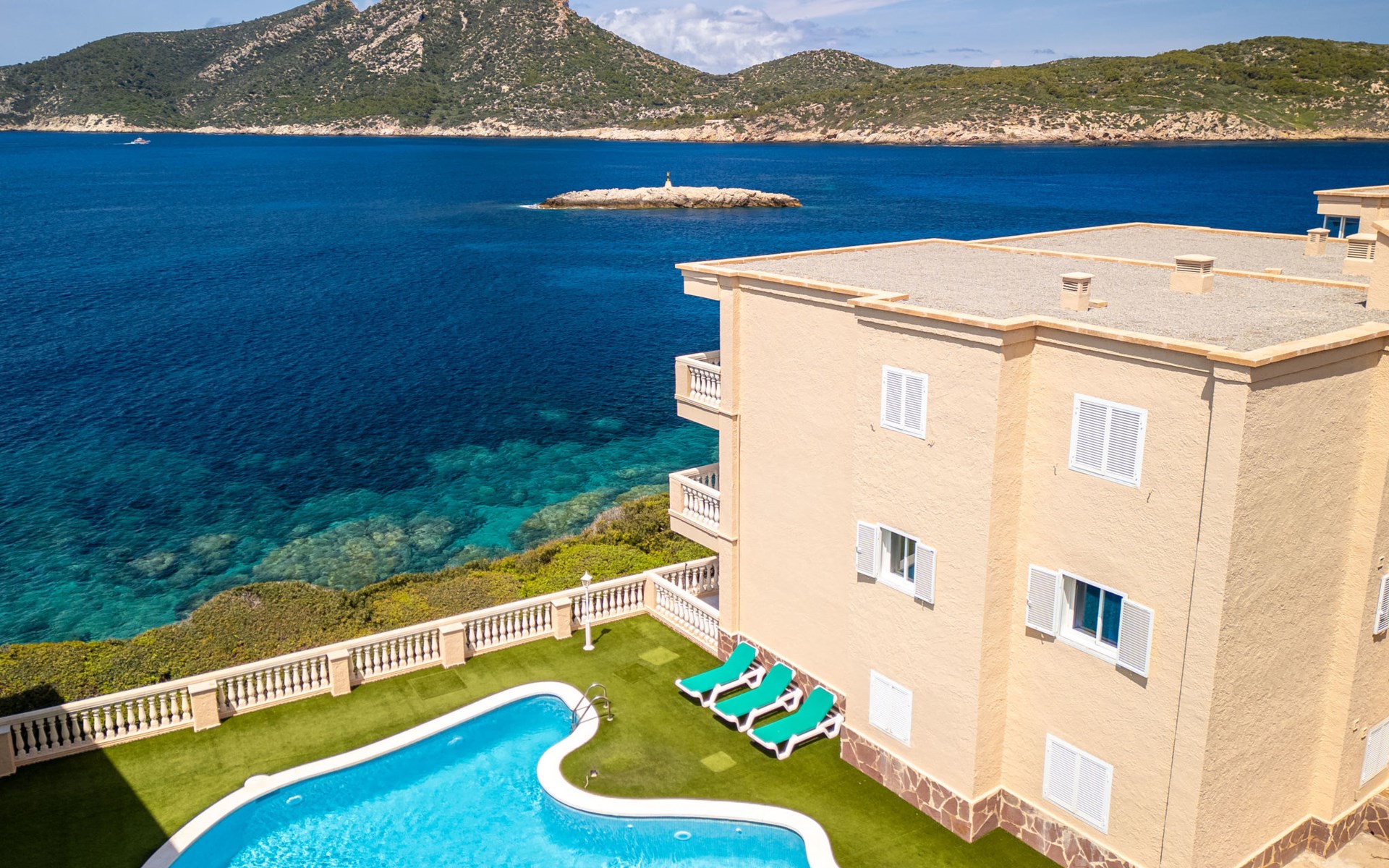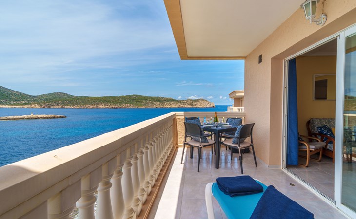 Sant Elm 10 km van Andratx: Mooi, eenvoudig vakantiecomplex "Apartamentos Amores", van 3 verdiepingen. 5 huizen in de plaats. In de plaats, 1 km van het centrum van San Telmo, aan de rand van de plaats, 11 km van het centrum van Andratx, 37 km van het centrum van Palma, zonnige ligging, 100 m van de bosrand, 15 m van zee, directe toegang tot het strand, op het zuidwesten. Voor medegebruik: openluchtzwembad (70 m2, 90 - 150 cm diepte, seizoensgebonden beschikbaarheid: 15.Mrt. - 15.Nov.). Kinderzwembad, buitendouche, onderhoud zwembad door de eigenaar/tuinman. In het complex: receptie, Internet (WiFi). Openbare parkeerplaatsen in de straat. Winkel 1 km, levensmiddelenwinkel 1 km, supermarkt 1 km, winkelcentrum 10 km, restaurant, bar 500 m, bakkerij 1 km, bushalte 1 km, zandstrand "Playa des Geperut" 1.1 km, rotsstrand "Cala s'Algar" 300 m. Jachthaven 10 km, jachthaven 10 km, golfterrein (18 holes) 30 km, surfschool 10 km, zeilschool 10 km, tennis 28 km, manege 14 km, wandelroutes 8 km vanaf het huis, fietspad 2 km. Attracties in de buurt: Galatzó 30 km, Valldemossa 50 km, Sa Dragonera 1 km. Wandelgebied La Trapa 5 km. Auto noodzakelijk.