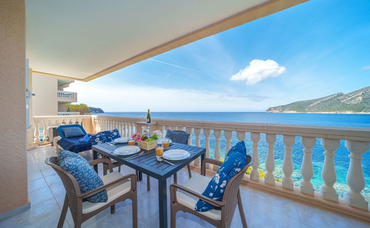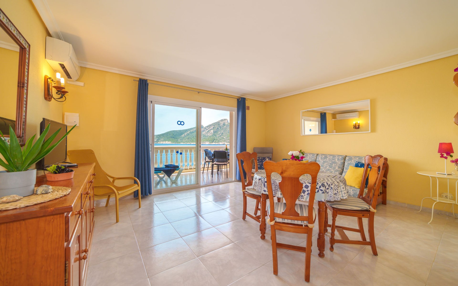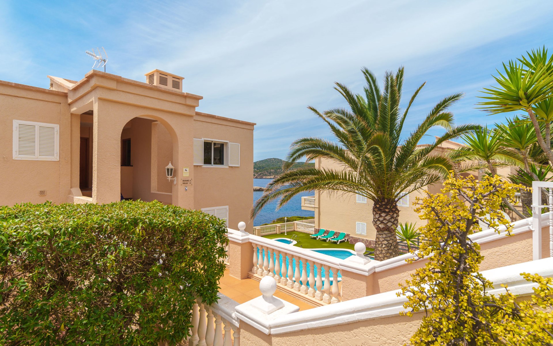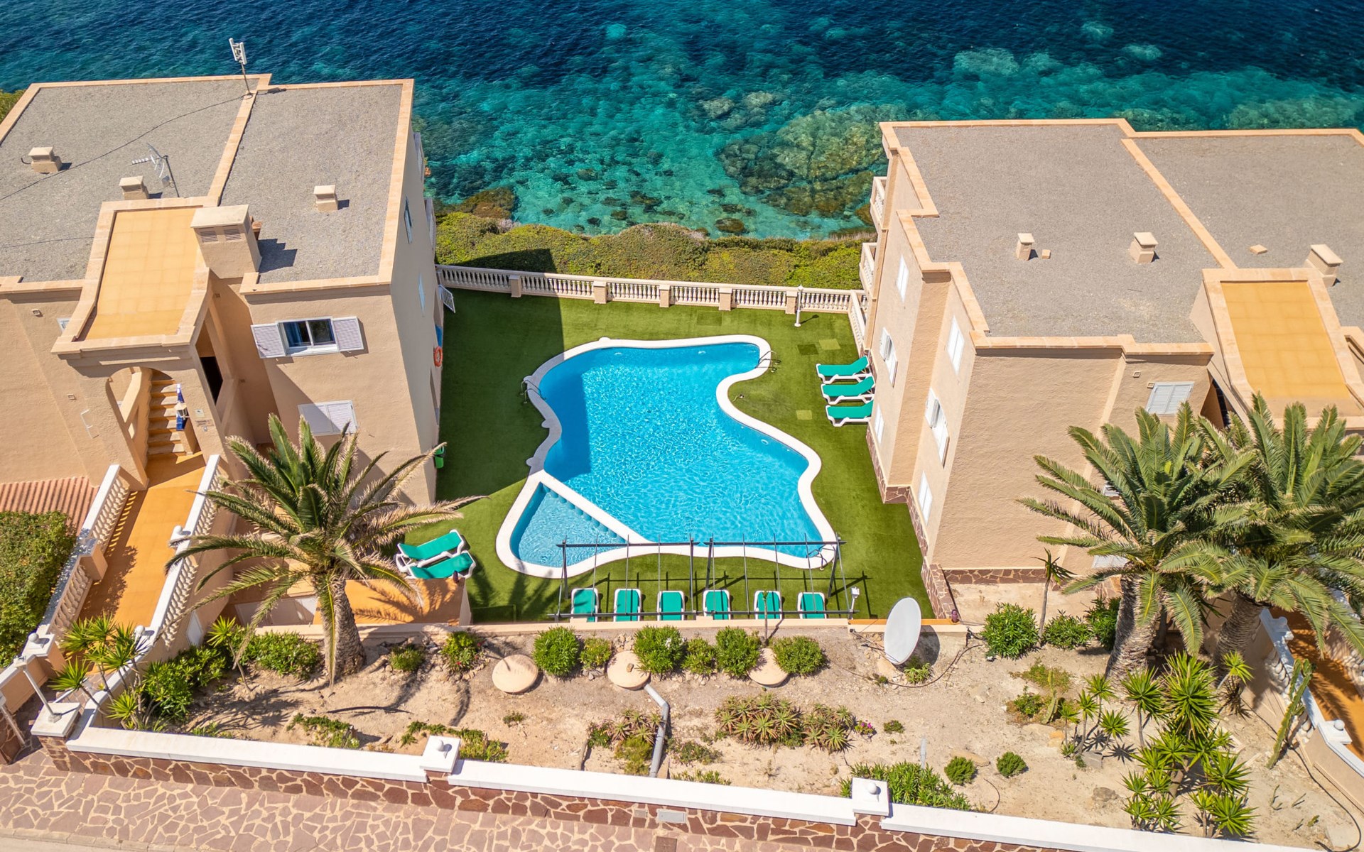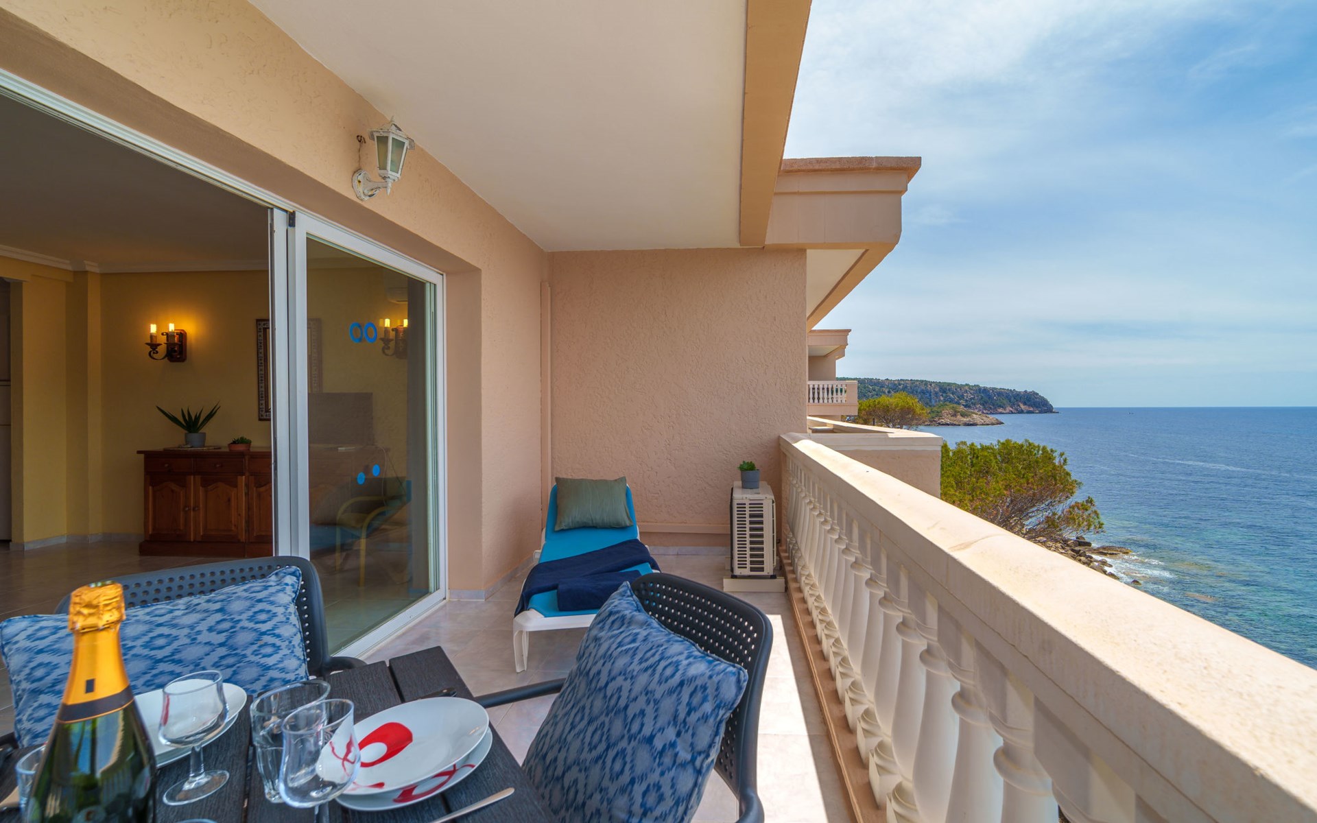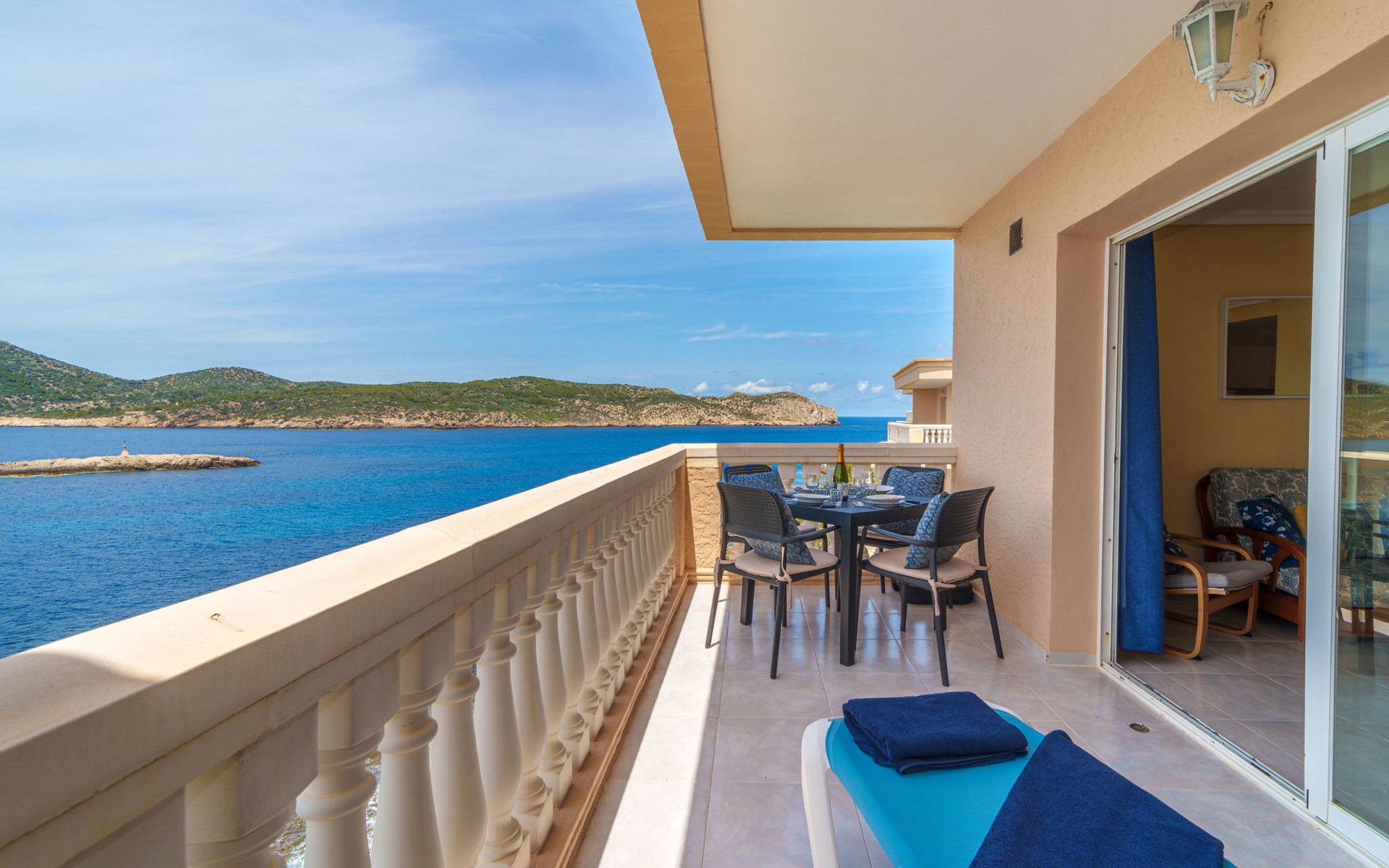 Sant Elm 10 km van Andratx: Mooi, eenvoudig vakantiecomplex "Apartamentos Amores", van 3 verdiepingen. 5 huizen in de plaats. In de plaats, 1 km van het centrum van San Telmo, aan de rand van de plaats, 11 km van het centrum van Andratx, 37 km van het centrum van Palma, zonnige ligging, 100 m van de bosrand, 15 m van zee, directe toegang tot het strand, op het zuidwesten. Voor medegebruik: openluchtzwembad (70 m2, 90 - 150 cm diepte, seizoensgebonden beschikbaarheid: 15.Mrt. - 15.Nov.). Kinderzwembad, buitendouche, onderhoud zwembad door de eigenaar/tuinman. In het complex: receptie, Internet (WiFi). Openbare parkeerplaatsen in de straat. Winkel 1 km, levensmiddelenwinkel 1 km, supermarkt 1 km, winkelcentrum 10 km, restaurant, bar 500 m, bakkerij 1 km, bushalte 1 km, zandstrand "Playa des Geperut" 1.1 km, rotsstrand "Cala s'Algar" 300 m. Jachthaven 10 km, jachthaven 10 km, golfterrein (18 holes) 30 km, surfschool 10 km, zeilschool 10 km, tennis 28 km, manege 14 km, wandelroutes 8 km vanaf het huis, fietspad 2 km. Attracties in de buurt: Galatzó 30 km, Valldemossa 50 km, Sa Dragonera 1 km. Wandelgebied La Trapa 5 km. Auto noodzakelijk.
