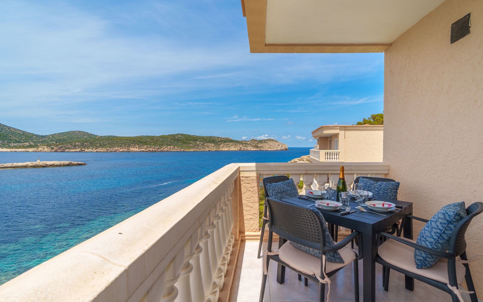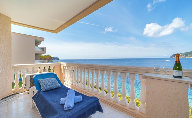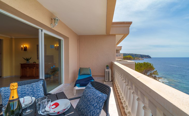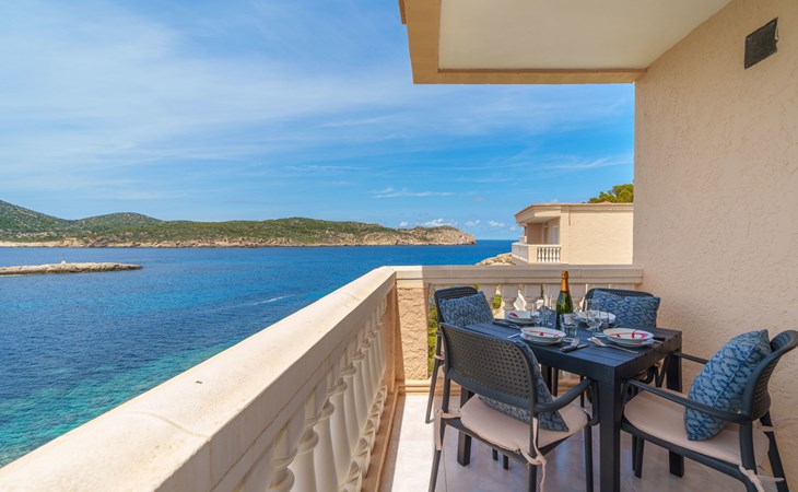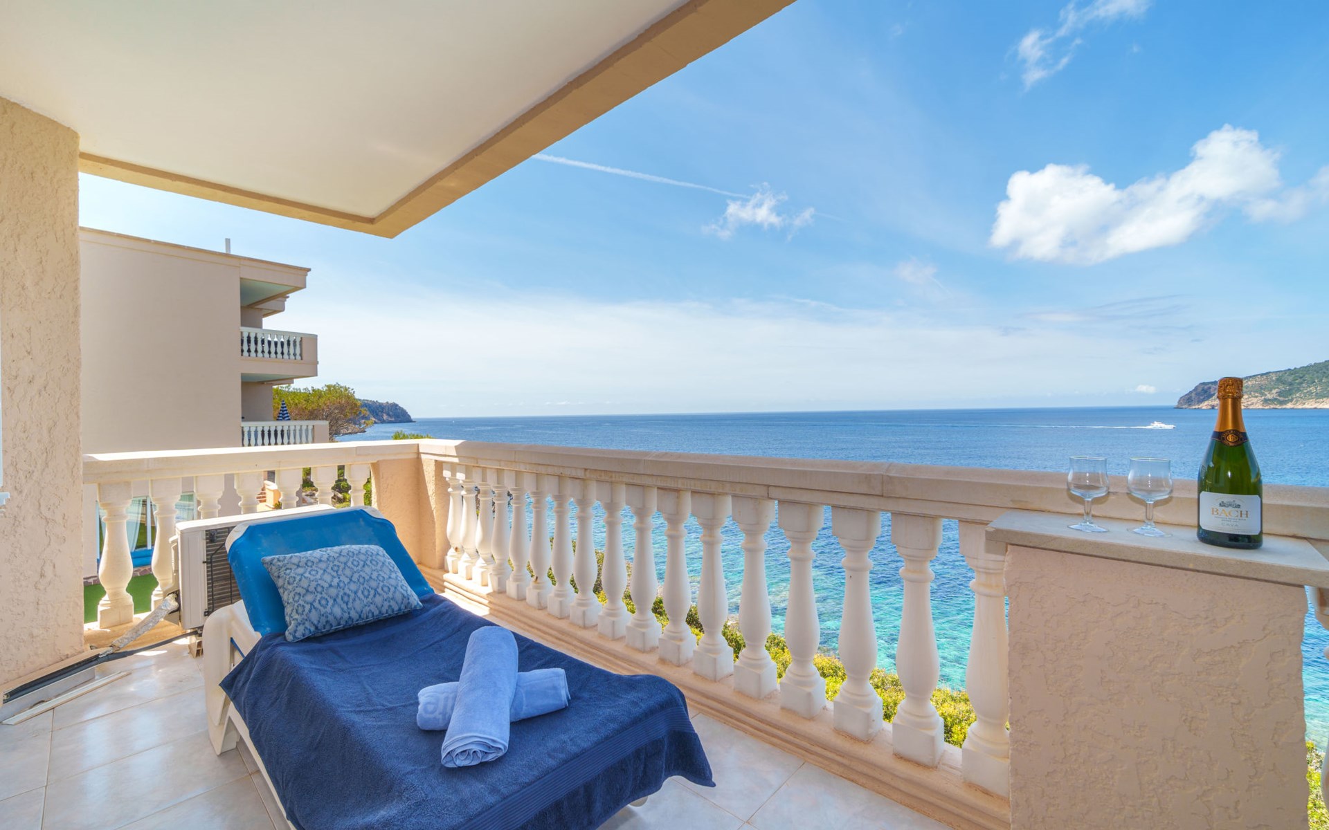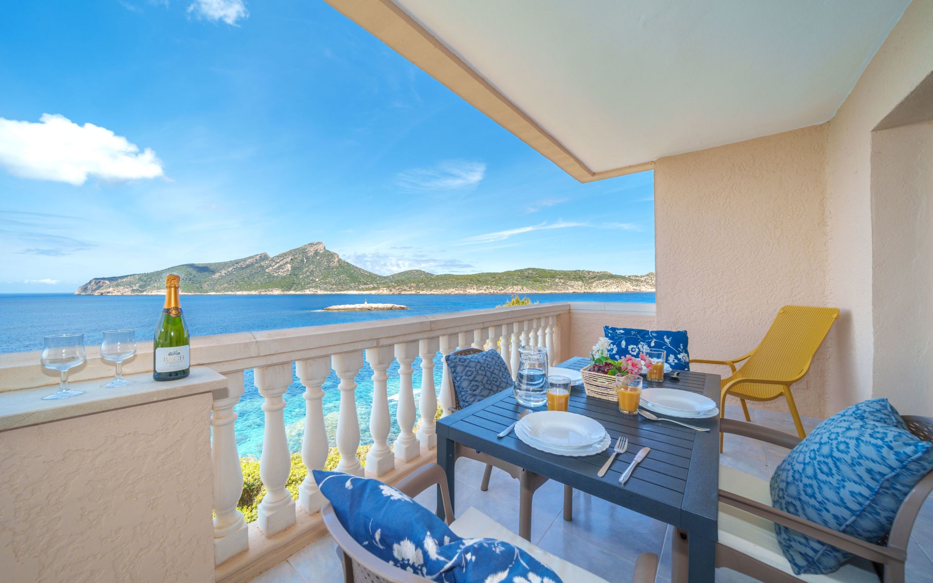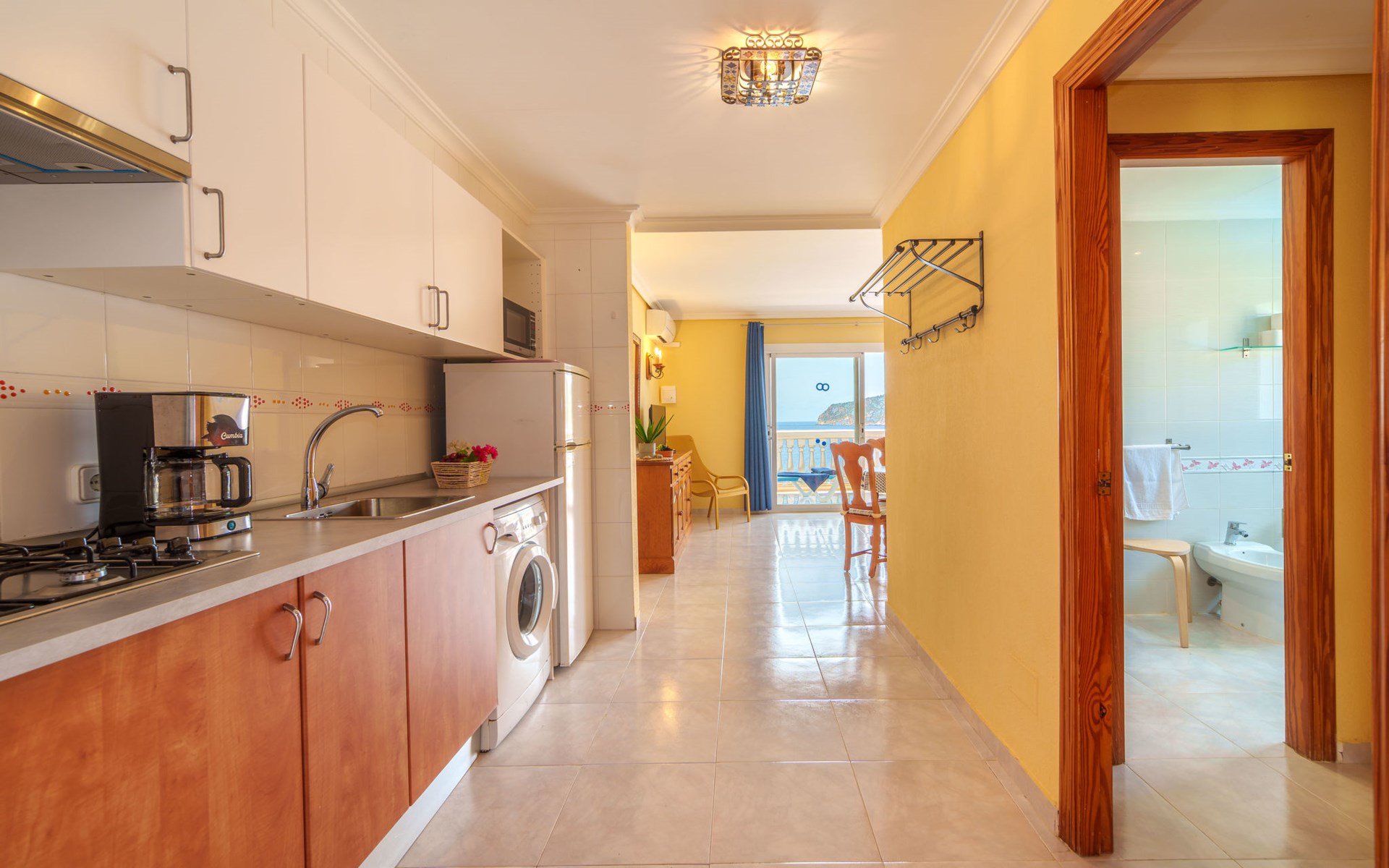 Sant Elm 10 km van Andratx: Mooi, eenvoudig vakantiecomplex "Apartamentos Amores", van 3 verdiepingen. 5 huizen in de plaats. In de plaats, 1 km van het centrum van San Telmo, aan de rand van de plaats, 11 km van het centrum van Andratx, 37 km van het centrum van Palma, zonnige ligging, 100 m van de bosrand, 15 m van zee, directe toegang tot het strand, op het zuidwesten. Voor medegebruik: openluchtzwembad (70 m2, 90 - 150 cm diepte, seizoensgebonden beschikbaarheid: 15.Mrt. - 15.Nov.). Kinderzwembad, buitendouche, onderhoud zwembad door de eigenaar/tuinman. In het complex: receptie, Internet (WiFi). Openbare parkeerplaatsen in de straat. Winkel 1 km, levensmiddelenwinkel 1 km, supermarkt 1 km, winkelcentrum 10 km, restaurant, bar 500 m, bakkerij 1 km, bushalte 1 km, zandstrand "Playa des Geperut" 1.1 km, rotsstrand "Cala s'Algar" 300 m. Jachthaven 10 km, jachthaven 10 km, golfterrein (18 holes) 30 km, surfschool 10 km, zeilschool 10 km, tennis 28 km, manege 14 km, wandelroutes 8 km vanaf het huis, fietspad 2 km. Attracties in de buurt: Galatzó 30 km, Valldemossa 50 km, Sa Dragonera 1 km. Wandelgebied La Trapa 5 km. Auto noodzakelijk.