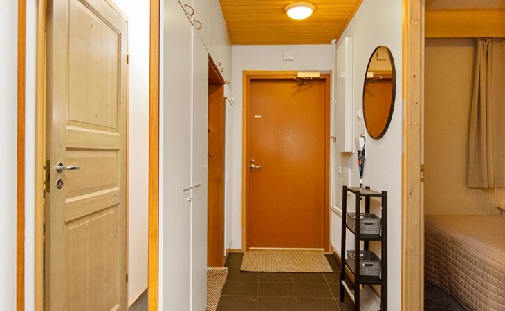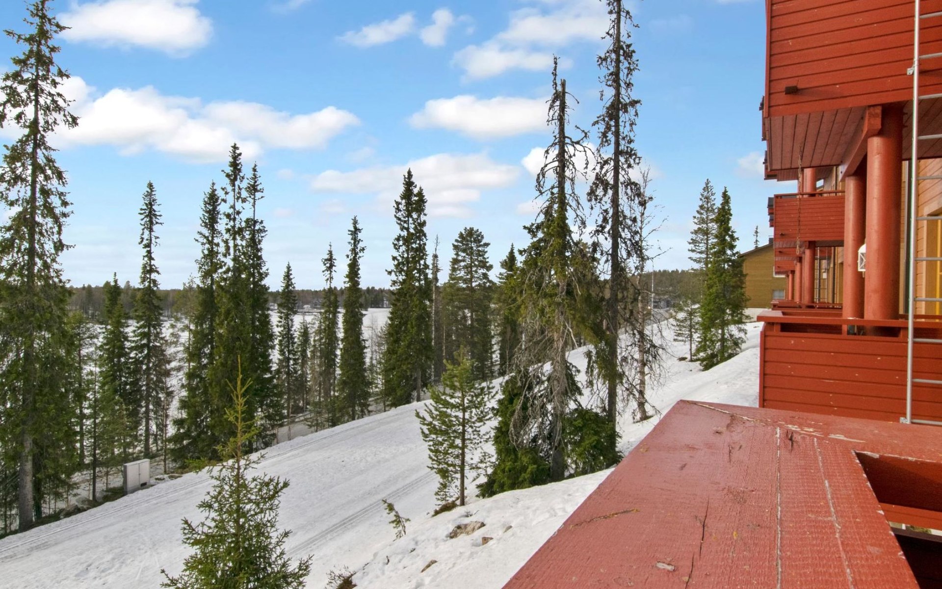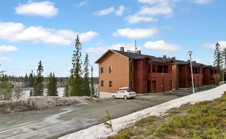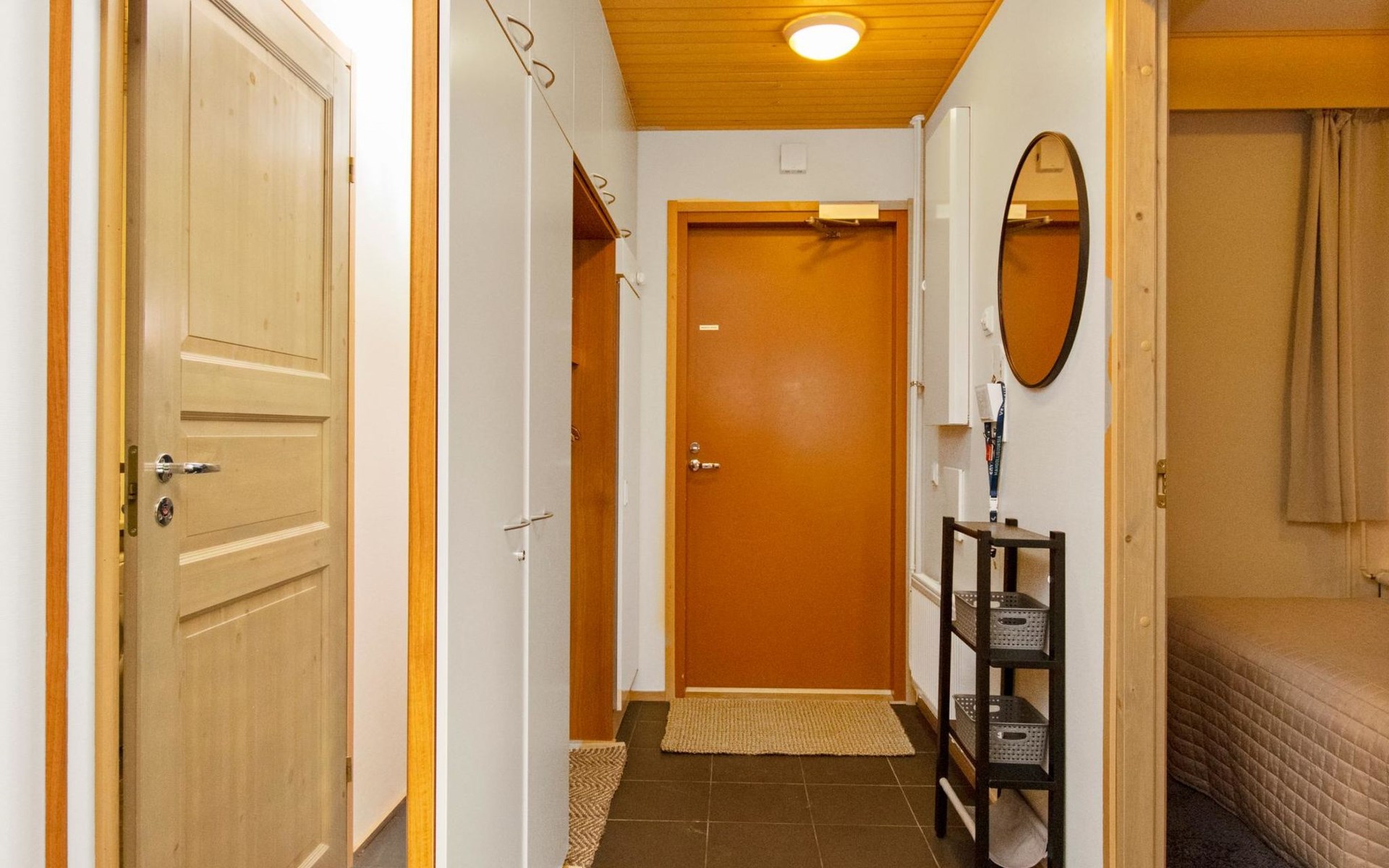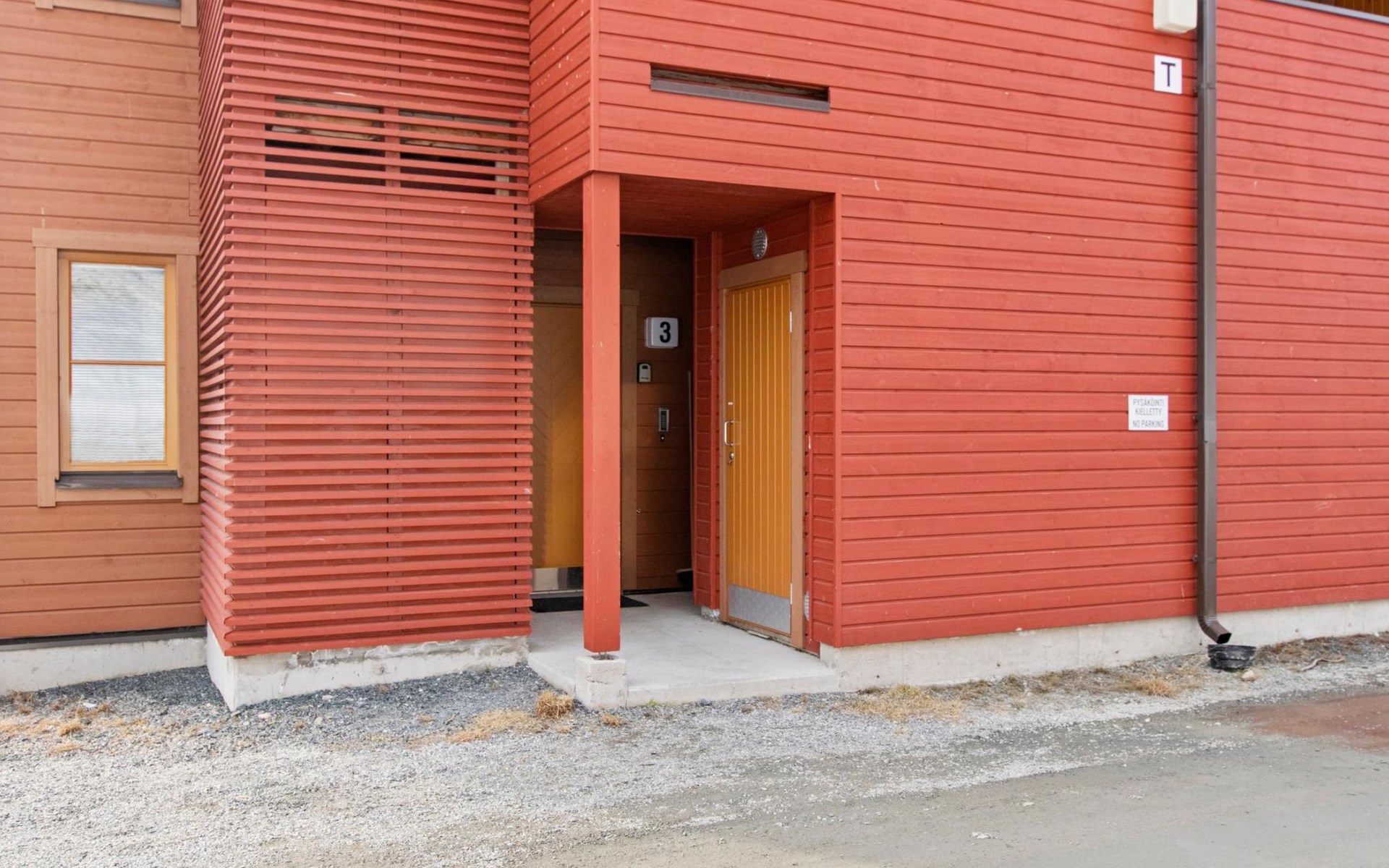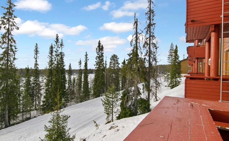 The apartment is an apartment on the ground floor of a 2-story building, with a view from the windows and a small balcony facing Talvijärvi.