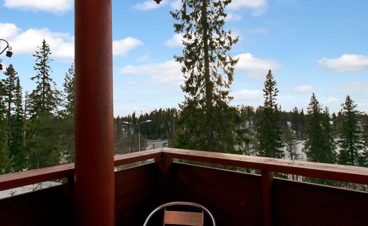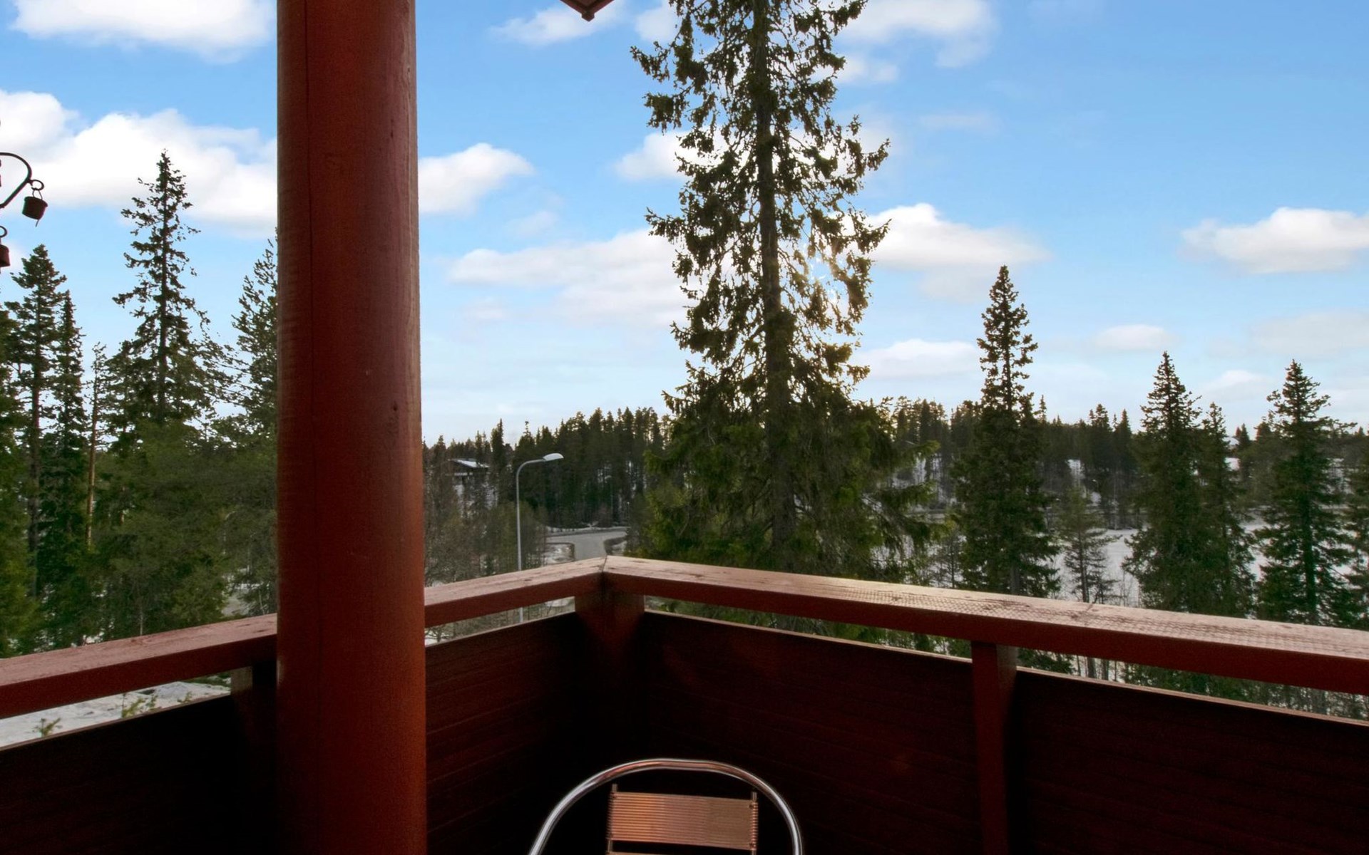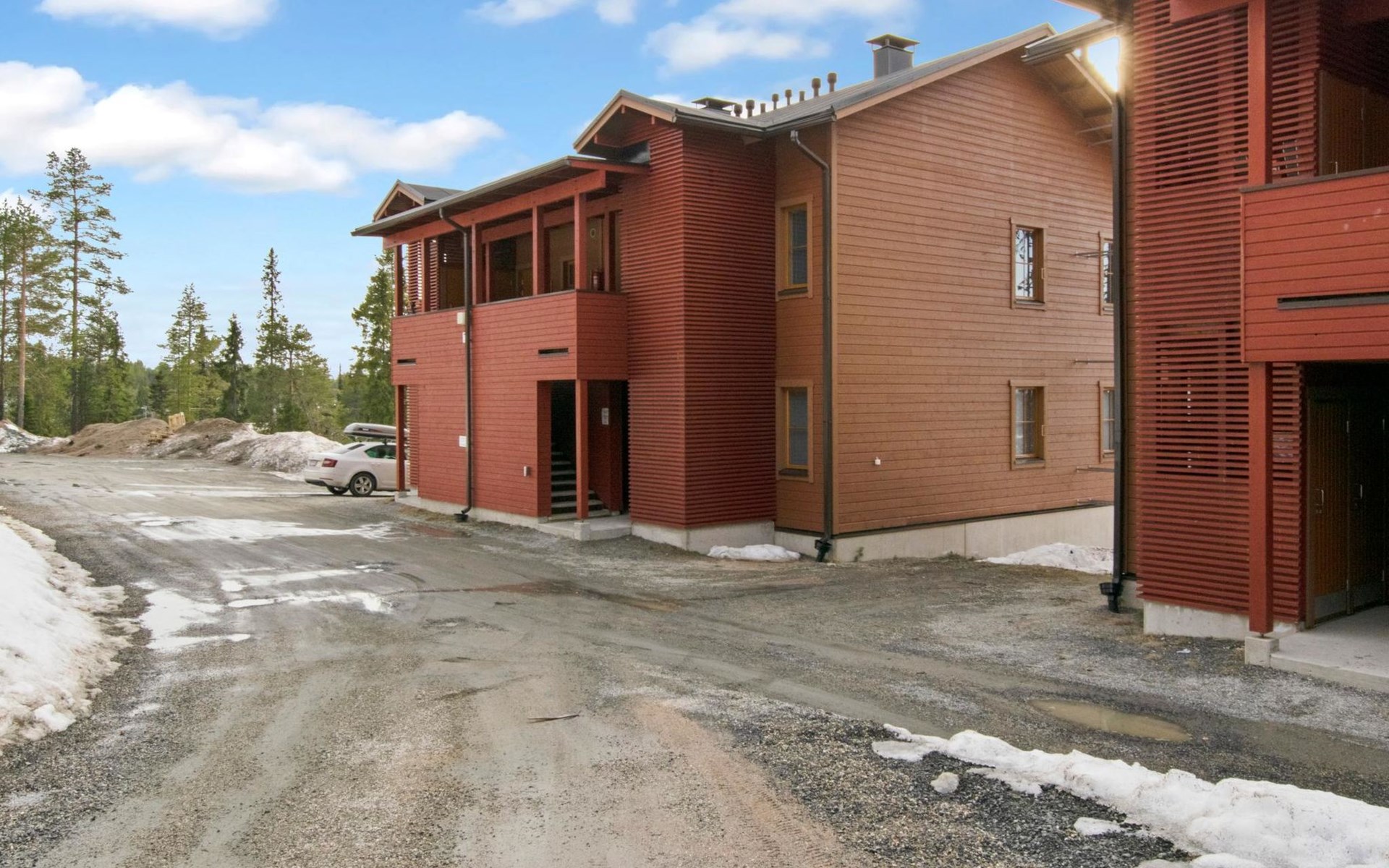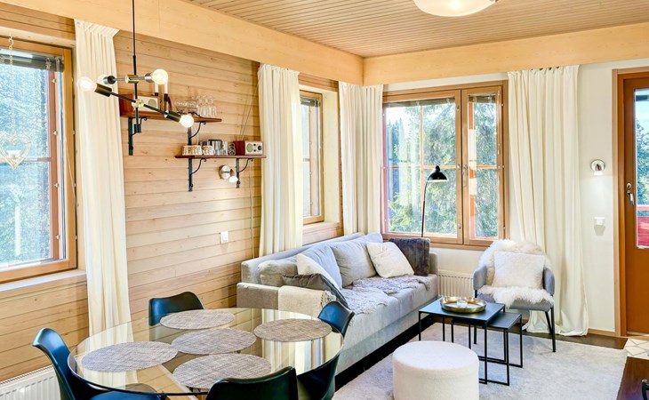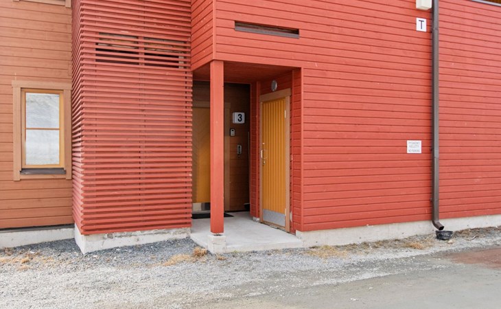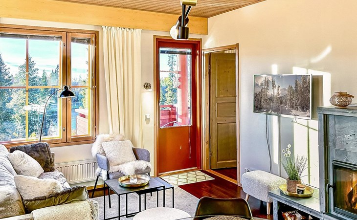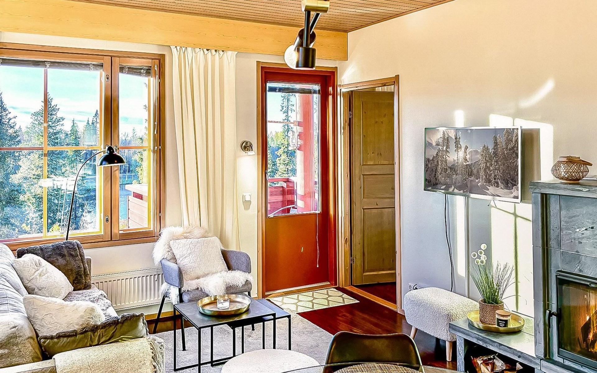 The apartment is an apartment on the ground floor of a 2-story building, with a view from the windows and a small balcony facing Talvijärvi.