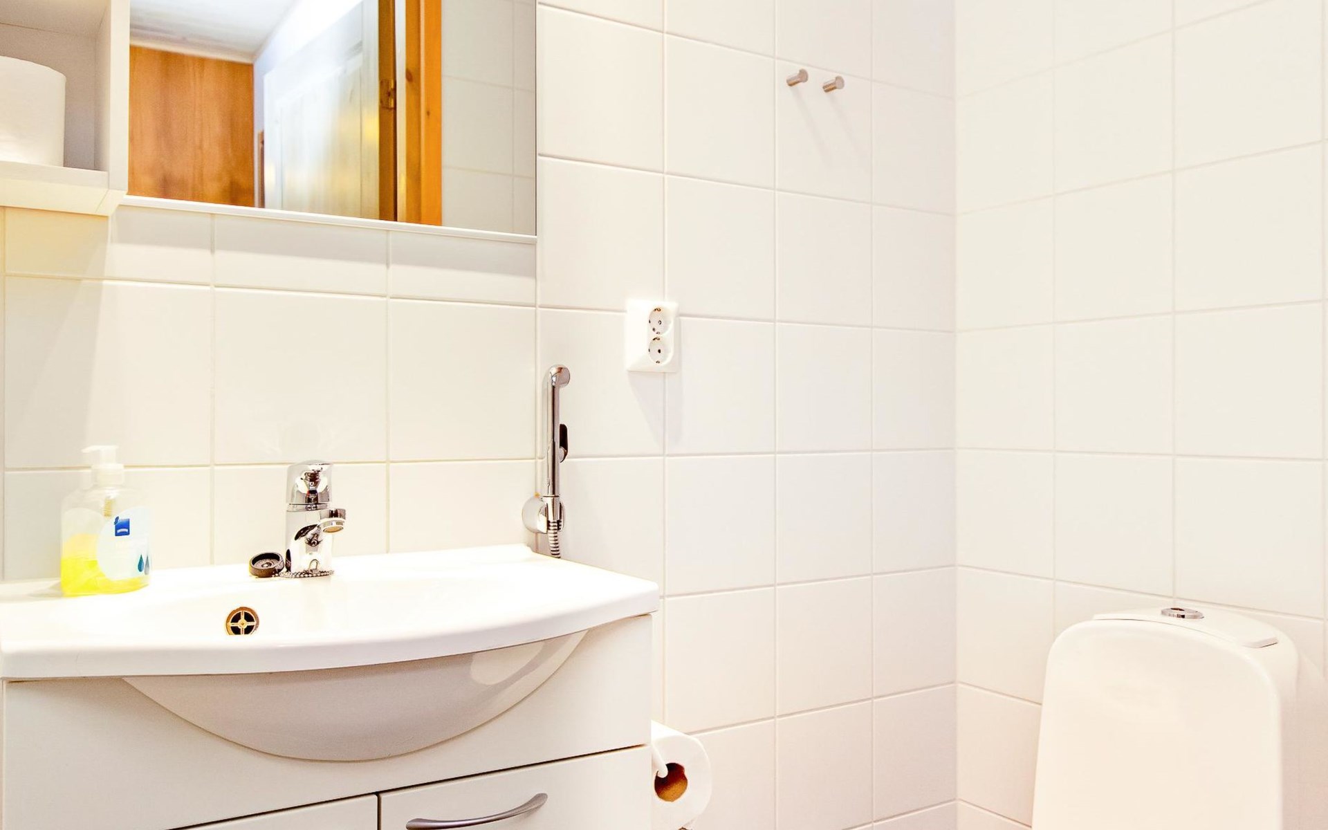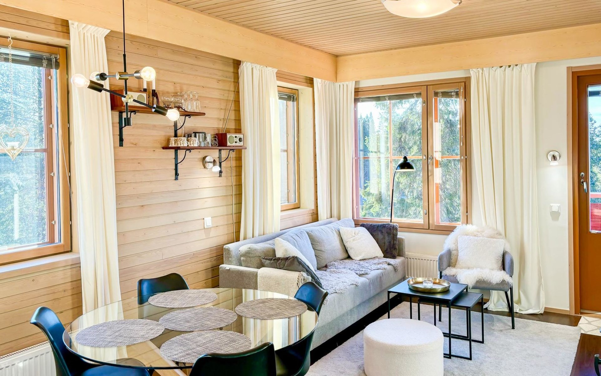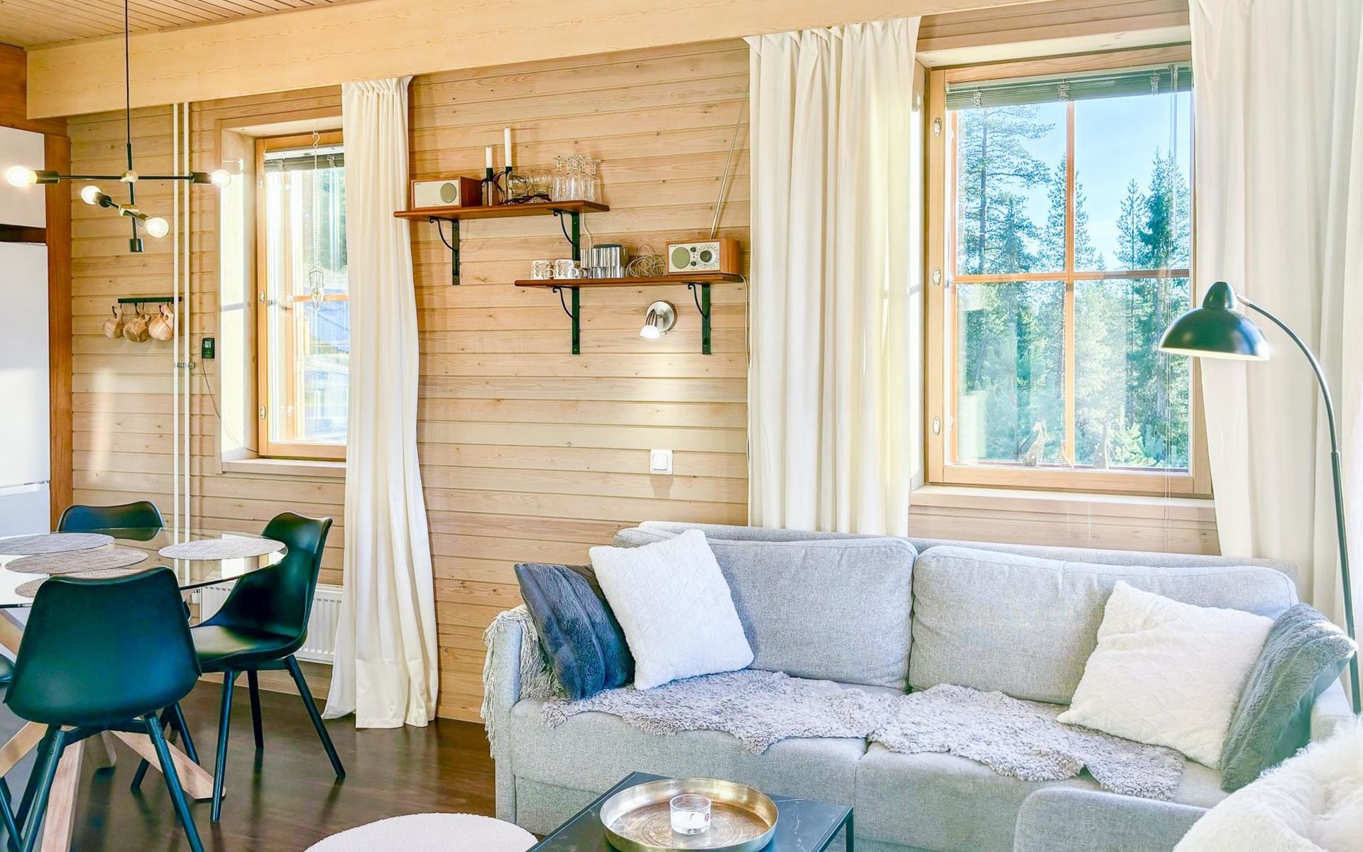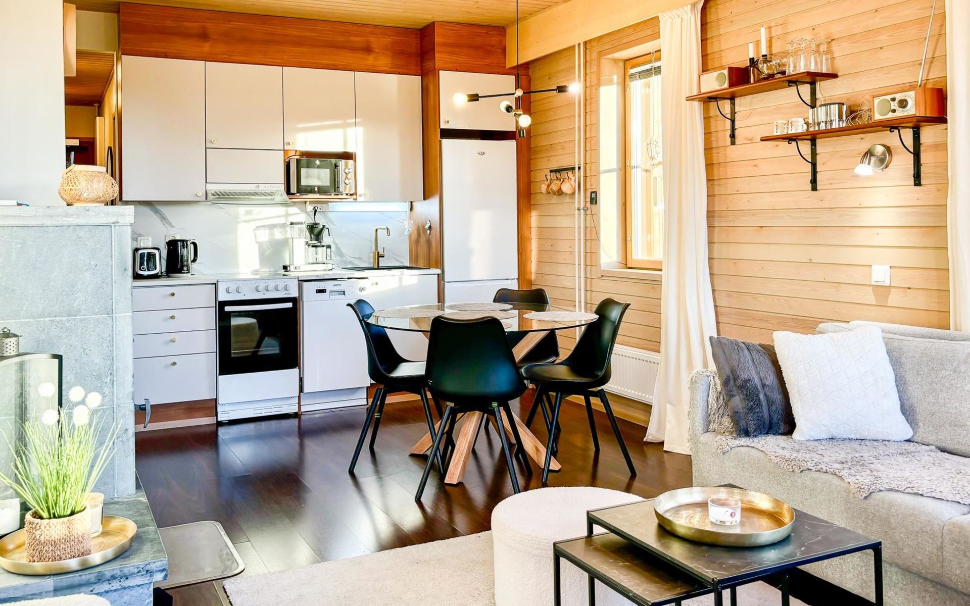 The apartment is an apartment on the ground floor of a 2-story building, with a view from the windows and a small balcony facing Talvijärvi.