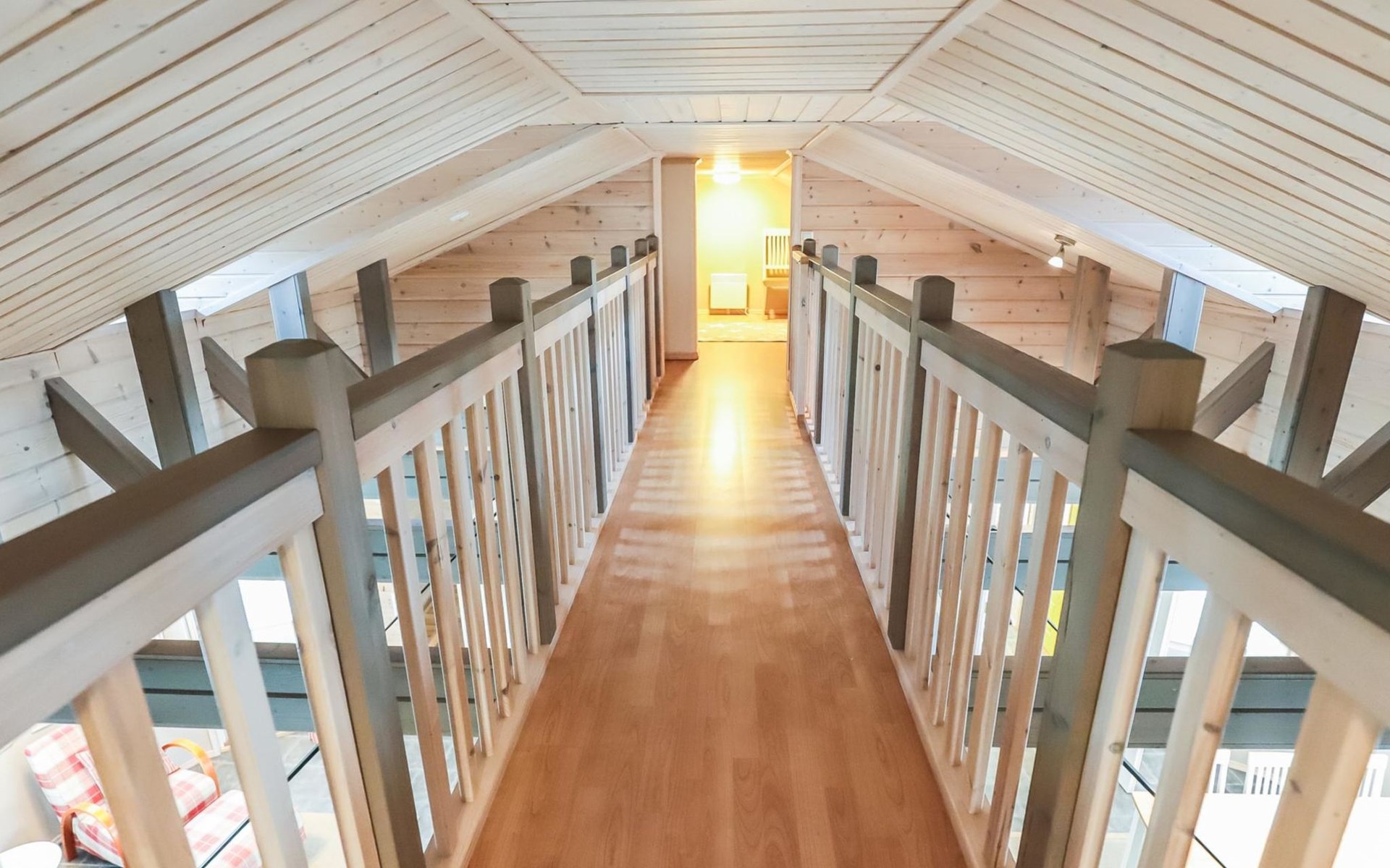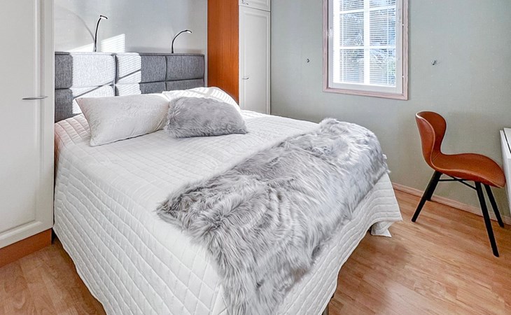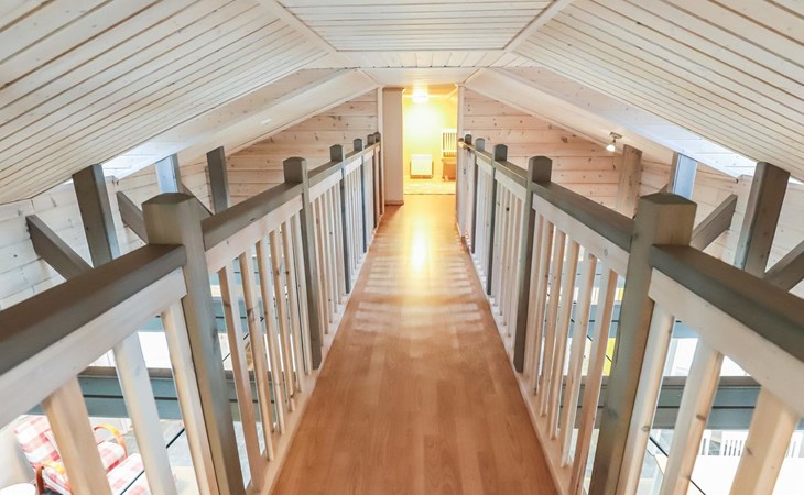 Combined livingroom / Kitchen. Downstairs two bedrooms, both with double beds, 2 lofts both with total of 4 single beds (2 beds /alcove). Loft has sloping ceilings, maximum height 160 cm, floorage 33 m², steep stairs to the loft, child safety gate at the top of the stairs.