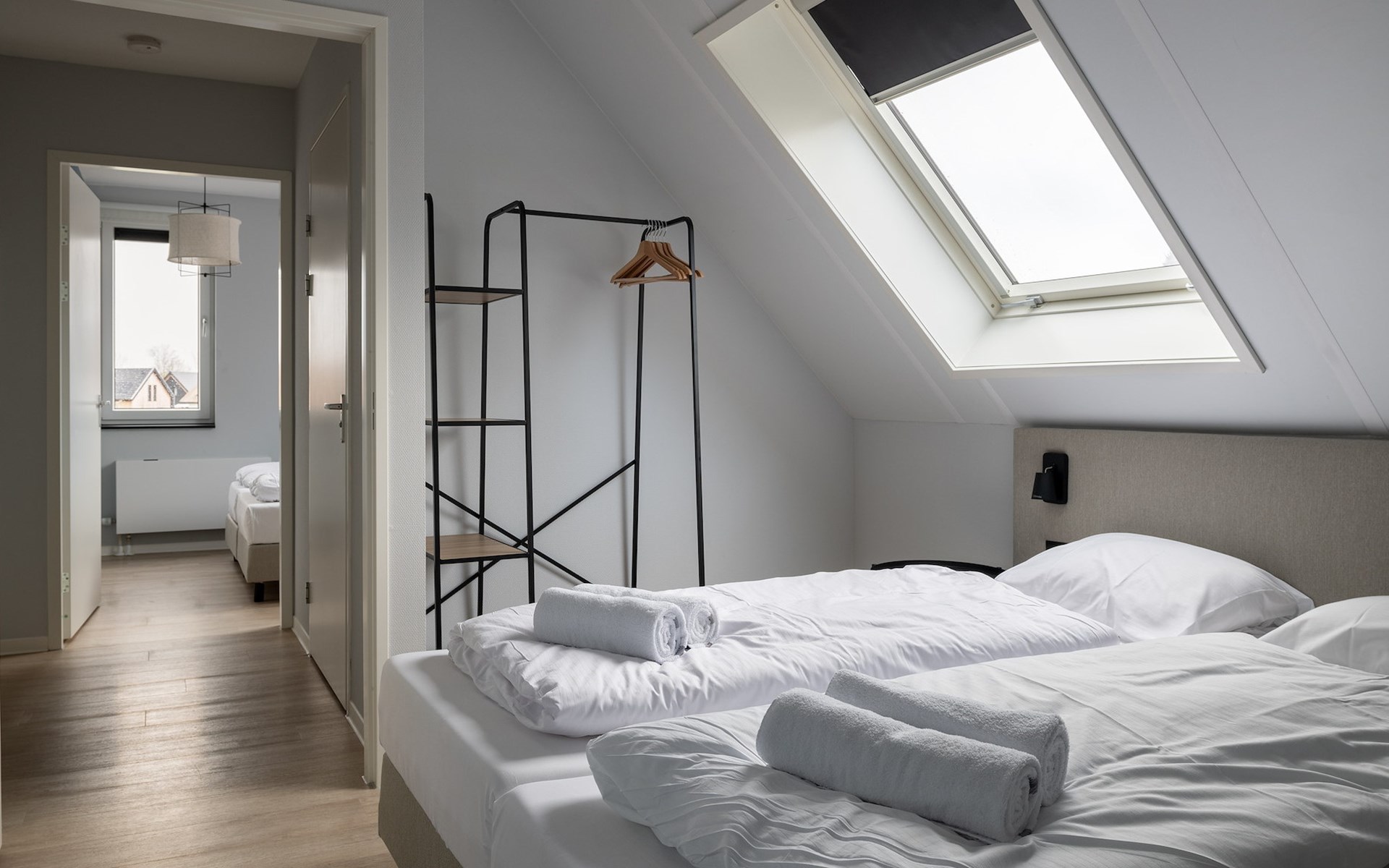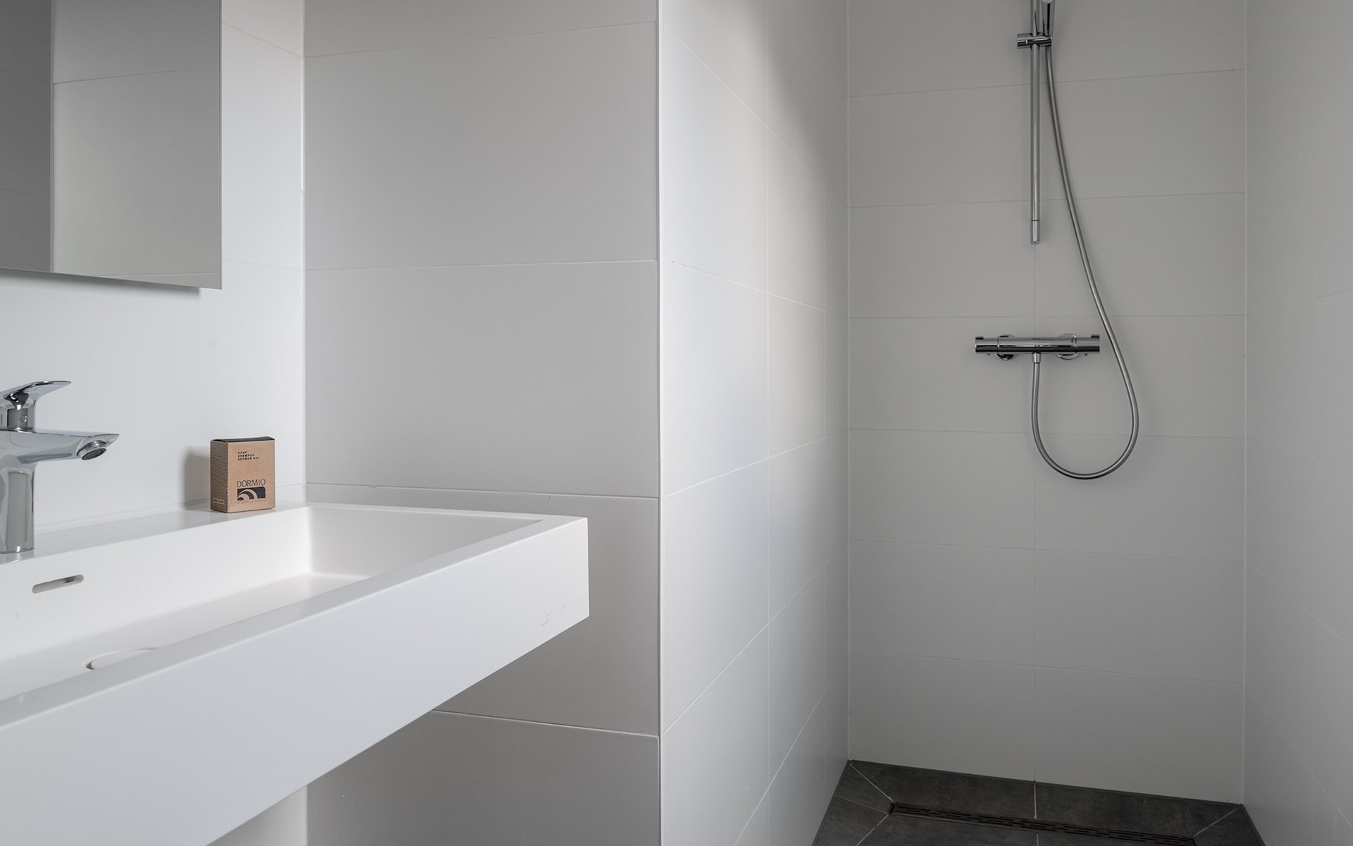 Op de begane grond bevindt zich een slaapkamer met 2 éénpersoonsbedden, een smart-tv met streaming mogelijkheid en een en-suite badkamer met een douche en wastafel. Daarnaast is er een separaat toilet aanwezig.