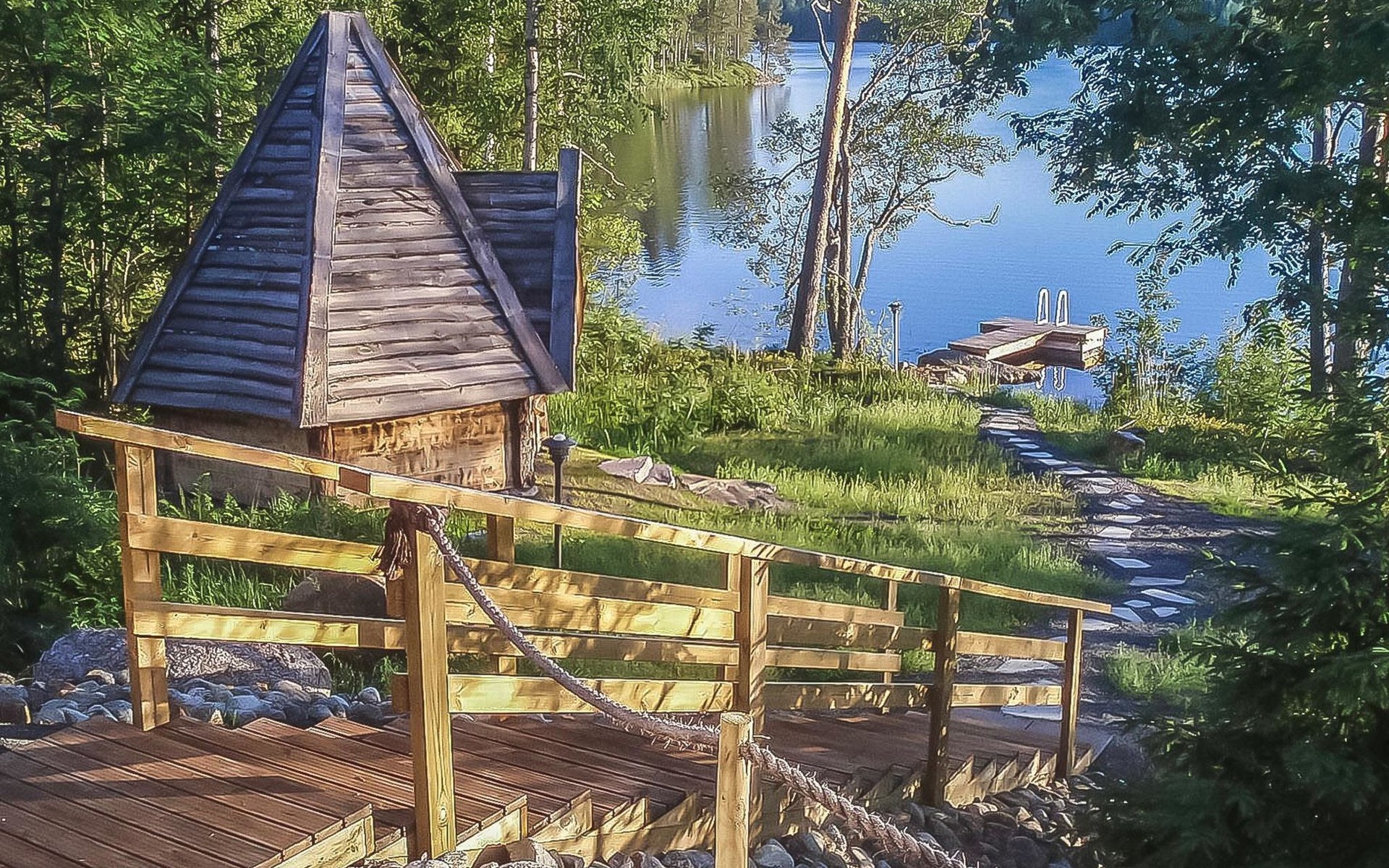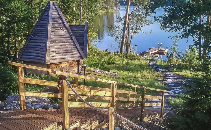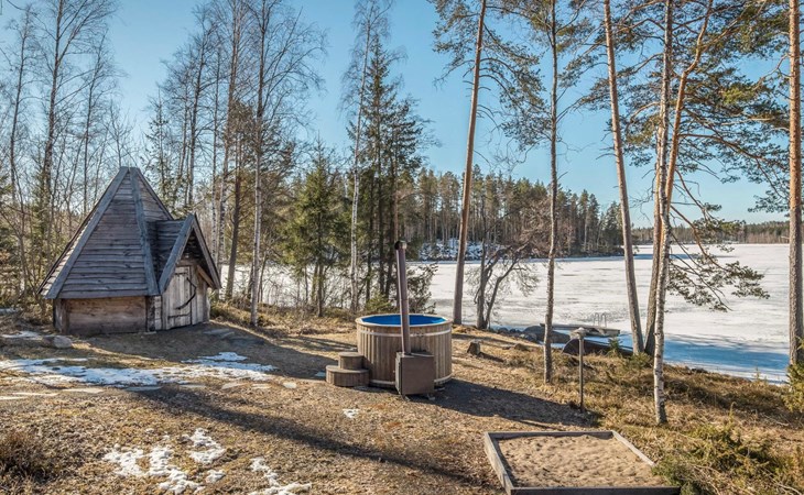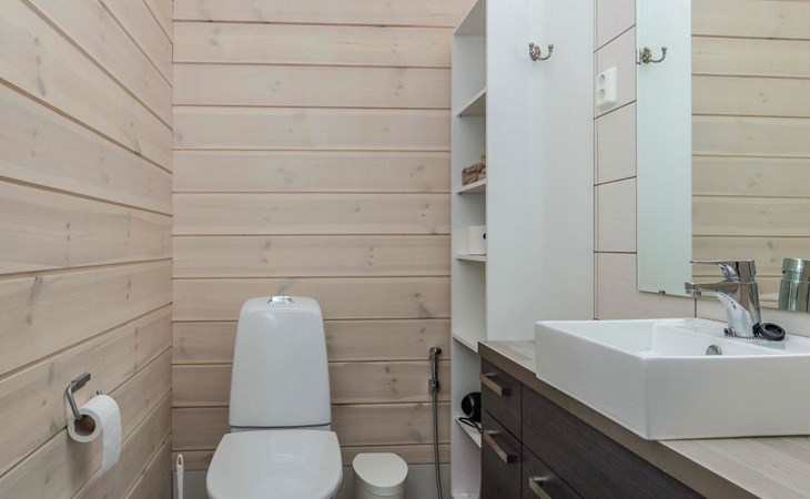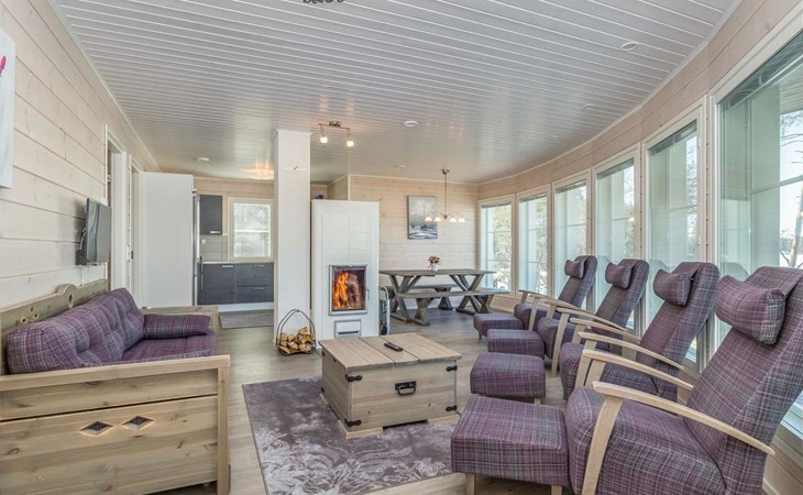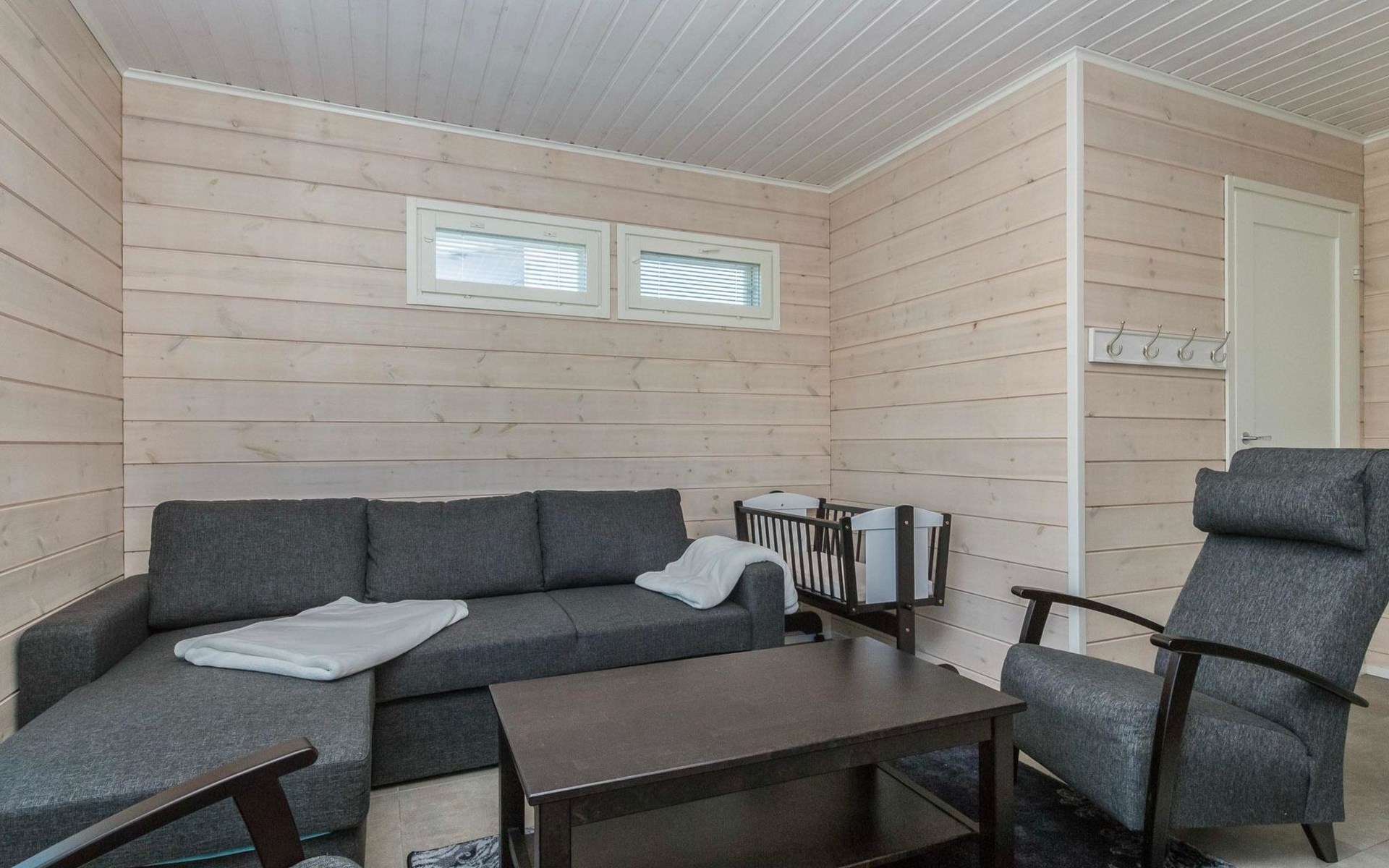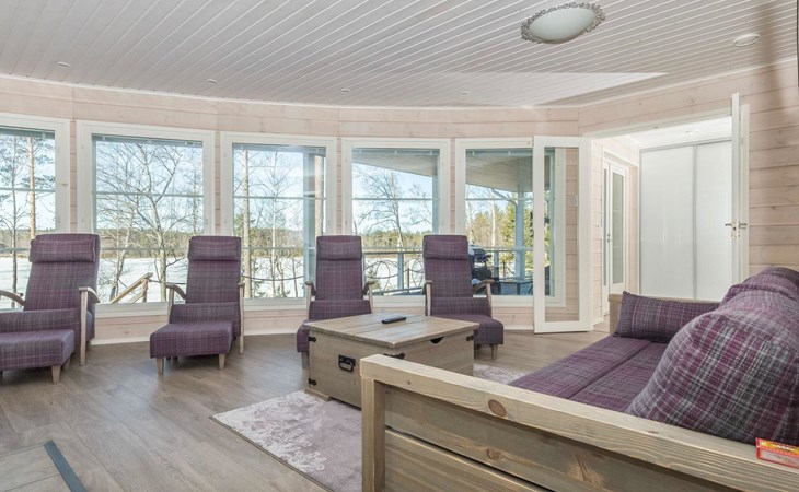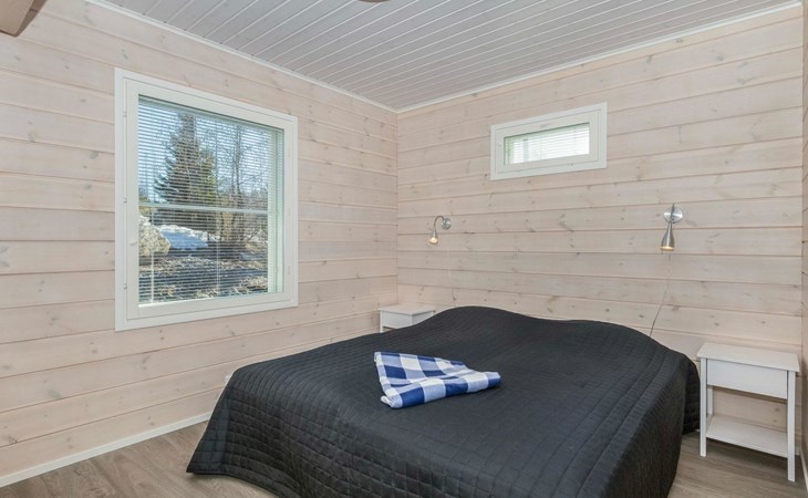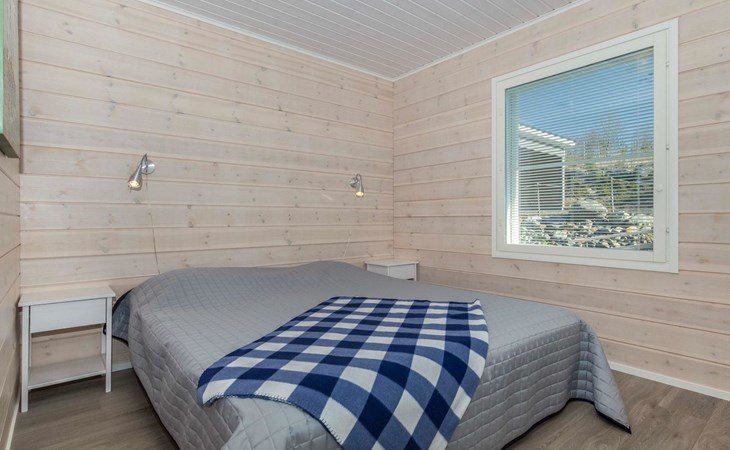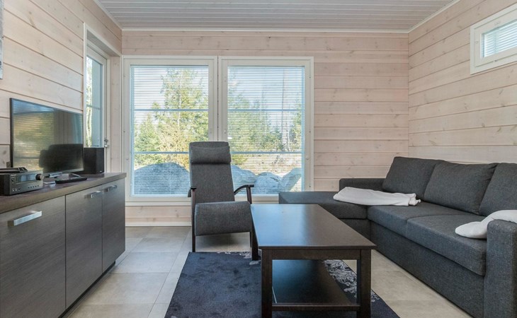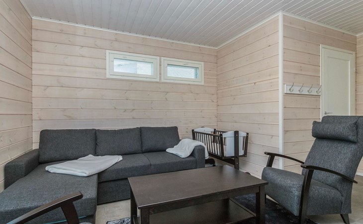 Wooden villa 2014, large livingroom/kitchen with two extra beds on the sofa bed, two bedrooms (10 m²), two beds in both, sofa bed for two in the sauna building, two separate WC’s, washroom and sauna (electric sauna stove), large covered terrace.