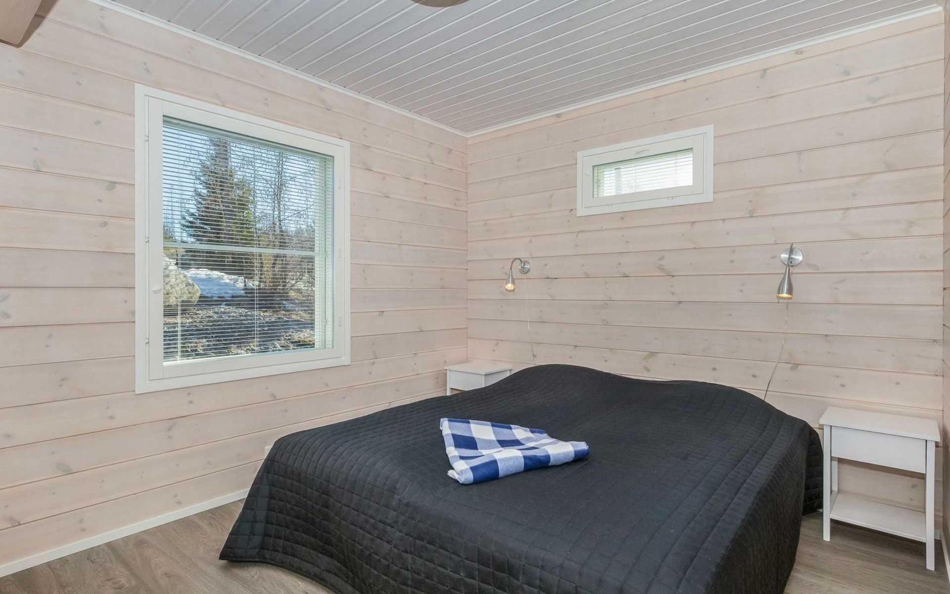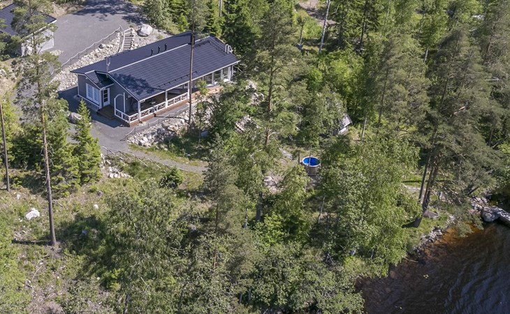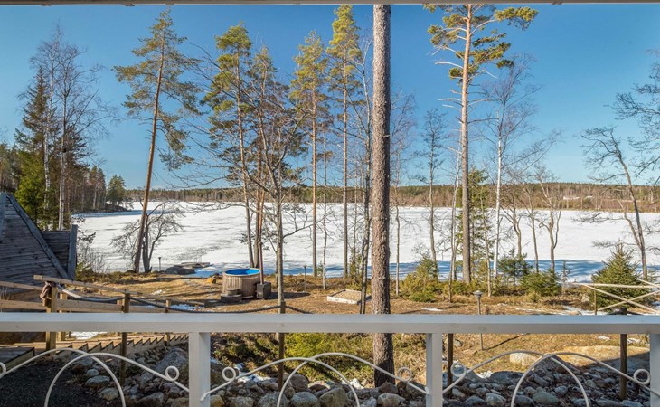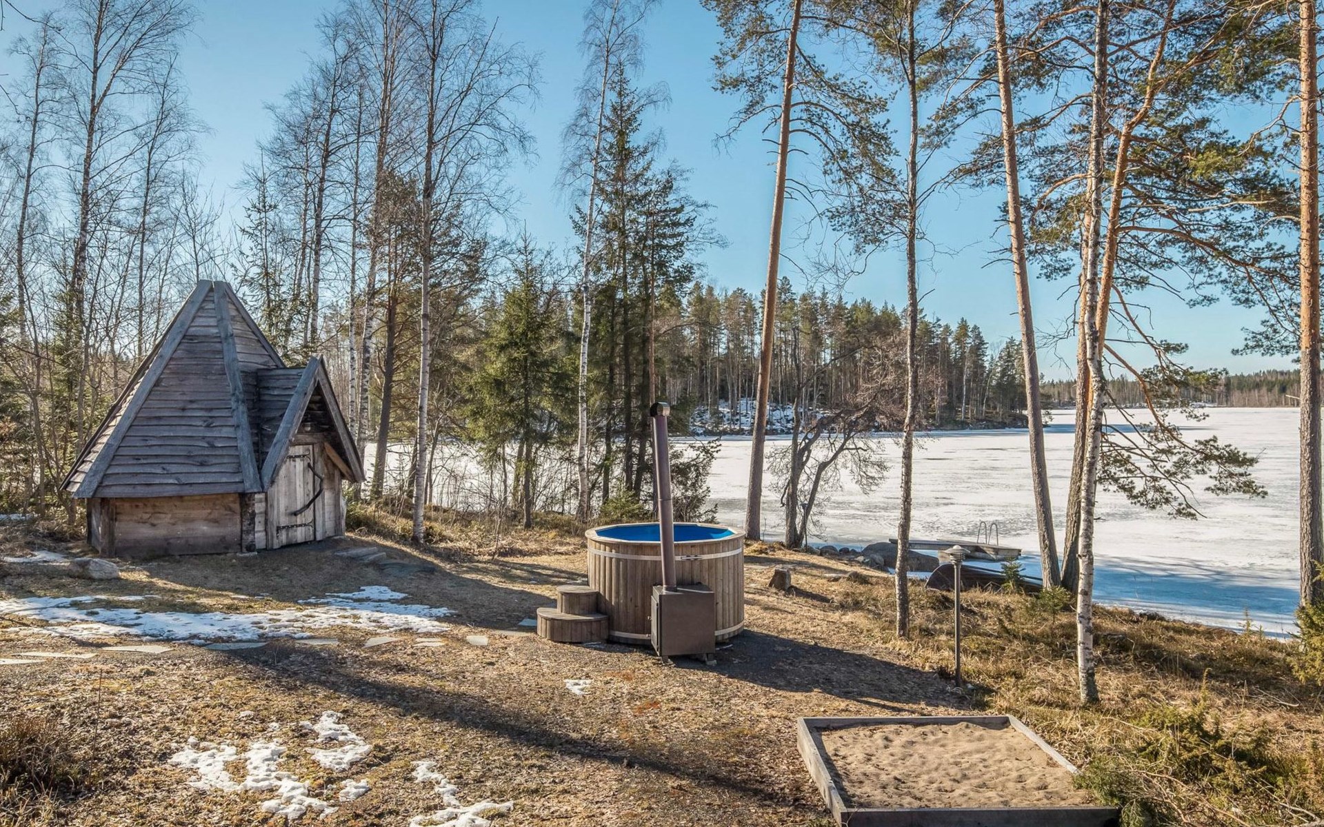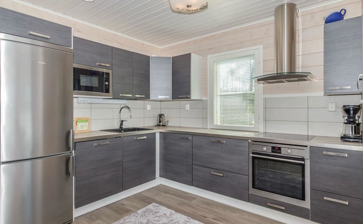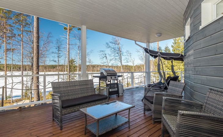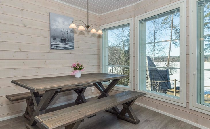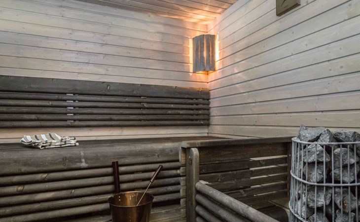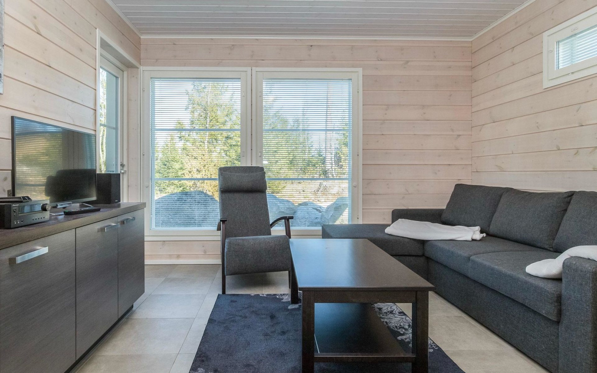 Wooden villa 2014, large livingroom/kitchen with two extra beds on the sofa bed, two bedrooms (10 m²), two beds in both, sofa bed for two in the sauna building, two separate WC’s, washroom and sauna (electric sauna stove), large covered terrace.