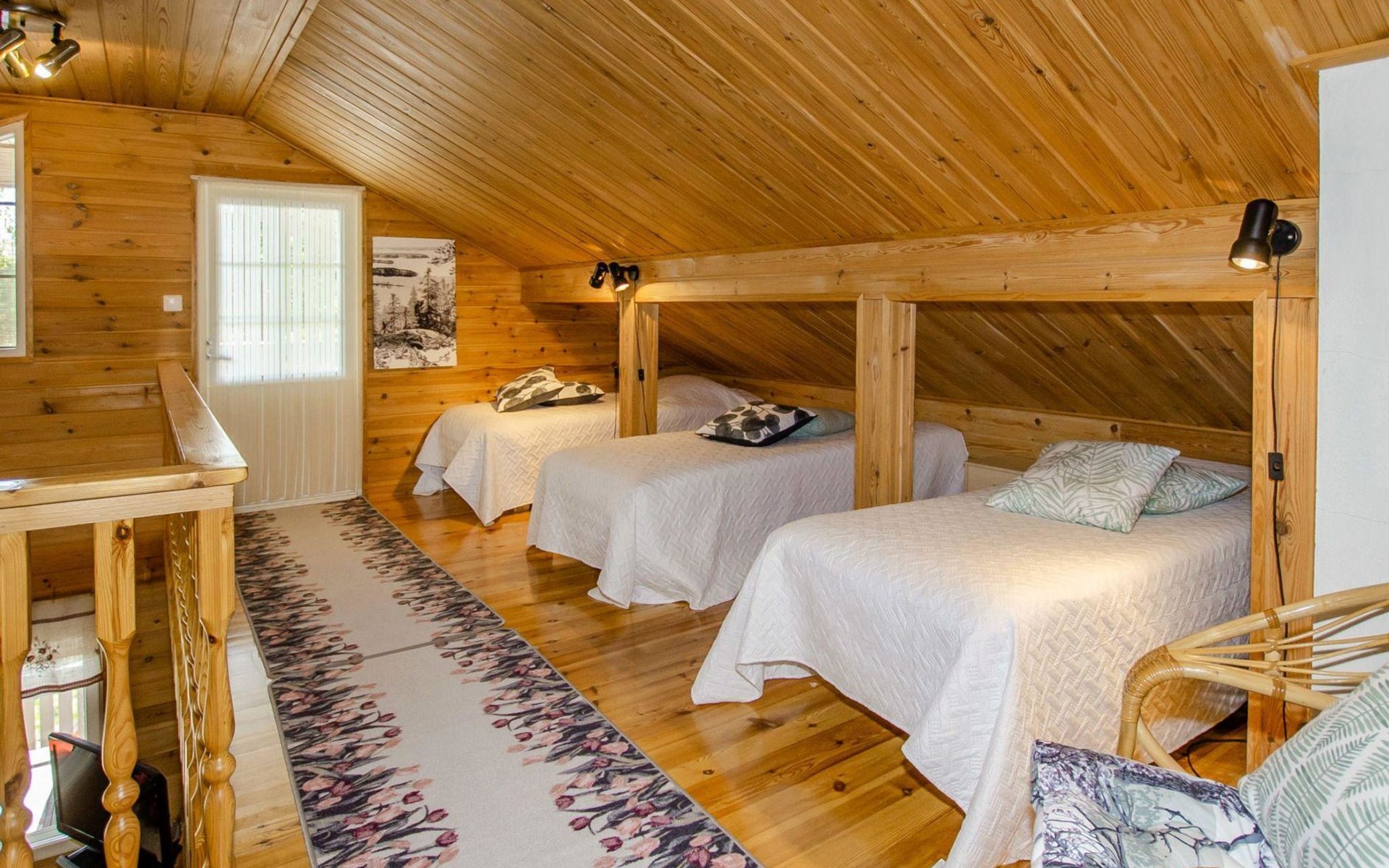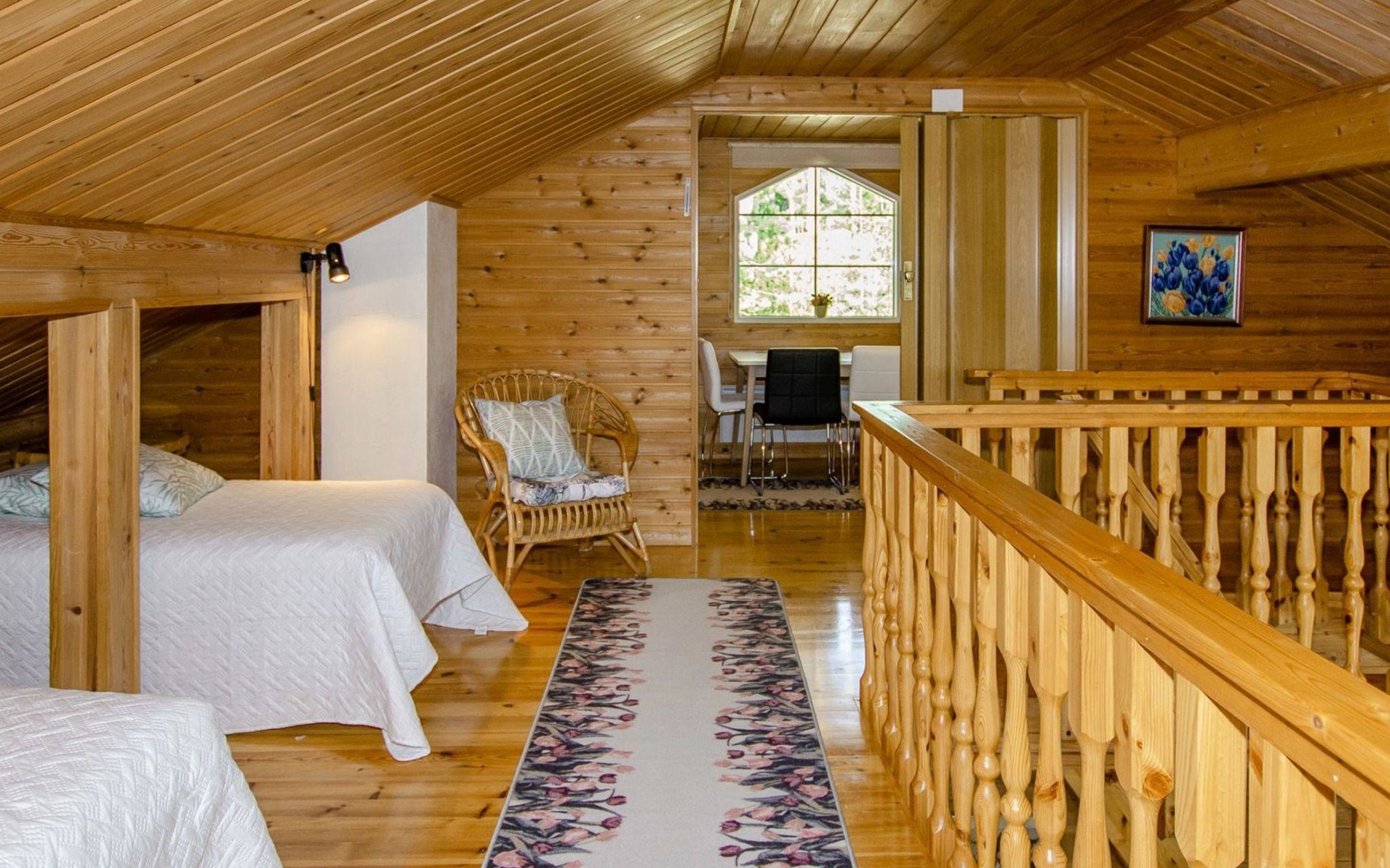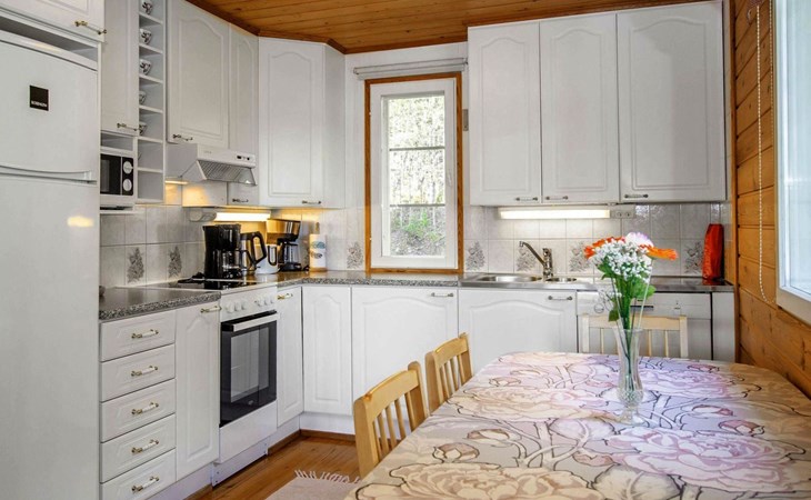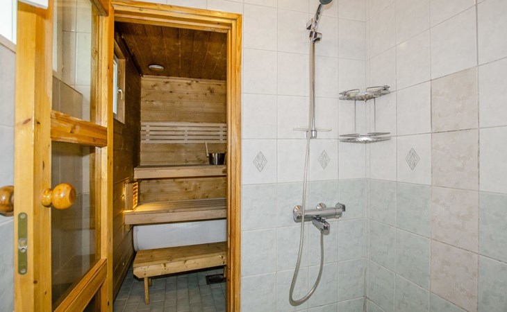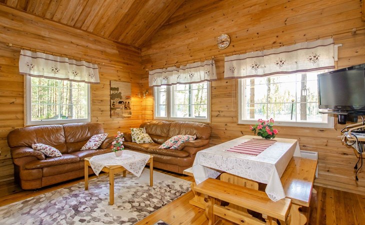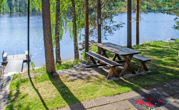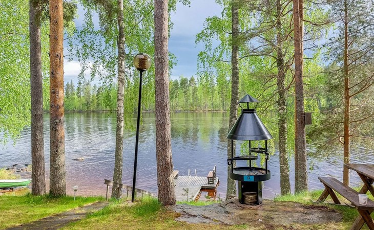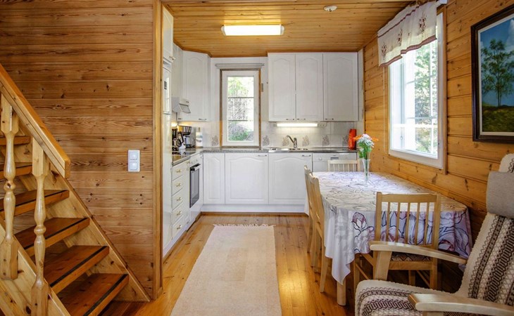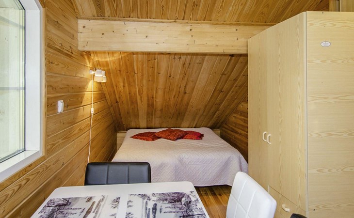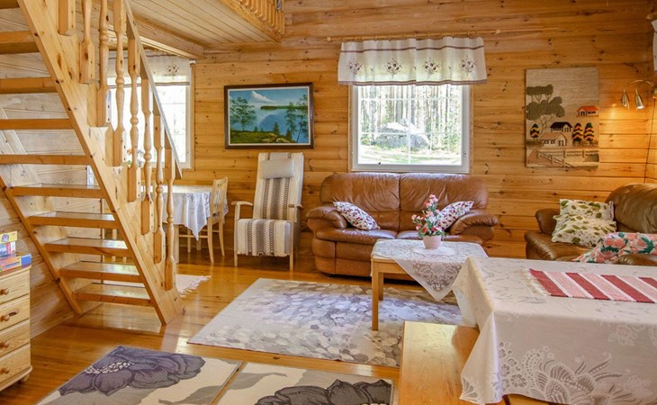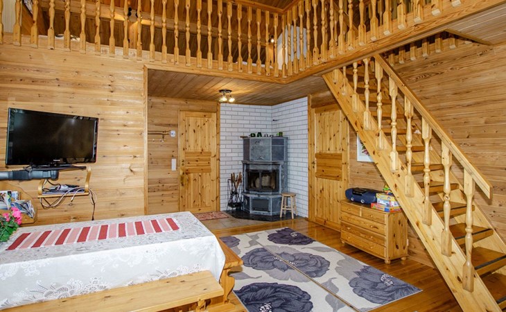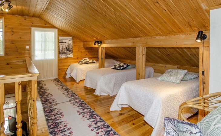 106 m2 cottage by lake Pielinen in Hattusaari for max 8 persons, totally 2 bed rooms. Bedroom downstairs with double bed, sleeping gallery (3 beds); bedroom upstairs with sliding door (2 beds + 120 cm bed), kitchen, living room, toilet, changing room, washroom with underfloor heating, sauna with electric stone. Outdoor grill and swing in the yard.