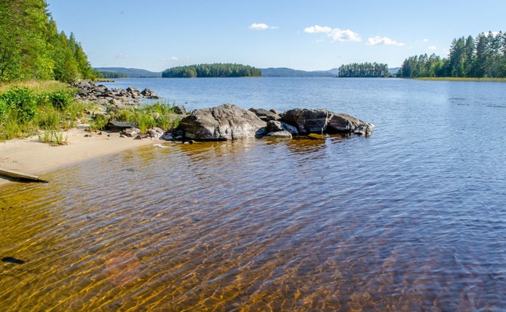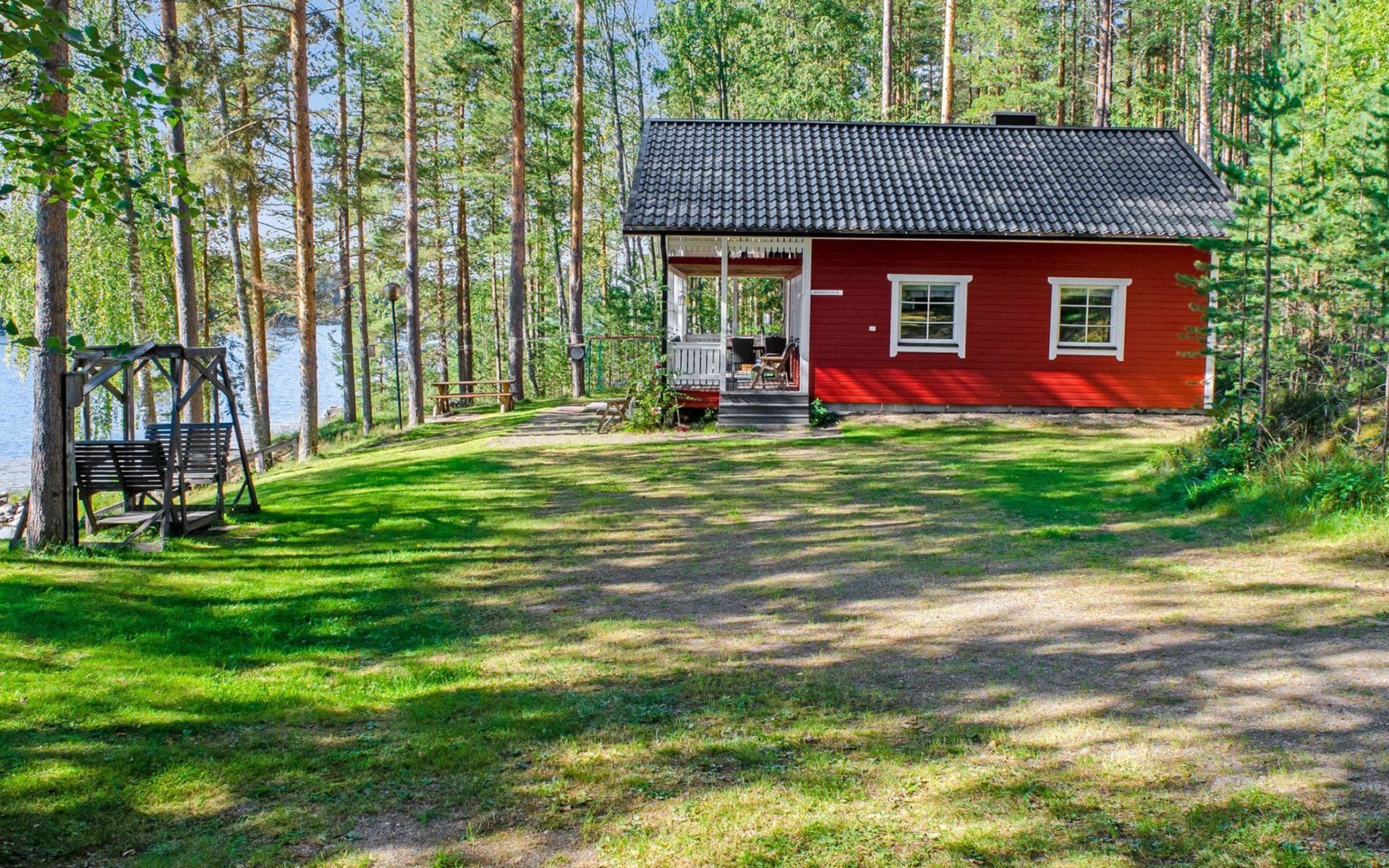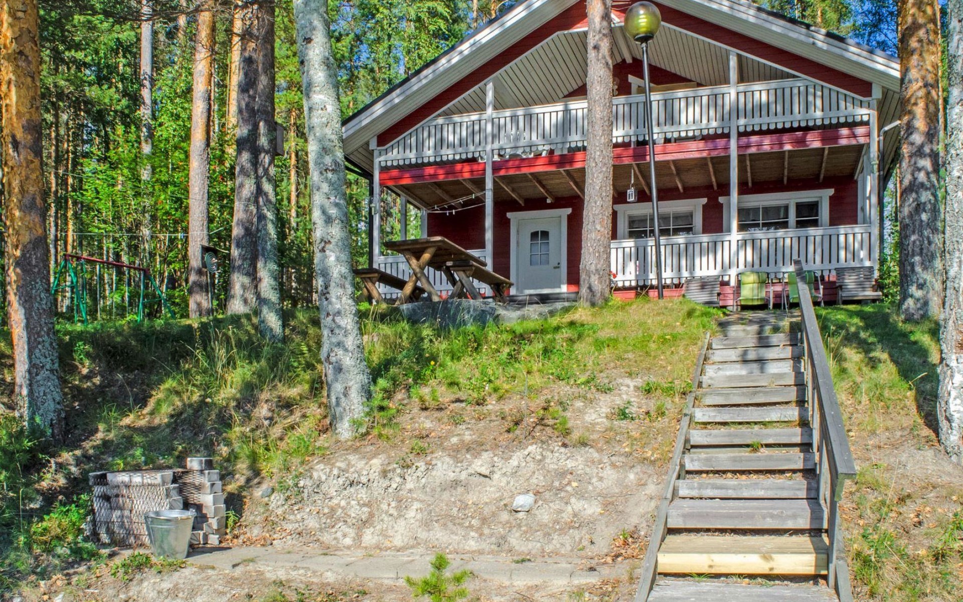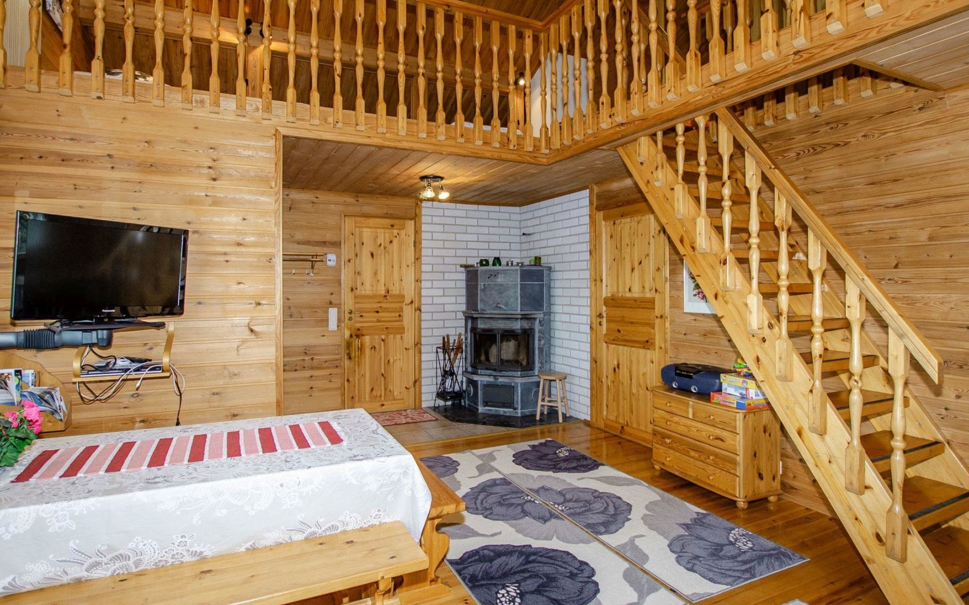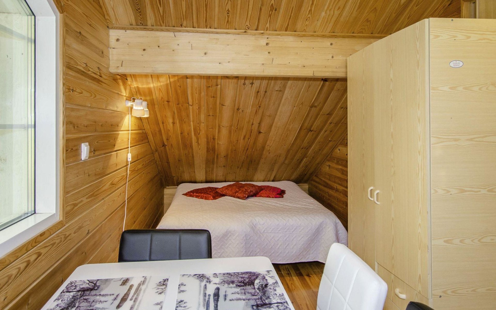 106 m2 cottage by lake Pielinen in Hattusaari for max 8 persons, totally 2 bed rooms. Bedroom downstairs with double bed, sleeping gallery (3 beds); bedroom upstairs with sliding door (2 beds + 120 cm bed), kitchen, living room, toilet, changing room, washroom with underfloor heating, sauna with electric stone. Outdoor grill and swing in the yard.