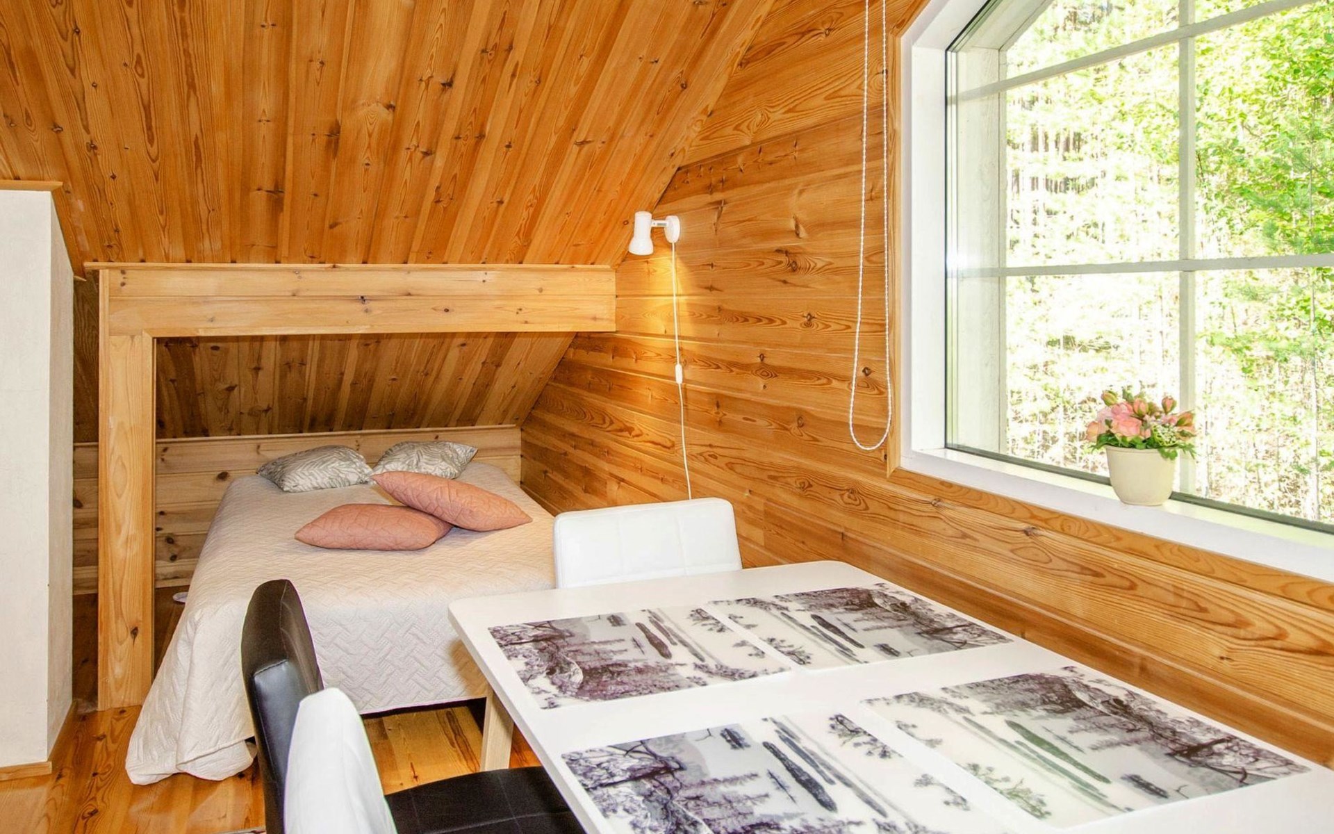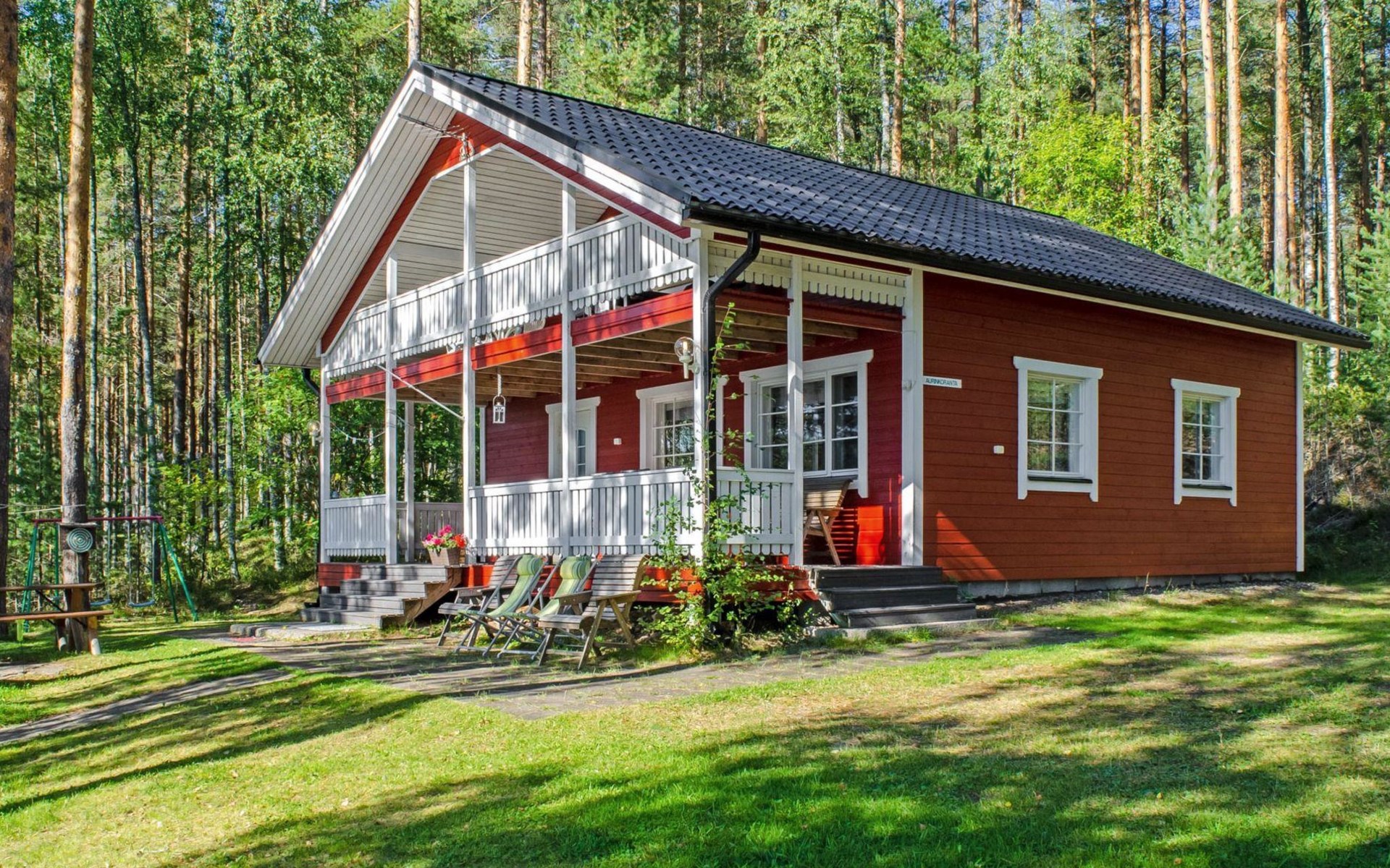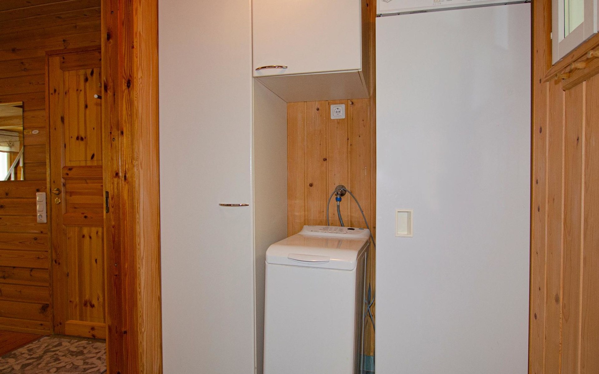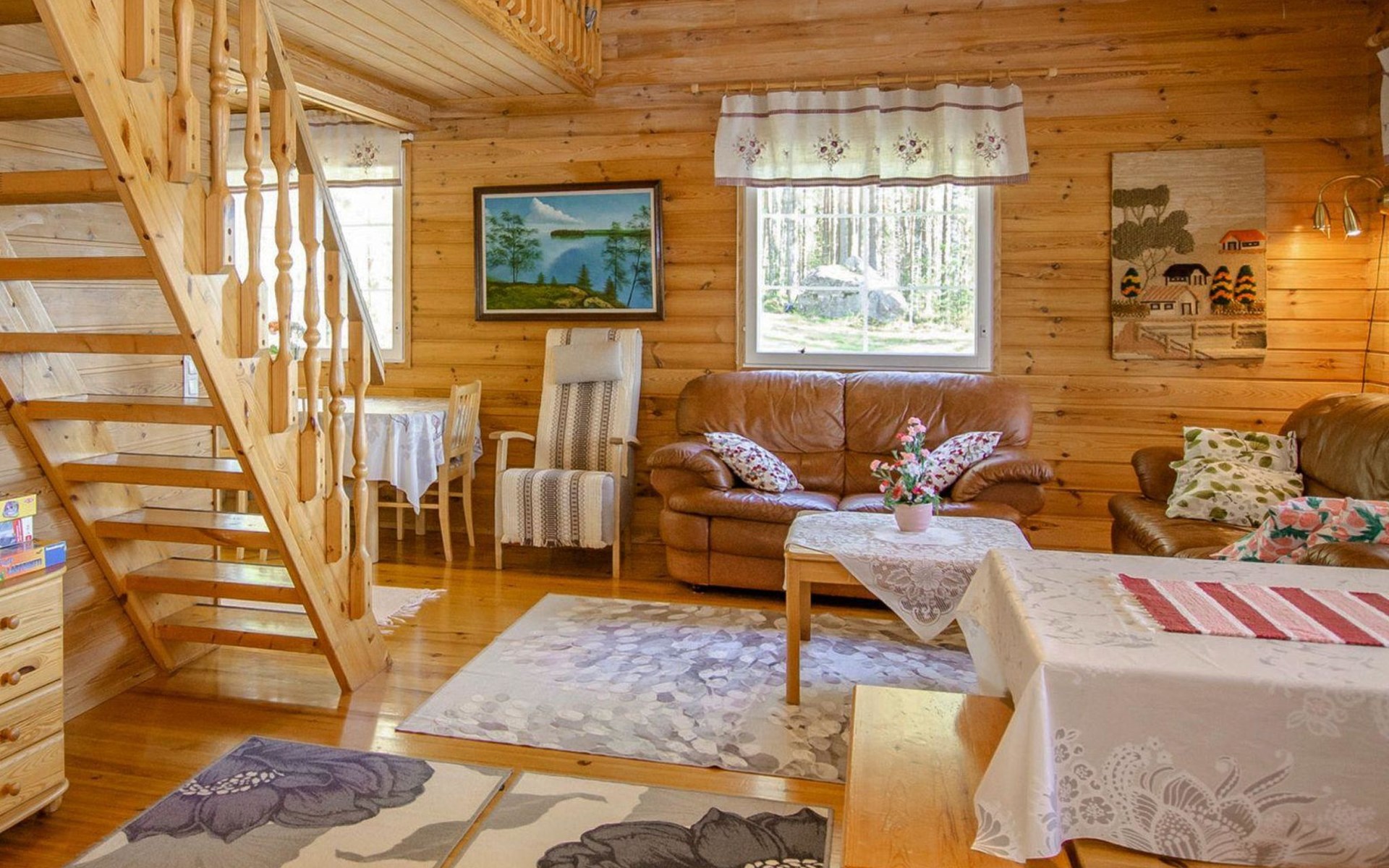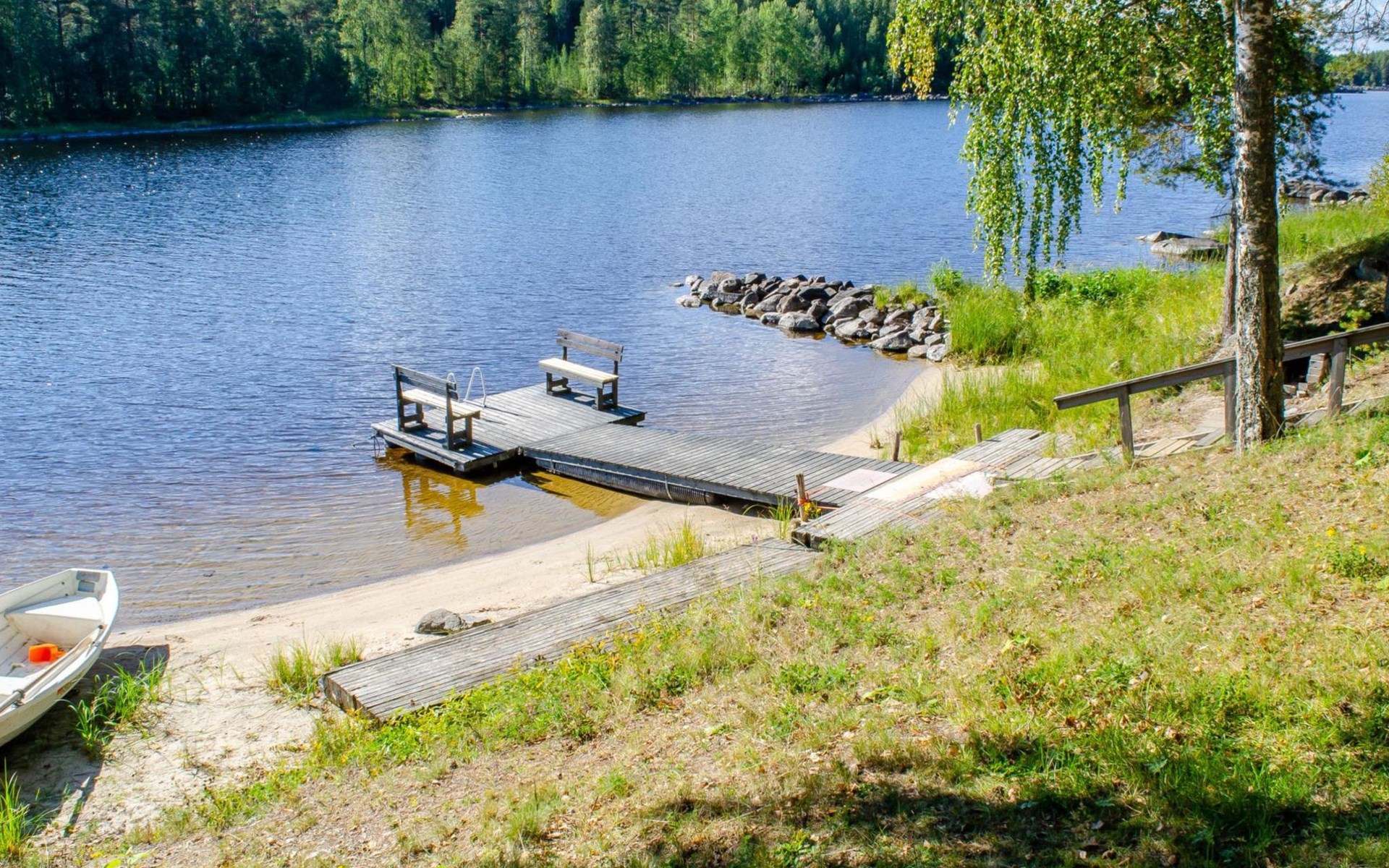 106 m2 cottage by lake Pielinen in Hattusaari for max 8 persons, totally 2 bed rooms. Bedroom downstairs with double bed, sleeping gallery (3 beds); bedroom upstairs with sliding door (2 beds + 120 cm bed), kitchen, living room, toilet, changing room, washroom with underfloor heating, sauna with electric stone. Outdoor grill and swing in the yard.