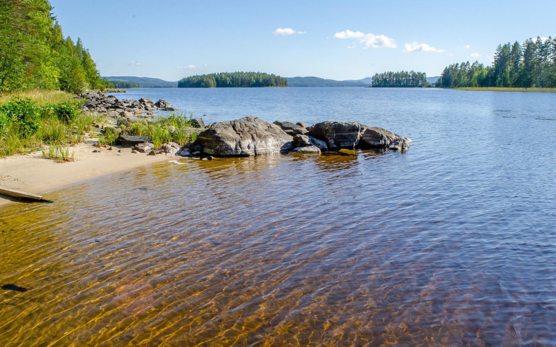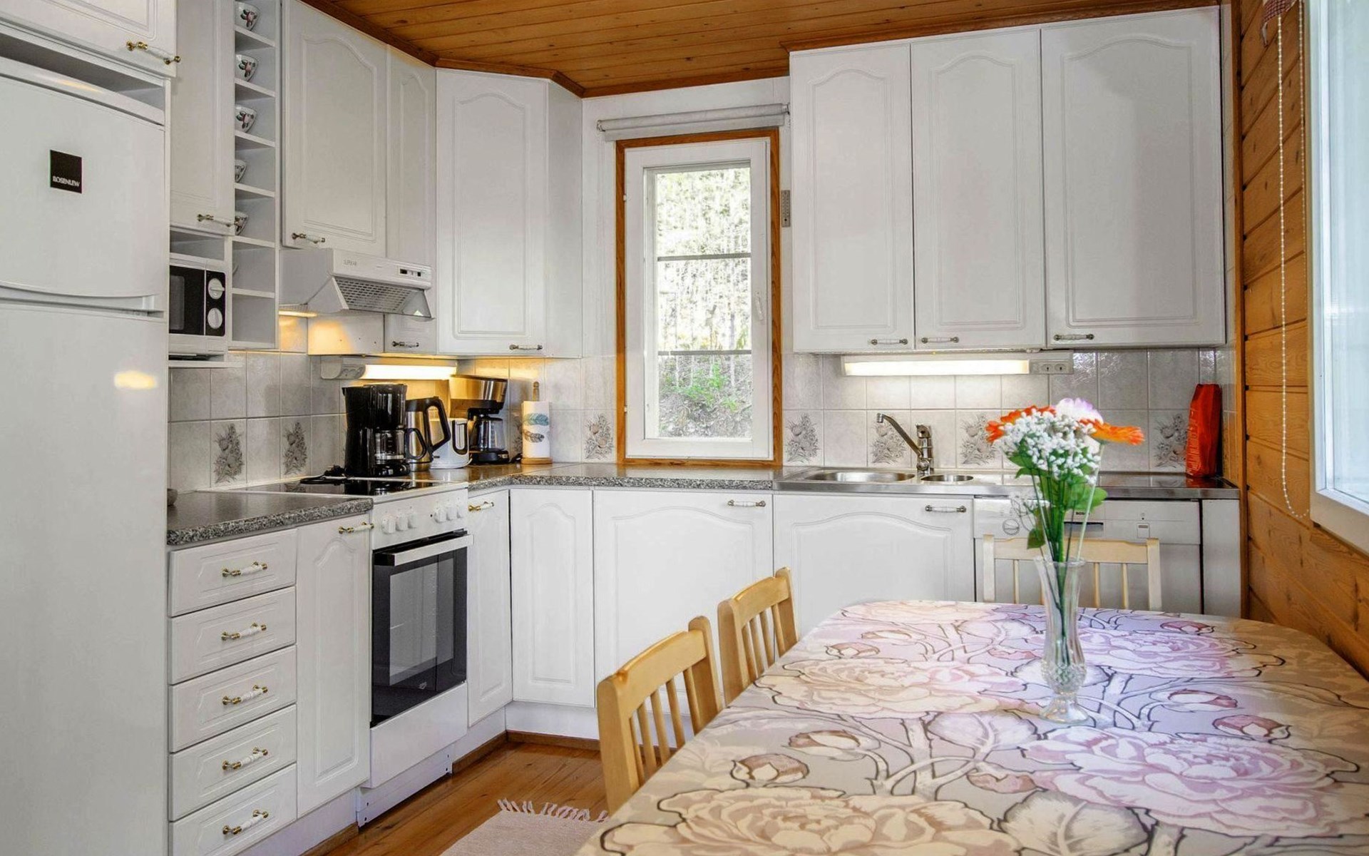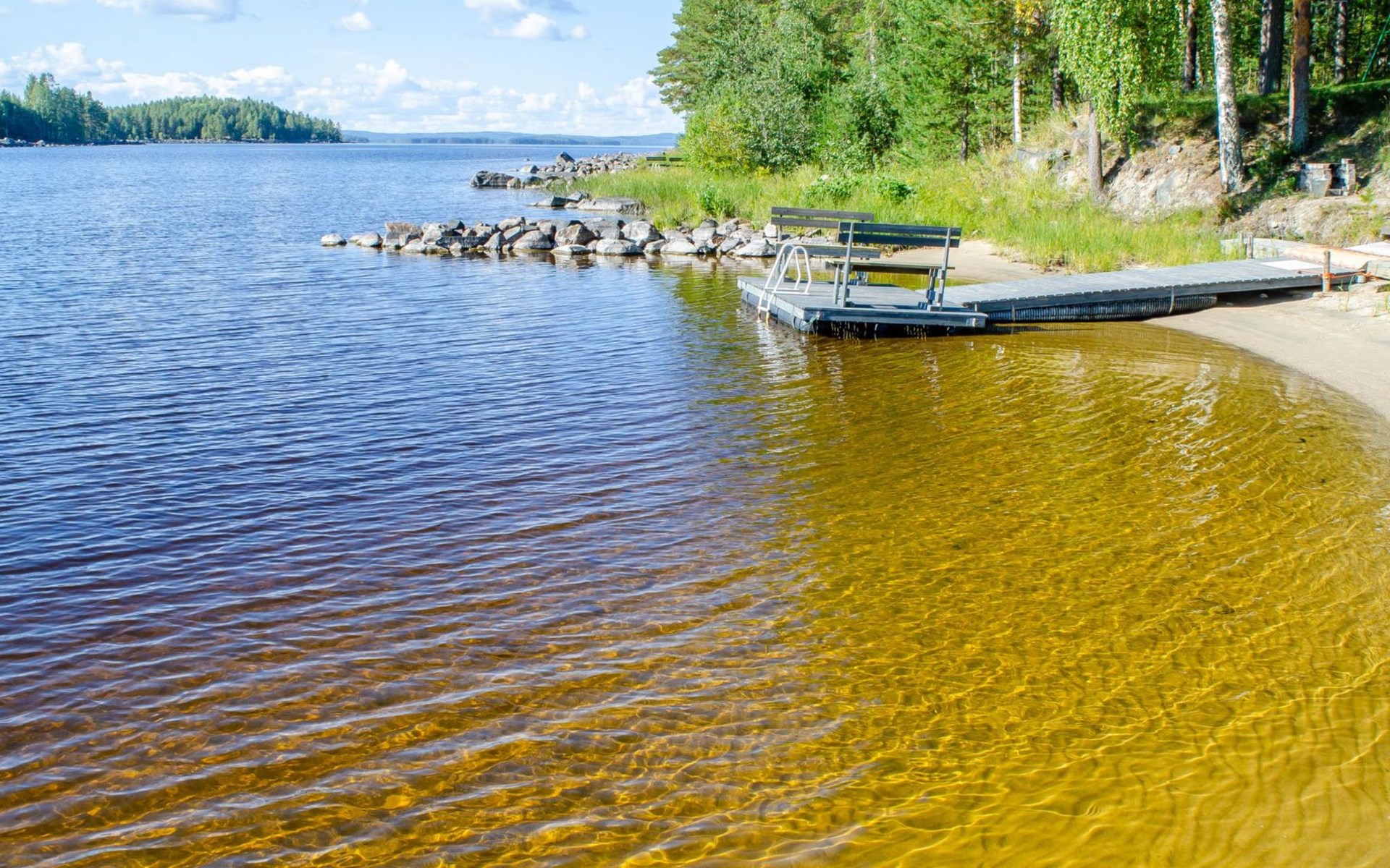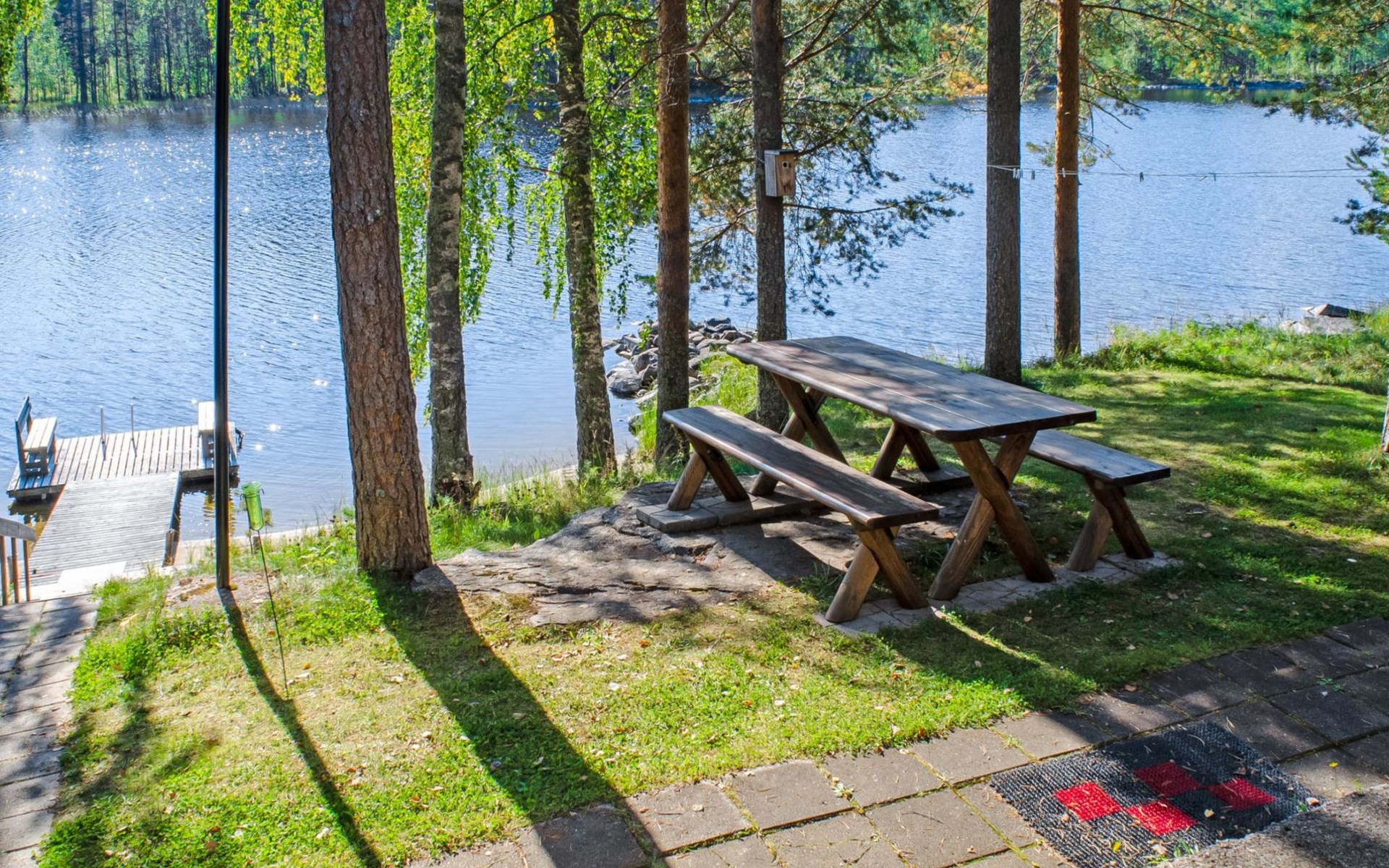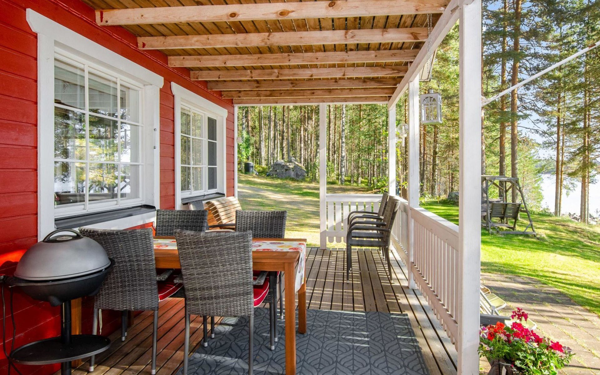 106 m2 cottage by lake Pielinen in Hattusaari for max 8 persons, totally 2 bed rooms. Bedroom downstairs with double bed, sleeping gallery (3 beds); bedroom upstairs with sliding door (2 beds + 120 cm bed), kitchen, living room, toilet, changing room, washroom with underfloor heating, sauna with electric stone. Outdoor grill and swing in the yard.