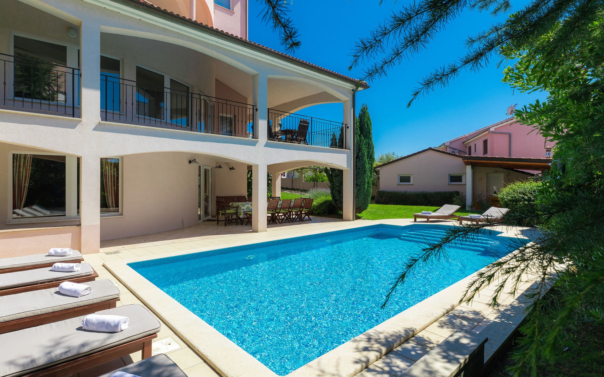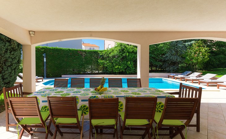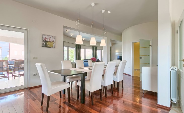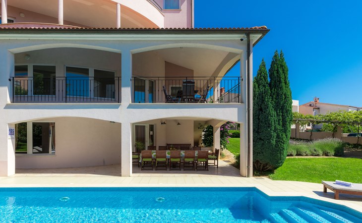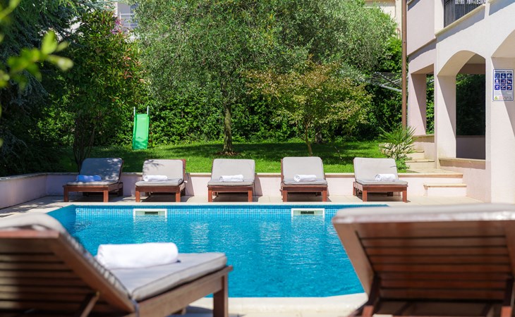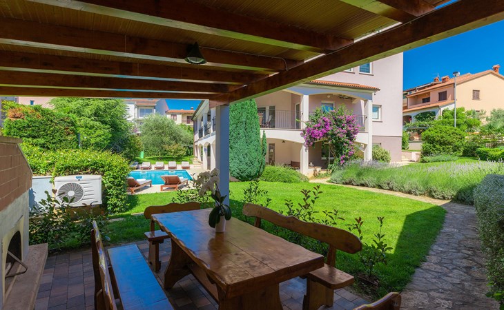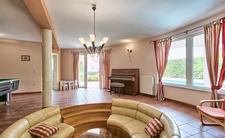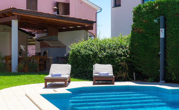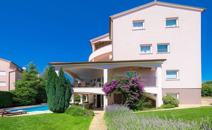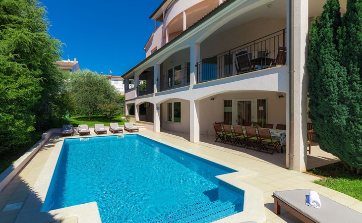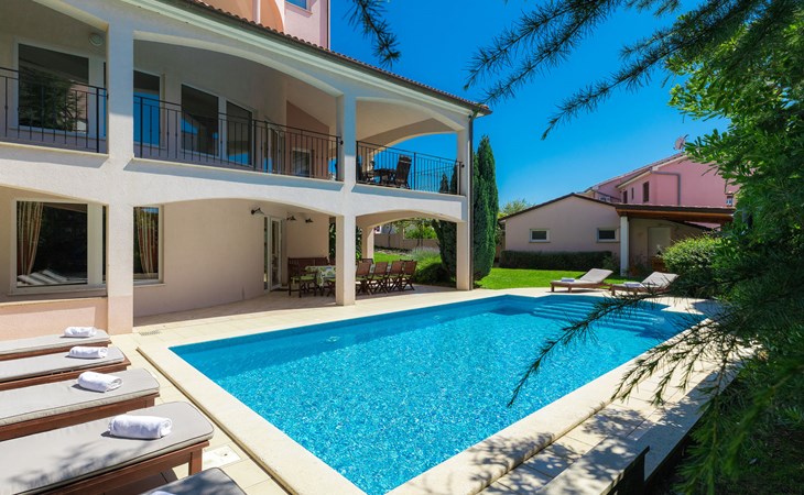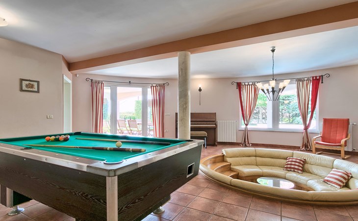 Štinjan 5 km van Pula: Mooi villa "Carmen", van 4 verdiepingen. 3 km van het centrum van Fažana, zonnige ligging, 1 km van zee, 1 km van het strand. Voor alleengebruik: terrein 1.000 m2 (omheind), mooie tuin met gazon, openluchtzwembad verwarmd (40 m2, 140 cm diepte, seizoensgebonden beschikbaarheid: 09.Mrt. - 21.Nov.) met trap en zout-elektrolyse. Onregelmatig zwembad. Buitendouche, barbecue, kinderspeelplaats (glijbaan, schommel). In het huis: internetaansluiting, fitnessruimte, biljart, wasmachine. Parkeerplaats (voor 4 auto's) bij het huis op het terrein. Winkel 350 m, winkelcentrum 4 km, restaurant, bushalte 350 m, kiezelstrand 1 km, rotsstrand 1 km. Golfterrein (18 holes) 4.5 km, tennis 1 km, manege 1.5 km, wandelroutes 100 m vanaf het huis, fietspad 150 m. Attracties in de buurt: NP Brijuni 4.5 km, Amphitheater 6 km. De eigenaar accepteert geen jeugdgroepen. Vliegveld 15 km van het huis. Openluchtzwembad verwarmd (extra). Geen huisdieren toegestaan.
