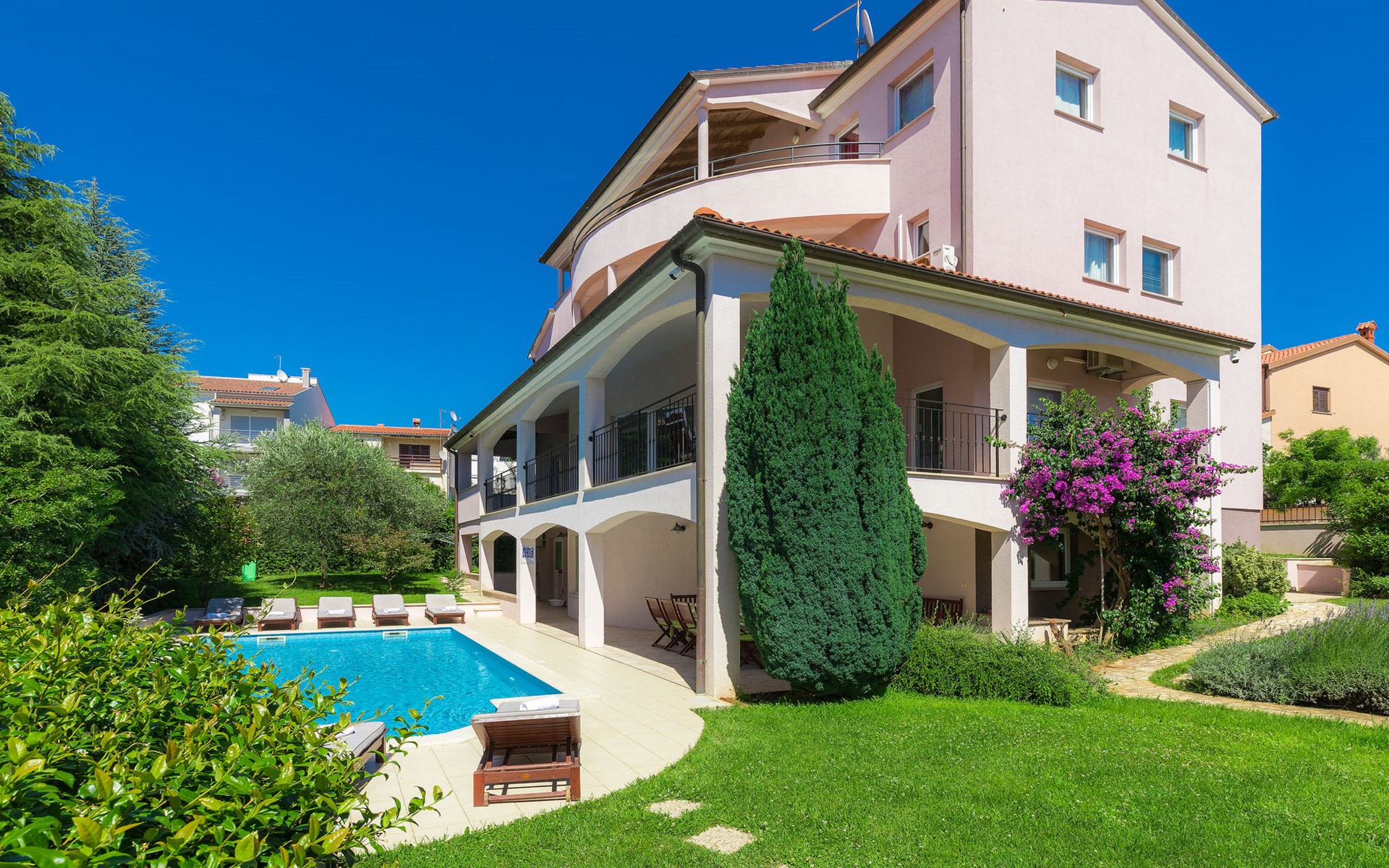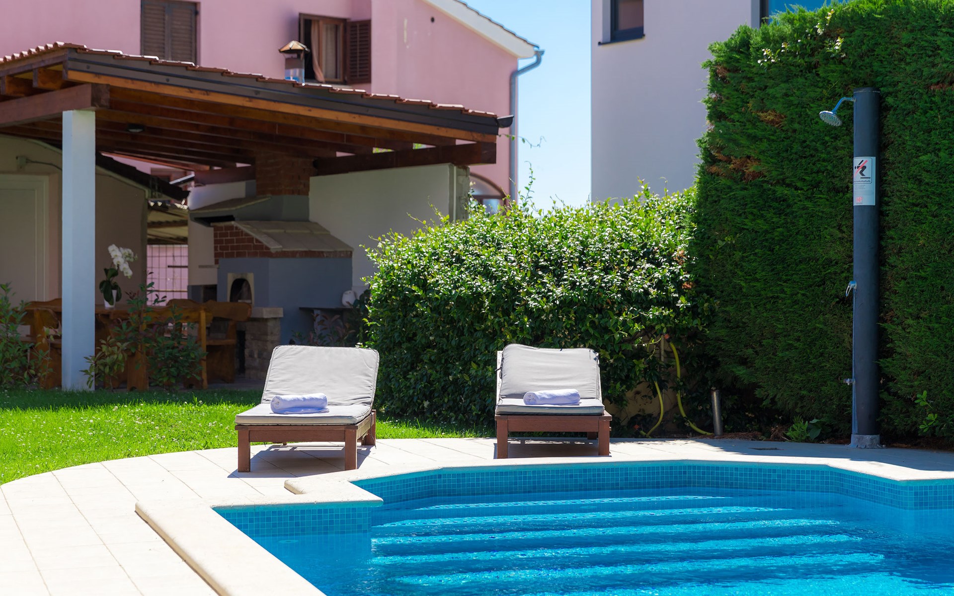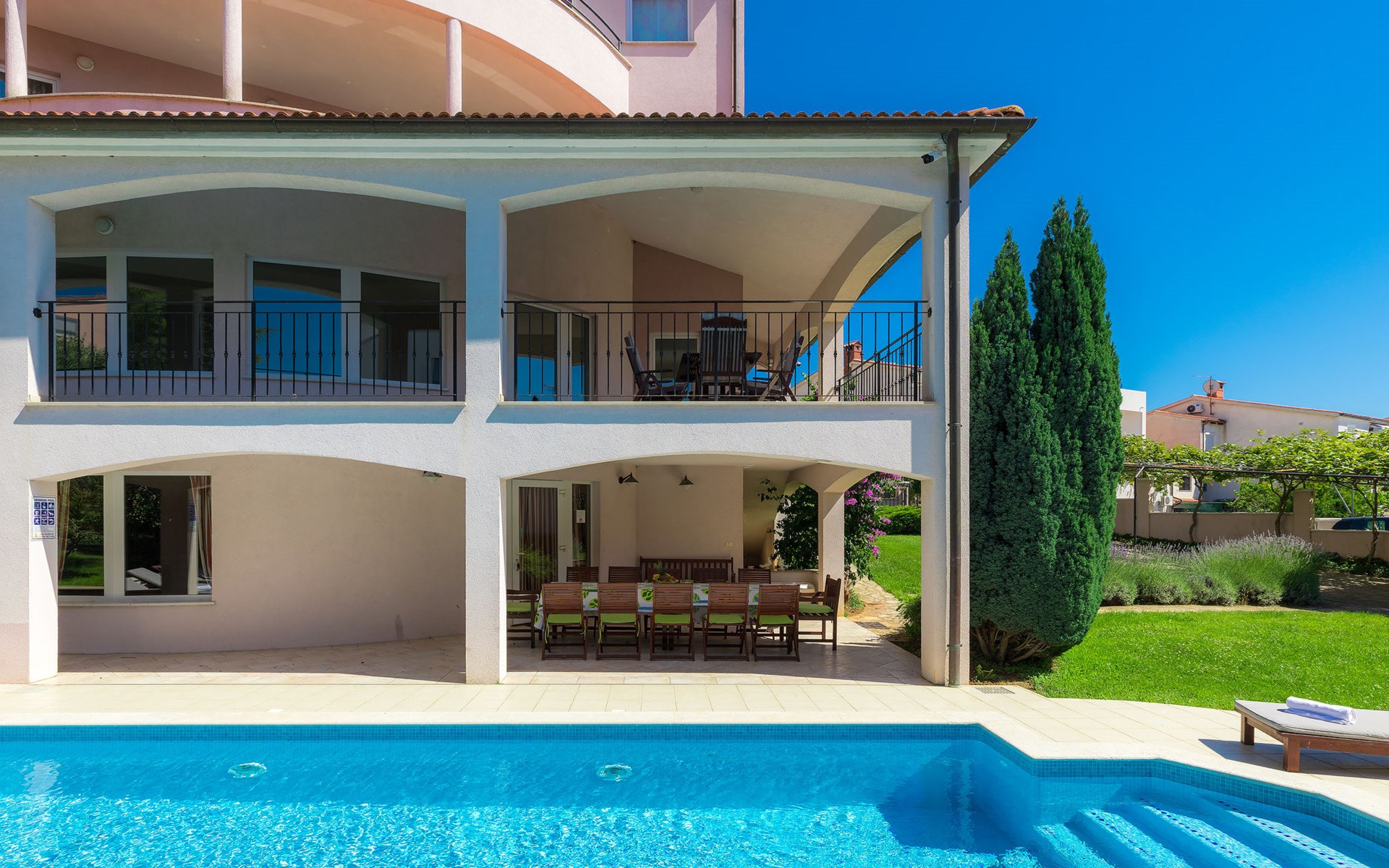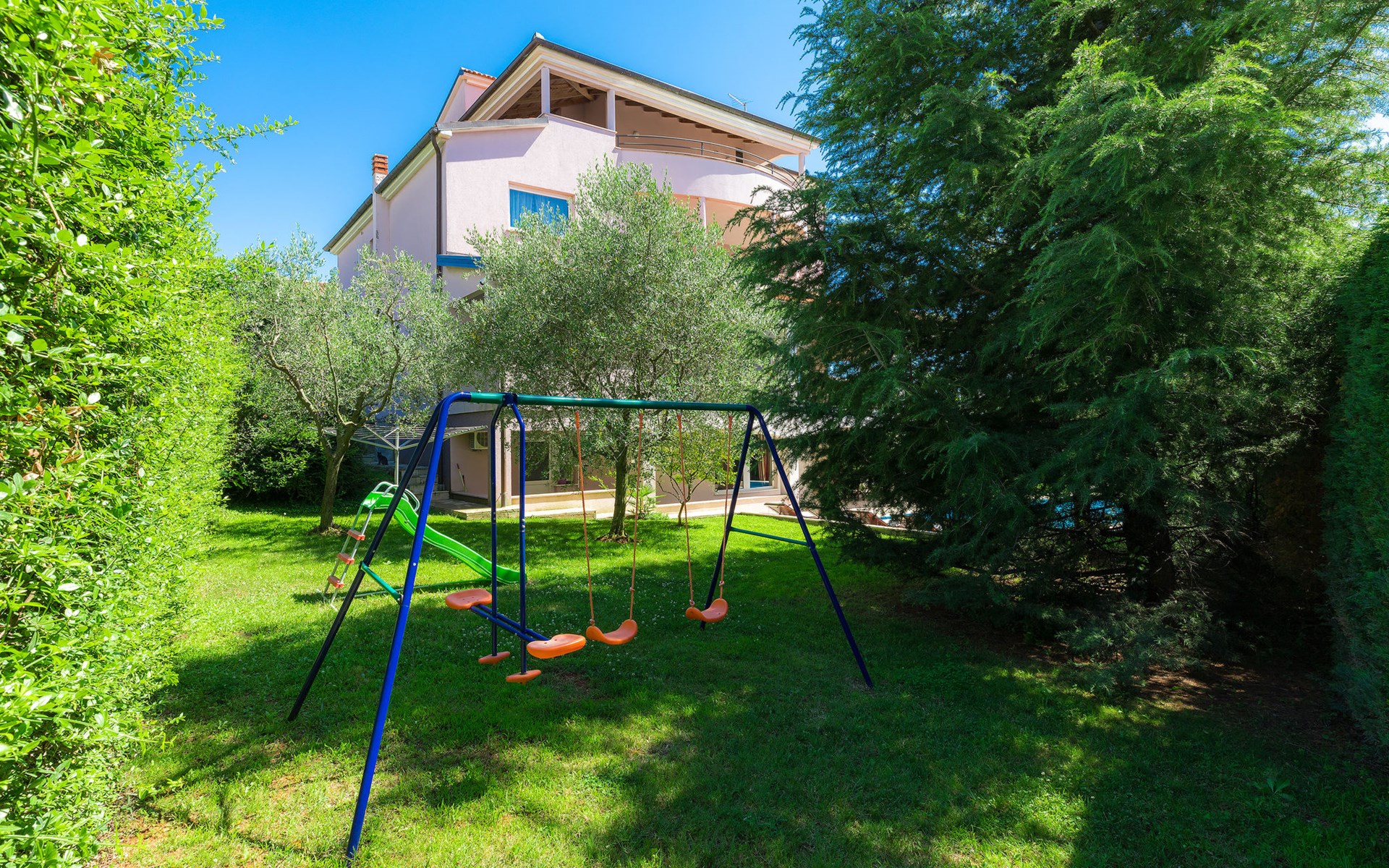 Štinjan 5 km van Pula: Mooi villa "Carmen", van 4 verdiepingen. 3 km van het centrum van Fažana, zonnige ligging, 1 km van zee, 1 km van het strand. Voor alleengebruik: terrein 1.000 m2 (omheind), mooie tuin met gazon, openluchtzwembad verwarmd (40 m2, 140 cm diepte, seizoensgebonden beschikbaarheid: 09.Mrt. - 21.Nov.) met trap en zout-elektrolyse. Onregelmatig zwembad. Buitendouche, barbecue, kinderspeelplaats (glijbaan, schommel). In het huis: internetaansluiting, fitnessruimte, biljart, wasmachine. Parkeerplaats (voor 4 auto's) bij het huis op het terrein. Winkel 350 m, winkelcentrum 4 km, restaurant, bushalte 350 m, kiezelstrand 1 km, rotsstrand 1 km. Golfterrein (18 holes) 4.5 km, tennis 1 km, manege 1.5 km, wandelroutes 100 m vanaf het huis, fietspad 150 m. Attracties in de buurt: NP Brijuni 4.5 km, Amphitheater 6 km. De eigenaar accepteert geen jeugdgroepen. Vliegveld 15 km van het huis. Openluchtzwembad verwarmd (extra). Geen huisdieren toegestaan.