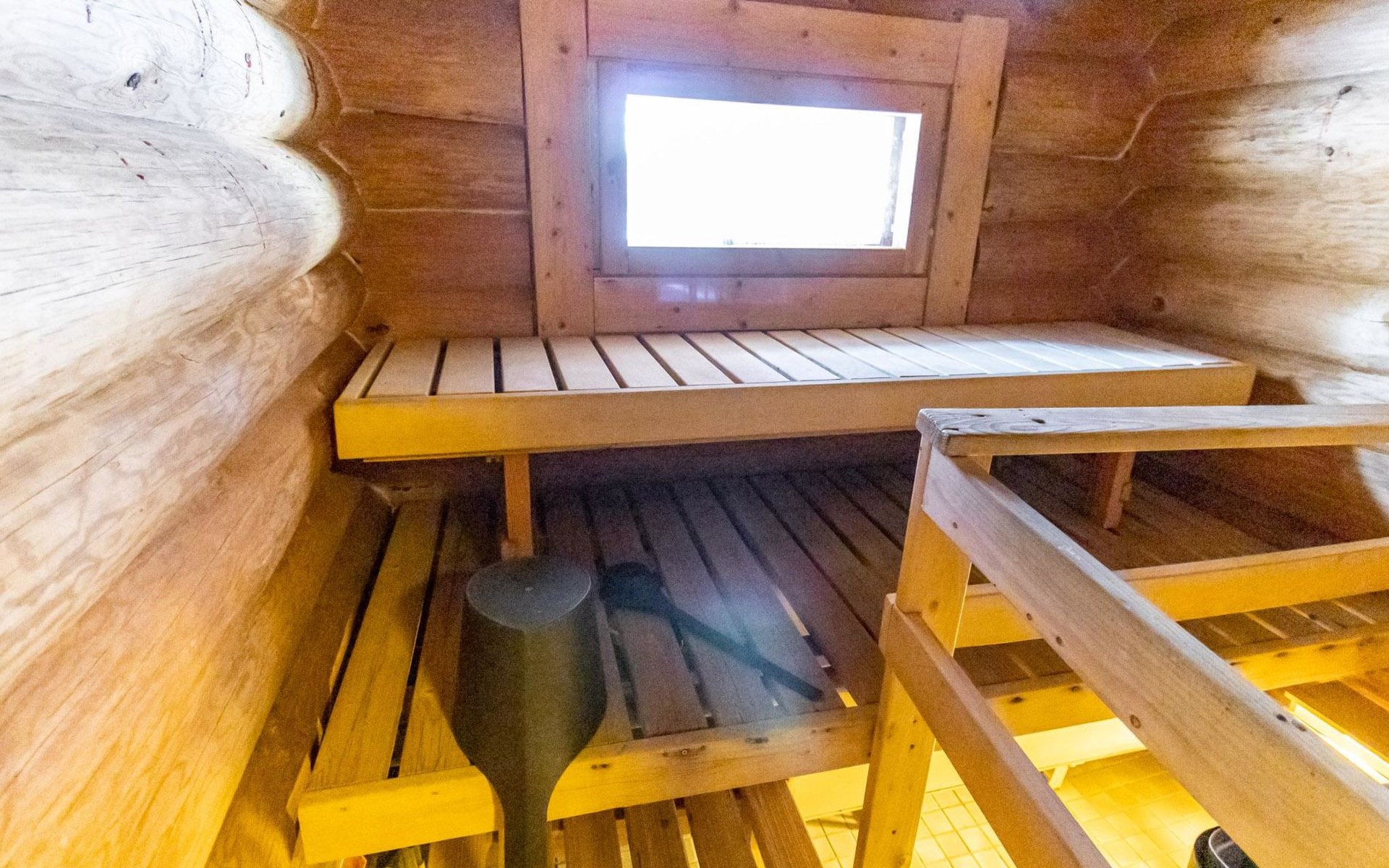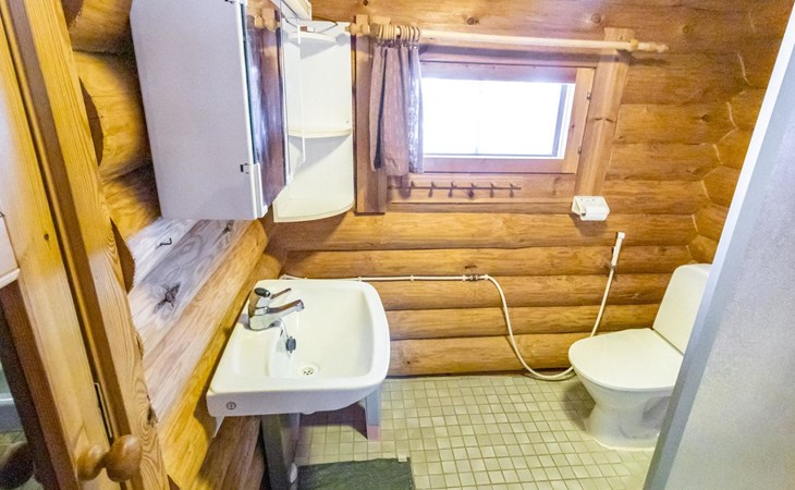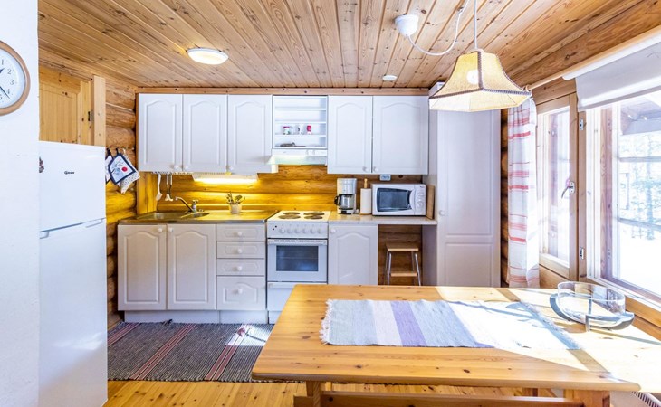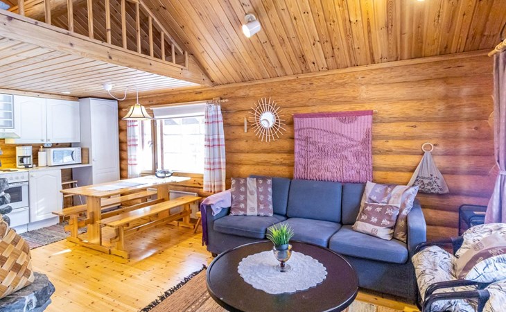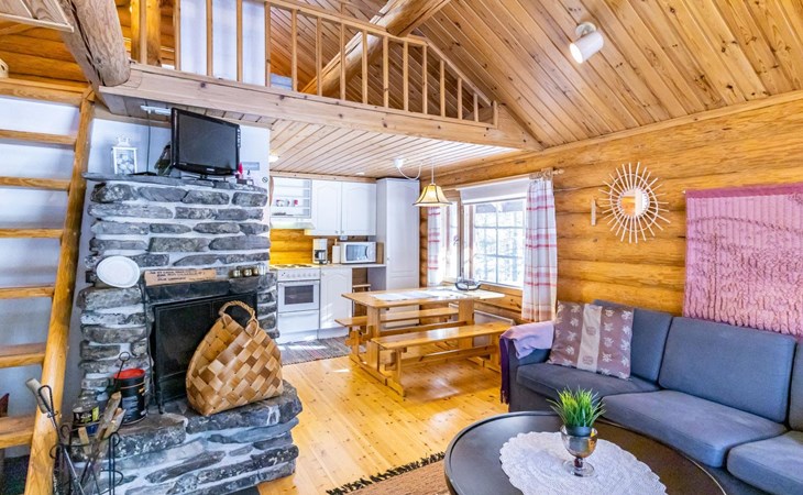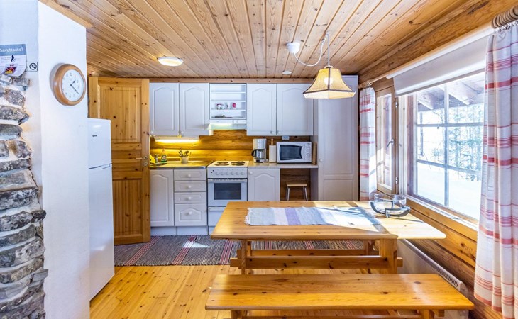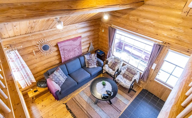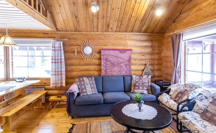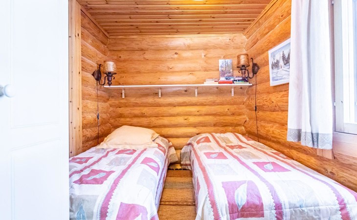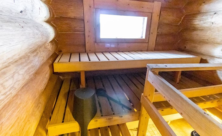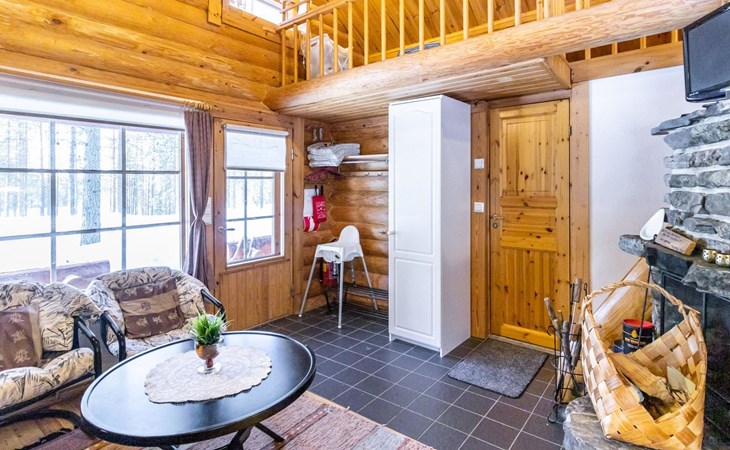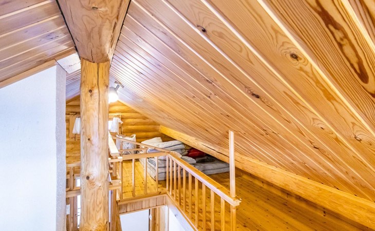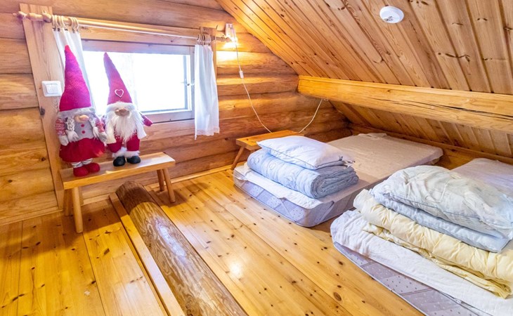 On the ground floor kitchen, bedroom with two beds 80*200 cm, sauna (electric sauna stove), washroom and open porch. In addition, sleeping loft (steep stairs), with 2 box springs, 80*200 cm. No child gate.