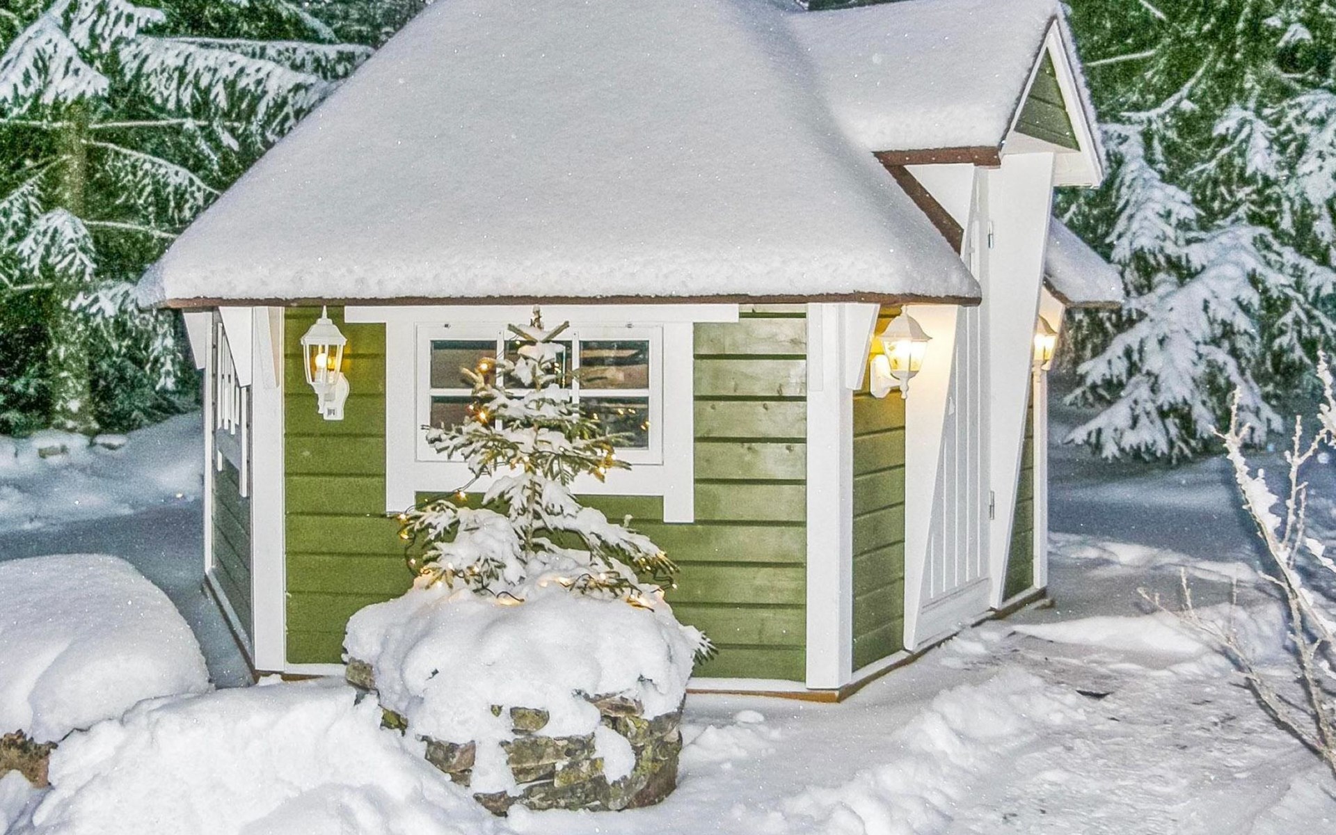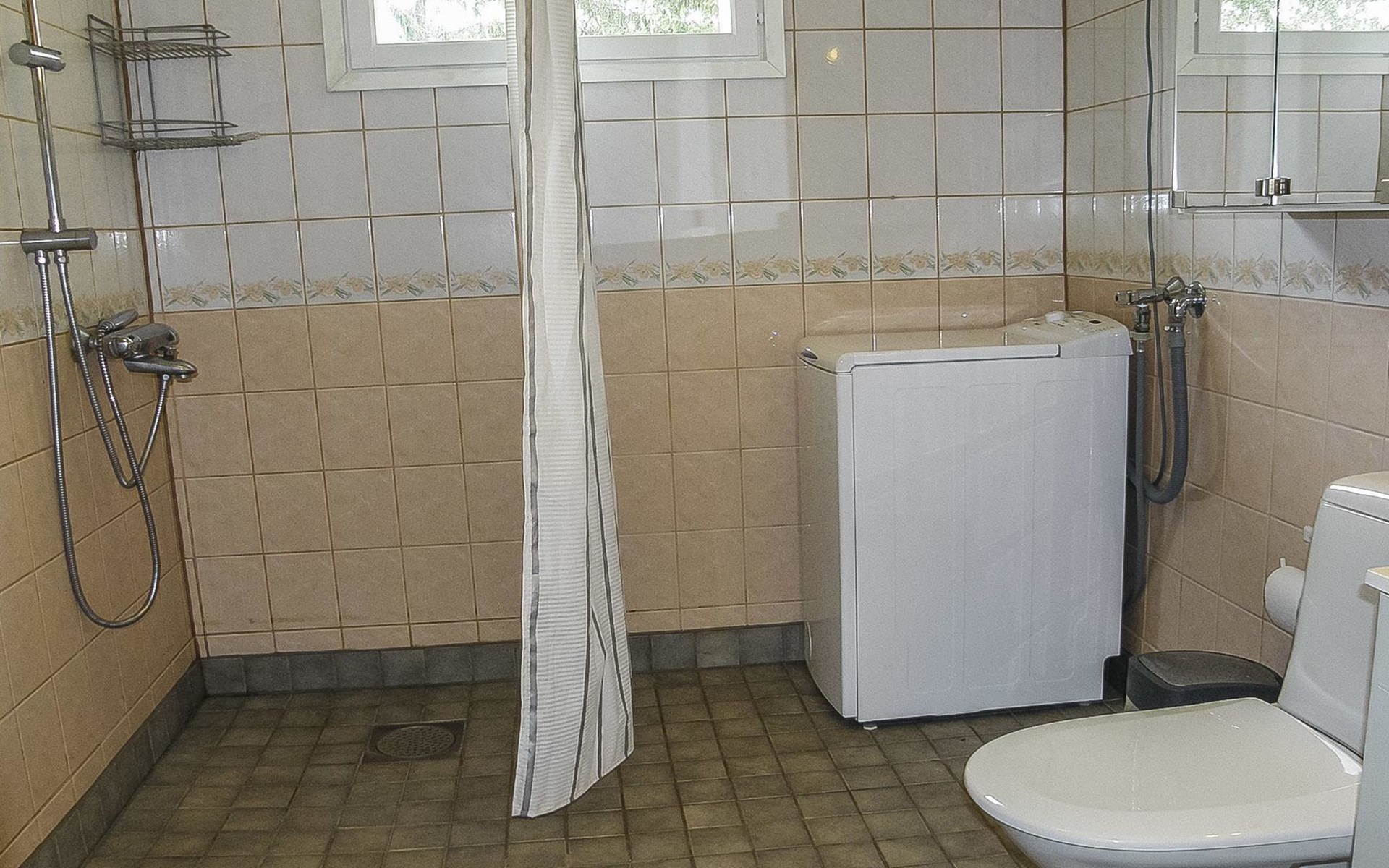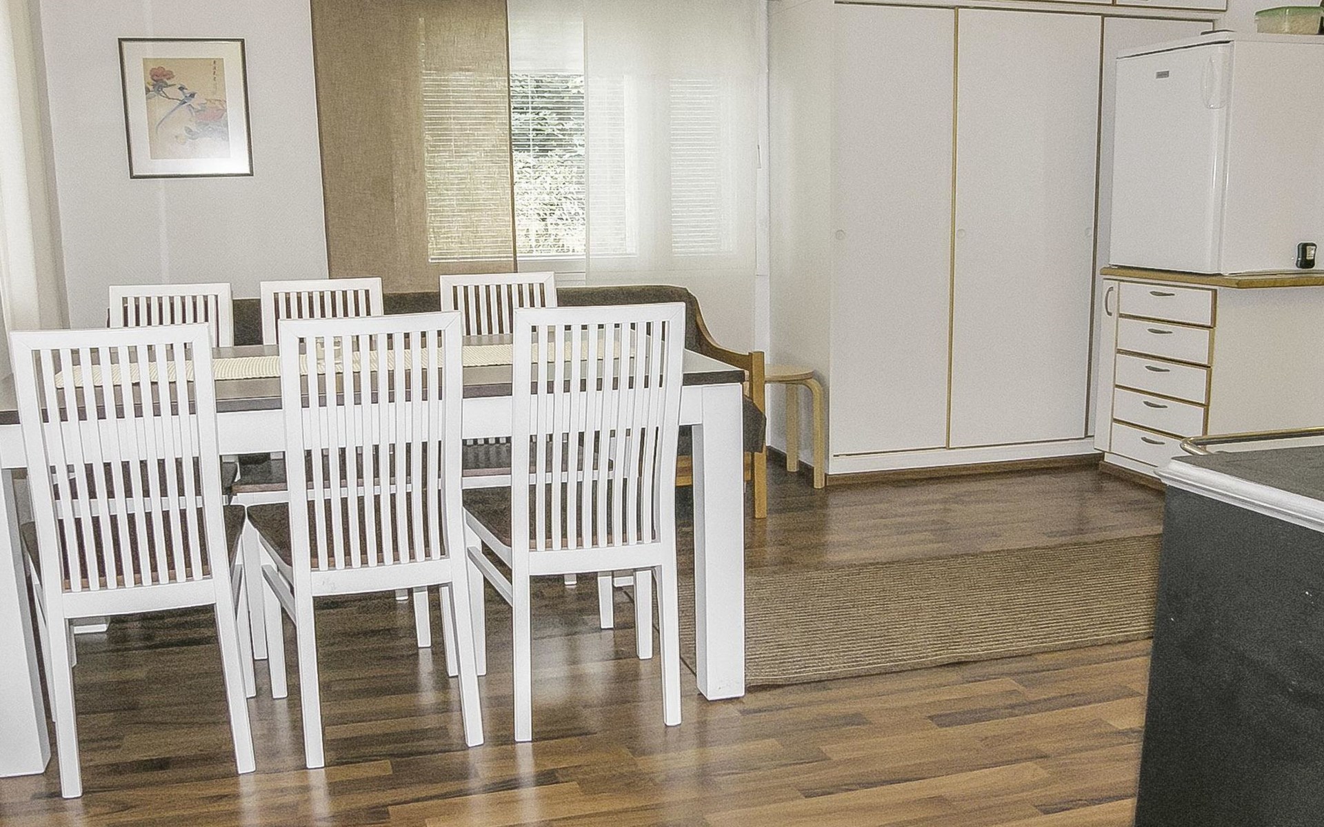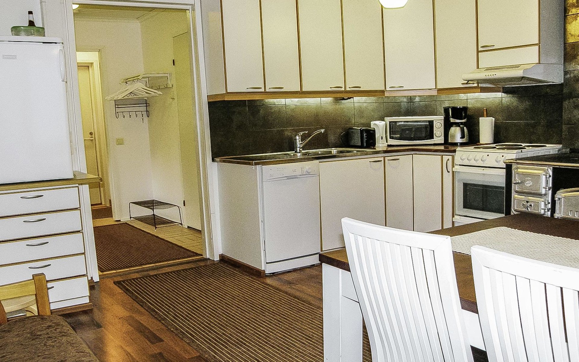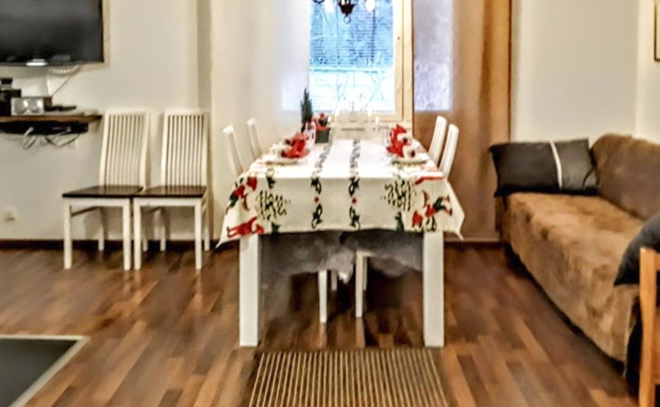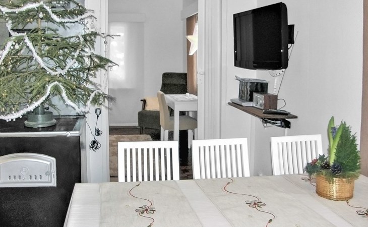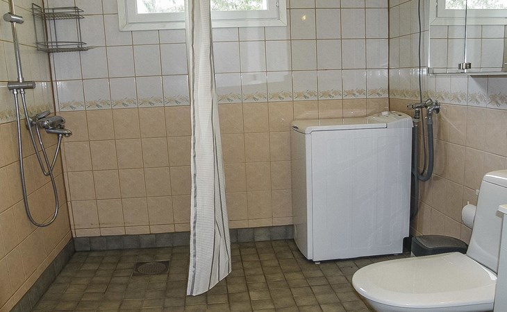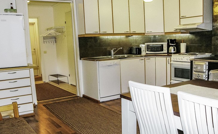 In the cottage Air heat pump for cooling and heating. The kitchen is also equipped with e.g. toaster, kettle, coffee maker, tableware for six people and versatile cooking utensils, in addition to an electric and wooden stove with a small baking oven.