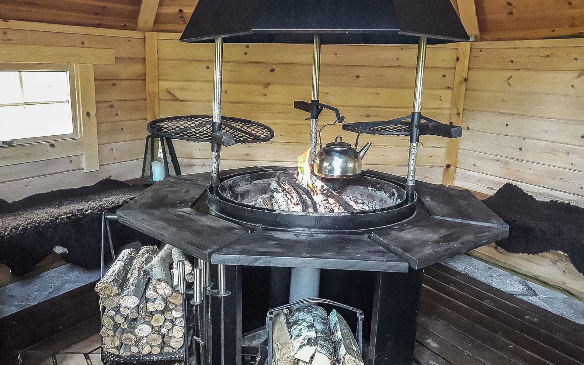 In the atmospheric hut, dim lights, radio, cooler bag, smoke box, pot for coffee making and lamb skins on the benches. Firewood is included in the price.