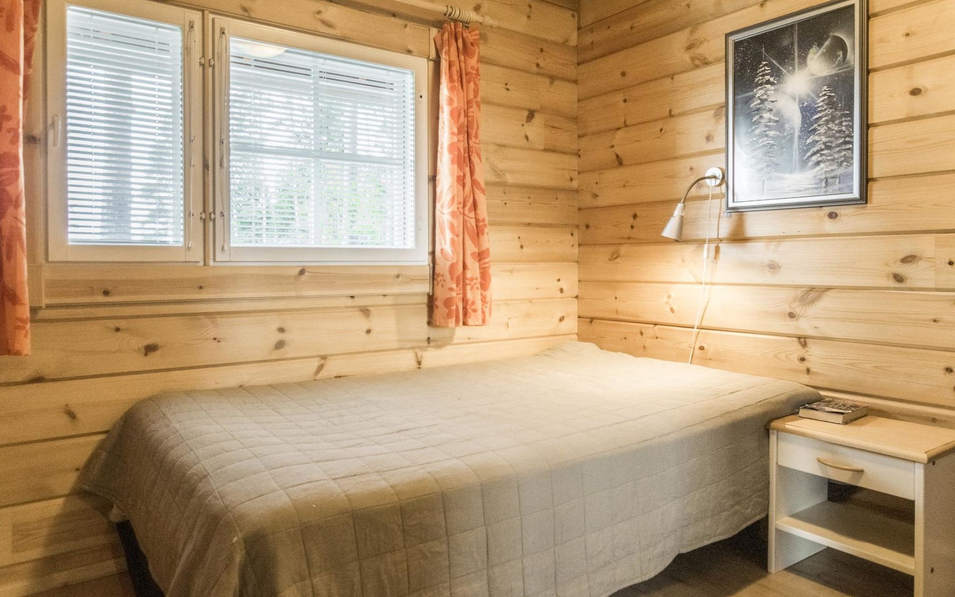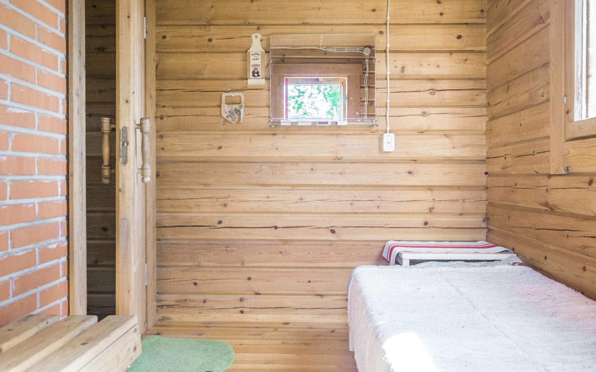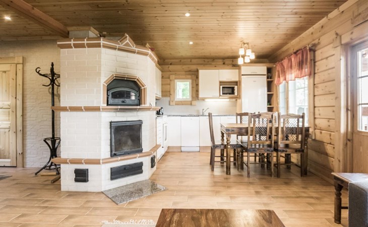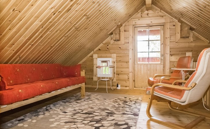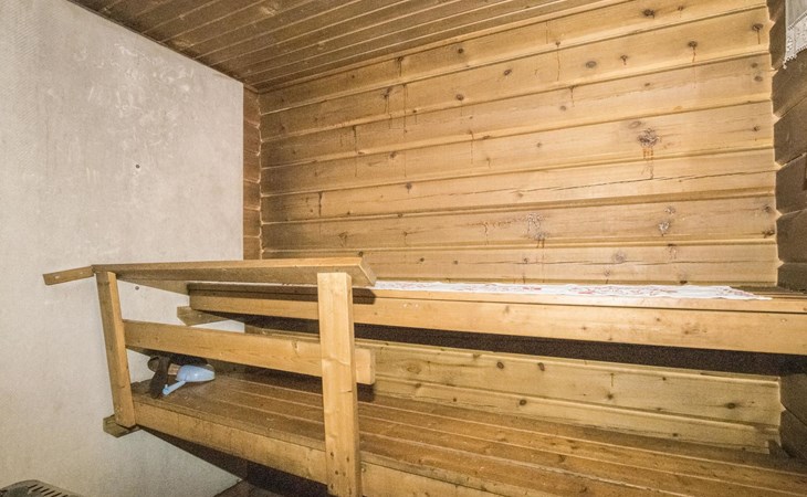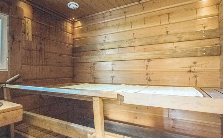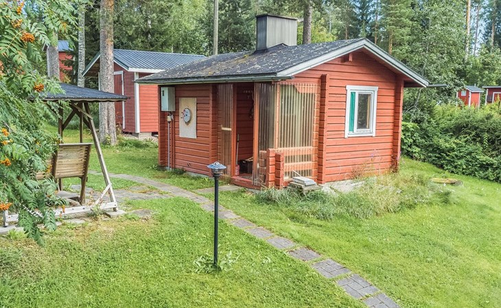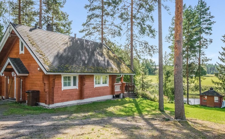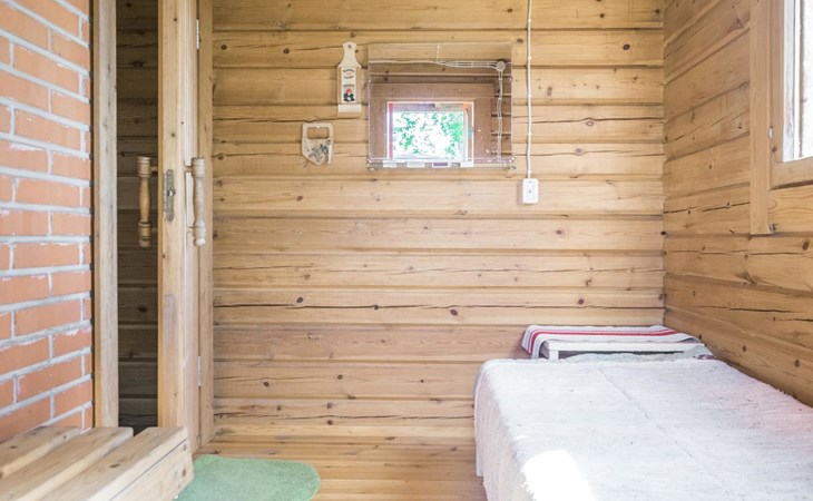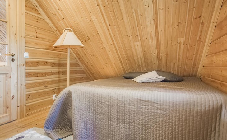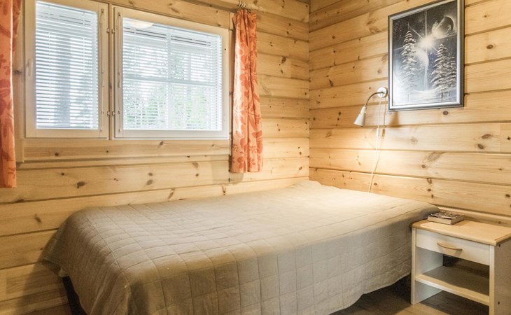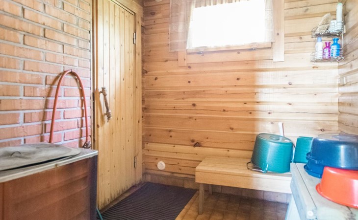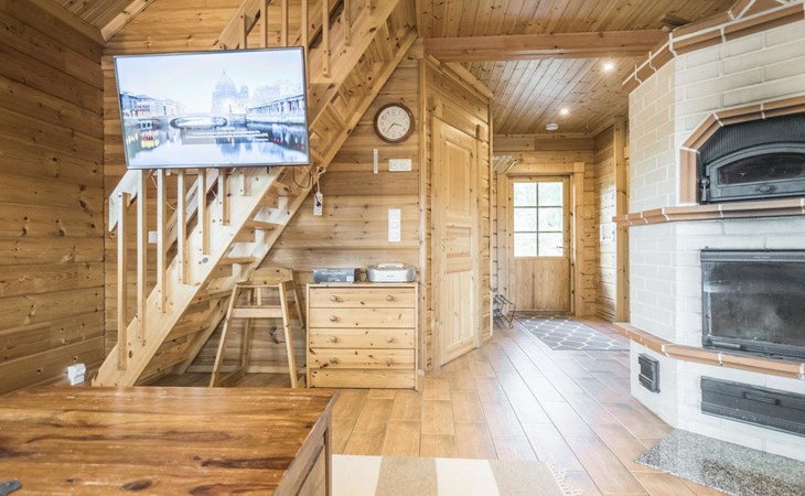 Laminated log chalet 2009, living room/kitchen convertible sofa, bedroom 1 bed (width 120 cm), washroom, sauna (electric stove), terrace. Upstairs: bedroom double bed (width 160 cm) + 2 mattresses, lounge and balcony. Downstairs: underfloor heating. River bank sauna.