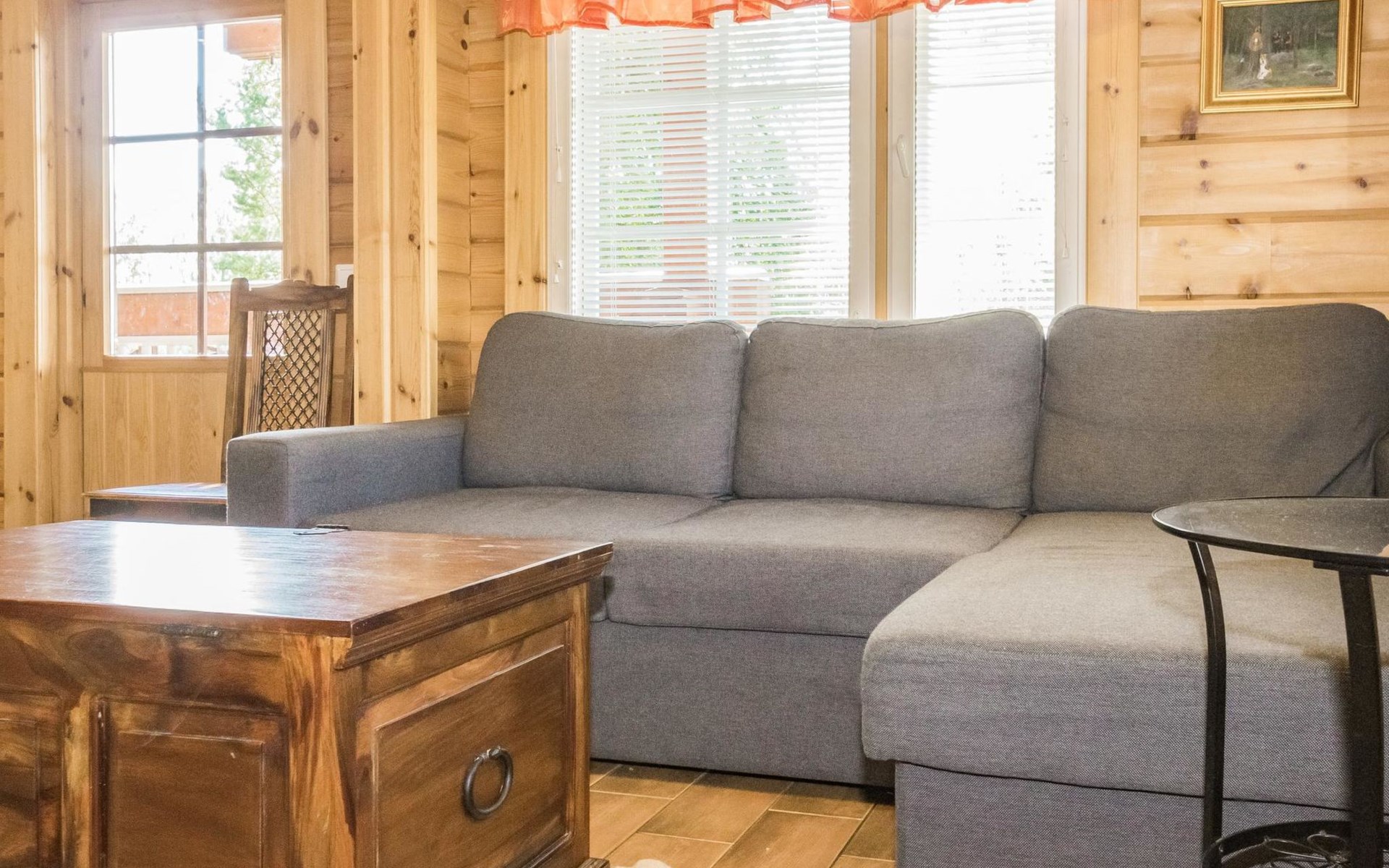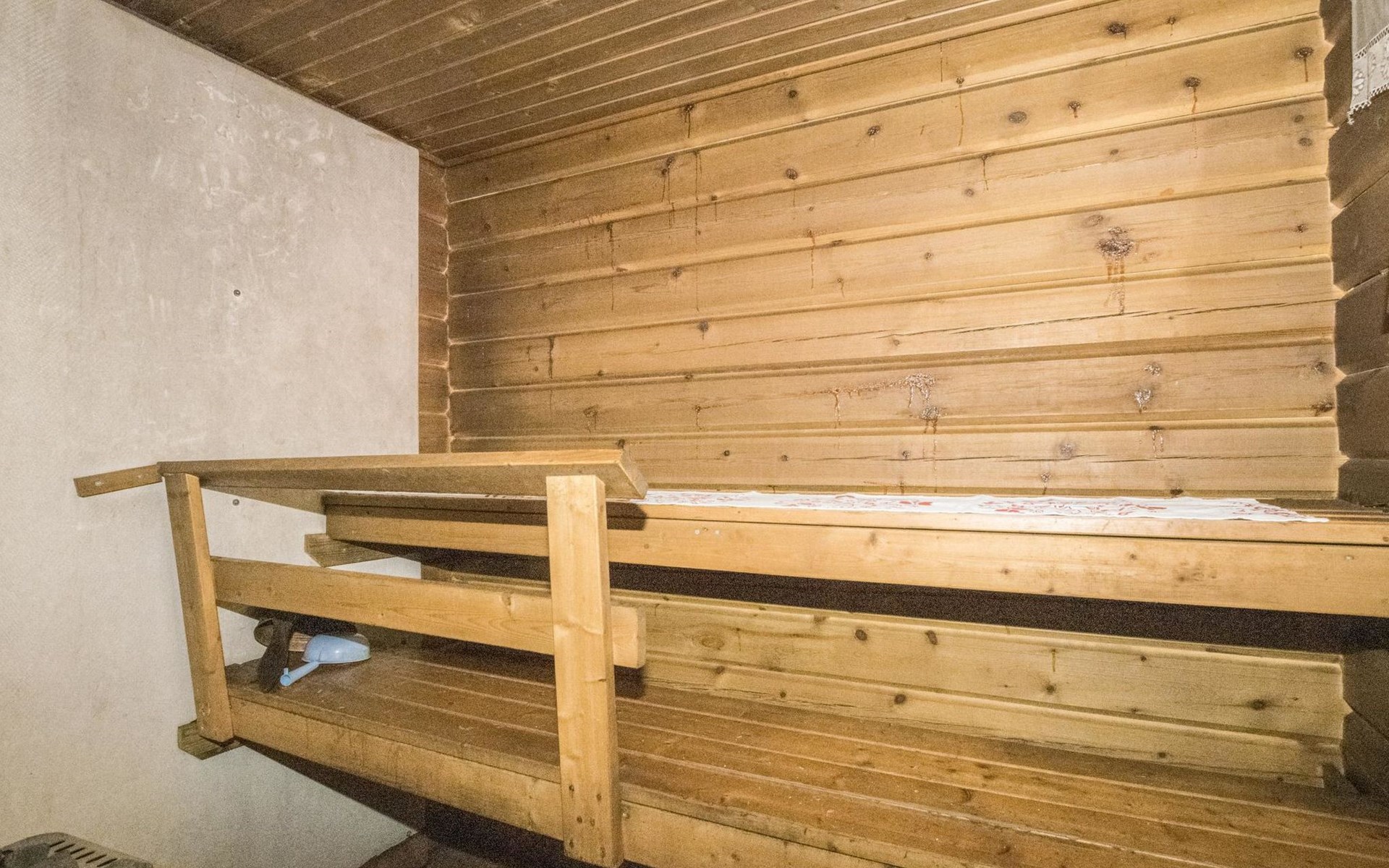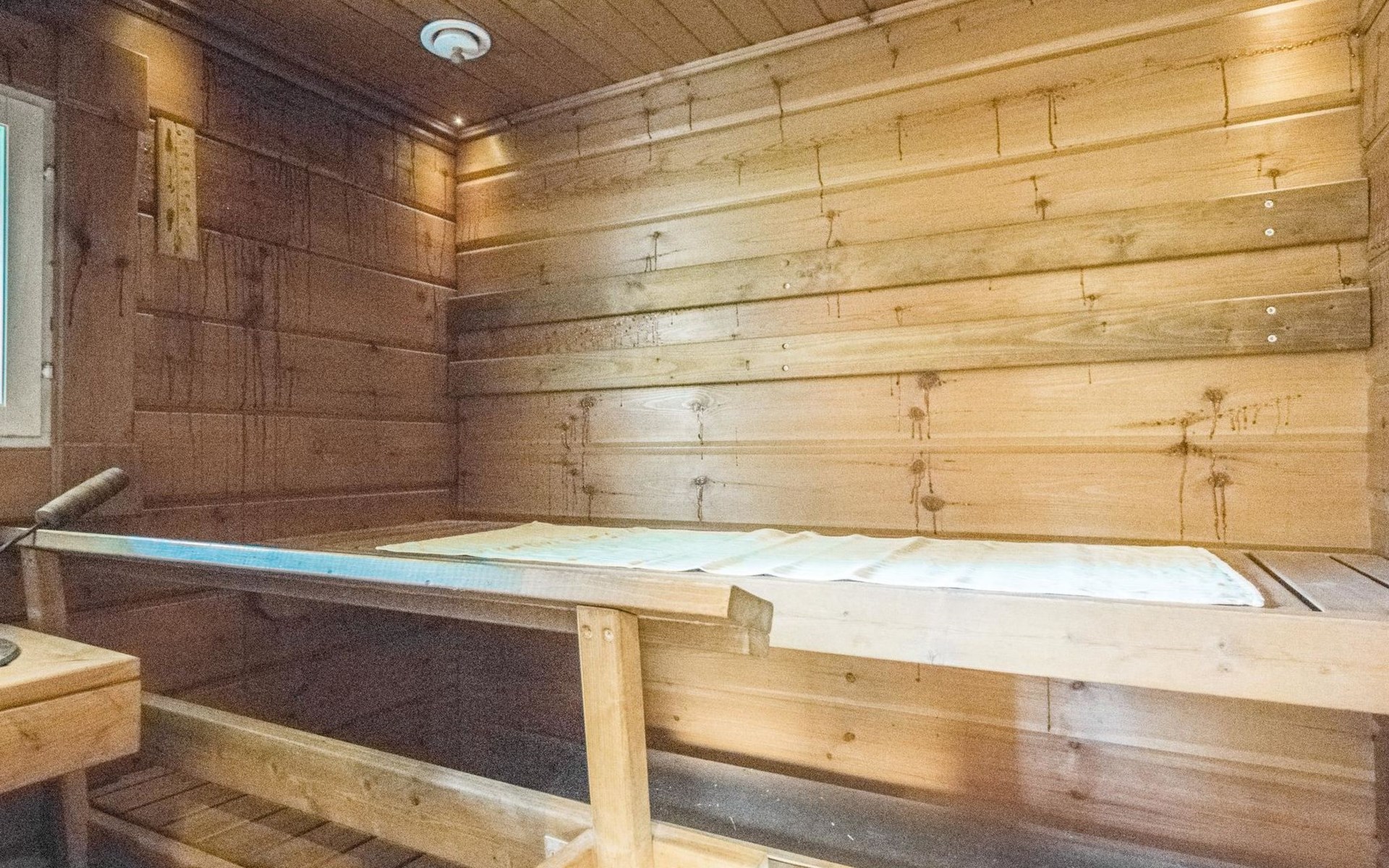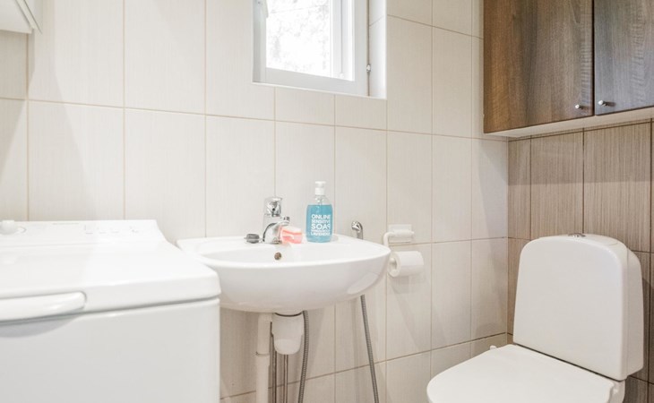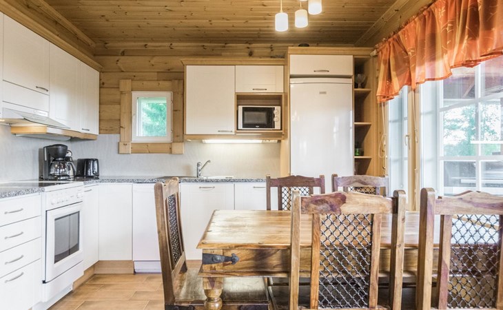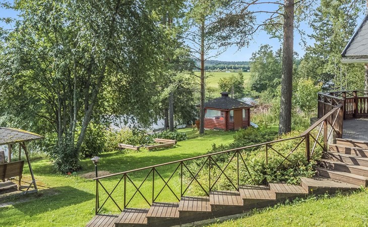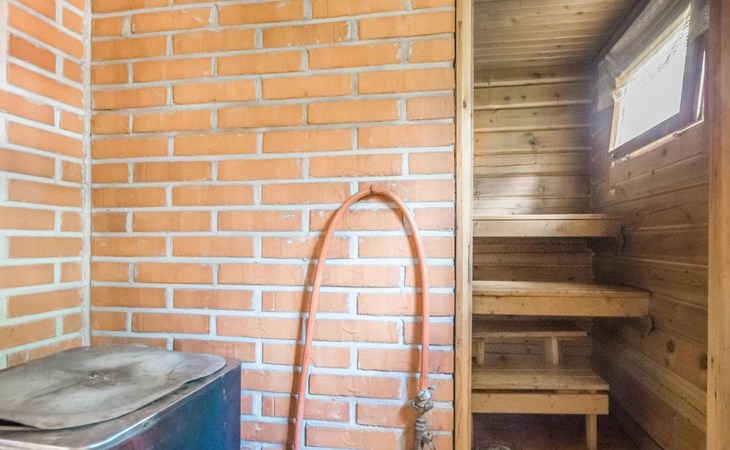 Laminated log chalet 2009, living room/kitchen convertible sofa, bedroom 1 bed (width 120 cm), washroom, sauna (electric stove), terrace. Upstairs: bedroom double bed (width 160 cm) + 2 mattresses, lounge and balcony. Downstairs: underfloor heating. River bank sauna.