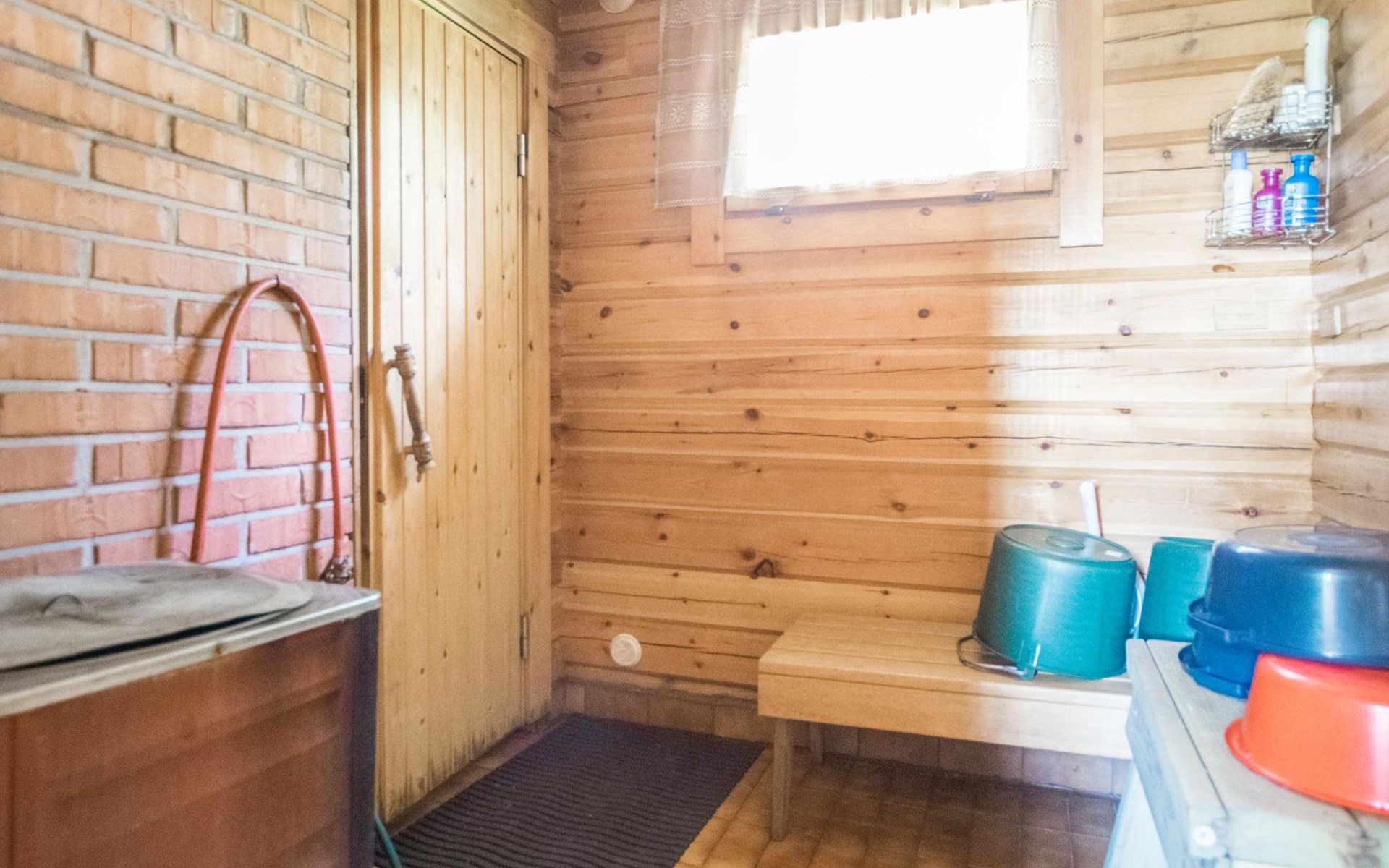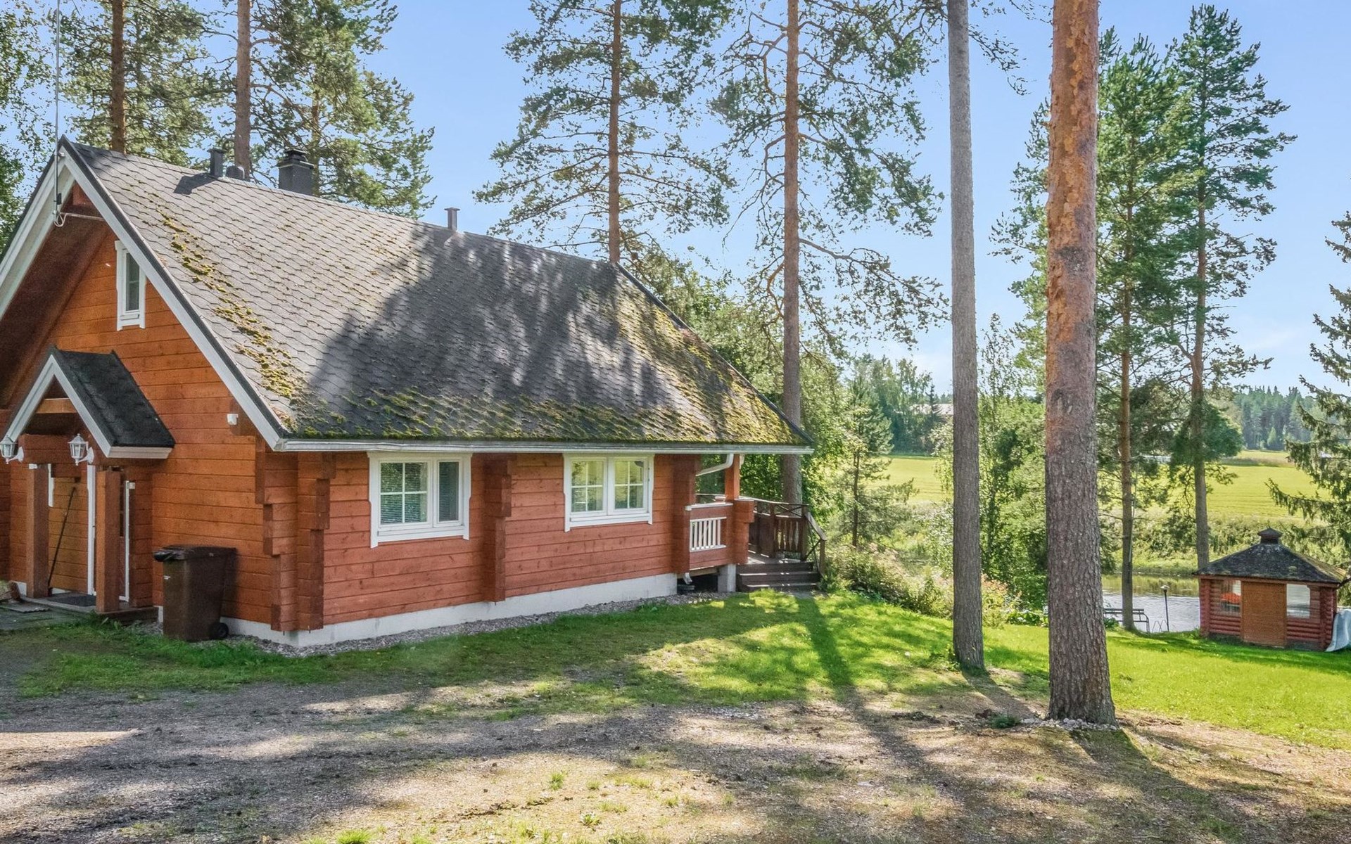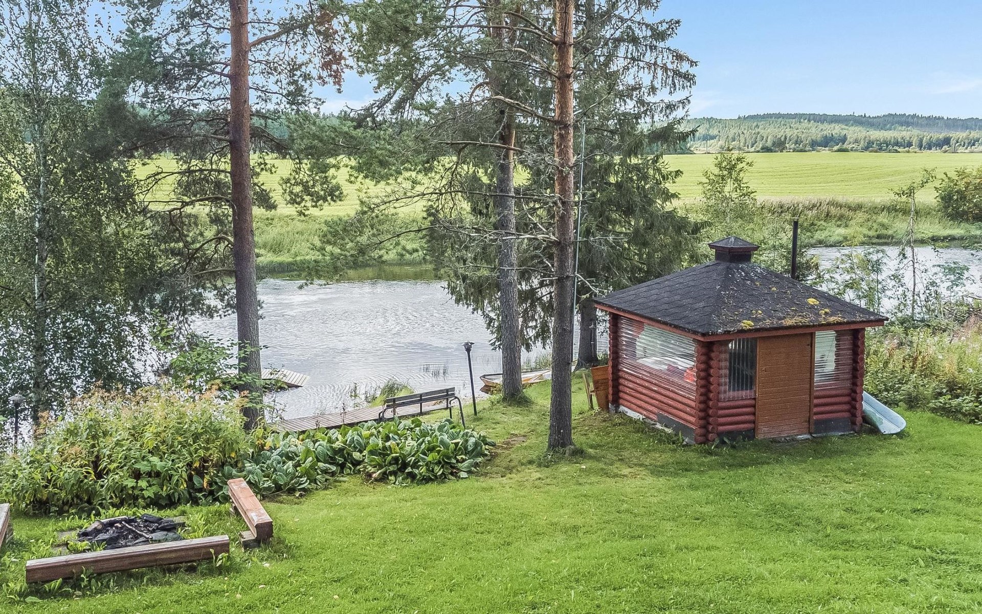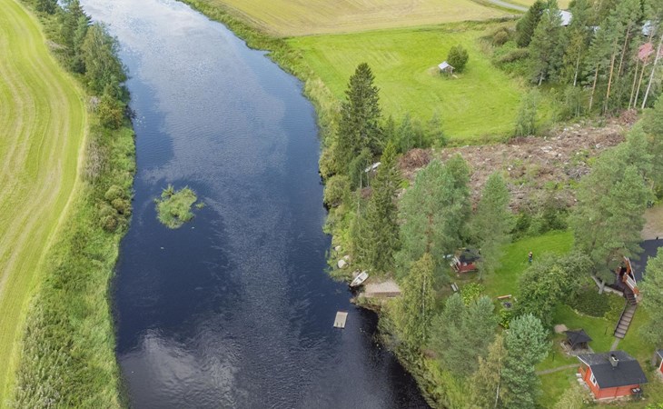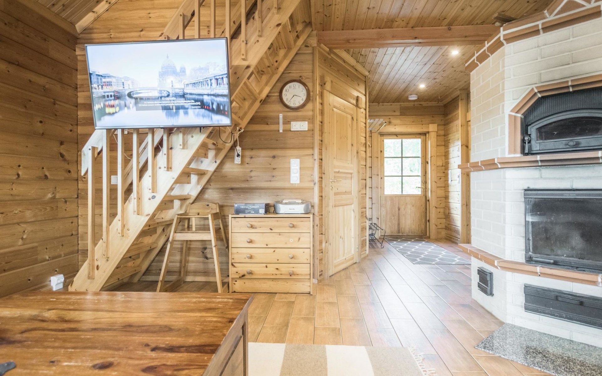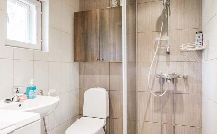Laminated log chalet 2009, living room/kitchen convertible sofa, bedroom 1 bed (width 120 cm), washroom, sauna (electric stove), terrace. Upstairs: bedroom double bed (width 160 cm) + 2 mattresses, lounge and balcony. Downstairs: underfloor heating. River bank sauna.