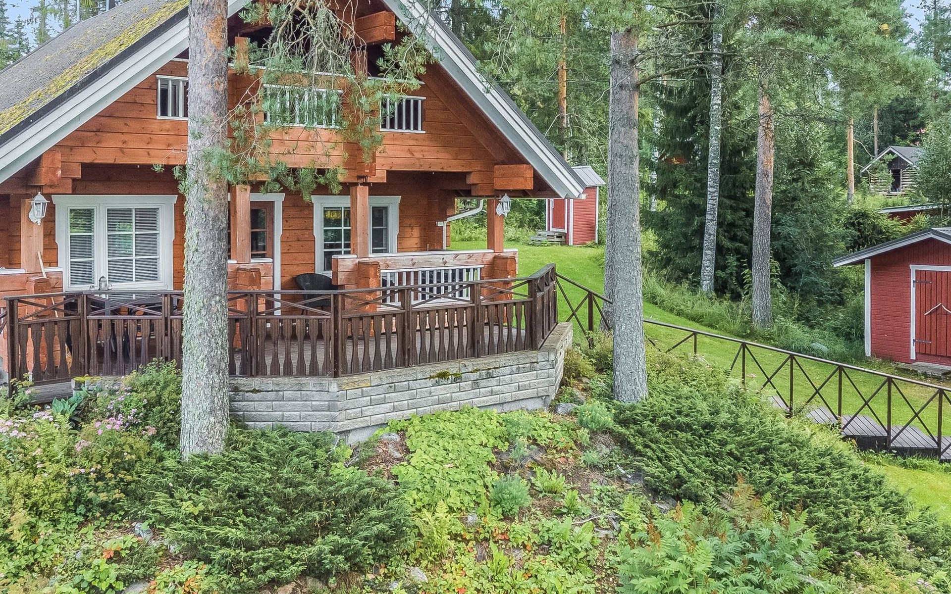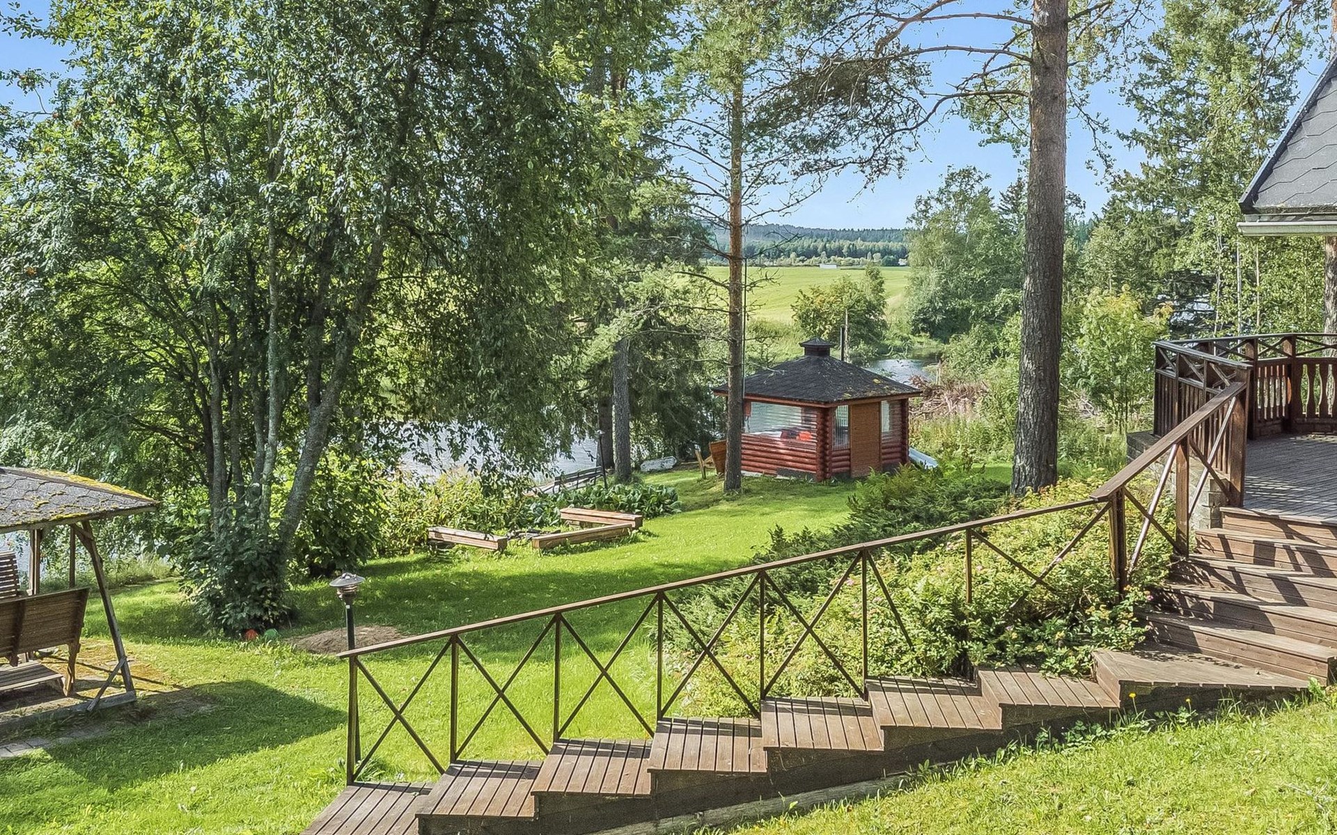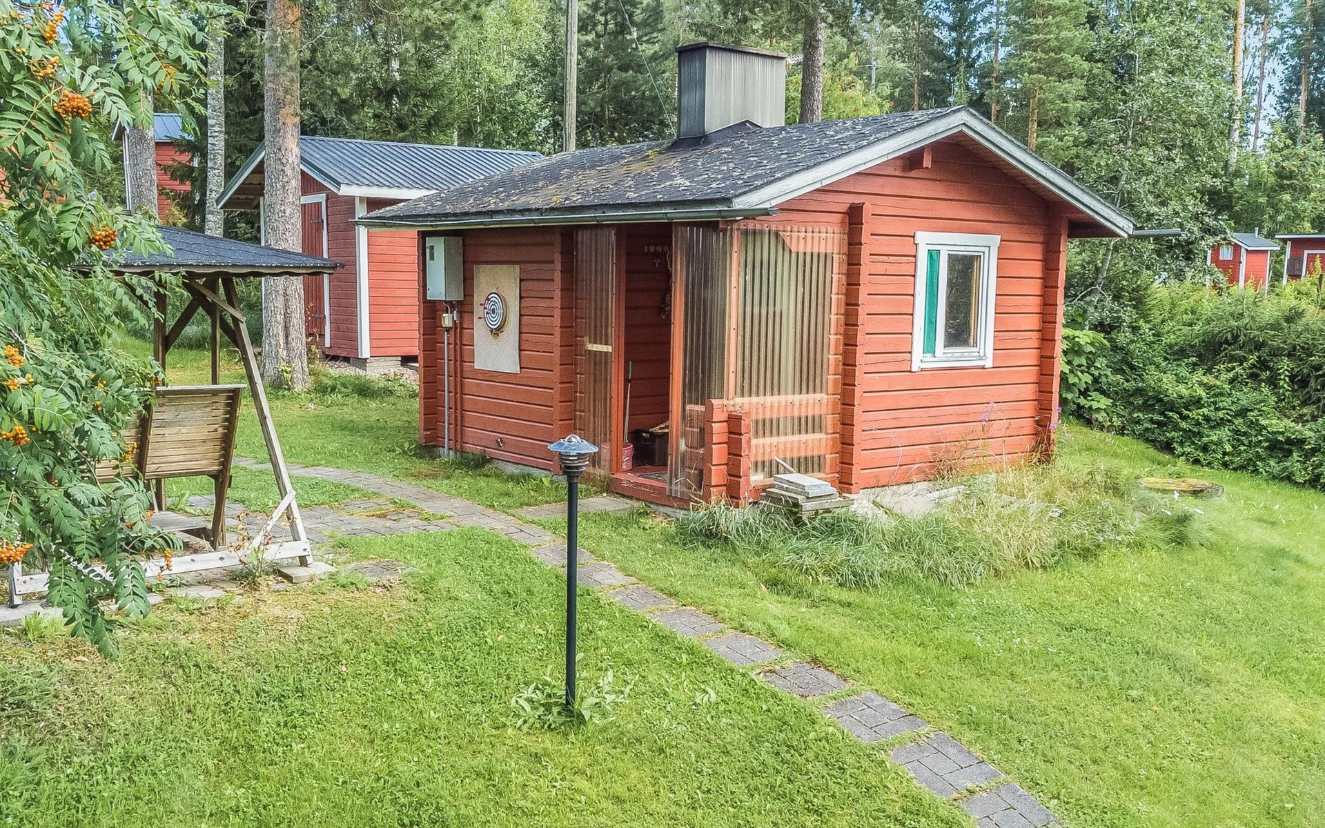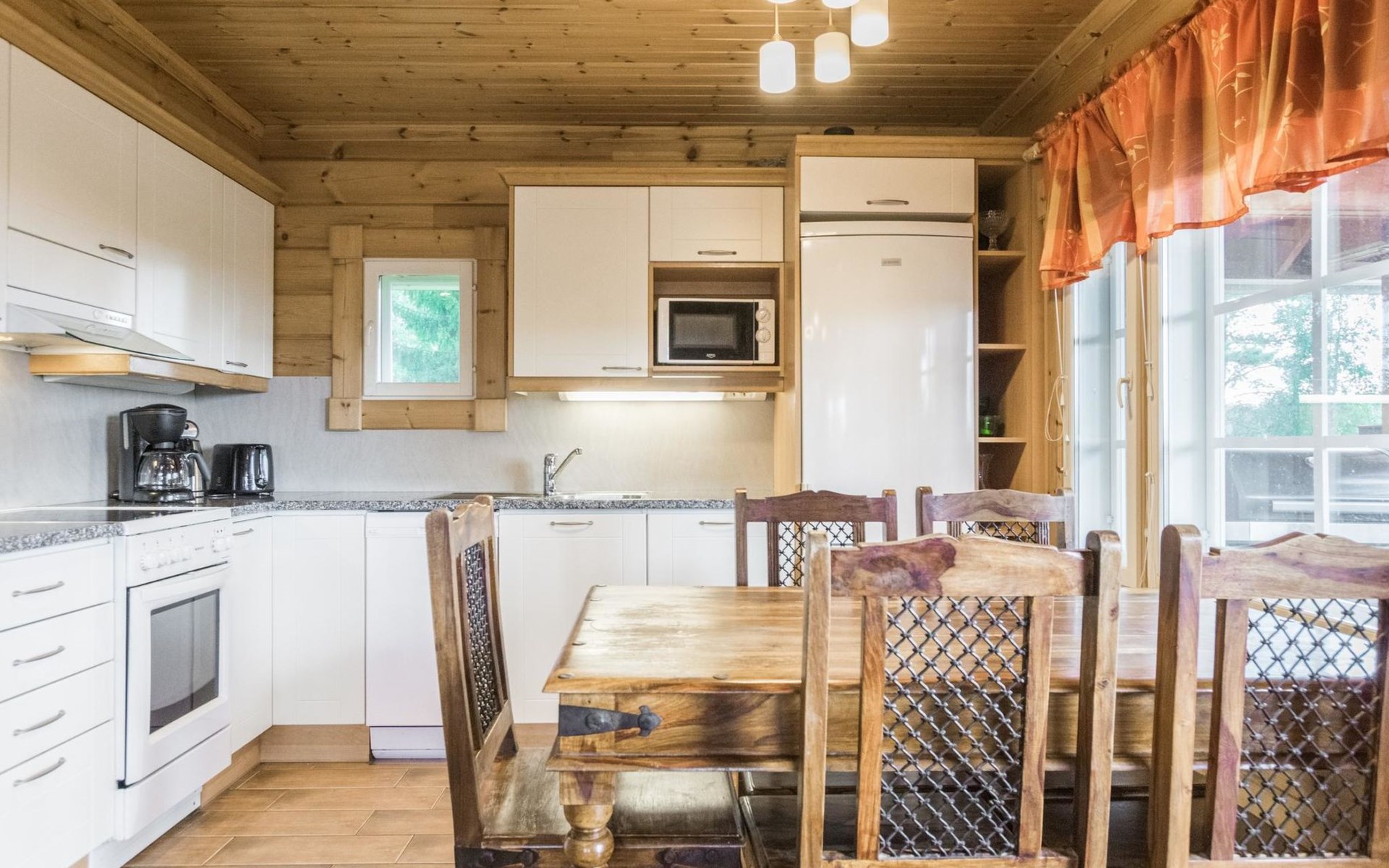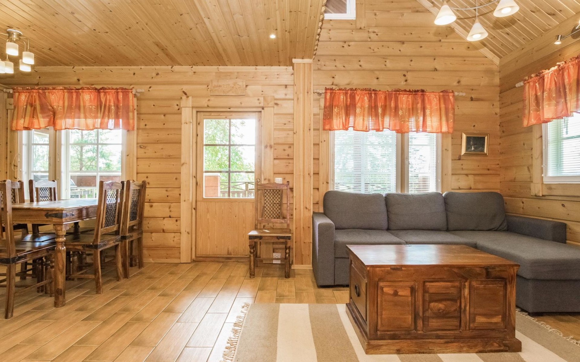 Laminated log chalet 2009, living room/kitchen convertible sofa, bedroom 1 bed (width 120 cm), washroom, sauna (electric stove), terrace. Upstairs: bedroom double bed (width 160 cm) + 2 mattresses, lounge and balcony. Downstairs: underfloor heating. River bank sauna.