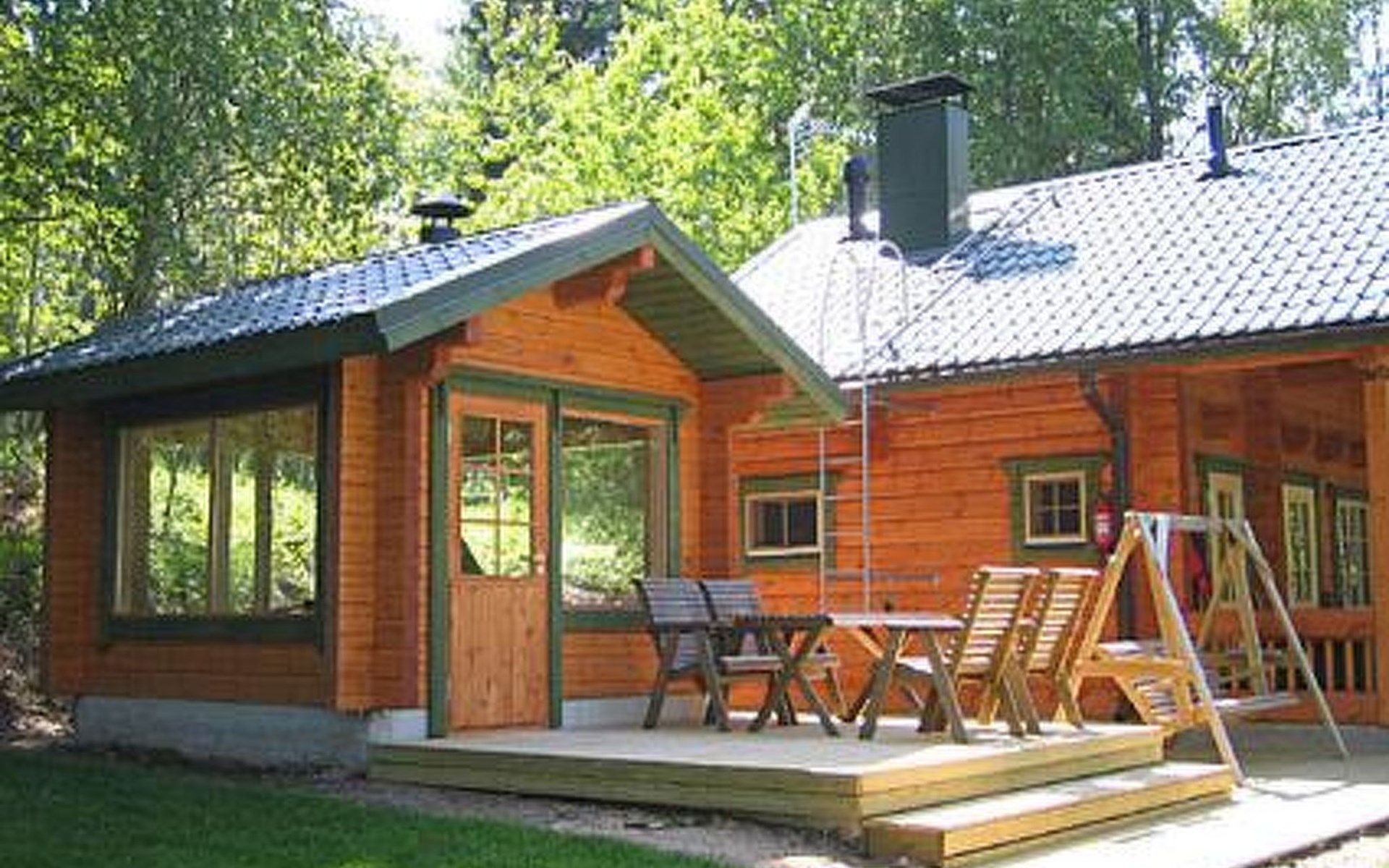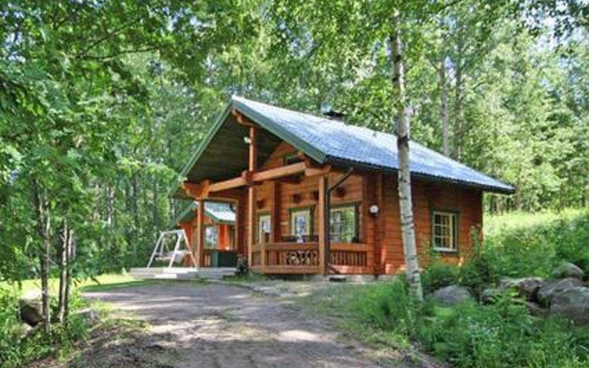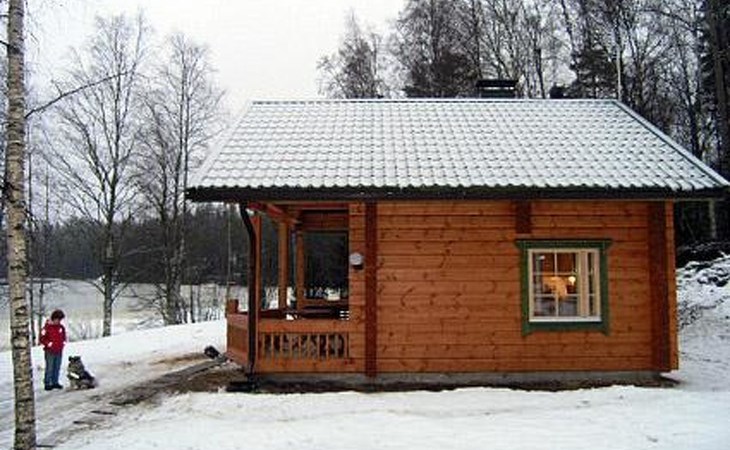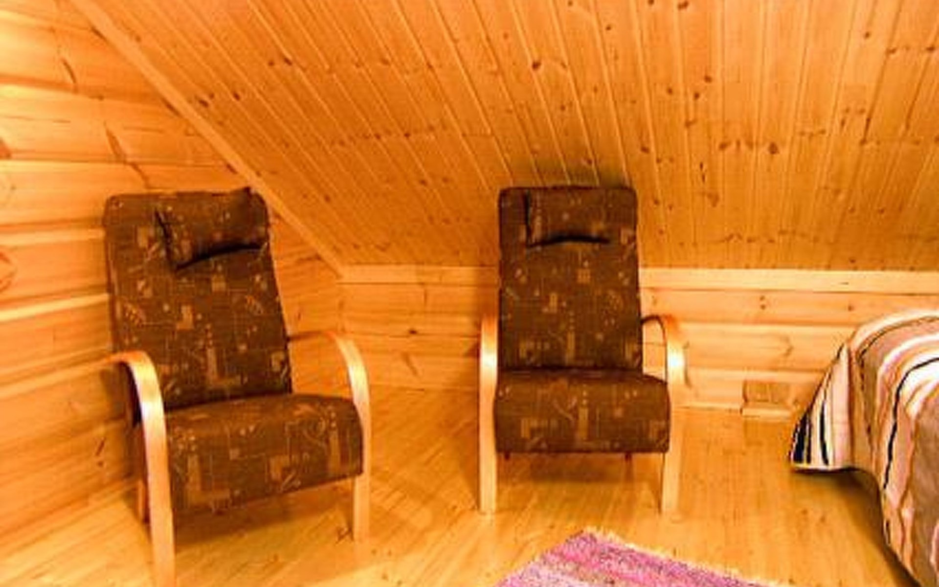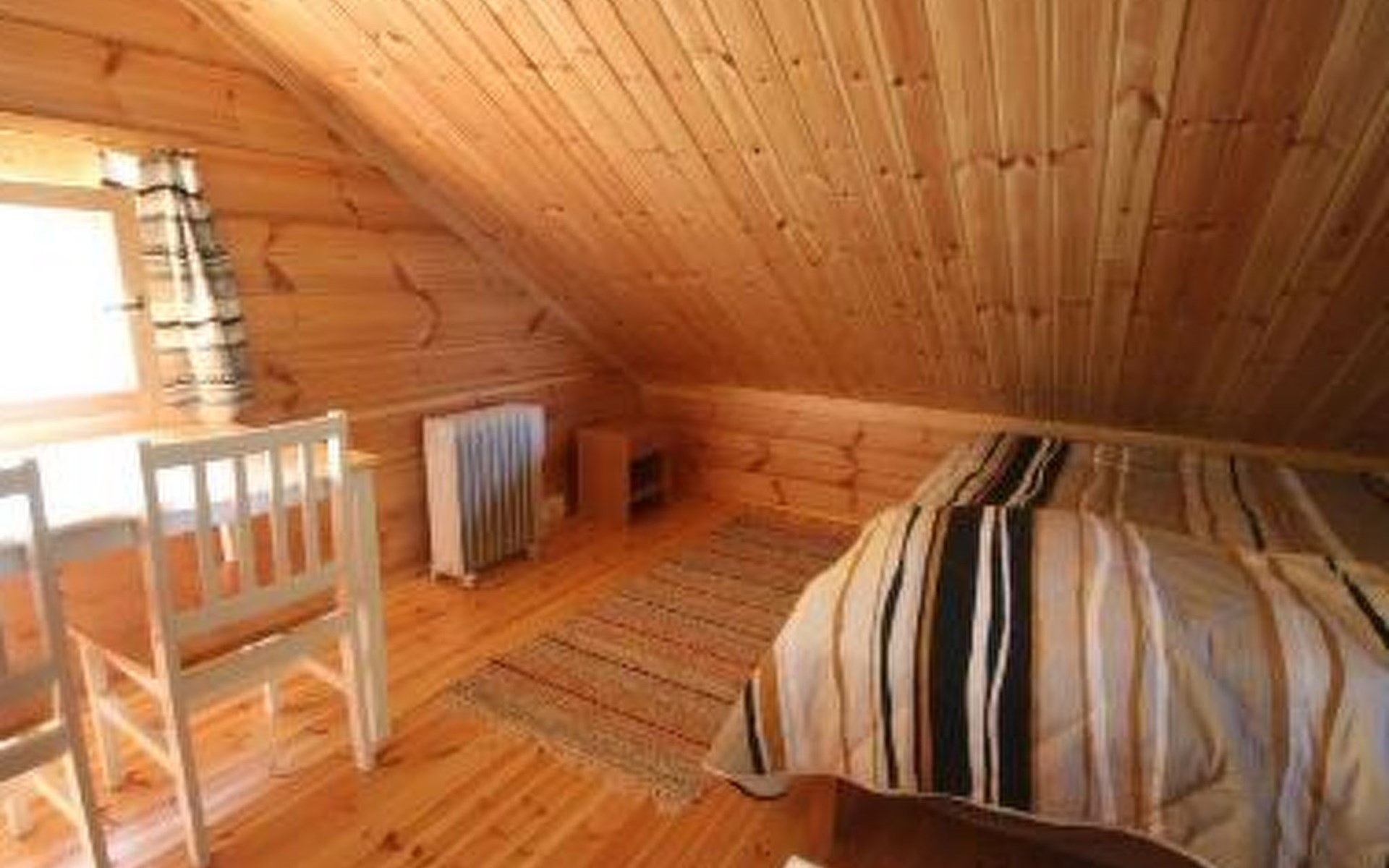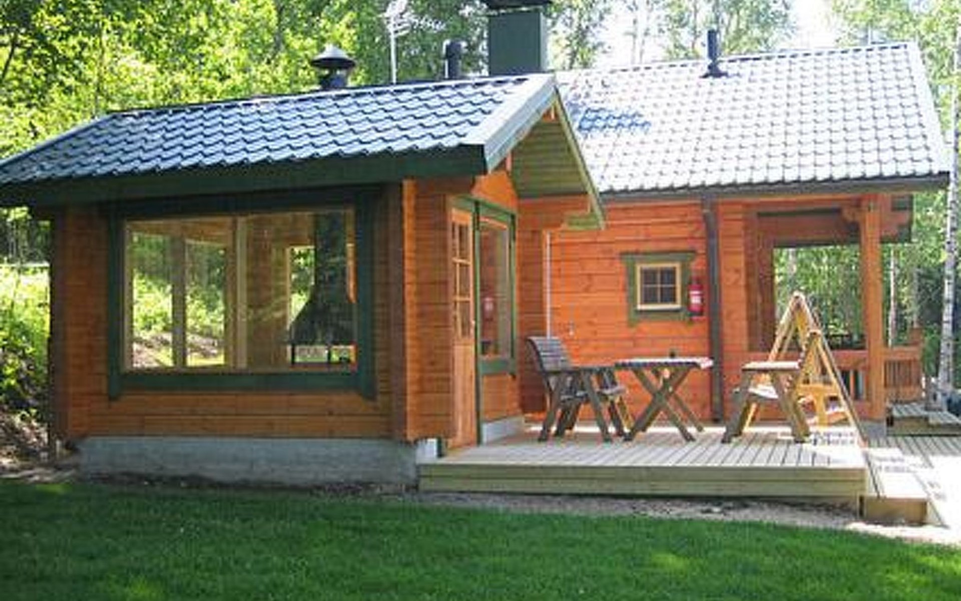 Log cottage 2008, living room/kitchen, bedroom upstairs 2 beds and convertible sofa, steep stairs to upper floor, washroom, shower, sauna (wood-burning stove), large open porch.