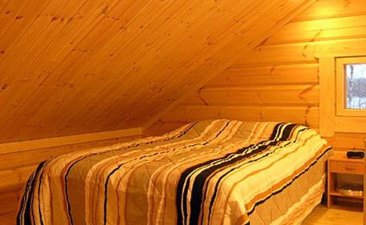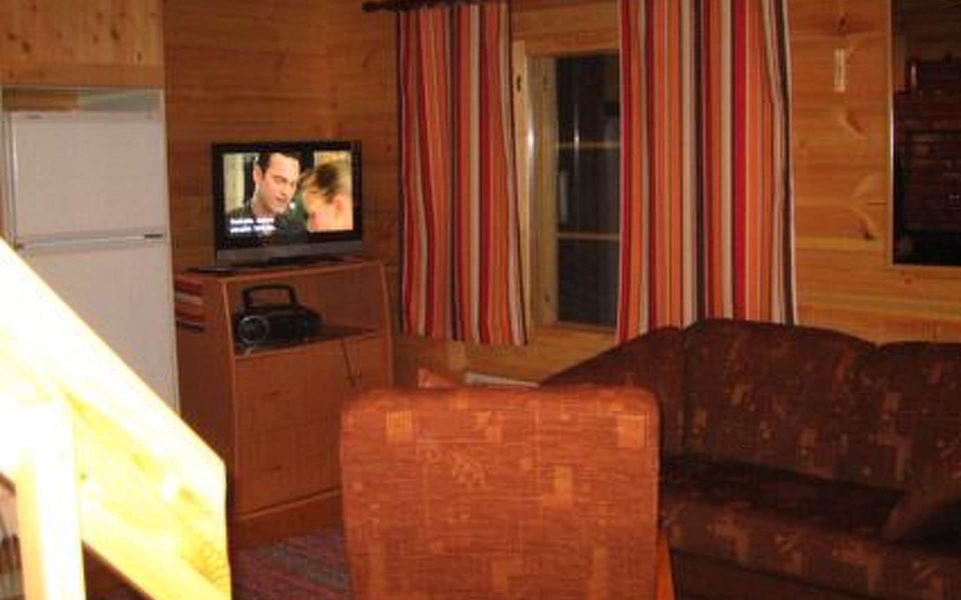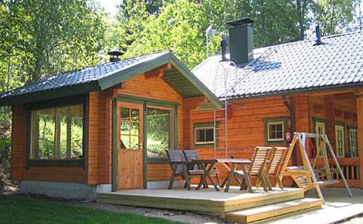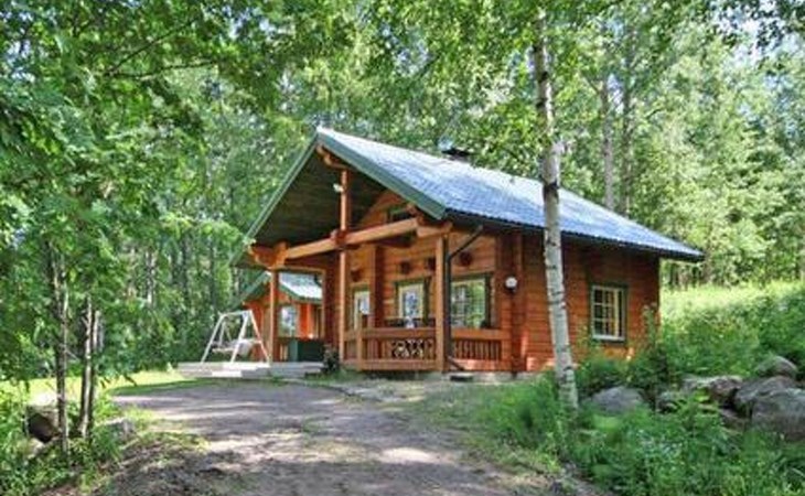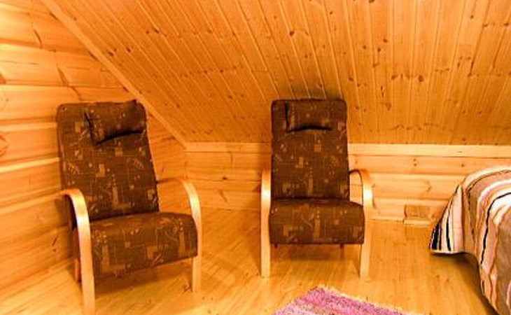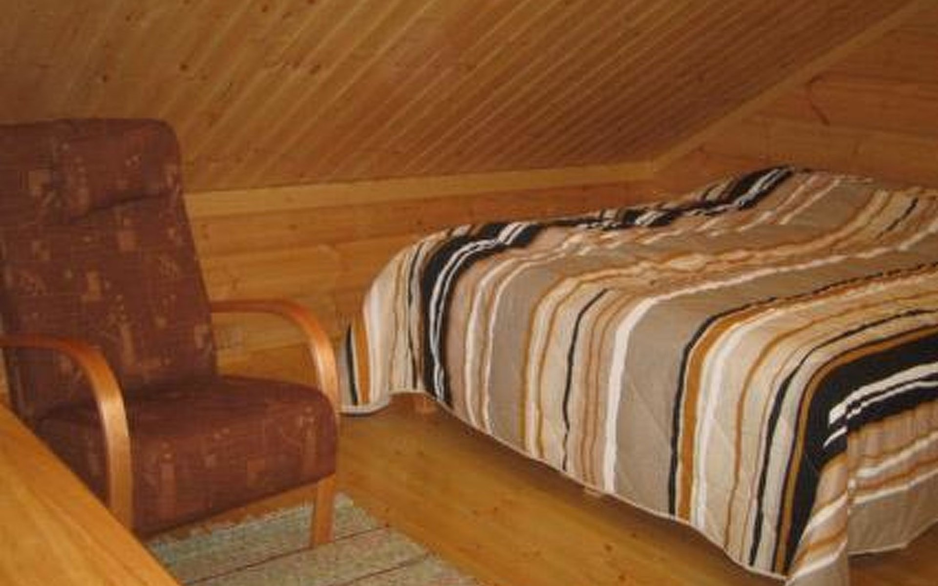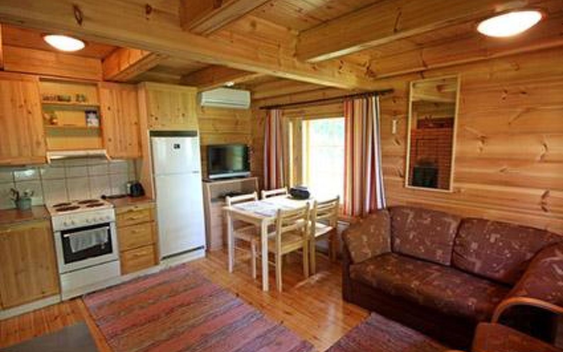 Log cottage 2008, living room/kitchen, bedroom upstairs 2 beds and convertible sofa, steep stairs to upper floor, washroom, shower, sauna (wood-burning stove), large open porch.