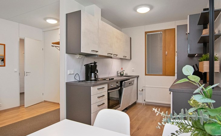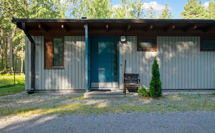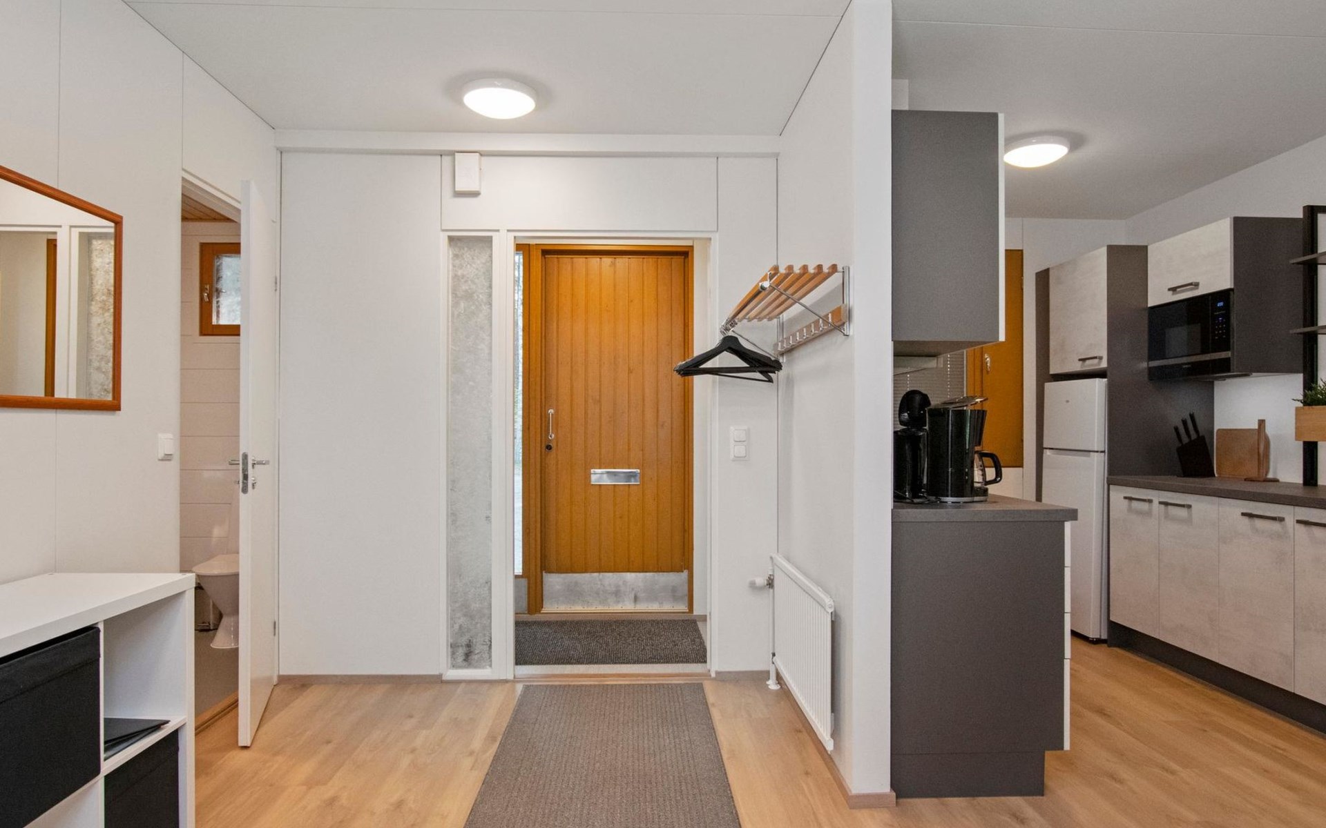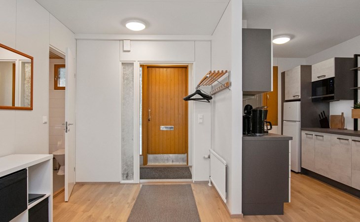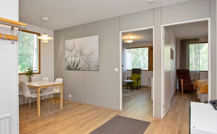 Apartment in wood-built row house, house is built in 1980 and renovated in 2022. Apartment has kitchen, living room, bedroom with 2 beds, washroom with shower, WC and terrace.