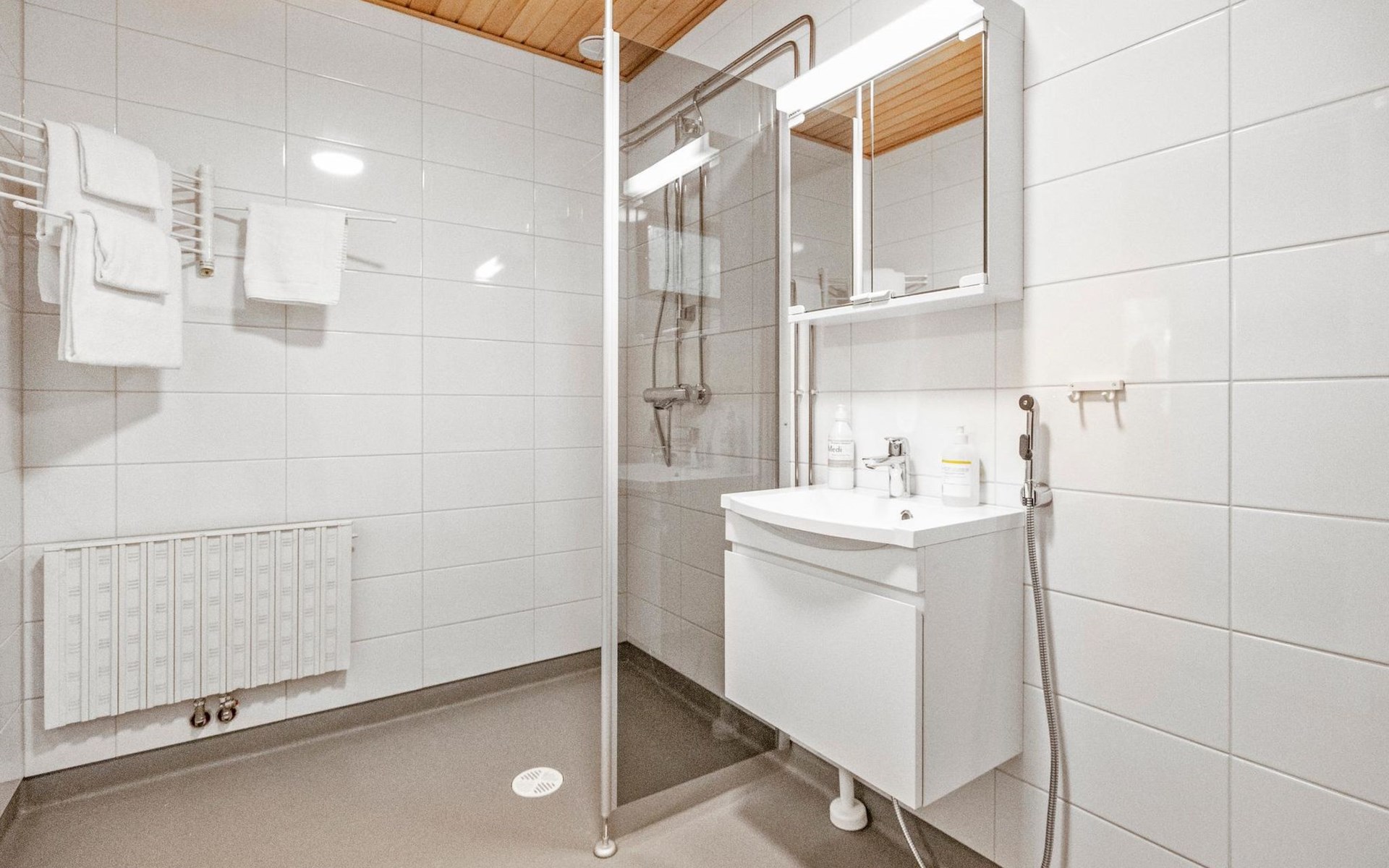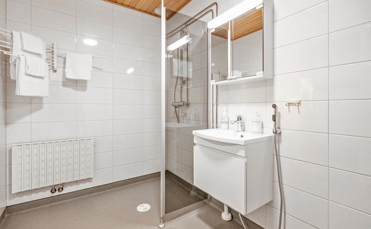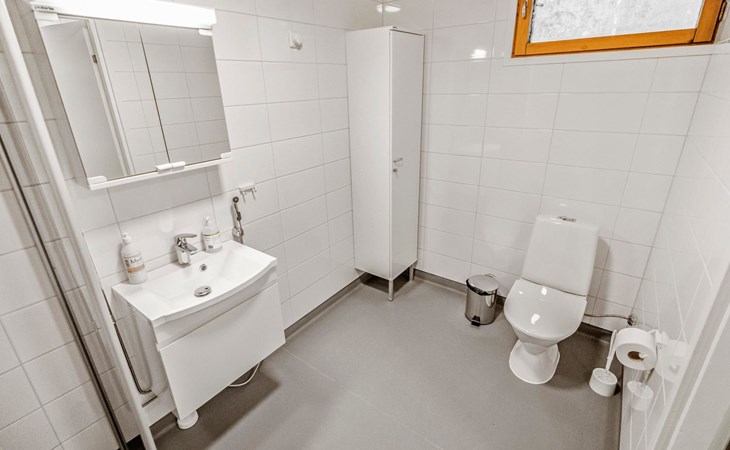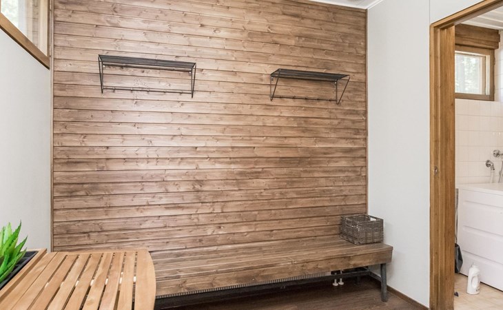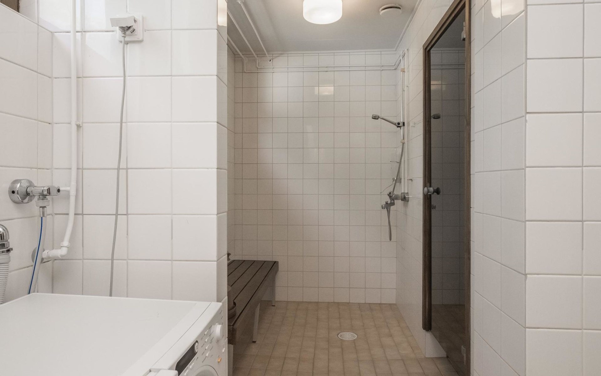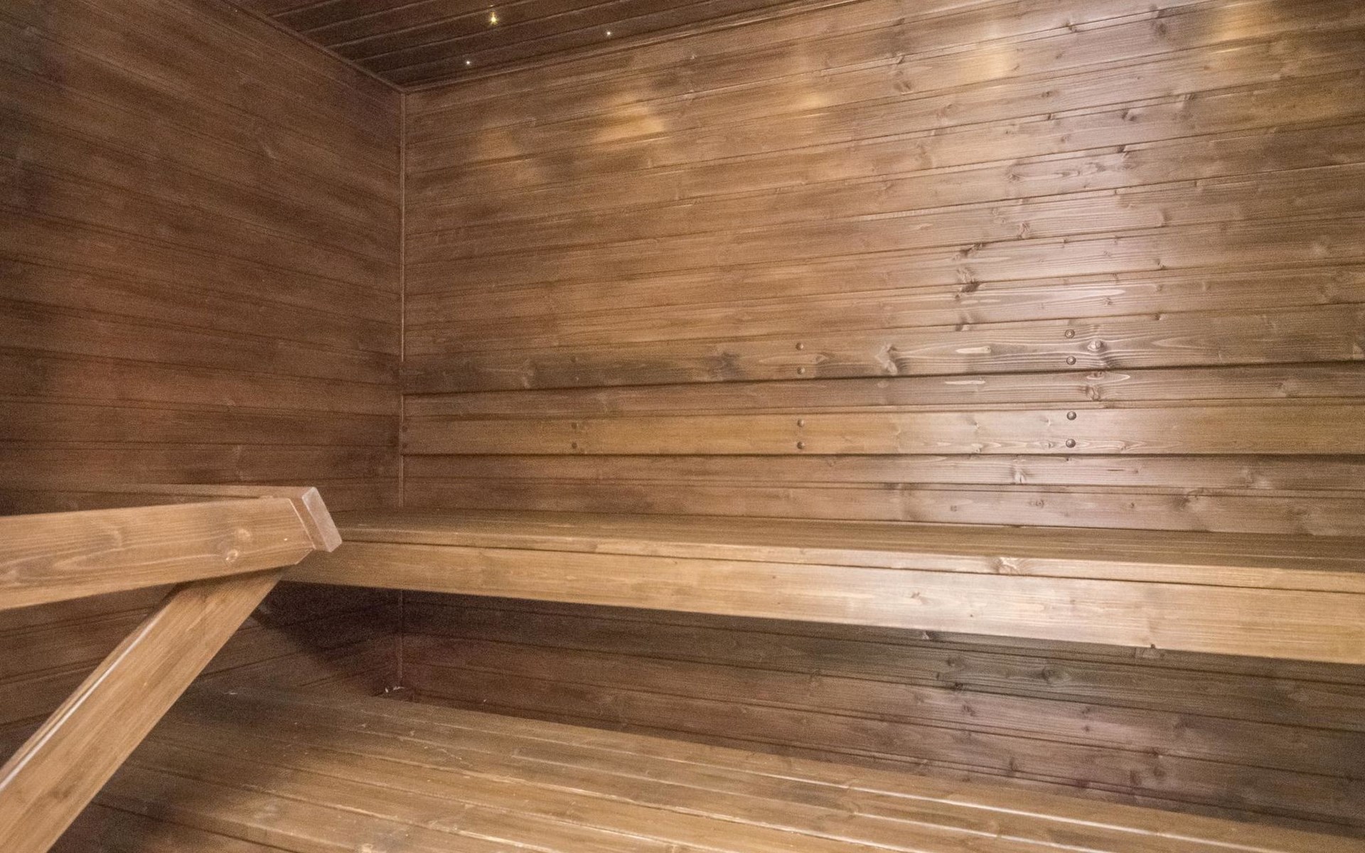 Sauna facilities shared by nine apartments. Sauna facilities includes dressing room, washroom, electric sauna stove, cooling terrace and washing machine. Sauna sessions (included in the price) can be booked at the reception.