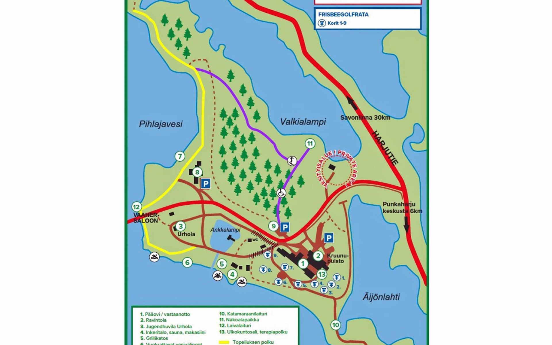Kruunupuisto spa hotel and its services 0.4 km, scenic road Vanha Harjutie 0.8 km, Metsämuseo Lusto (Finnish forest museum) 3.3 km, waterpark Kesämaa 5.4 km, Punkaharju town center 6.3 km, Savonlinna 30 km, Imatra 96 km, Helsinki 351 km.