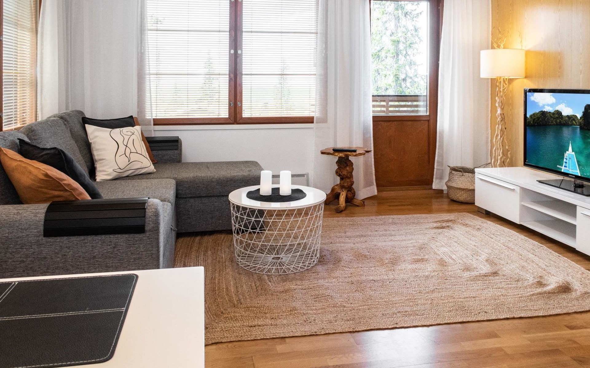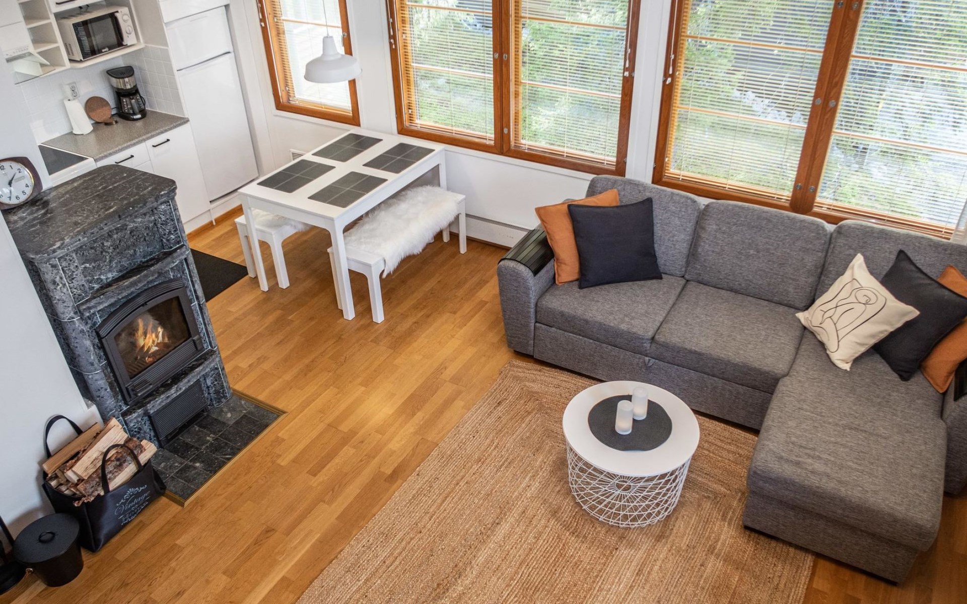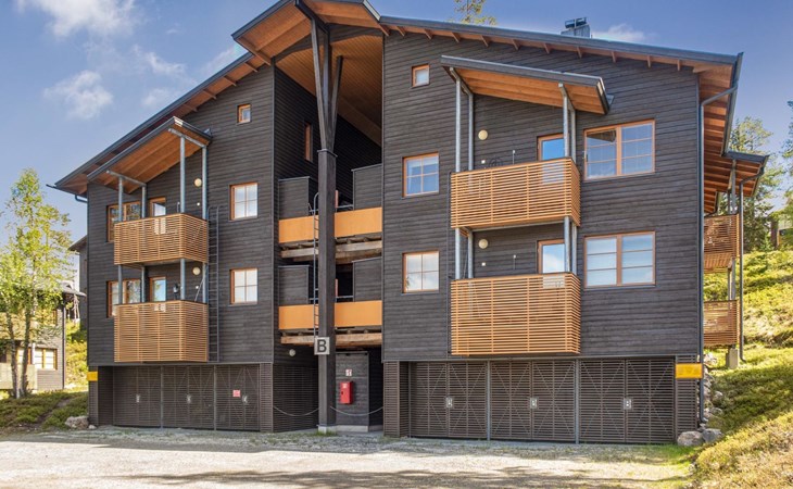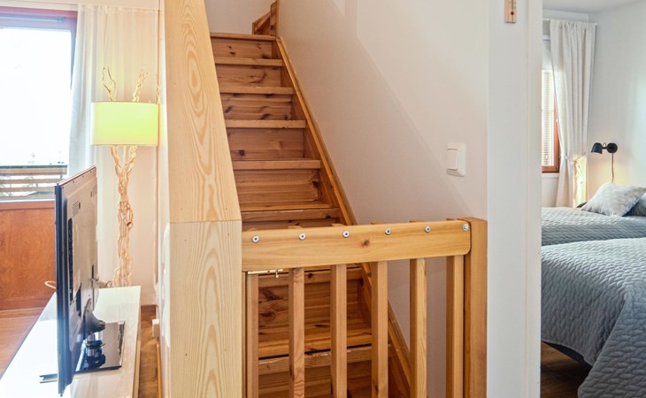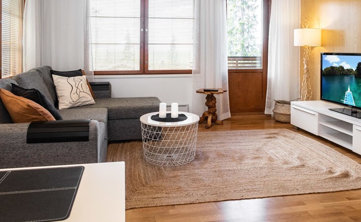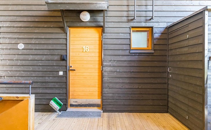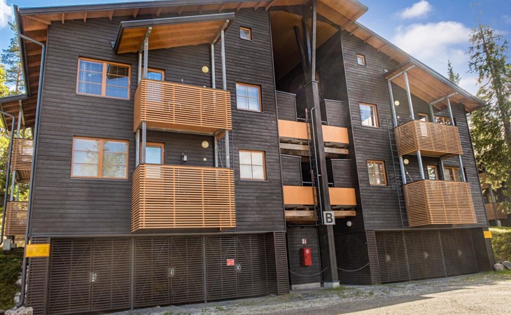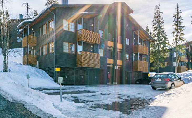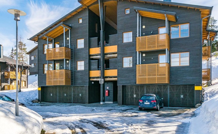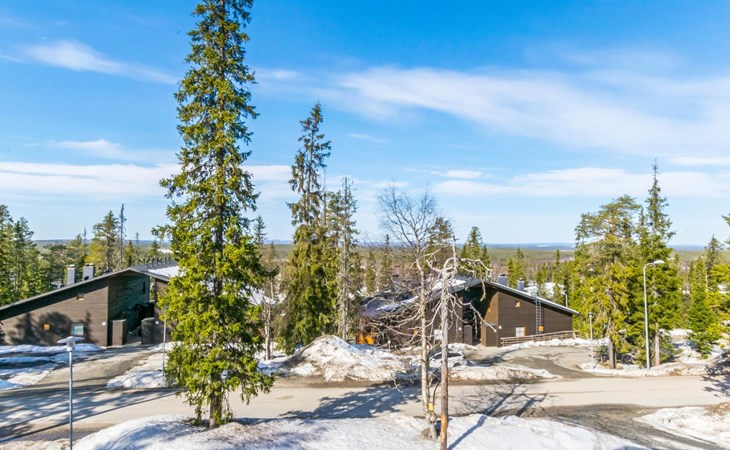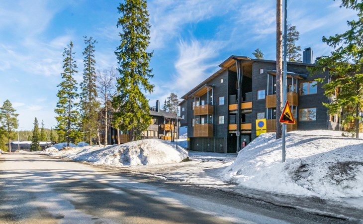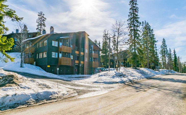 29 km north of Kuusamo, Ruka village 300 m. Holiday apartment built in 2004, bedroom downtairs with a double bed, bedroom upstairs with 2 beds, combined kitchen-livingroom with a convertible sofa bed, electric sauna. Total area of the apartment is 57 m² of which 47 m² downstairs and 10 m² upstairs.
