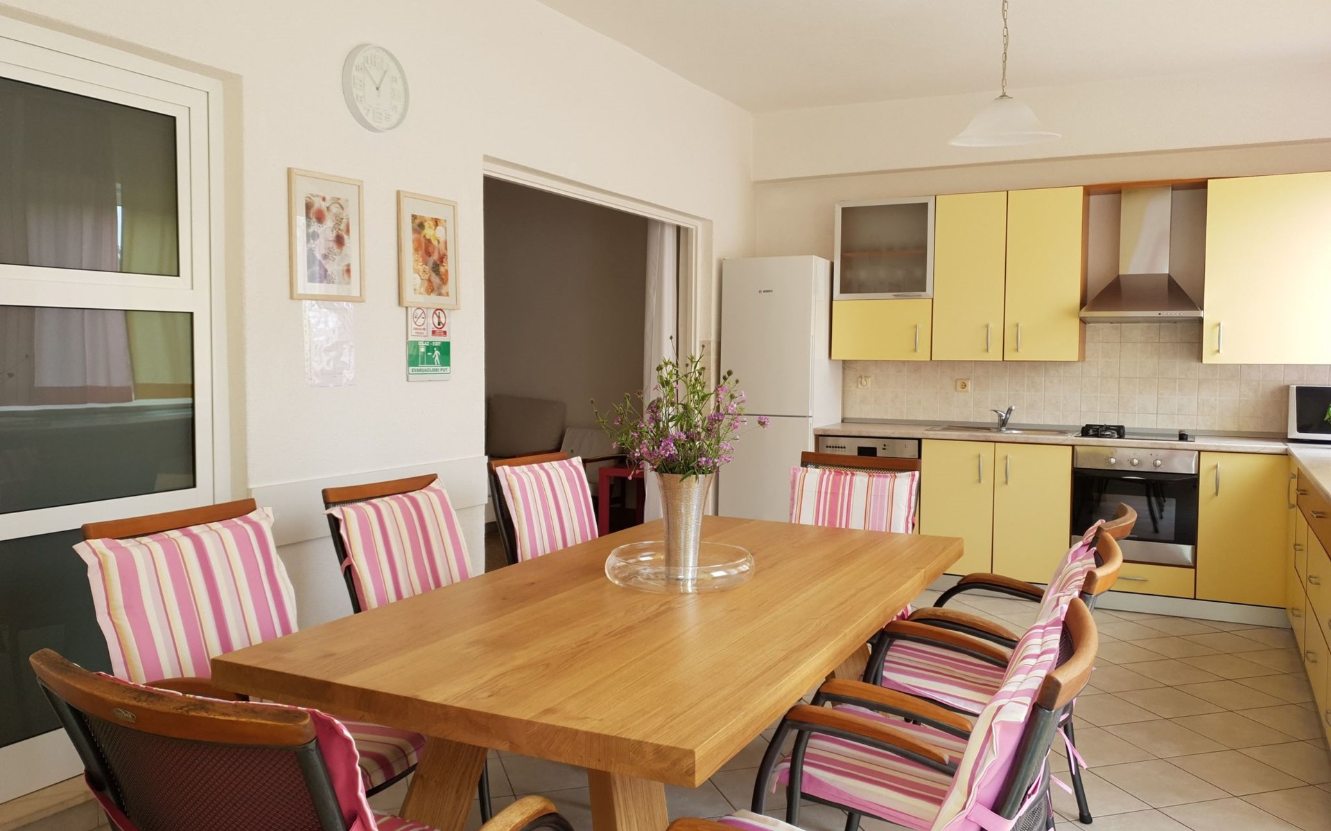 This simple and functionally furnished holiday house is just a few metres from a beautiful sandy beach. It is in quiet surroundings, two kilometres from Rogoznica. The house has two floors, each with one residential unit, connected by outdoor stairs. This makes it ideal for two families who would like to spend their holiday together.Big holiday house near the beach, with a Mediterranean garden, a grill area and two terraces, near the Krka and Kornati national parks, ideal for two families with children. Pets welcomeBoth floors offer a sea view and have their own terrace (each 30m²) with terrace furniture and an awning. The Mediterranean garden belonging to the house has figs, roses, cherries, strawberries, mandarins and olive trees and invites you to relax after an exciting day. It has a charcoal grill, where you can prepare delicious meat or fish dishes. Parking space for ten cars is available by the house.The detached holiday house provides a total living space of 130m² for eleven people. Both floors have their own entrance and each have air conditioning in the hallway. The 80m² ground floor has two bedrooms with double beds (160 x 200cm) and a modern bathroom with a shower, WC and hairdryer. An iron and a washing machine are also available. The living room has a double sofa bed (90 x 180cm). Free wireless Internet access and satellite TV are provided. The kitchen has a big dining space and is equipped with a stove (gas, ceramic and electric rings), an oven, fridge, microwave, dishwasher, coffee machine and kettle. The 55m² upper floor has a bedroom with a two single bed (90 x 200cm) and a bedroom with a double bed (160 x 200cm). The upstairs bathroom also has a shower, WC and hairdryer. The living room has a double sofa bed (140 x 190cm). Upstairs also provides free wireless Internet access, satellite TV and an iron. The kitchen is equally equipped with a stove (gas, ceramic and electric rings), an oven, fridge, microwave, dishwasher, coffee machine and kettle.The house is suitable for children, as well as for pets. There is a travel bed on both floors for small children. The lower floor is suitable for wheelchair users. It is only 40 metres to the beach. It is 200 metres to a shopping market. There are restaurants and bars, a bank and a post office two kilometres from the house. It is a 500-metre walk to a bus stop. Trips to the nearby towns of Sibenik (30km), Trogir (25km) and Split (50km) are to be recommended, with a range of culture and entertainment. There are also two national parks nearby, Krka (40km) and Kornati (70km).