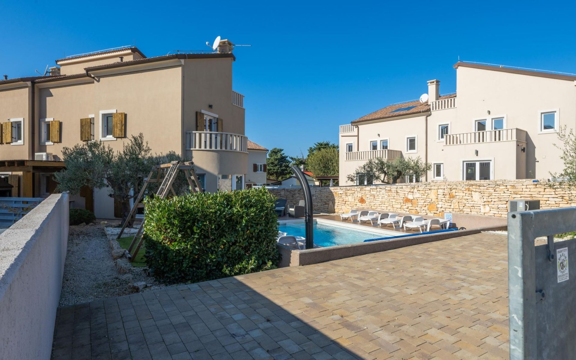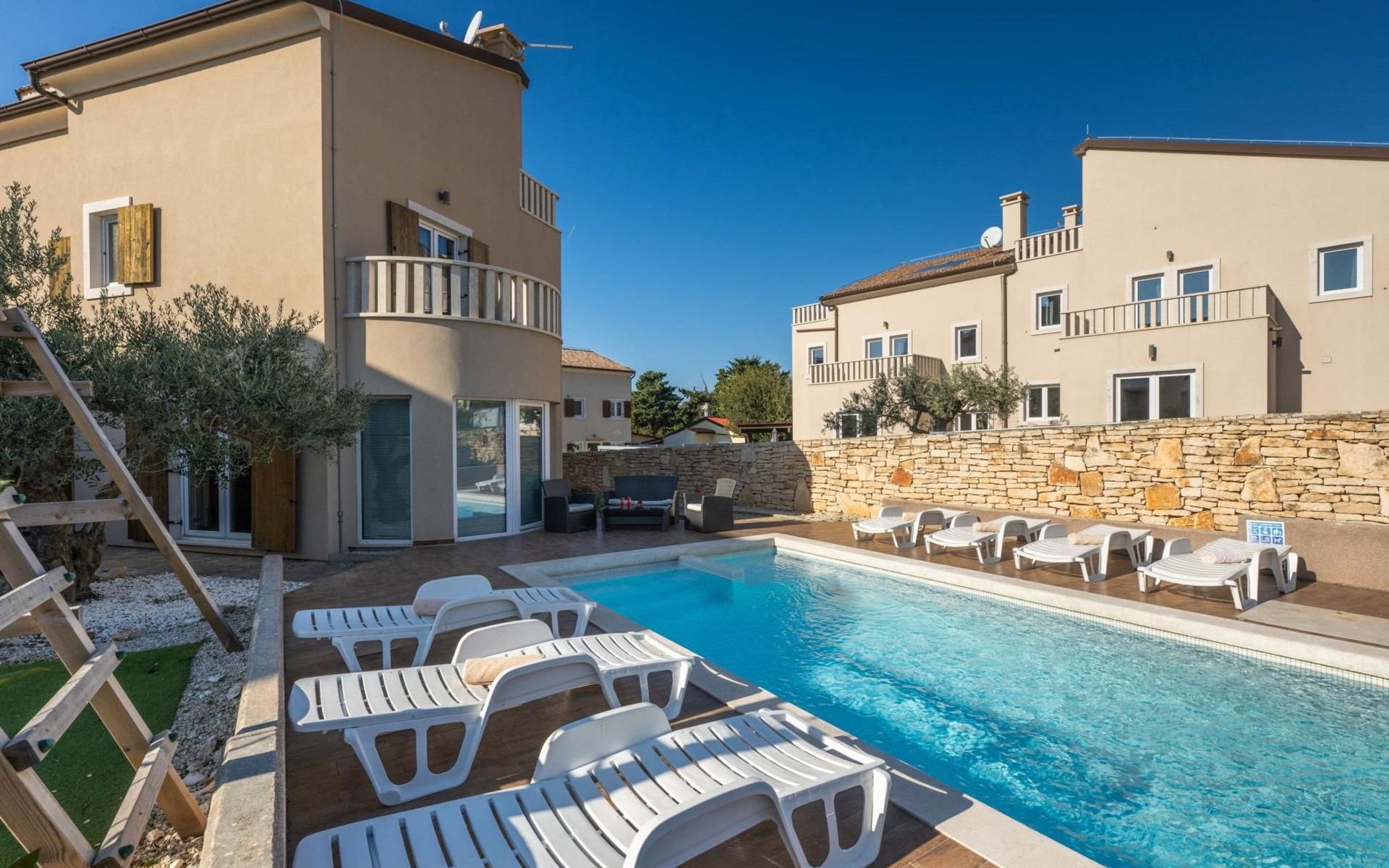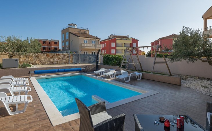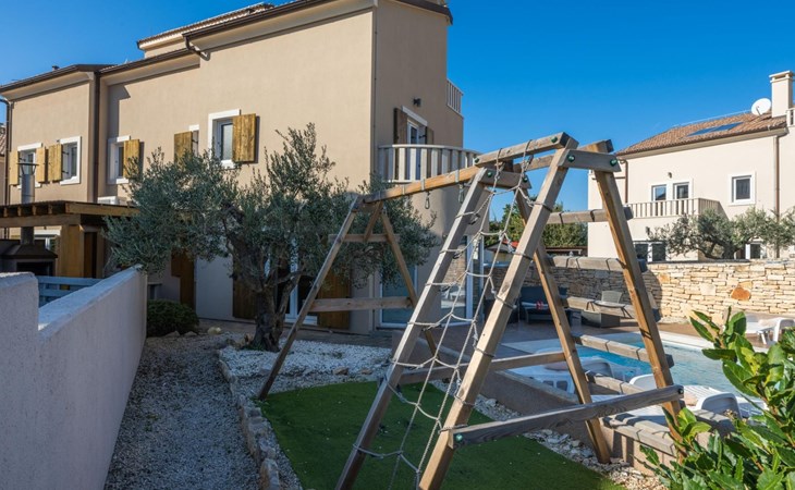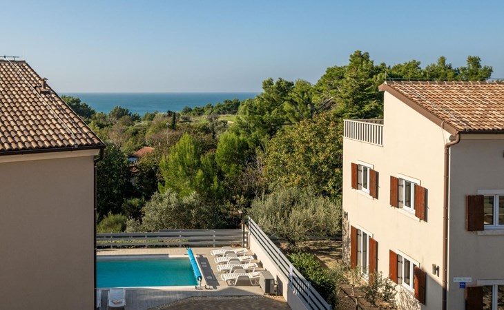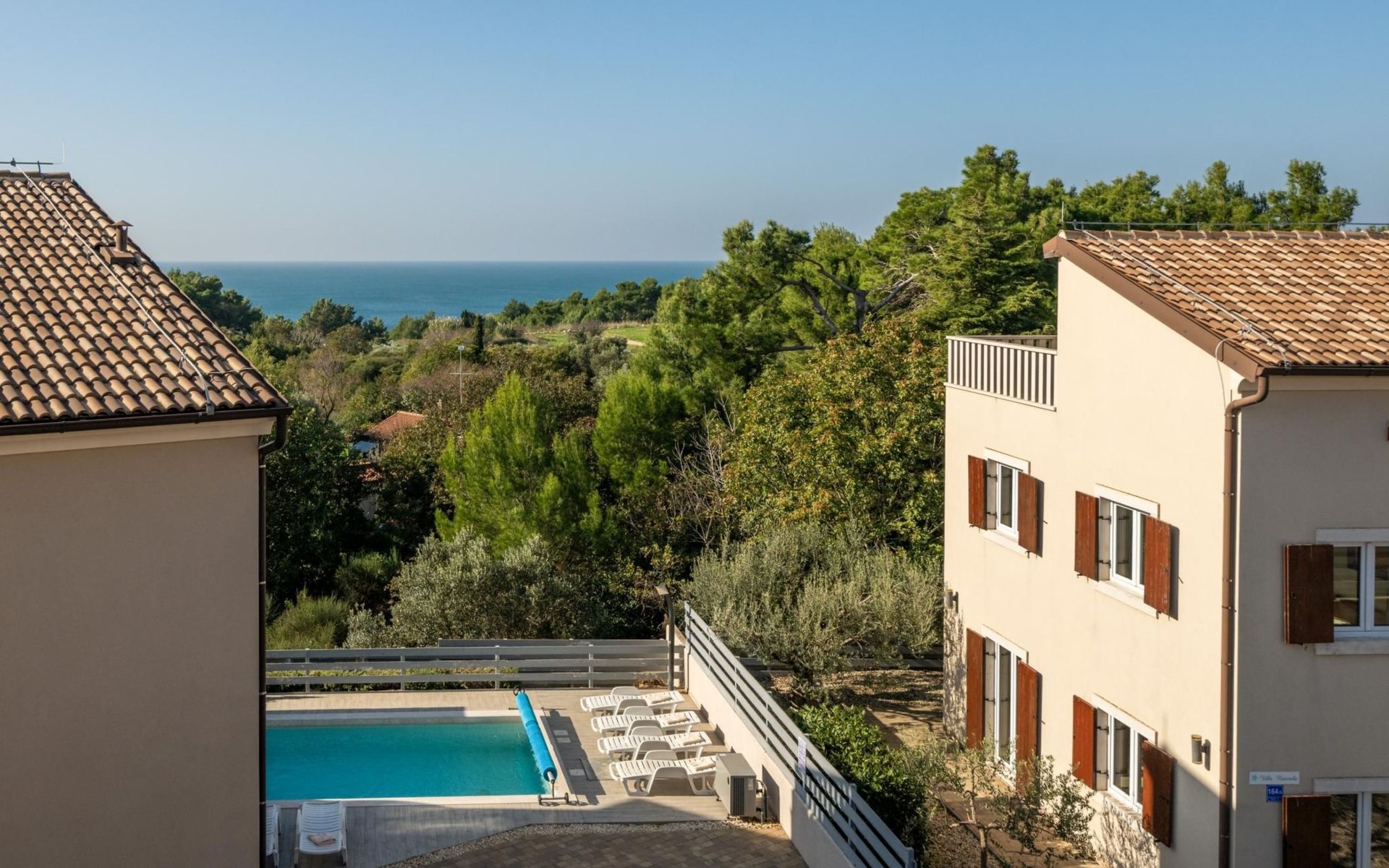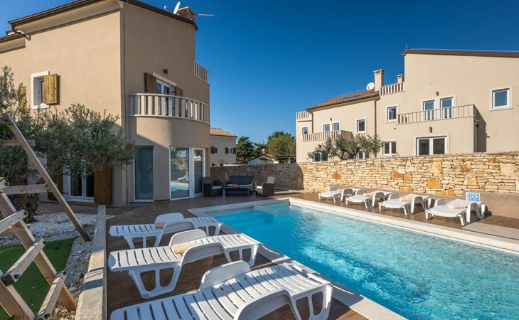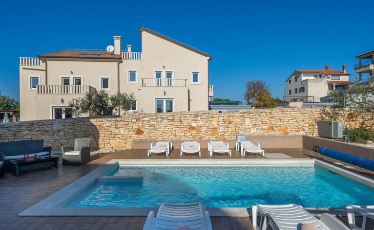 Maximaal 2 huisdieren/honden toegestaan. Villa Chiara is located in the charming village of Premantura, just 700 m from the sea. It can accommodate up to 12 guests and features 6 comfortable bedrooms.The villa is fully air-conditioned and includes modern amenities for a relaxing stay. You can unwind in the sauna, take a refreshing dip in the private pool, or enjoy meals outdoors in the covered dining area with a BBQ.The lively town of Pula is only 11 km away, with plenty of restaurants, shops, and cultural attractions.Villa Chiara can accommodate up to 12 guests and features 6 comfortable bedrooms. There are 4 bathrooms, 2 of which are en-suite, 2 separate toilets, and 1 shower next to the sauna.On the ground floor, you'll find a living room, a fully equipped kitchen, a sauna with a shower, and 2 separate toilets.The villa is split into two blocks, each with its own set of stairs leading to the upper floors. Both blocks have the same layout: the first floor features 1 bedroom with a balcony, 1 bedroom with a private bathroom, and 1 bathroom, while the second floor has 1 bedroom with a balcony.For guests traveling with pets, Villa Chiara is pet-friendly, allowing you to bring your furry friends along to enjoy the holiday. The property is fully fenced, providing both security and privacy.The villa is ideally situated, with the charming town of Medulin just 12 km away, the picturesque coastal village of Fažana 23 km, and the historic city of Rovinj 47 km. Pula Airport is also conveniently located only 18 km from the villa.