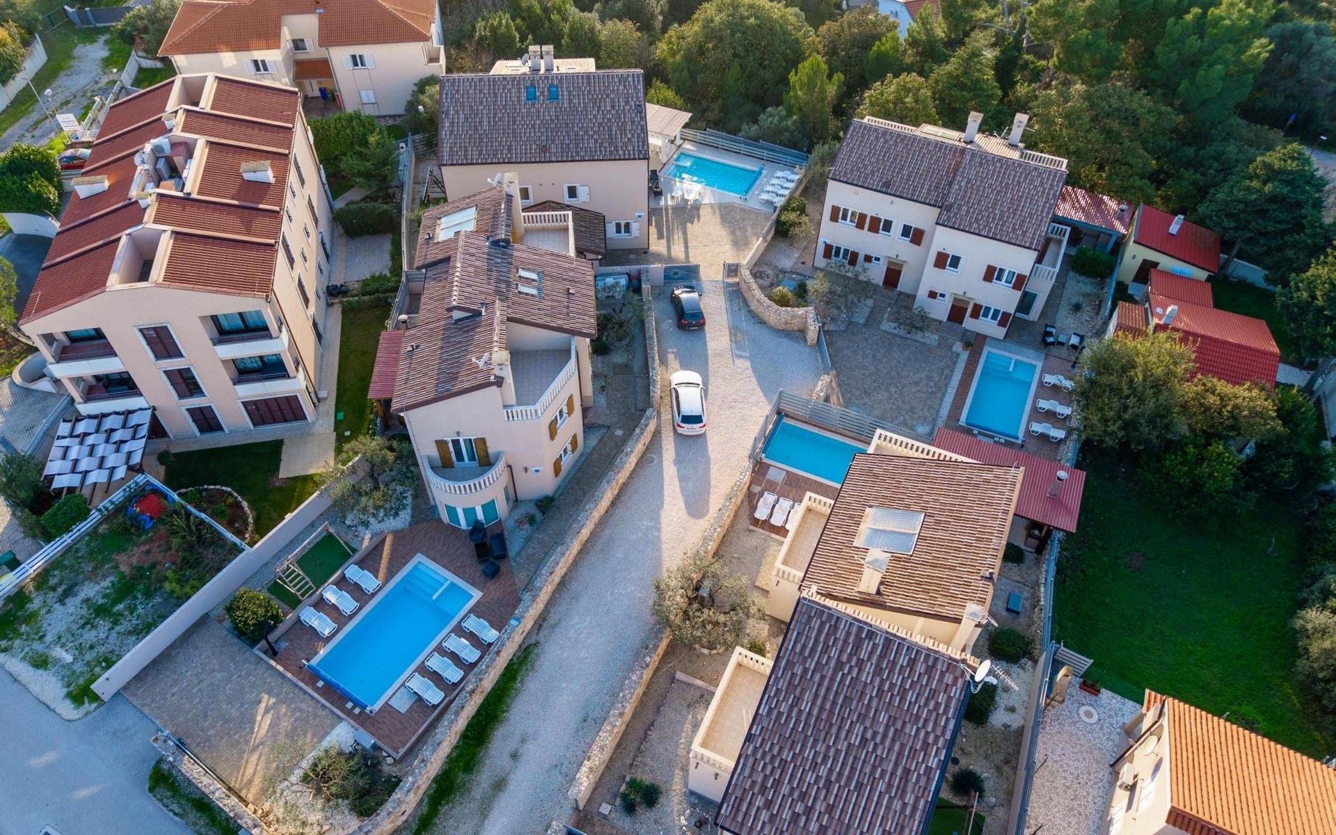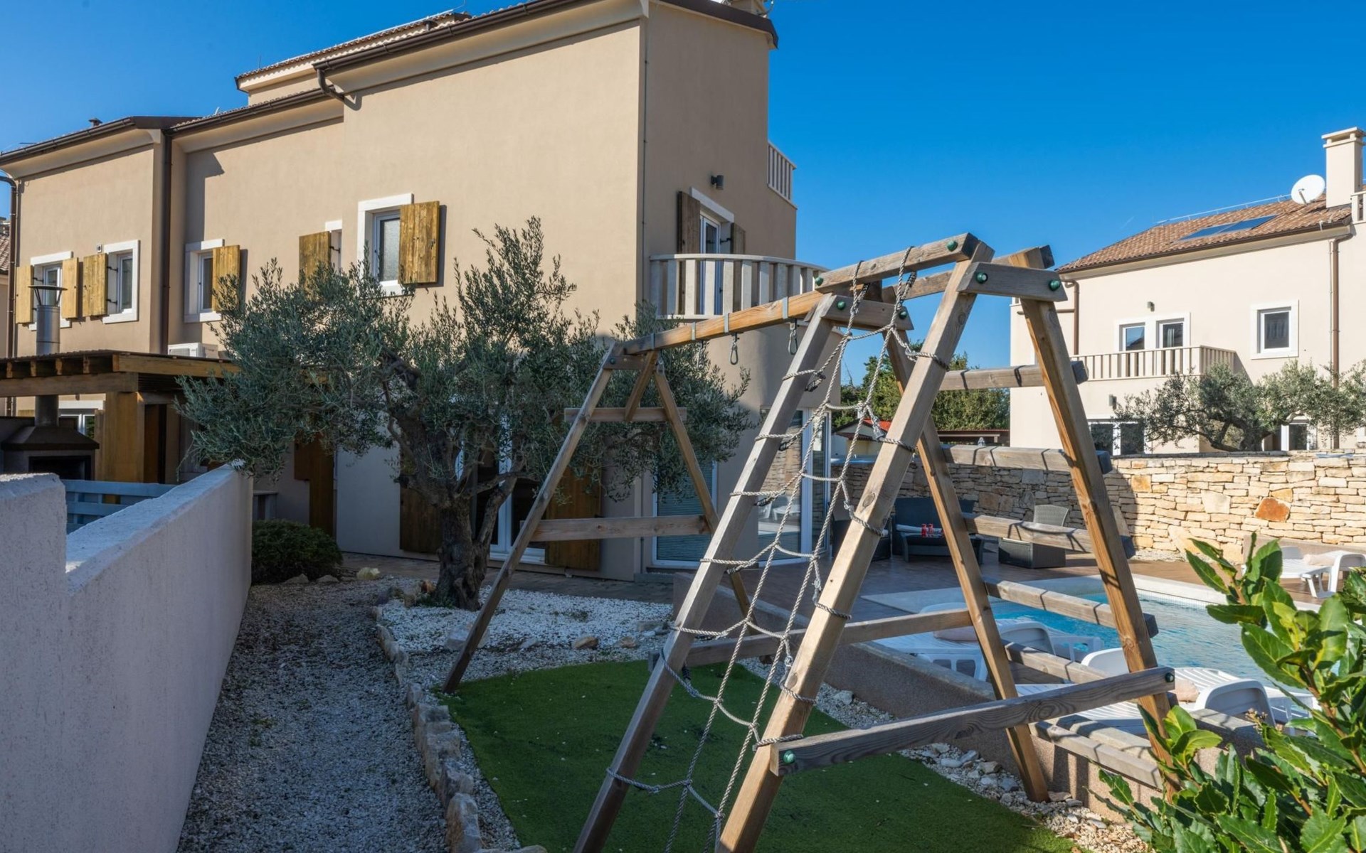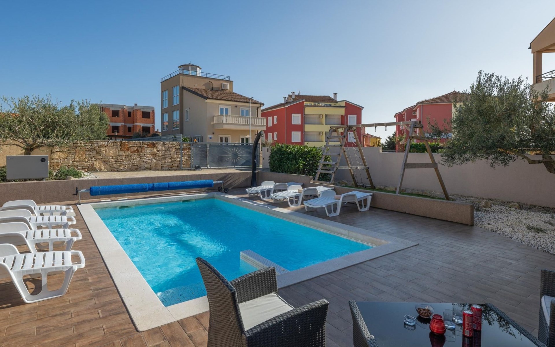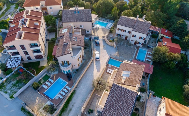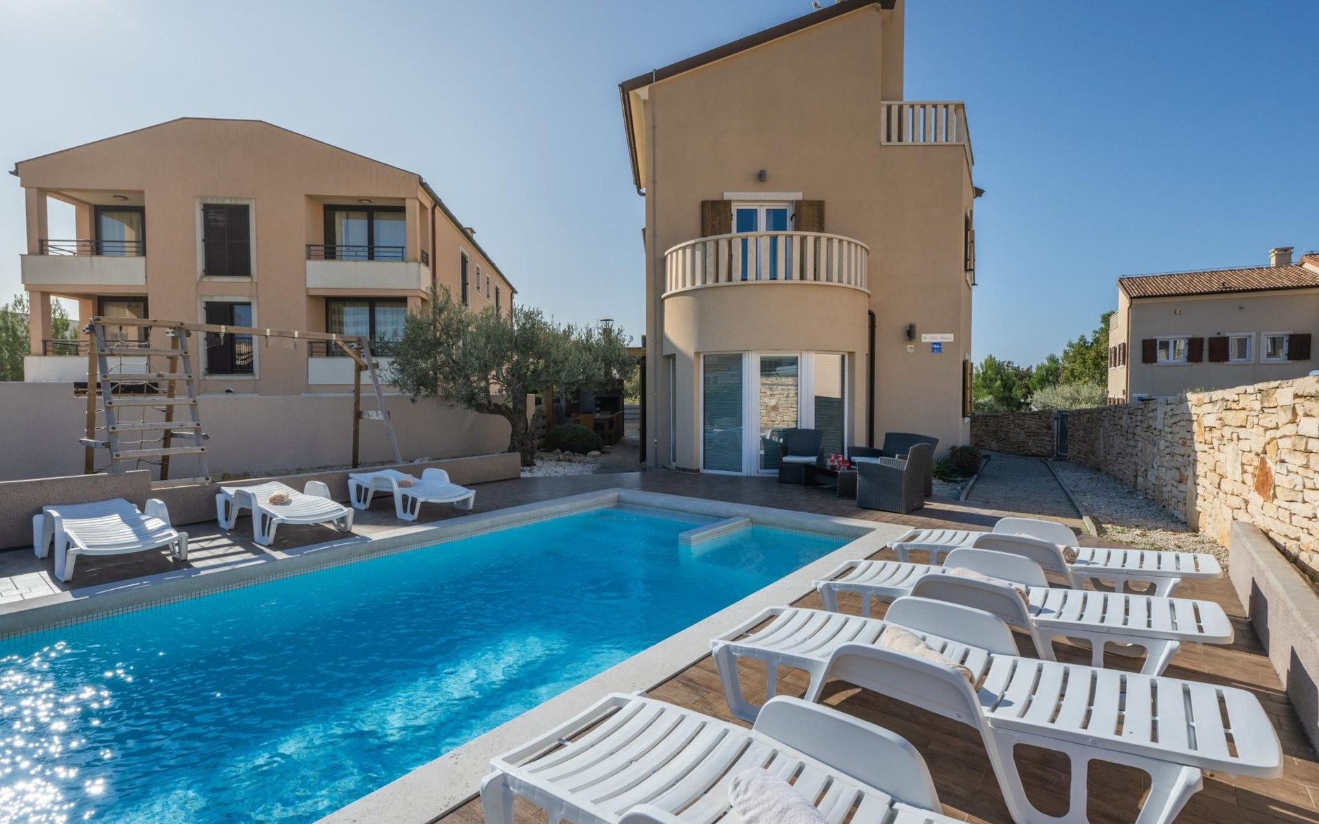 Maximaal 2 huisdieren/honden toegestaan. Villa Chiara is located in the charming village of Premantura, just 700 m from the sea. It can accommodate up to 12 guests and features 6 comfortable bedrooms.The villa is fully air-conditioned and includes modern amenities for a relaxing stay. You can unwind in the sauna, take a refreshing dip in the private pool, or enjoy meals outdoors in the covered dining area with a BBQ.The lively town of Pula is only 11 km away, with plenty of restaurants, shops, and cultural attractions.Villa Chiara can accommodate up to 12 guests and features 6 comfortable bedrooms. There are 4 bathrooms, 2 of which are en-suite, 2 separate toilets, and 1 shower next to the sauna.On the ground floor, you'll find a living room, a fully equipped kitchen, a sauna with a shower, and 2 separate toilets.The villa is split into two blocks, each with its own set of stairs leading to the upper floors. Both blocks have the same layout: the first floor features 1 bedroom with a balcony, 1 bedroom with a private bathroom, and 1 bathroom, while the second floor has 1 bedroom with a balcony.For guests traveling with pets, Villa Chiara is pet-friendly, allowing you to bring your furry friends along to enjoy the holiday. The property is fully fenced, providing both security and privacy.The villa is ideally situated, with the charming town of Medulin just 12 km away, the picturesque coastal village of Fažana 23 km, and the historic city of Rovinj 47 km. Pula Airport is also conveniently located only 18 km from the villa.