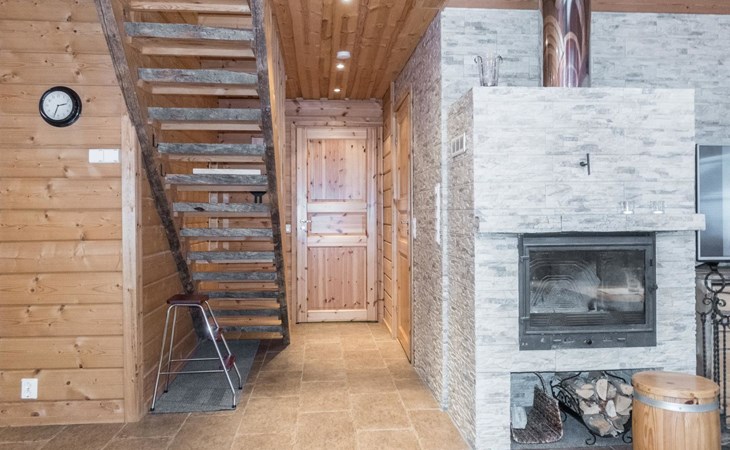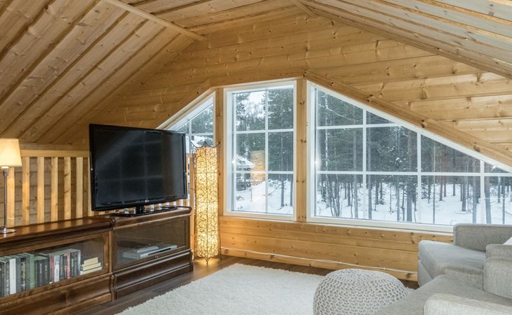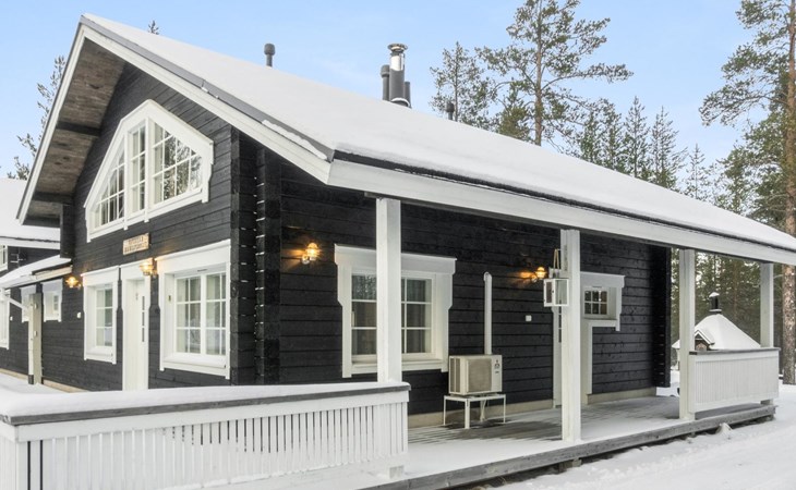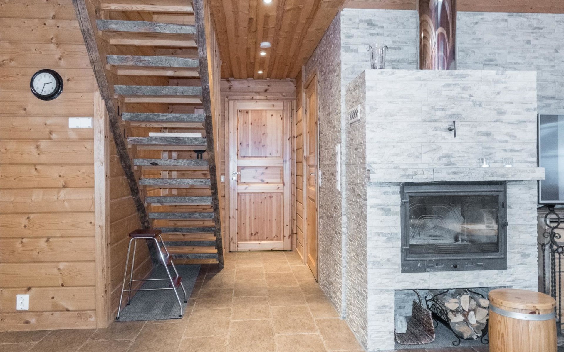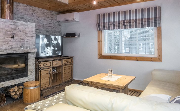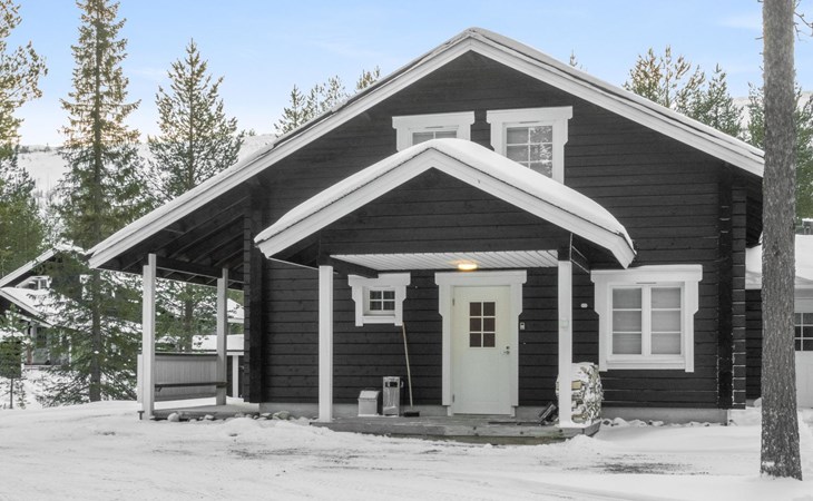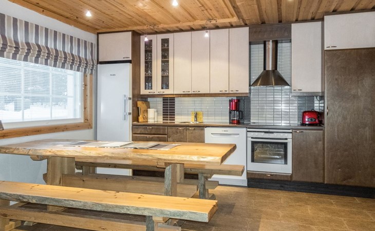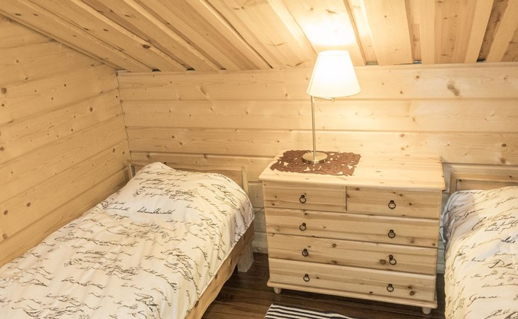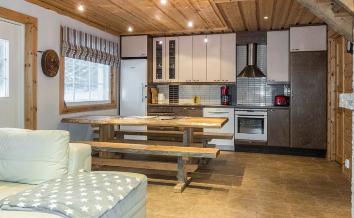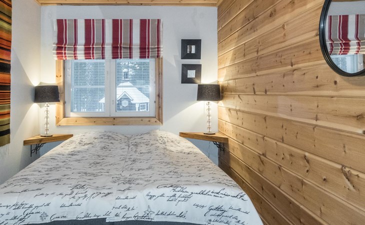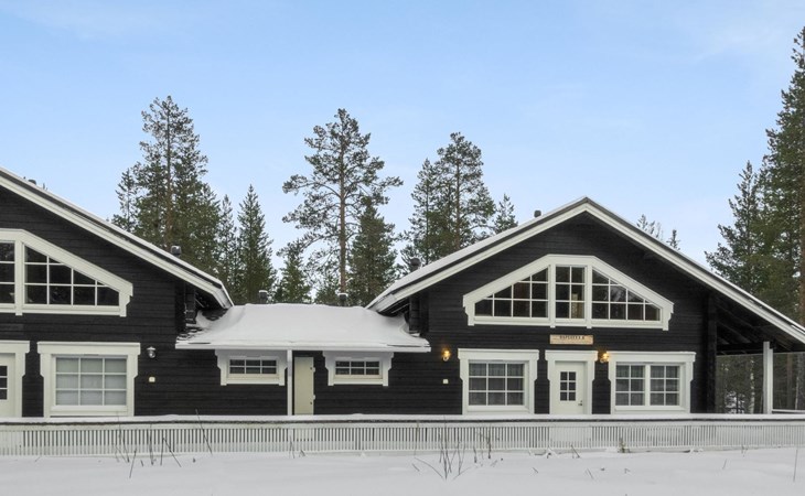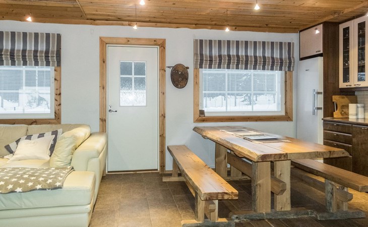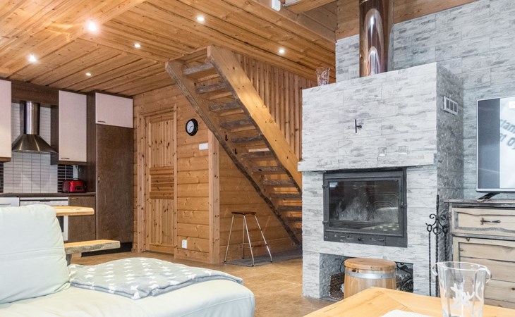 On the ground floor, living room / kitchen, bedroom with two beds, sauna with instant ready electric sauna stove, washroom/WC and large terrace on the fell side. There is no fence between the apartments on the terrace (uniform space).