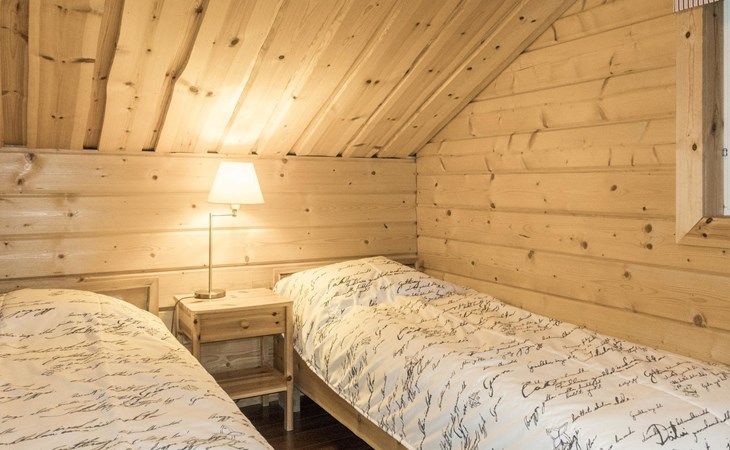 On the upper floor, two bedrooms, both with two single beds, lounge, sleeping alcove with 1 bed, WC also upstairs. Child safety gate on the upper floor.