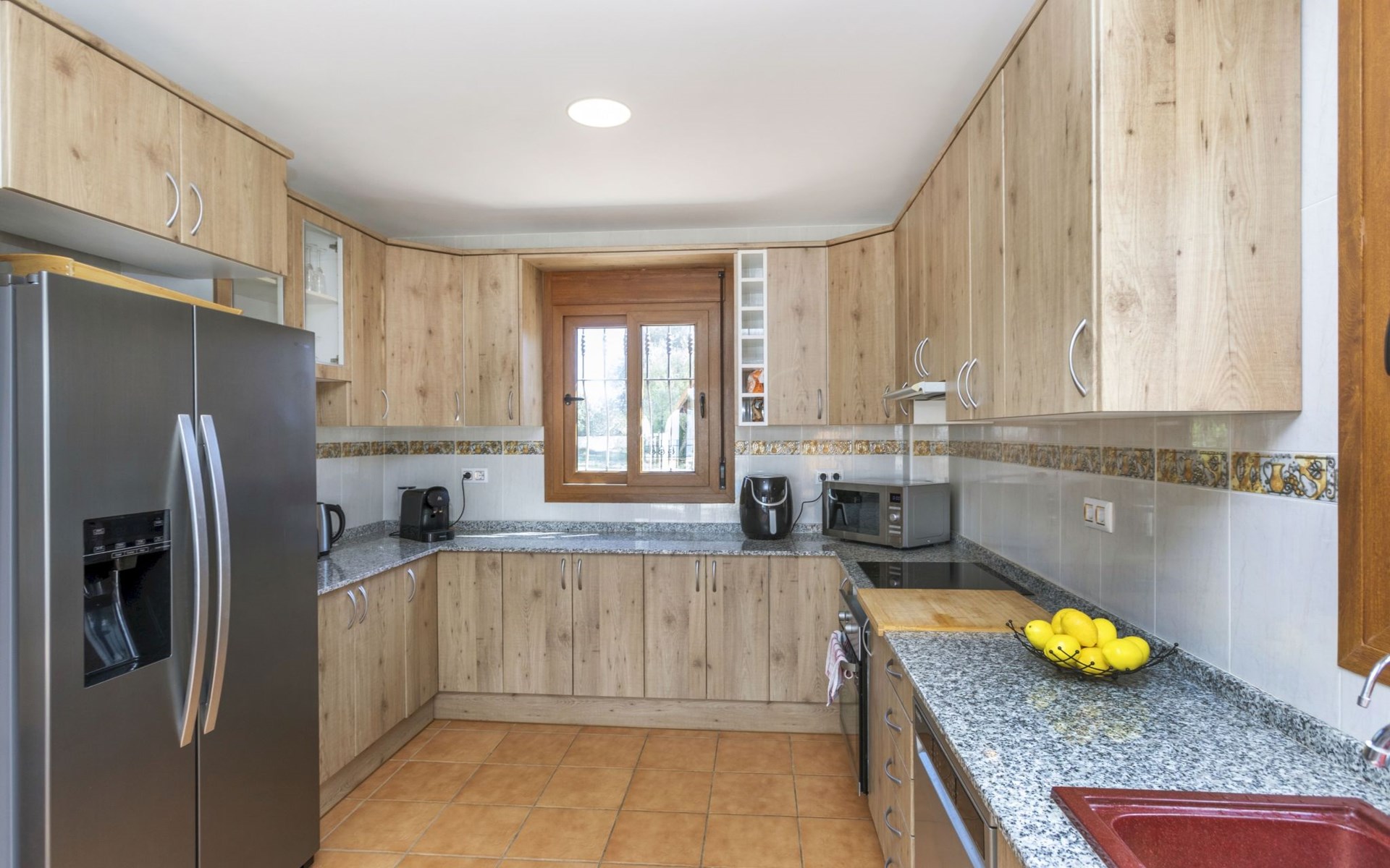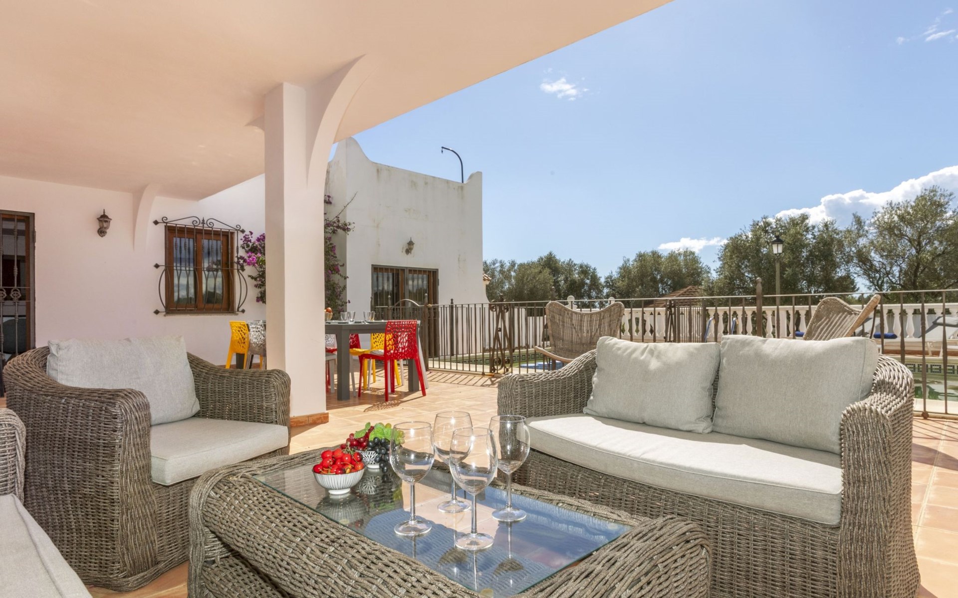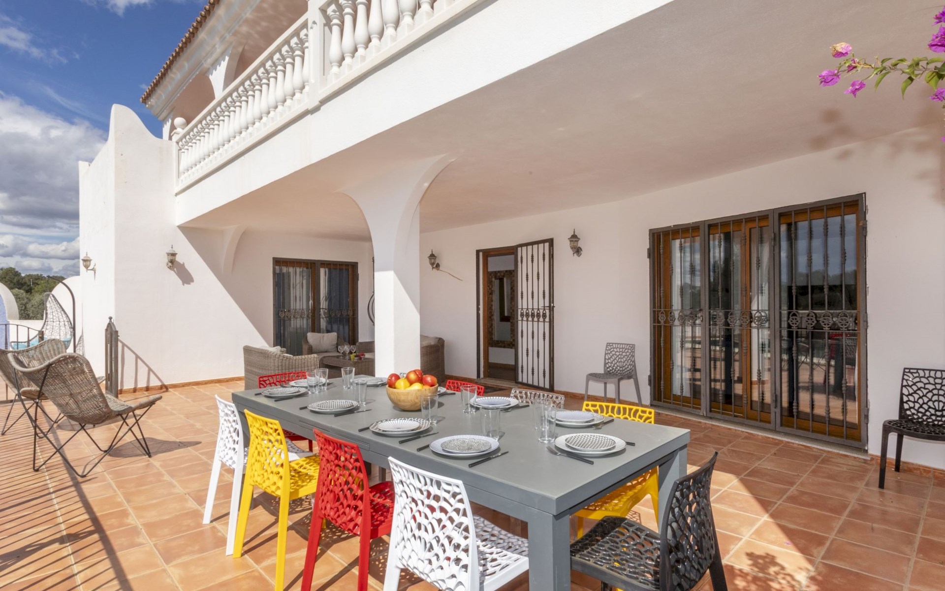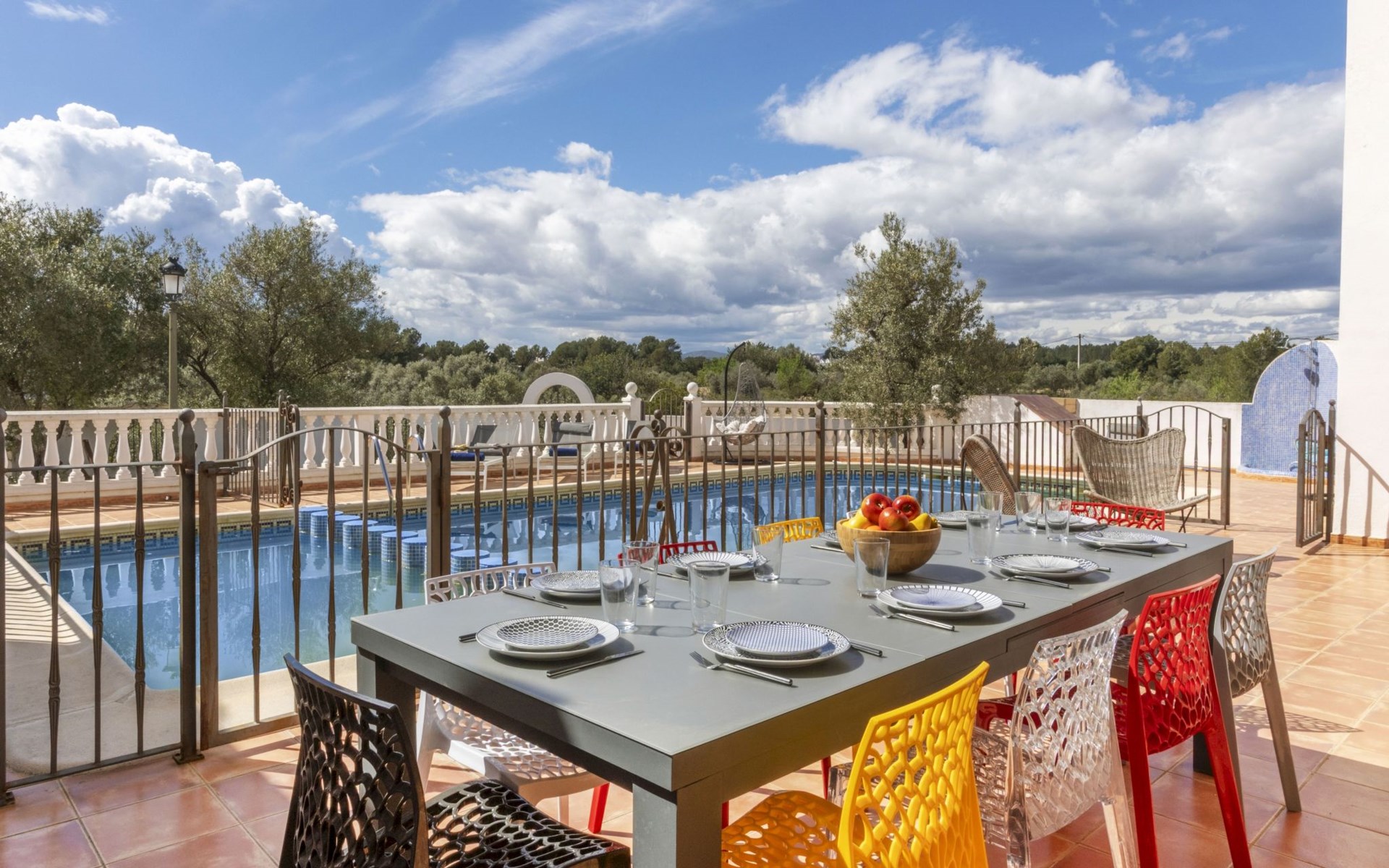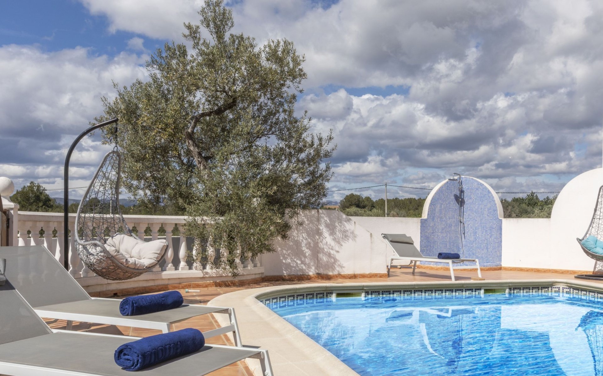 Sant Jordi: Groot villa "Hacienda Azahar", van 2 verdiepingen. Geïsoleerde, rustige, zonnige ligging, 10 km van zee, 10 km van het strand. Voor alleengebruik: wild terrein (omheind), openluchtzwembad hoekig (58 m2, seizoensgebonden beschikbaarheid: 01.Mei. - 30.Sep.). Kinderzwembad, buitendouche, prieel, barbecue. In het huis: air-conditioning. Parkeerplaats. Bushalte "Vinaròs - Calle 29 Septiembre" 13 km, treinstation "Vinaròs" 14 km, zandstrand "Playa Vinaròs" 15 km. Golfterrein (18 holes) 6 km. Attracties in de buurt: Peñiscola 30 km, Ciutat de les Arts i les Ciències 160 km, Sant Mateu 24 km, Delta del Ebro 42 km, Port Aventura 105 km, Morella 53 km. Wandelgebied Parque Natural Sierra de Irta 35 km, Foradada del Montsià 30 km. Auto noodzakelijk, geen lift. Groepen jongeren uitsluitend op aanvraag. Autobaan in de buurt 15 km van het huis.