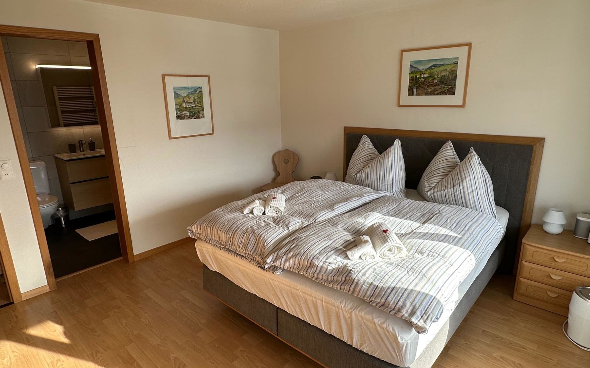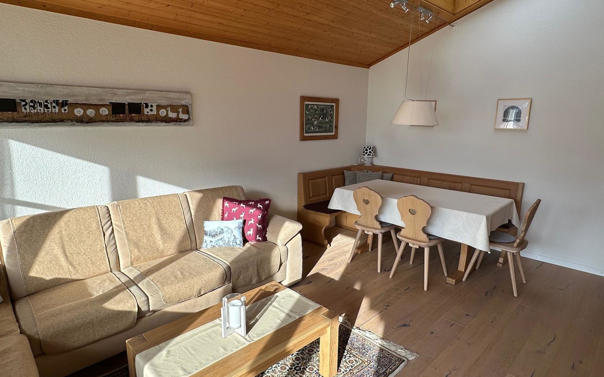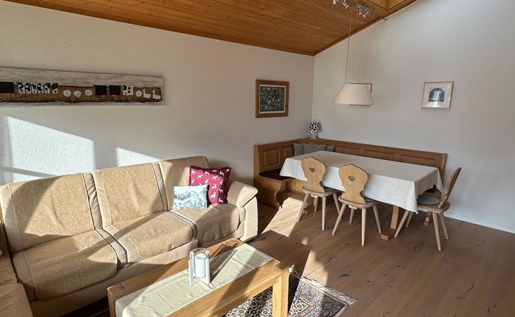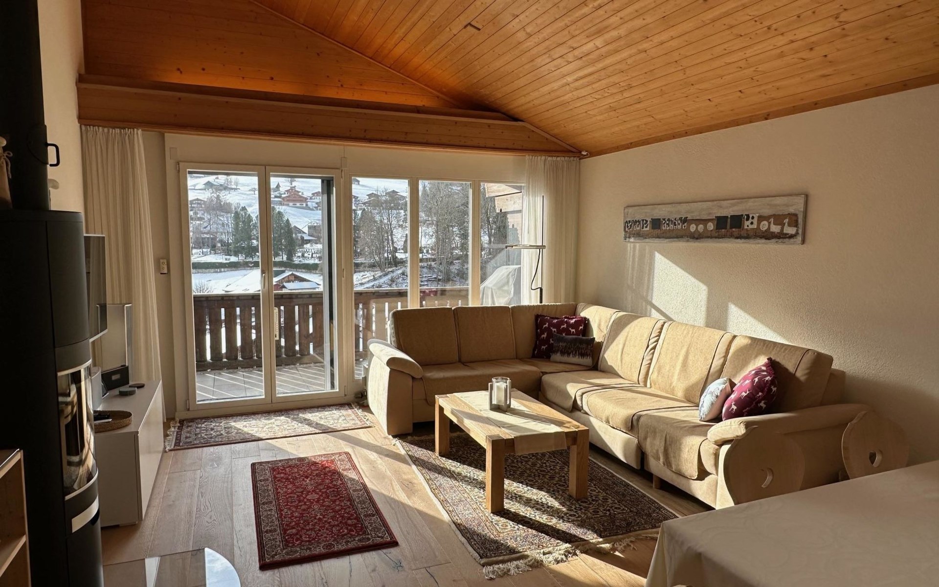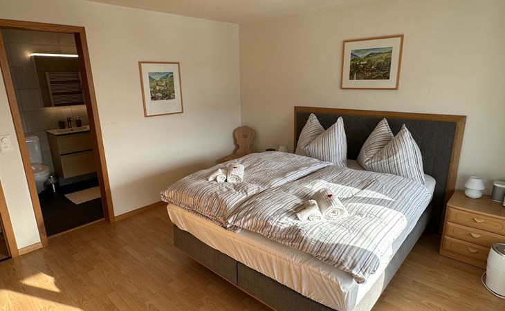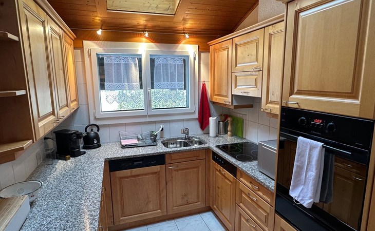 4.5 room apartment on the 1st floor with separte kitchen, 3 bathrooms (2 of which renovated in 2024), dining table for max. 10 people, large balcony. Net living space: 110 sqm living space and 18 sqm balcony. Standard: High-quality fit-out standard following various renovations stages. Furnishings and inventory: Apartment with hight-quality furnishings and complete house inventory, also of high quality. TV/Multimedia: Swisscom connection. SONOS internet radio in every room (can only be controlled via app). Flatscreen TV (swivels towards the dining table). Alll windows and balcony doors with insect screens. 3 skylights. Electric sun blinds. 2 WC's with walk-in showers incl. rain shower. Wardrobes in all bedrooms. Balcony with table and 4 chairs. 2 automatic large sun blinds on the balcony. 3 bedrooms: double bed (160x200cm), double bed (160x200cm) and double bed (2x90x200). Smoking is allowed on the balcony. ***The wood-burning stove in the living room as well as the BBQ barbecue on the balcony is reserved exclusively for the host and is not available for guests to use***