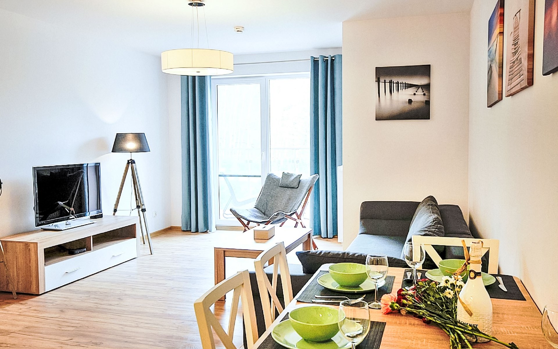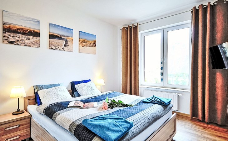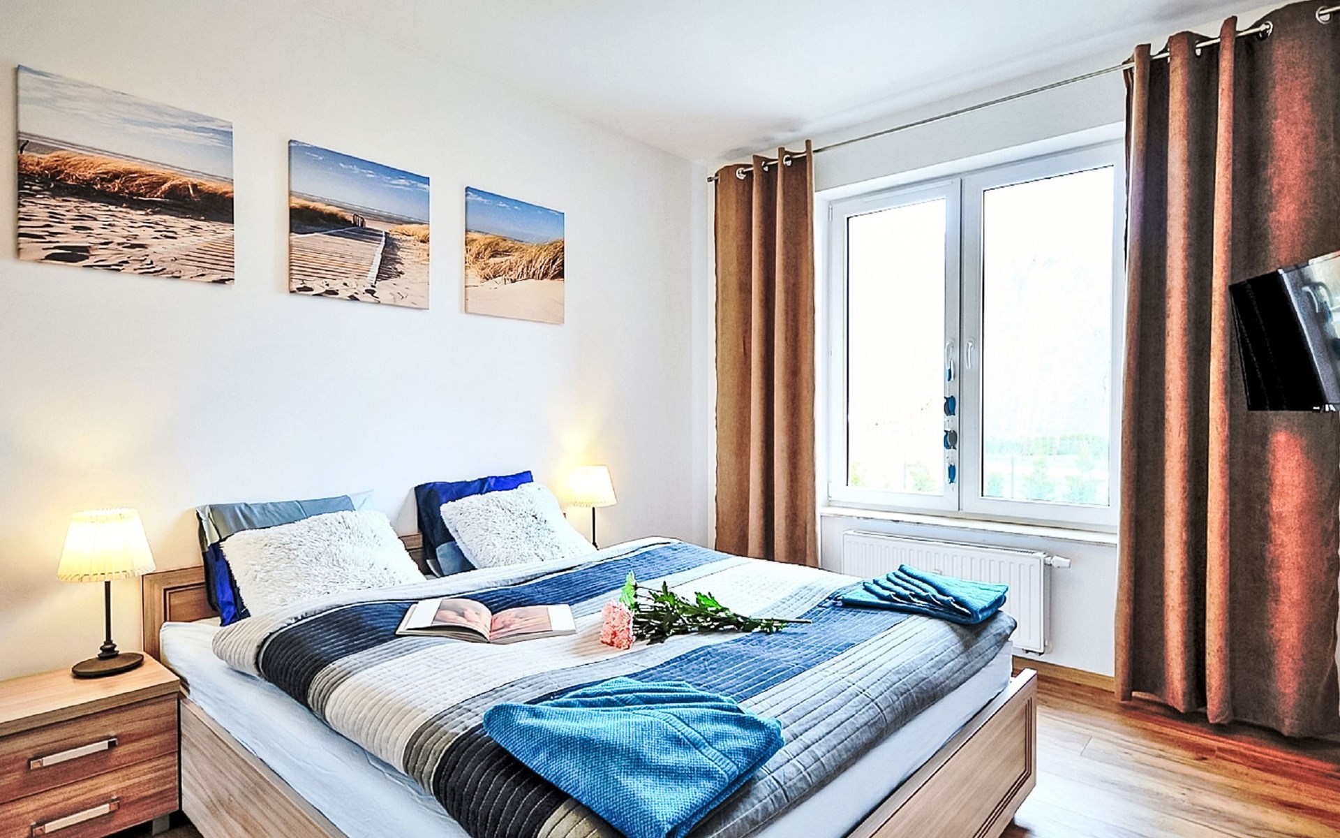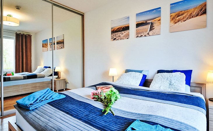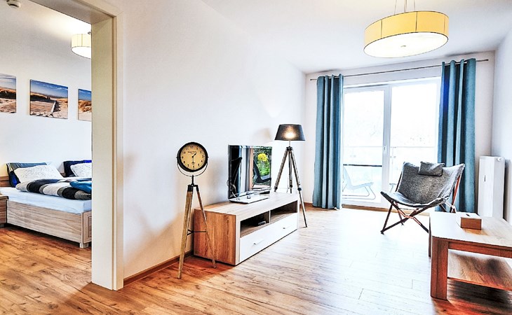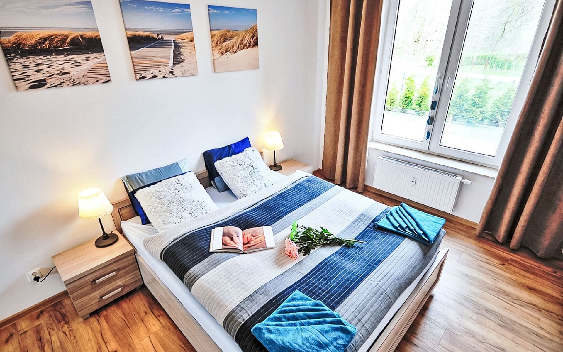 Moderne, comfortabel flatgebouw "Szum Morza", bouwjaar 2017. Aan de rand van de plaats, rustige, zonnige ligging, 350 m van zee, te midden van groen. Voor medegebruik: overdekt zwembad verwarmd (6 x 17 m, openingstijden zwembad: 09:00-21:00). Douche/WC bij het zwembad, kinderzwembad, hot tub, kinderspeelplaats. In het huis: sauna, fitnessruimte, speelkamer, lift, centrale verwarming, alarmsysteem. Parkeerplaats bij het huis op het terrein, openbare parkeerplaatsen in de straat. Winkel 1.3 km, levensmiddelenwinkel 850 m, supermarkt, restaurant 300 m, bushalte 1.1 km, station 2.5 km, zandstrand 350 m. Jachthaven 3 km. Attracties in de buurt: Oceanarium 3 km, Molo 3 km, Park Dziki Zachód Zieleniewo 7 km. Bewaakt vakantiecomplex.