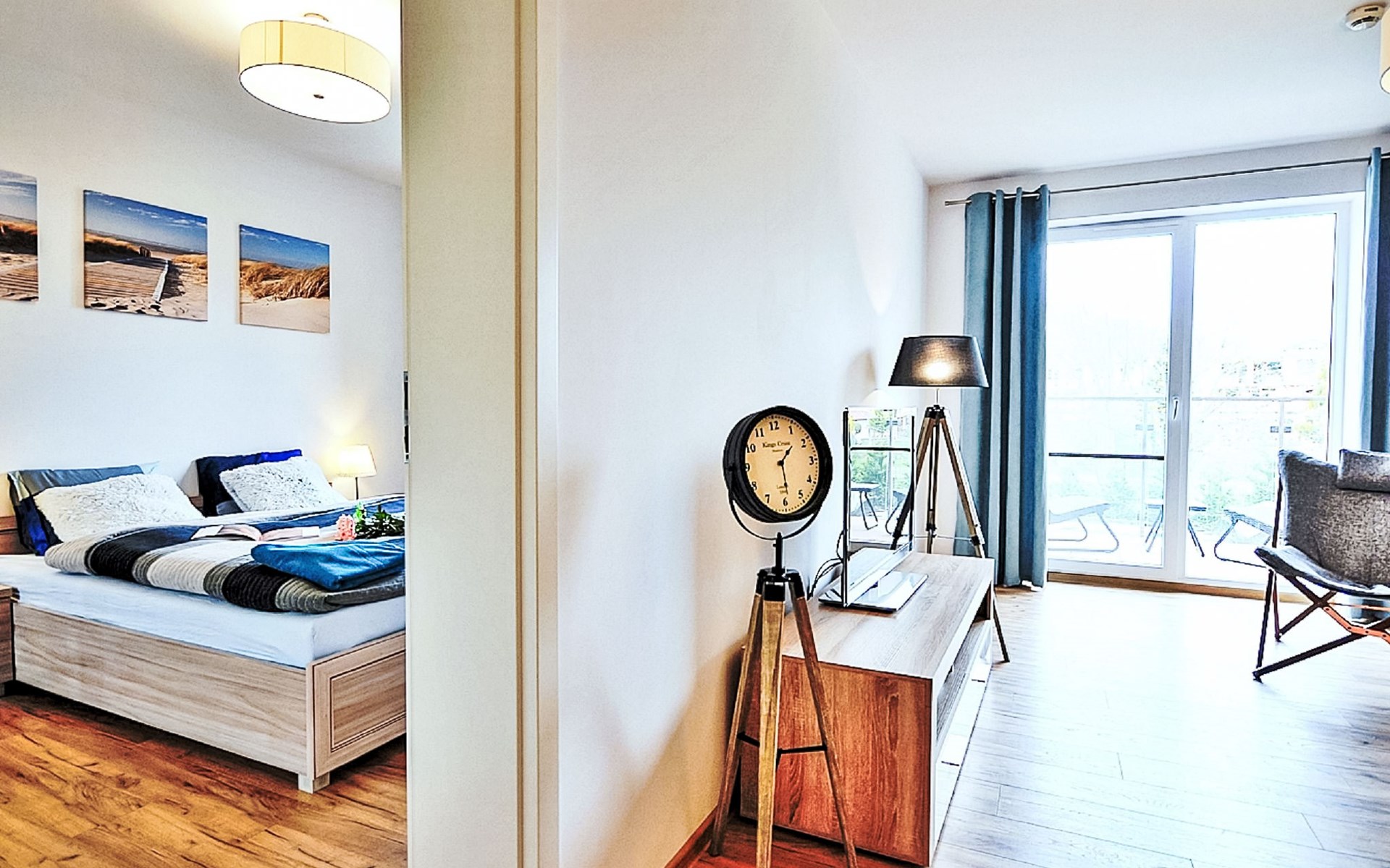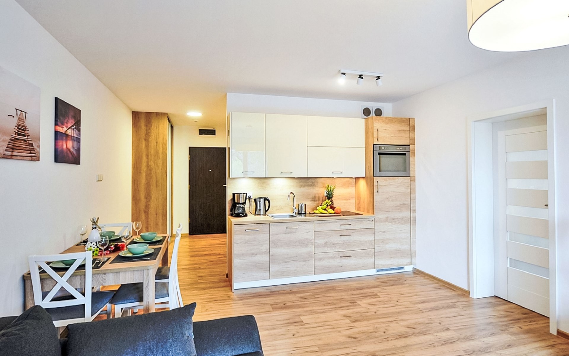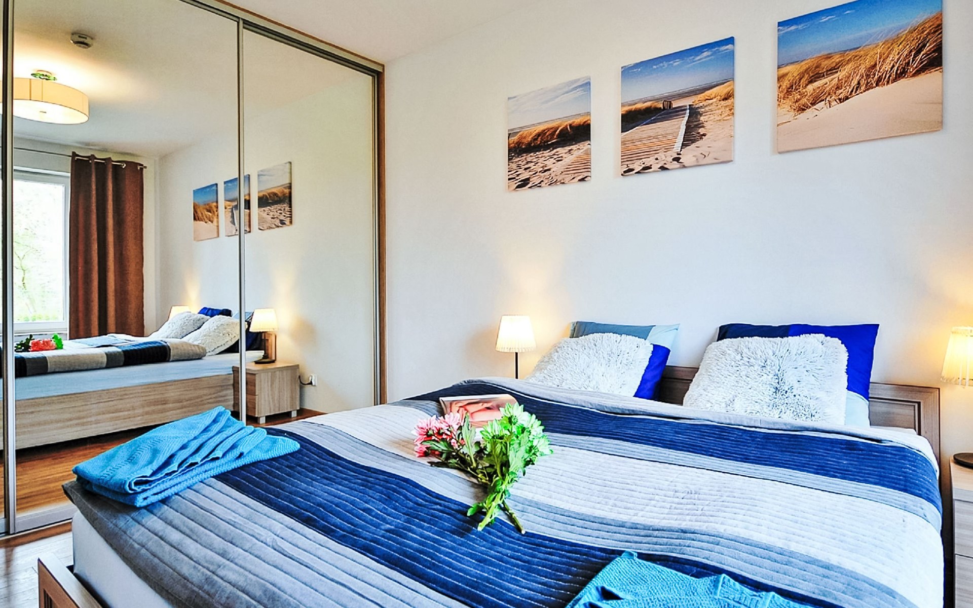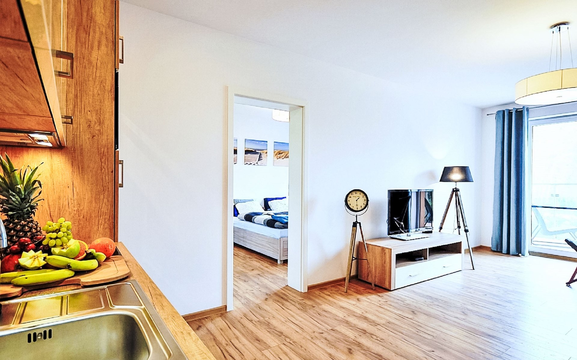 Moderne, comfortabel flatgebouw "Szum Morza", bouwjaar 2017. Aan de rand van de plaats, rustige, zonnige ligging, 350 m van zee, te midden van groen. Voor medegebruik: overdekt zwembad verwarmd (6 x 17 m, openingstijden zwembad: 09:00-21:00). Douche/WC bij het zwembad, kinderzwembad, hot tub, kinderspeelplaats. In het huis: sauna, fitnessruimte, speelkamer, lift, centrale verwarming, alarmsysteem. Parkeerplaats bij het huis op het terrein, openbare parkeerplaatsen in de straat. Winkel 1.3 km, levensmiddelenwinkel 850 m, supermarkt, restaurant 300 m, bushalte 1.1 km, station 2.5 km, zandstrand 350 m. Jachthaven 3 km. Attracties in de buurt: Oceanarium 3 km, Molo 3 km, Park Dziki Zachód Zieleniewo 7 km. Bewaakt vakantiecomplex.