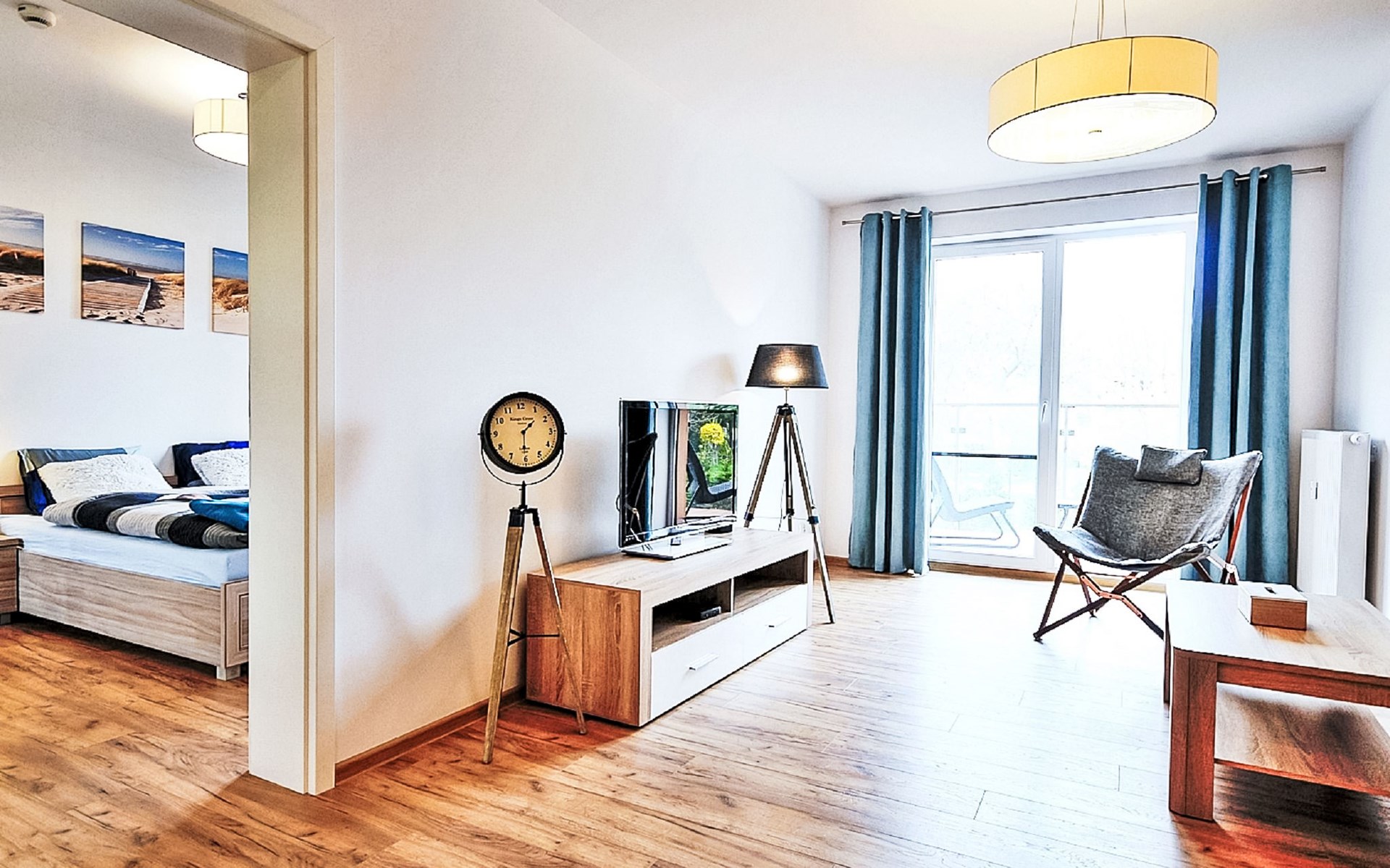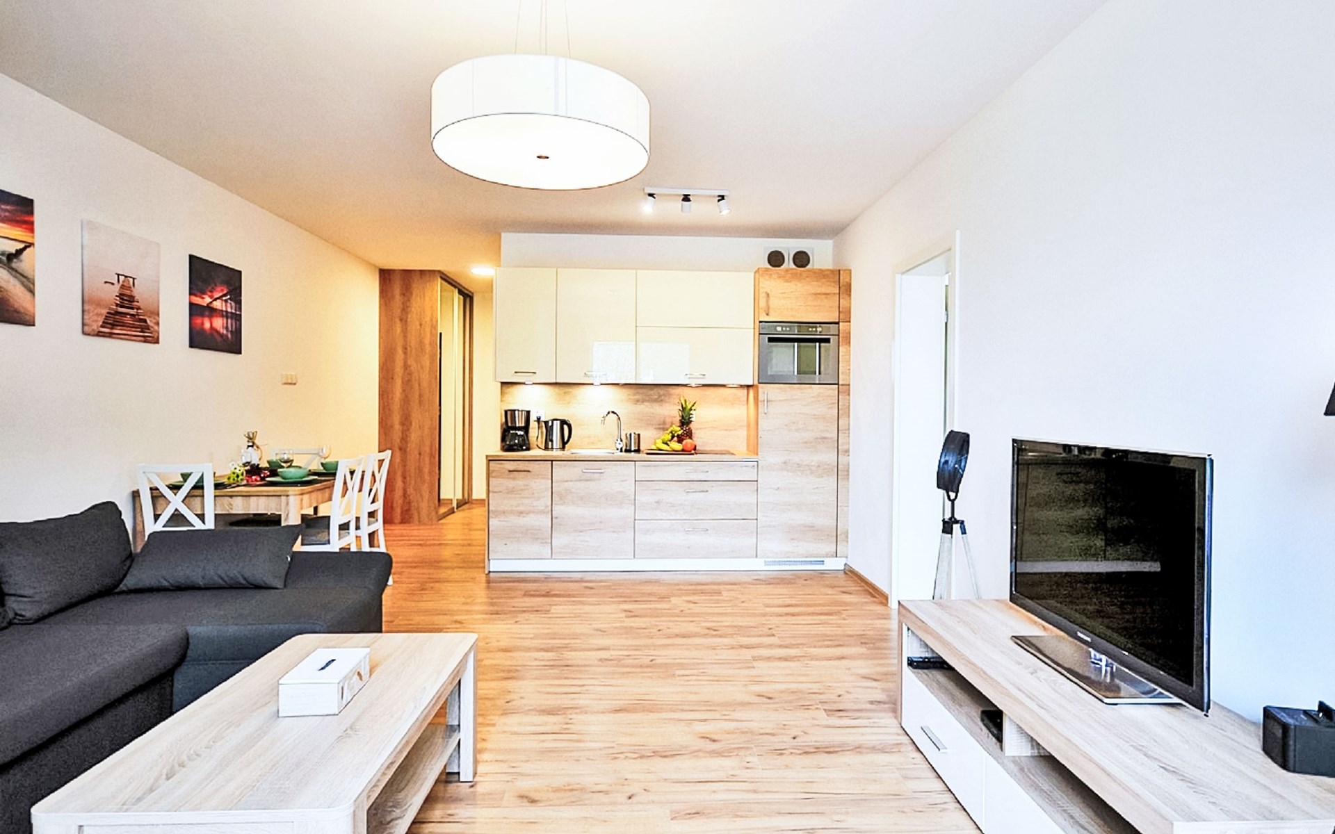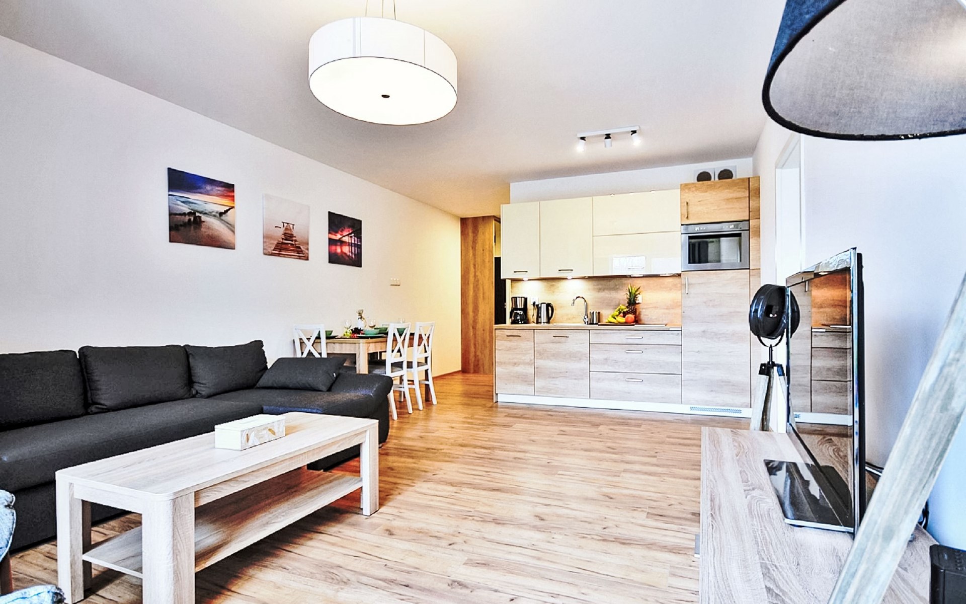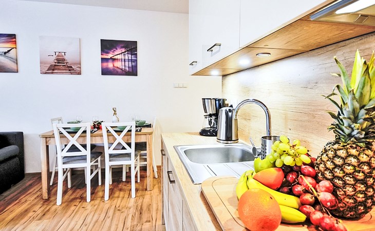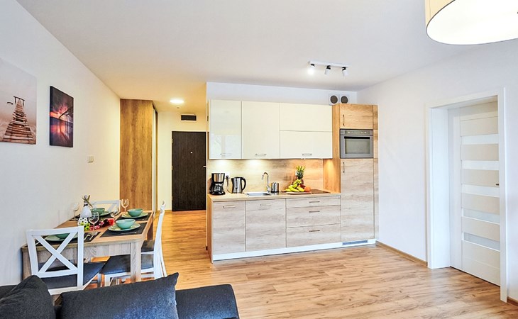 Moderne, comfortabel flatgebouw "Szum Morza", bouwjaar 2017. Aan de rand van de plaats, rustige, zonnige ligging, 350 m van zee, te midden van groen. Voor medegebruik: overdekt zwembad verwarmd (6 x 17 m, openingstijden zwembad: 09:00-21:00). Douche/WC bij het zwembad, kinderzwembad, hot tub, kinderspeelplaats. In het huis: sauna, fitnessruimte, speelkamer, lift, centrale verwarming, alarmsysteem. Parkeerplaats bij het huis op het terrein, openbare parkeerplaatsen in de straat. Winkel 1.3 km, levensmiddelenwinkel 850 m, supermarkt, restaurant 300 m, bushalte 1.1 km, station 2.5 km, zandstrand 350 m. Jachthaven 3 km. Attracties in de buurt: Oceanarium 3 km, Molo 3 km, Park Dziki Zachód Zieleniewo 7 km. Bewaakt vakantiecomplex.