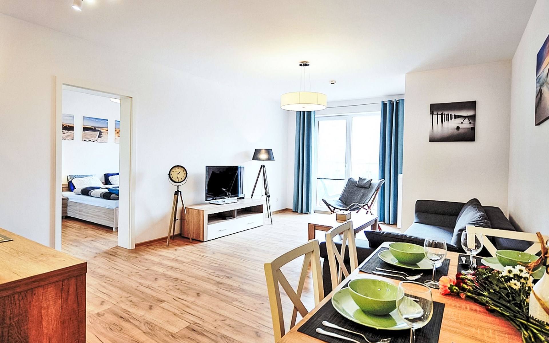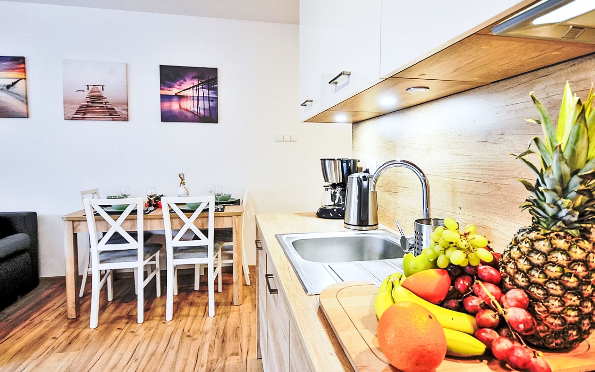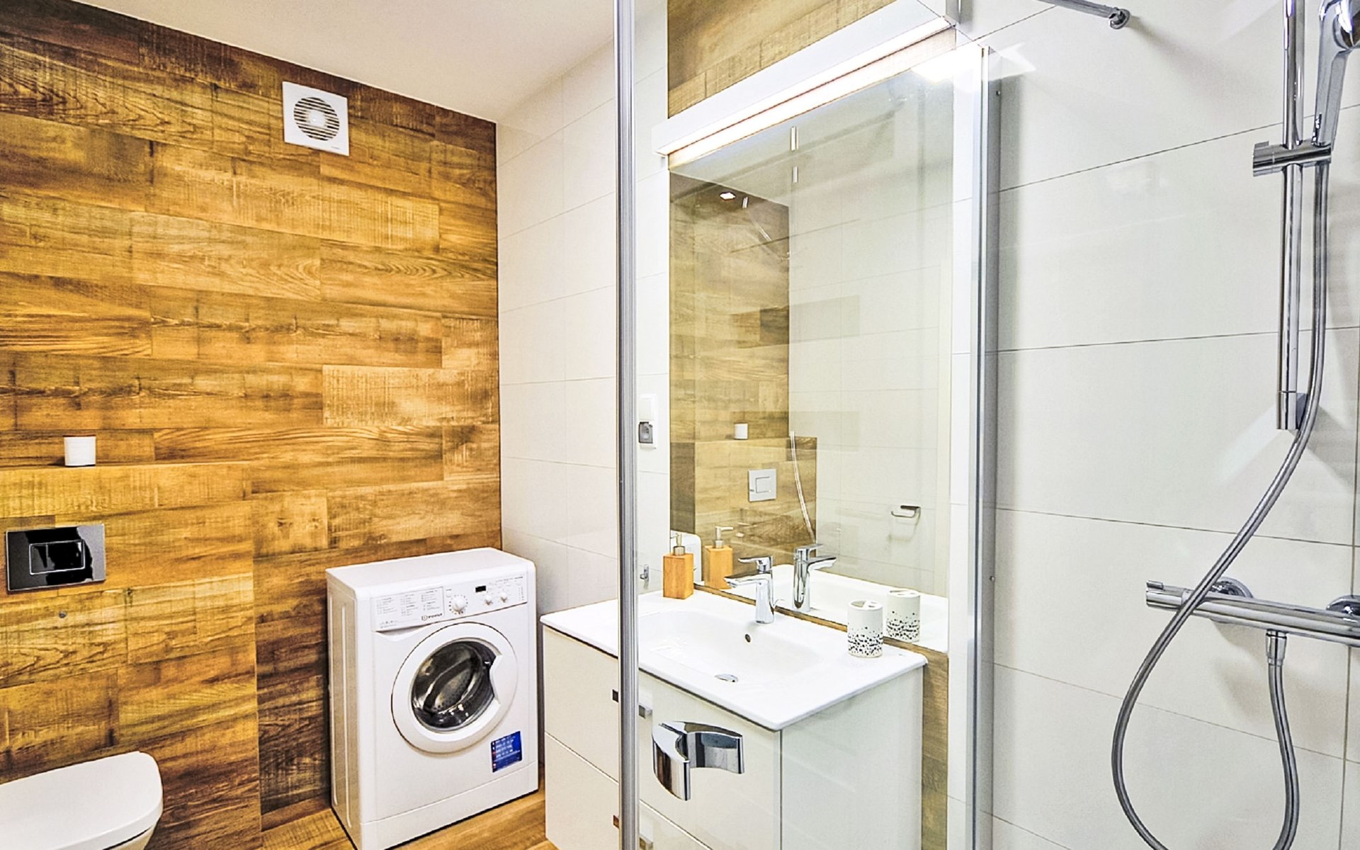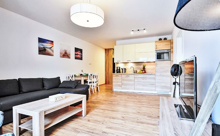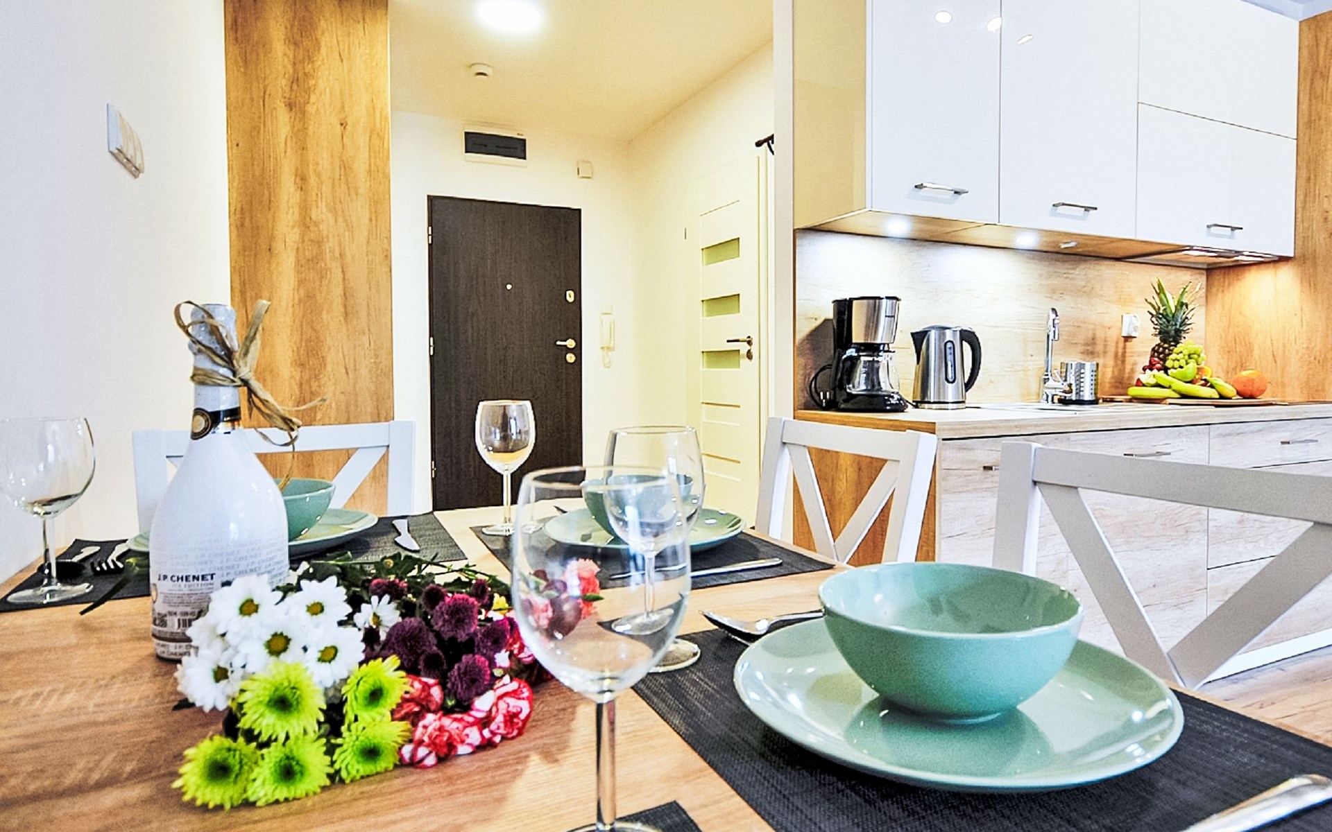 Moderne, comfortabel flatgebouw "Szum Morza", bouwjaar 2017. Aan de rand van de plaats, rustige, zonnige ligging, 350 m van zee, te midden van groen. Voor medegebruik: overdekt zwembad verwarmd (6 x 17 m, openingstijden zwembad: 09:00-21:00). Douche/WC bij het zwembad, kinderzwembad, hot tub, kinderspeelplaats. In het huis: sauna, fitnessruimte, speelkamer, lift, centrale verwarming, alarmsysteem. Parkeerplaats bij het huis op het terrein, openbare parkeerplaatsen in de straat. Winkel 1.3 km, levensmiddelenwinkel 850 m, supermarkt, restaurant 300 m, bushalte 1.1 km, station 2.5 km, zandstrand 350 m. Jachthaven 3 km. Attracties in de buurt: Oceanarium 3 km, Molo 3 km, Park Dziki Zachód Zieleniewo 7 km. Bewaakt vakantiecomplex.