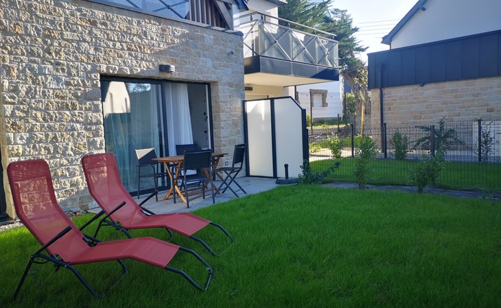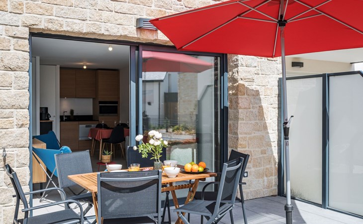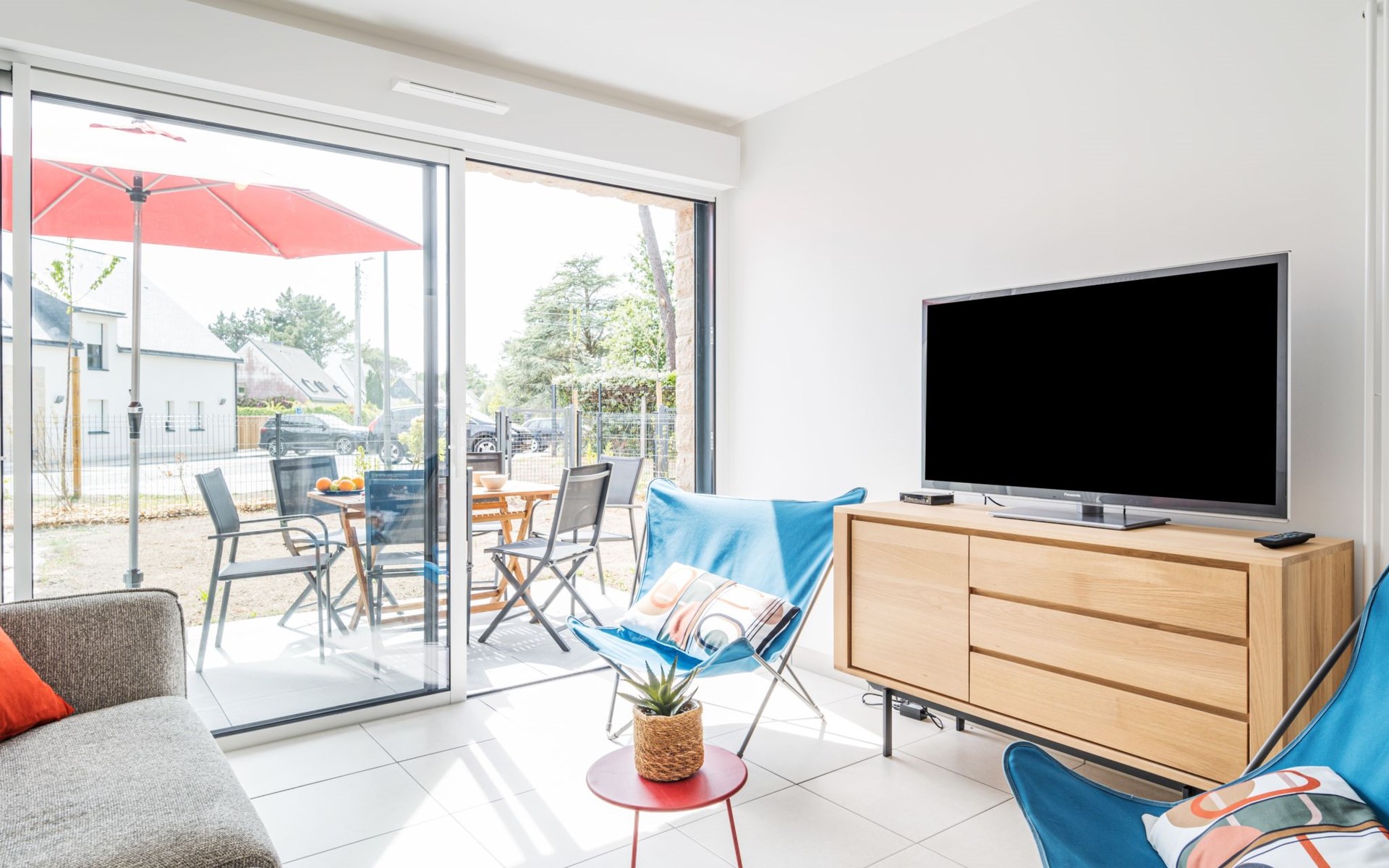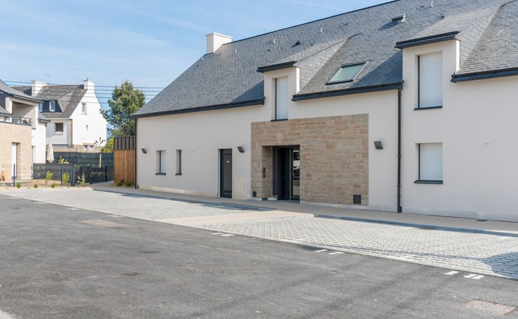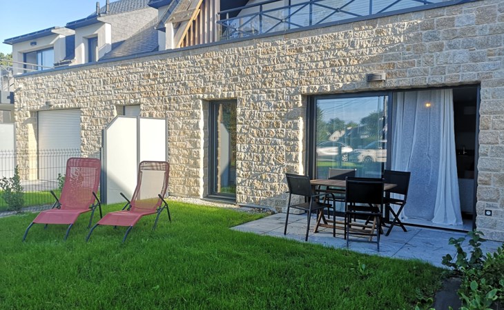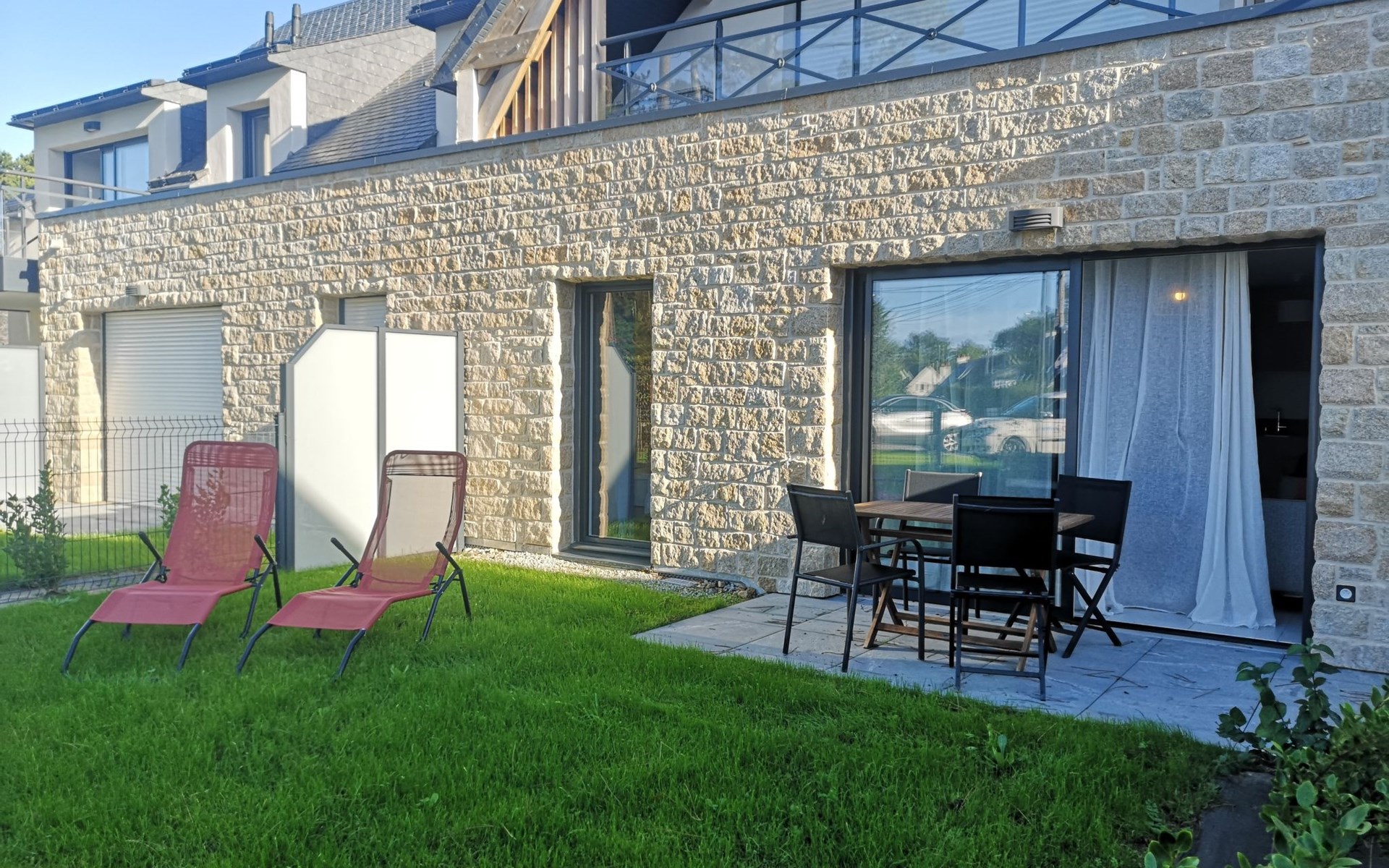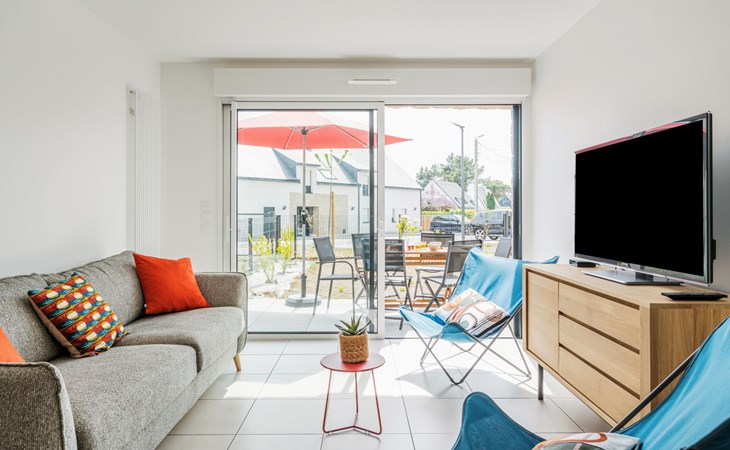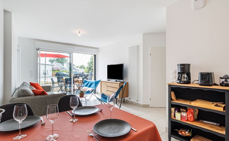 Moderne flatgebouw "Les Villas du Men Du", van 2 verdiepingen, bouwjaar 2022. In de plaats, 300 m van zee, van het strand. In het huis: bergruimte voor fietsen. Supermarkt 200 m, restaurant 500 m, bar, bakkerij 1 km, café, fietsverhuur 1 km, zandstrand "Plage du Men Du" 300 m, thermaalbad "Thalassothérapie Thalazur" 2 km. Golfterrein (18 holes) 15 km, surfschool 6 km, zeilschool 2 km. Attracties in de buurt: Les Alignements de Carnac 5 km, La Trinité sur Mer 5 km, Presqu'ile de Quiberon 15 km, Vannes 30 km, Lorient 40 km, Belle Ile en Mer, Houat, Hoedic. Wandelgebied Le Golfe du Morbihan 30 km.