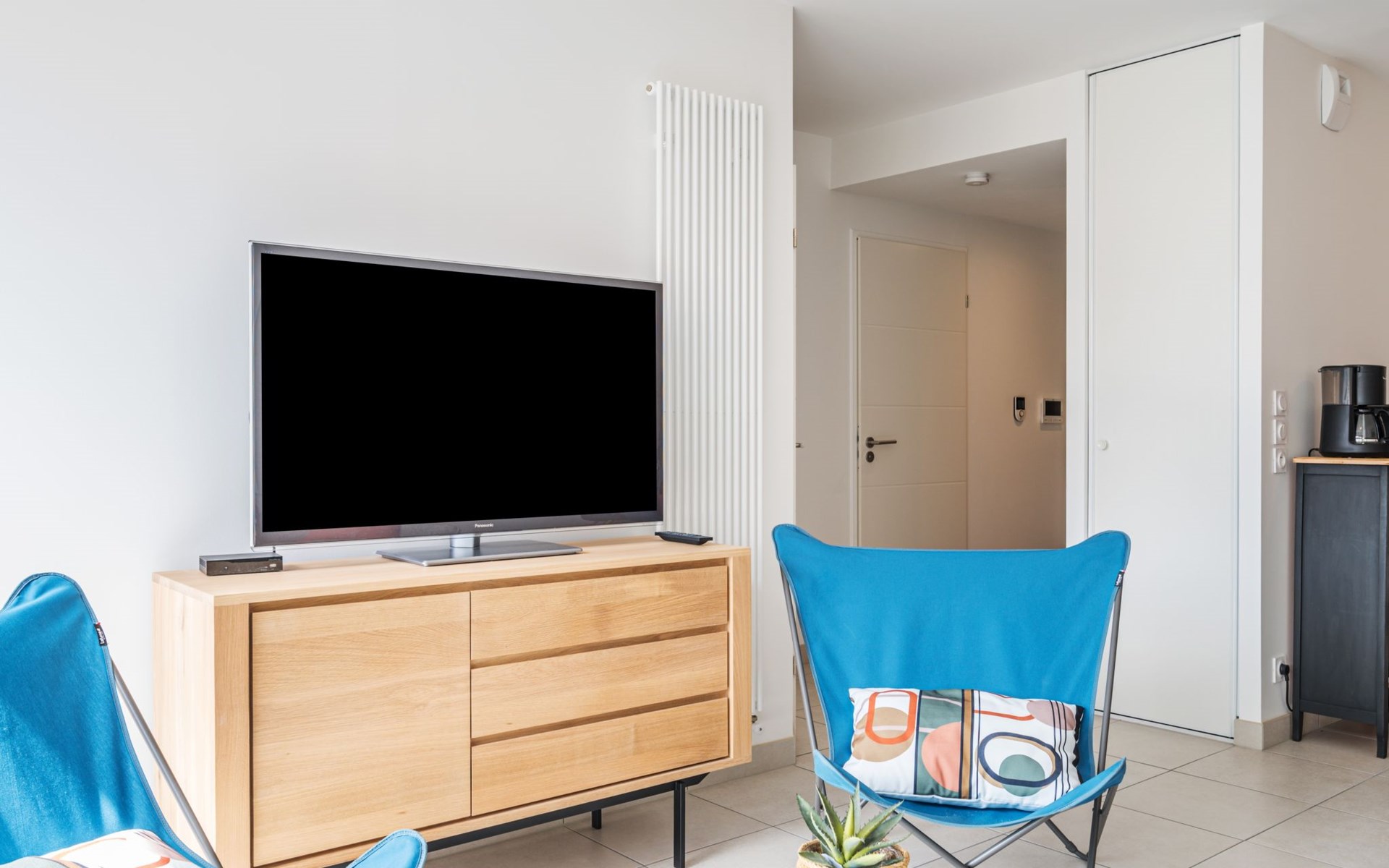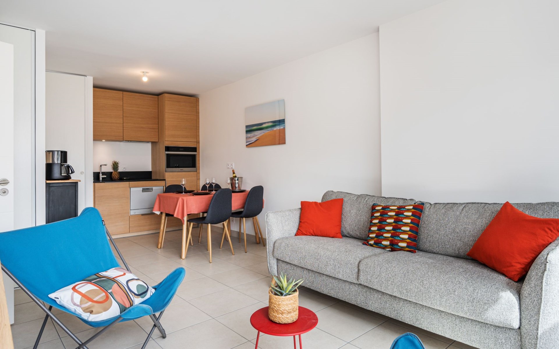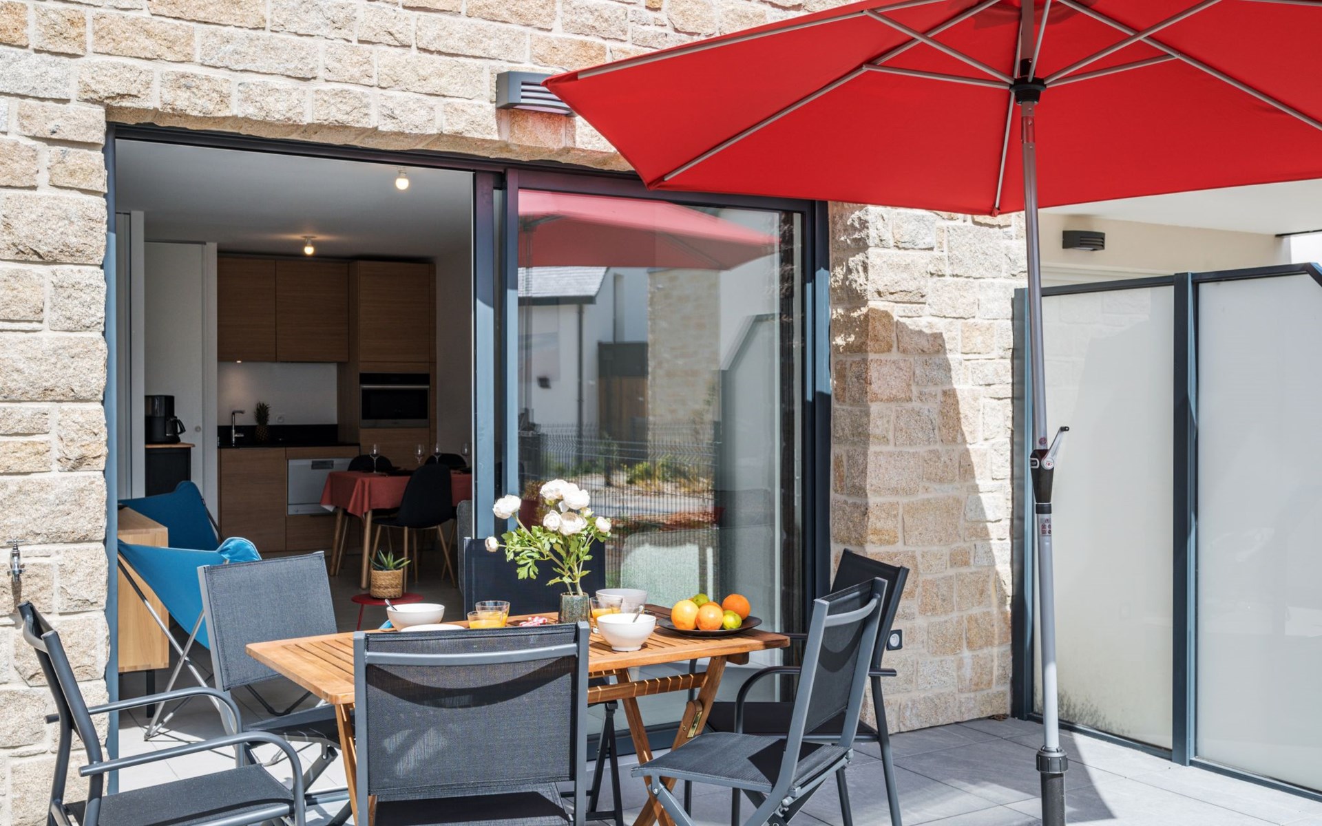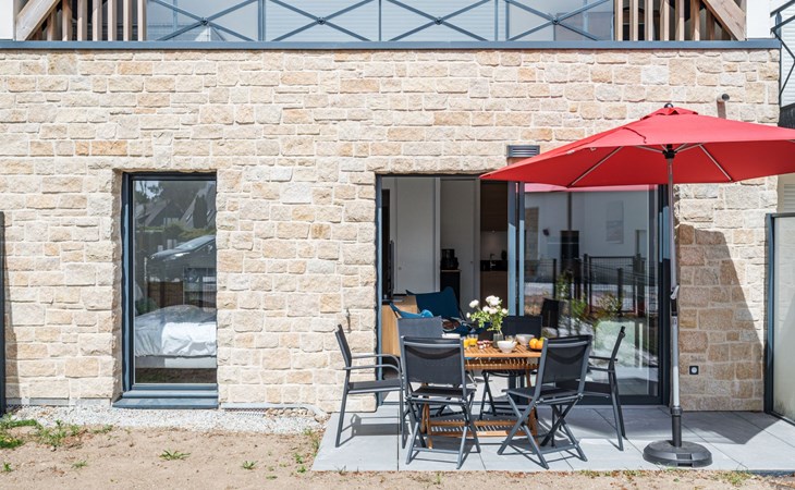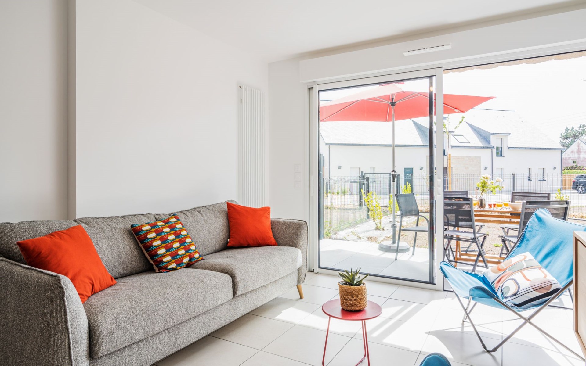 Moderne flatgebouw "Les Villas du Men Du", van 2 verdiepingen, bouwjaar 2022. In de plaats, 300 m van zee, van het strand. In het huis: bergruimte voor fietsen. Supermarkt 200 m, restaurant 500 m, bar, bakkerij 1 km, café, fietsverhuur 1 km, zandstrand "Plage du Men Du" 300 m, thermaalbad "Thalassothérapie Thalazur" 2 km. Golfterrein (18 holes) 15 km, surfschool 6 km, zeilschool 2 km. Attracties in de buurt: Les Alignements de Carnac 5 km, La Trinité sur Mer 5 km, Presqu'ile de Quiberon 15 km, Vannes 30 km, Lorient 40 km, Belle Ile en Mer, Houat, Hoedic. Wandelgebied Le Golfe du Morbihan 30 km.