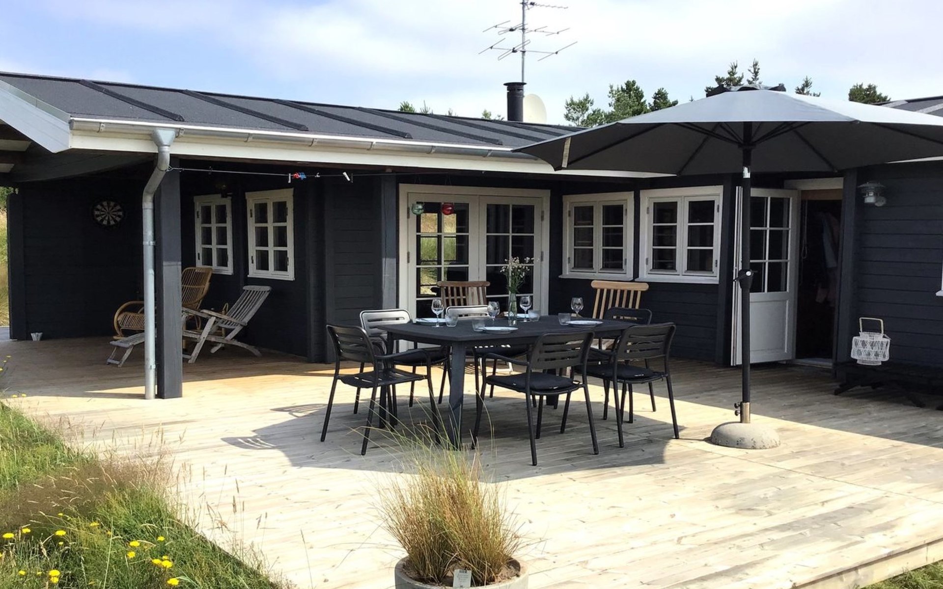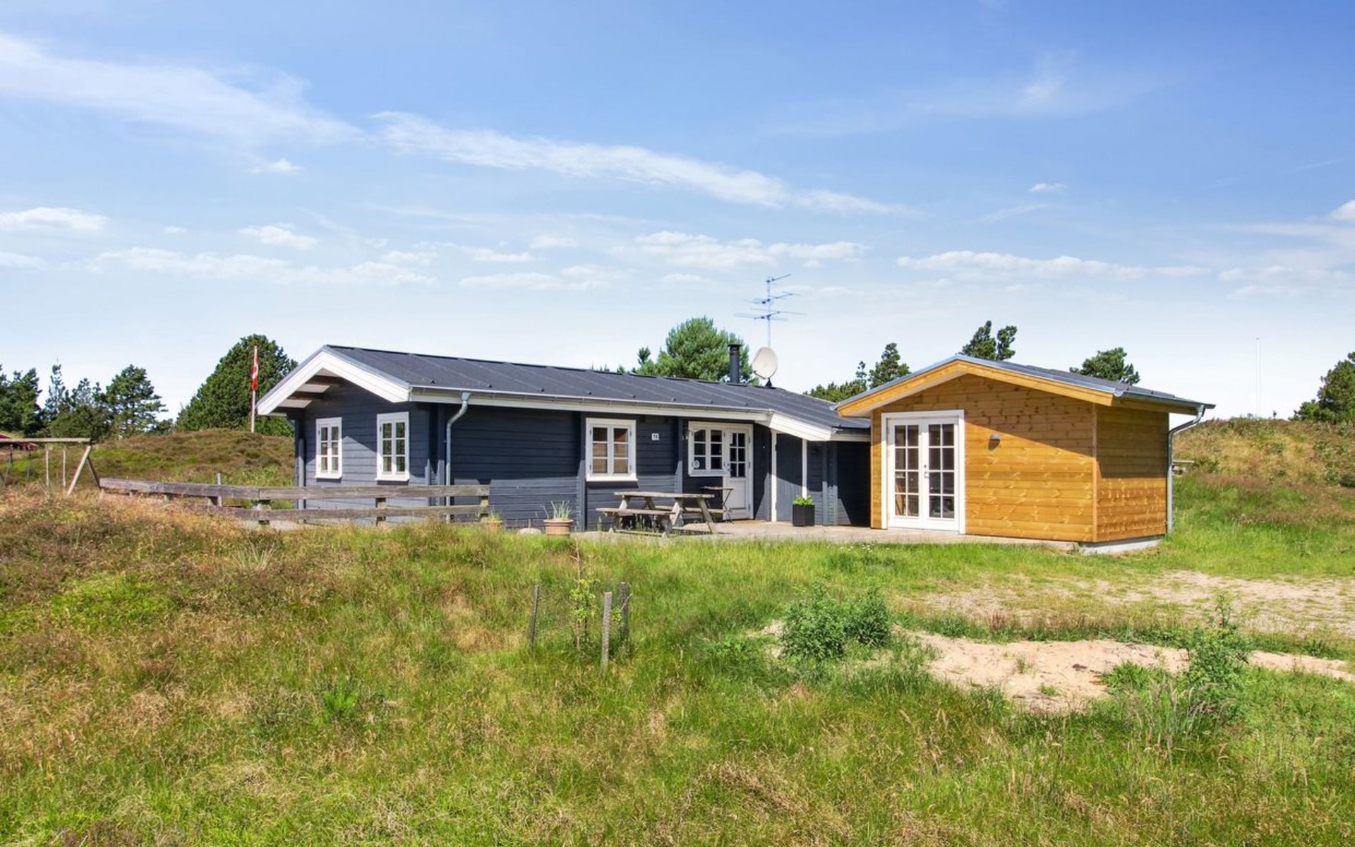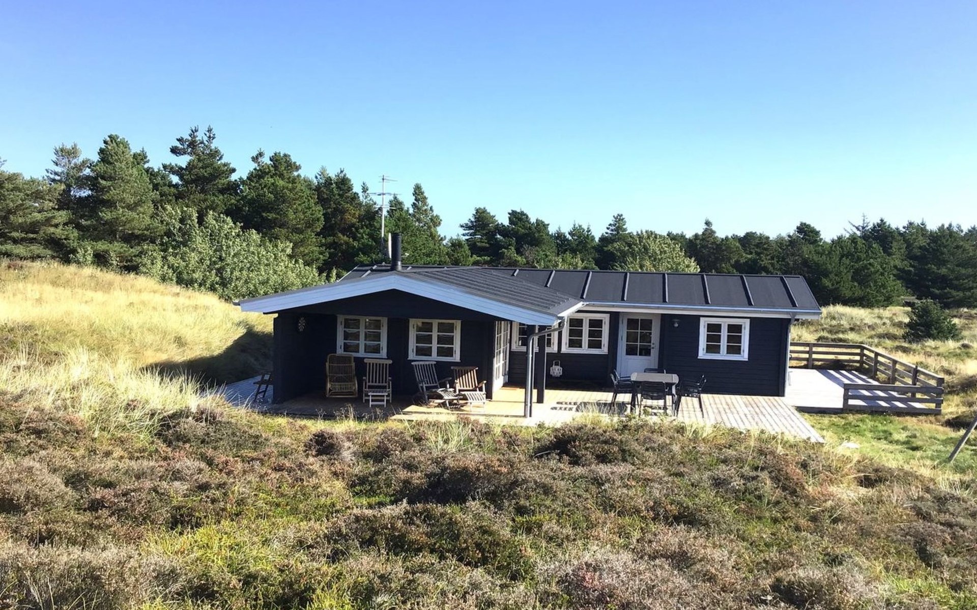 Eengezinswoning, bouwjaar 1977. 1.9 km van zee. Voor alleengebruik: wild terrein 2.510 m2. Buitendouche, barbecue, kinderspeelplaats (schommel). In het huis: wasmachine, droger. Parkeerplaats bij het huis. Levensmiddelenwinkel 2 km. De eigenaar accepteert geen jeugdgroepen.