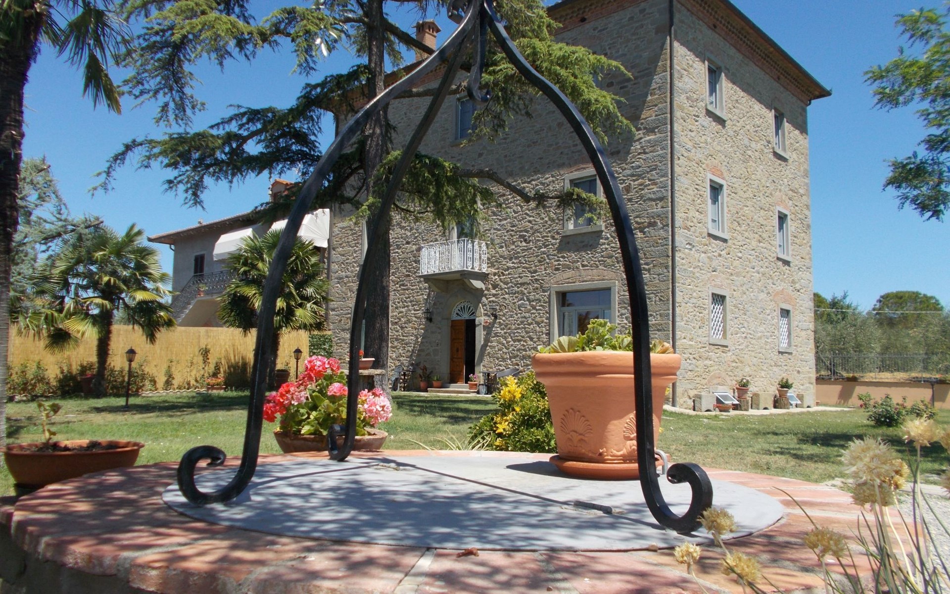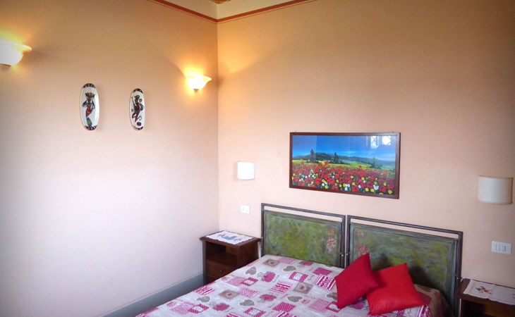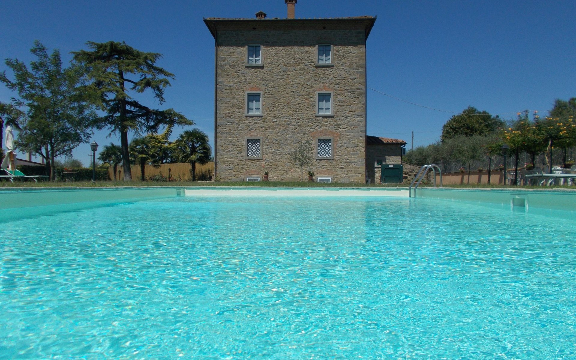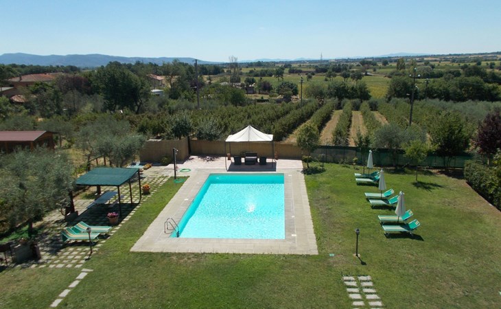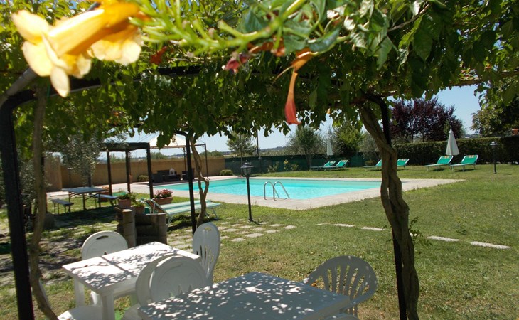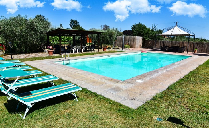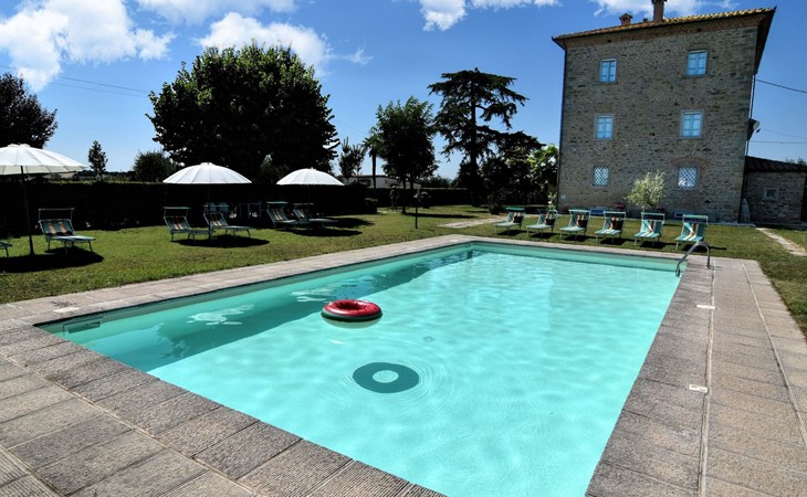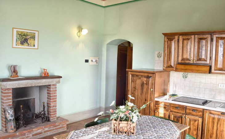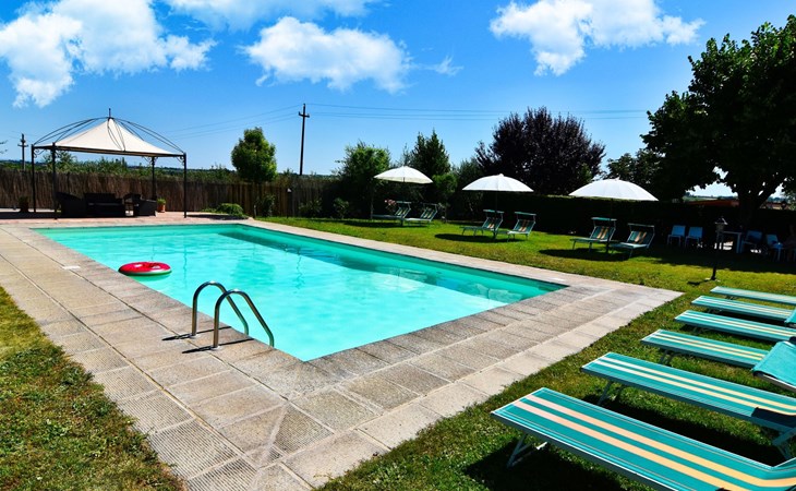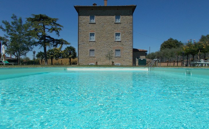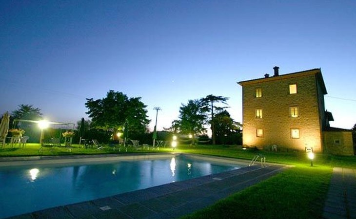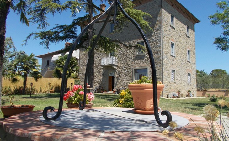 The Palazzo is situated in the Fratta region, a rural area in which a splendid chandelier – one of the most important examples of Etruscan civilization – was discovered. The path of Bonifica Leopoldina, from which you can enjoy a view of Cortona and the surrounding countryside, runs near to the Villa and can be explored on foot, by bicycle or on horseback.There are six apartments of various sizes, each of which contains antique furniture which fits harmoniously together with the vaulted ceilings, the terracotta-tiled floors and the arches, making the villa a beautiful and welcoming place to stay. The bedrooms are painted in warm colours matching the hues of the surrounding countryside. Air conditioning, satellite television and dishwashers are all available.The large garden, which surrounds The Palazzo, is equipped with chairs and tables, beach umbrellas, sunbeds, children’s games, bicycles, barbecue equipment and a beautiful swimming pool for the exclusive use of guests.The villa’s enchanting location, surrounded by orchards and farmland, makes it an ideal place for holidays, offering exquisite sunrises and breathtaking sunsets.Villa Il Palazzo is not far from the most beautiful towns and cities in Tuscany and Umbria, such as Florence, Siena, Arezzo, Pienza, Montepulciano, Montalcino, Lake Trasimeno, Perugia, Assisi, Gubbio, Orvieto, Spoleto, etc…. IT051017C23E6JCLDI