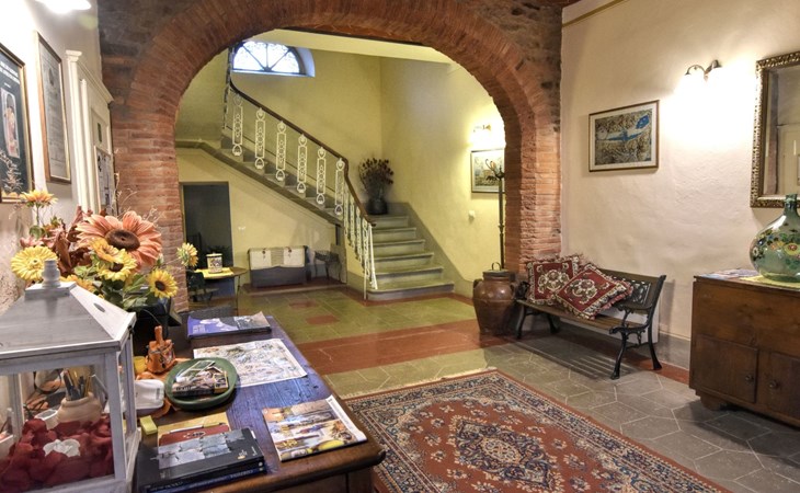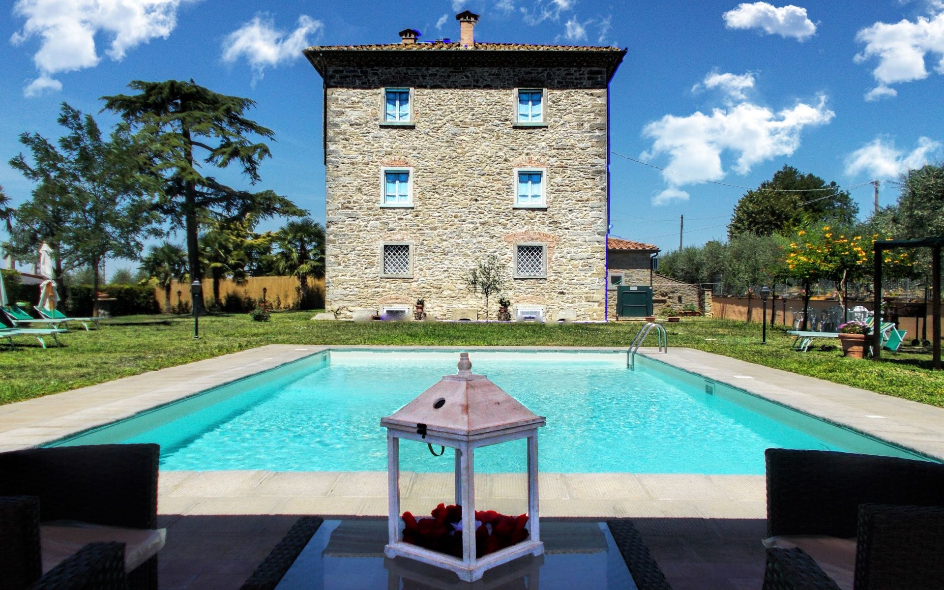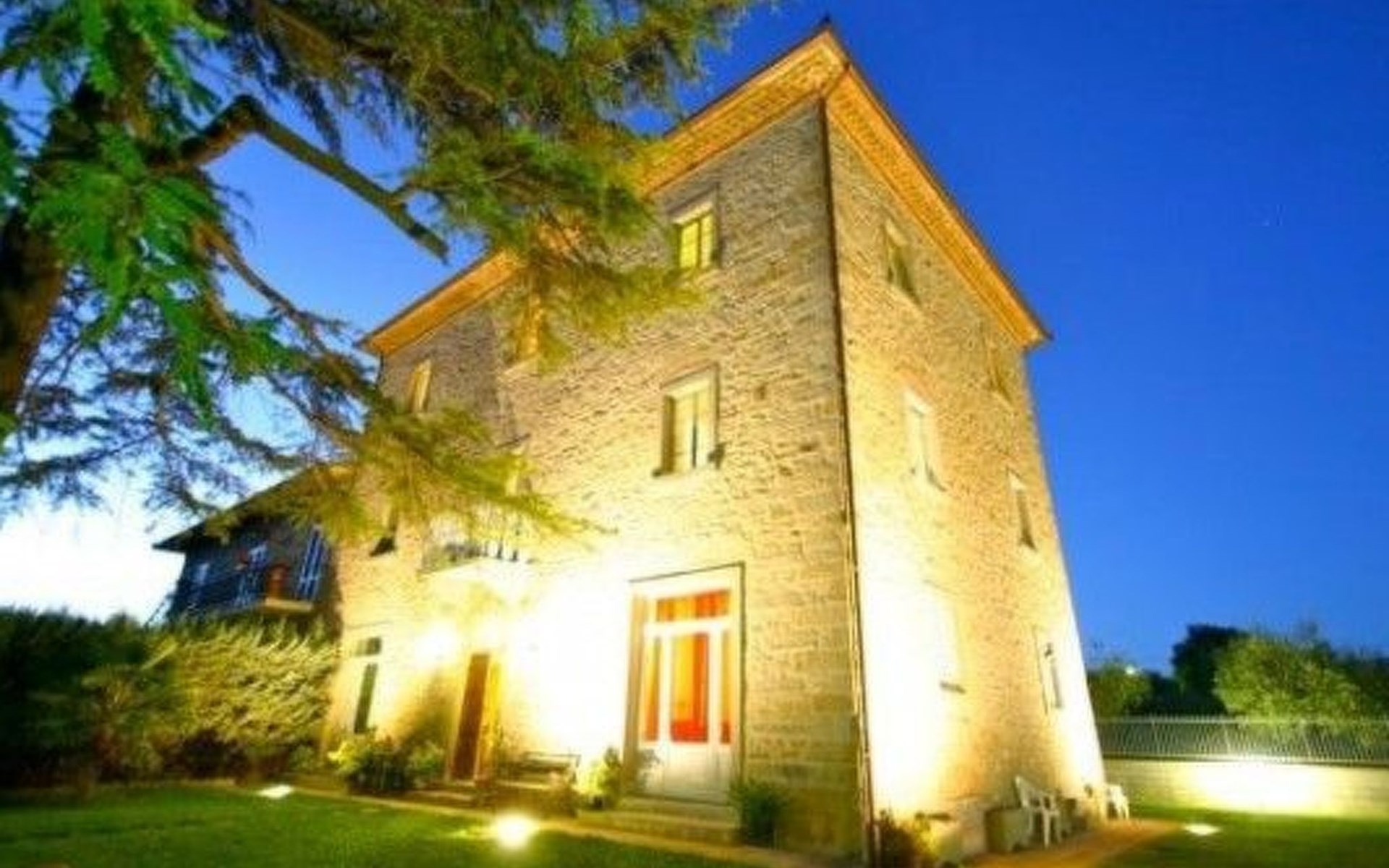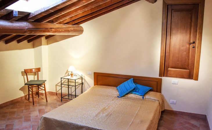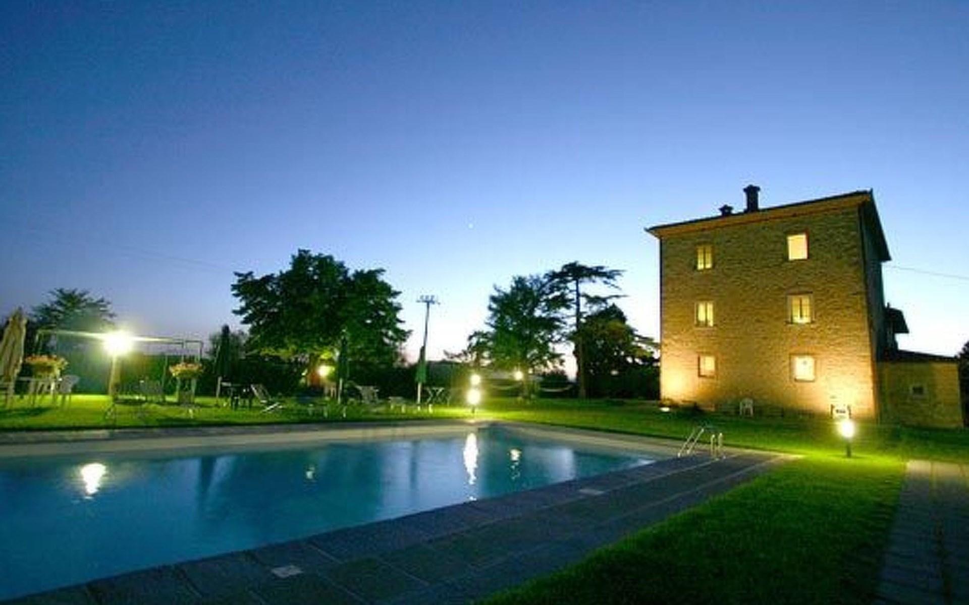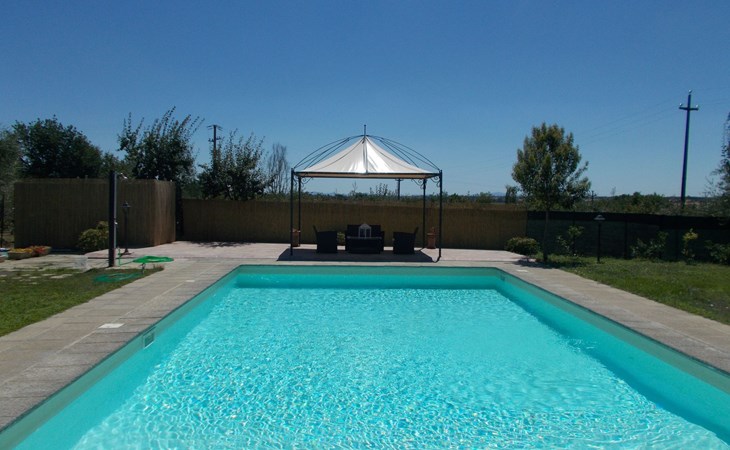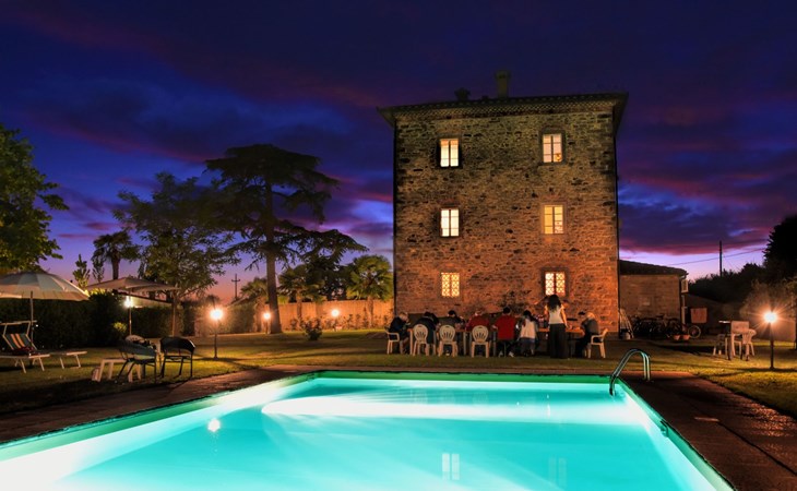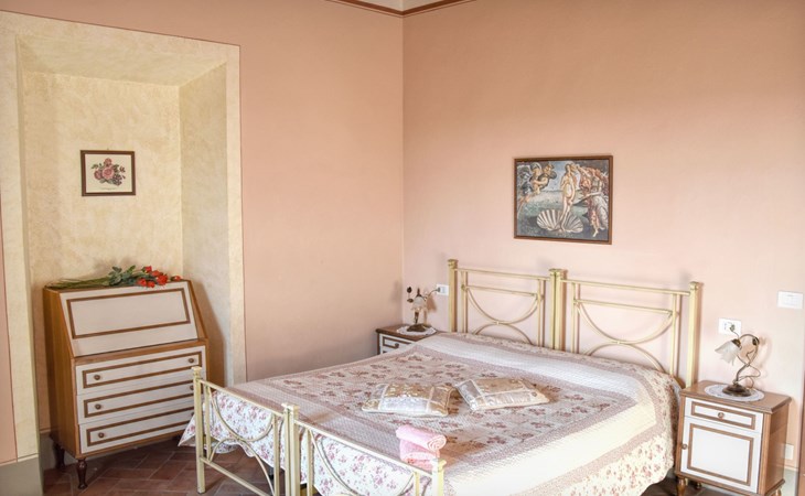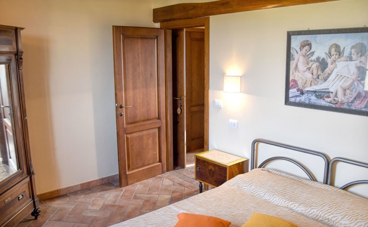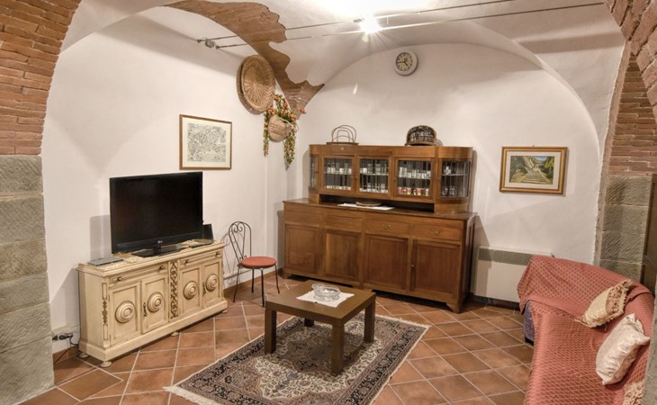 The Palazzo is situated in the Fratta region, a rural area in which a splendid chandelier – one of the most important examples of Etruscan civilization – was discovered. The path of Bonifica Leopoldina, from which you can enjoy a view of Cortona and the surrounding countryside, runs near to the Villa and can be explored on foot, by bicycle or on horseback.There are six apartments of various sizes, each of which contains antique furniture which fits harmoniously together with the vaulted ceilings, the terracotta-tiled floors and the arches, making the villa a beautiful and welcoming place to stay. The bedrooms are painted in warm colours matching the hues of the surrounding countryside. Air conditioning, satellite television and dishwashers are all available.The large garden, which surrounds The Palazzo, is equipped with chairs and tables, beach umbrellas, sunbeds, children’s games, bicycles, barbecue equipment and a beautiful swimming pool for the exclusive use of guests.The villa’s enchanting location, surrounded by orchards and farmland, makes it an ideal place for holidays, offering exquisite sunrises and breathtaking sunsets.Villa Il Palazzo is not far from the most beautiful towns and cities in Tuscany and Umbria, such as Florence, Siena, Arezzo, Pienza, Montepulciano, Montalcino, Lake Trasimeno, Perugia, Assisi, Gubbio, Orvieto, Spoleto, etc…. IT051017C23E6JCLDI