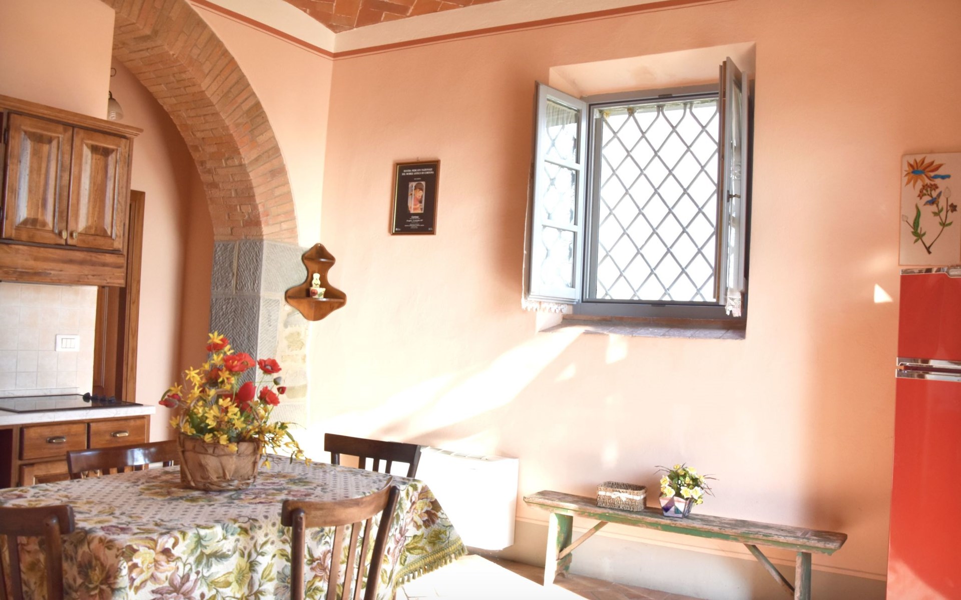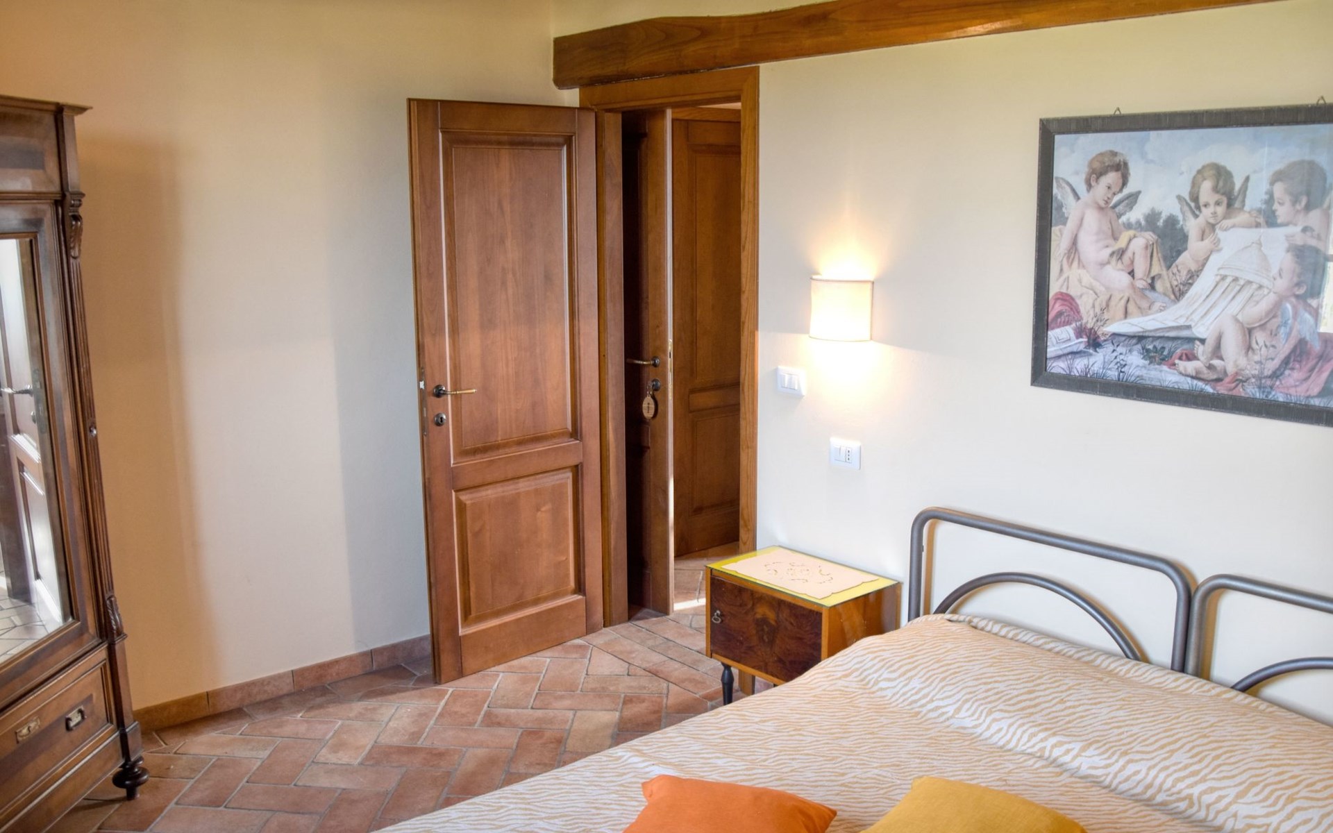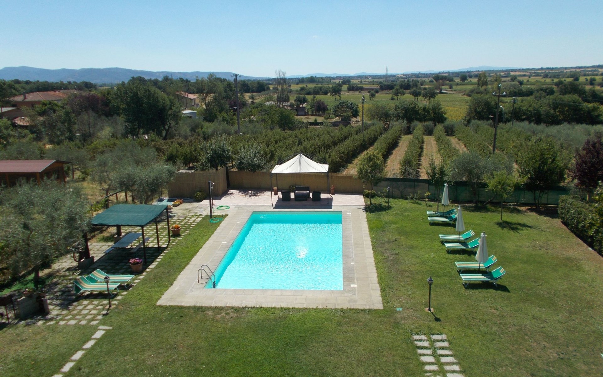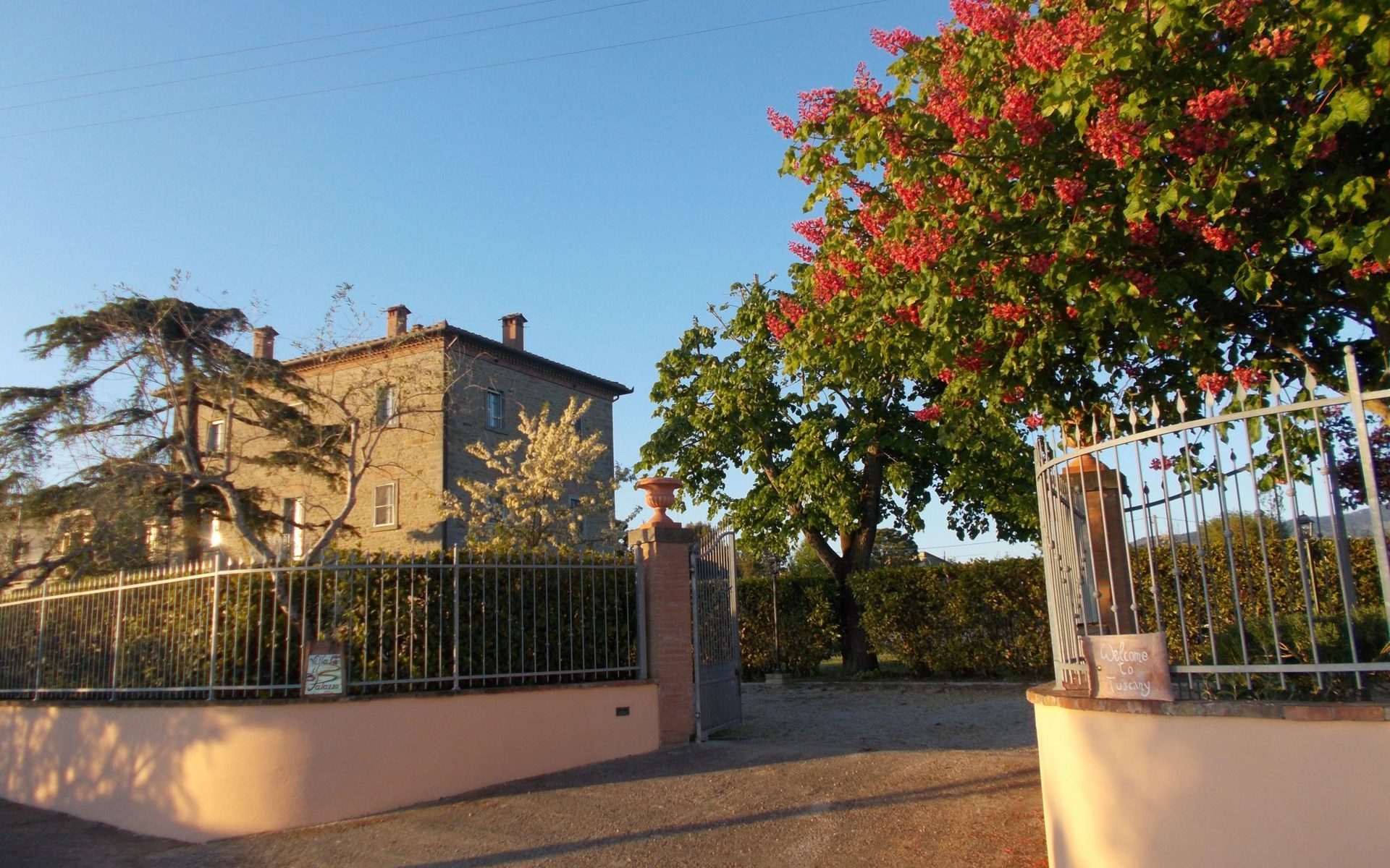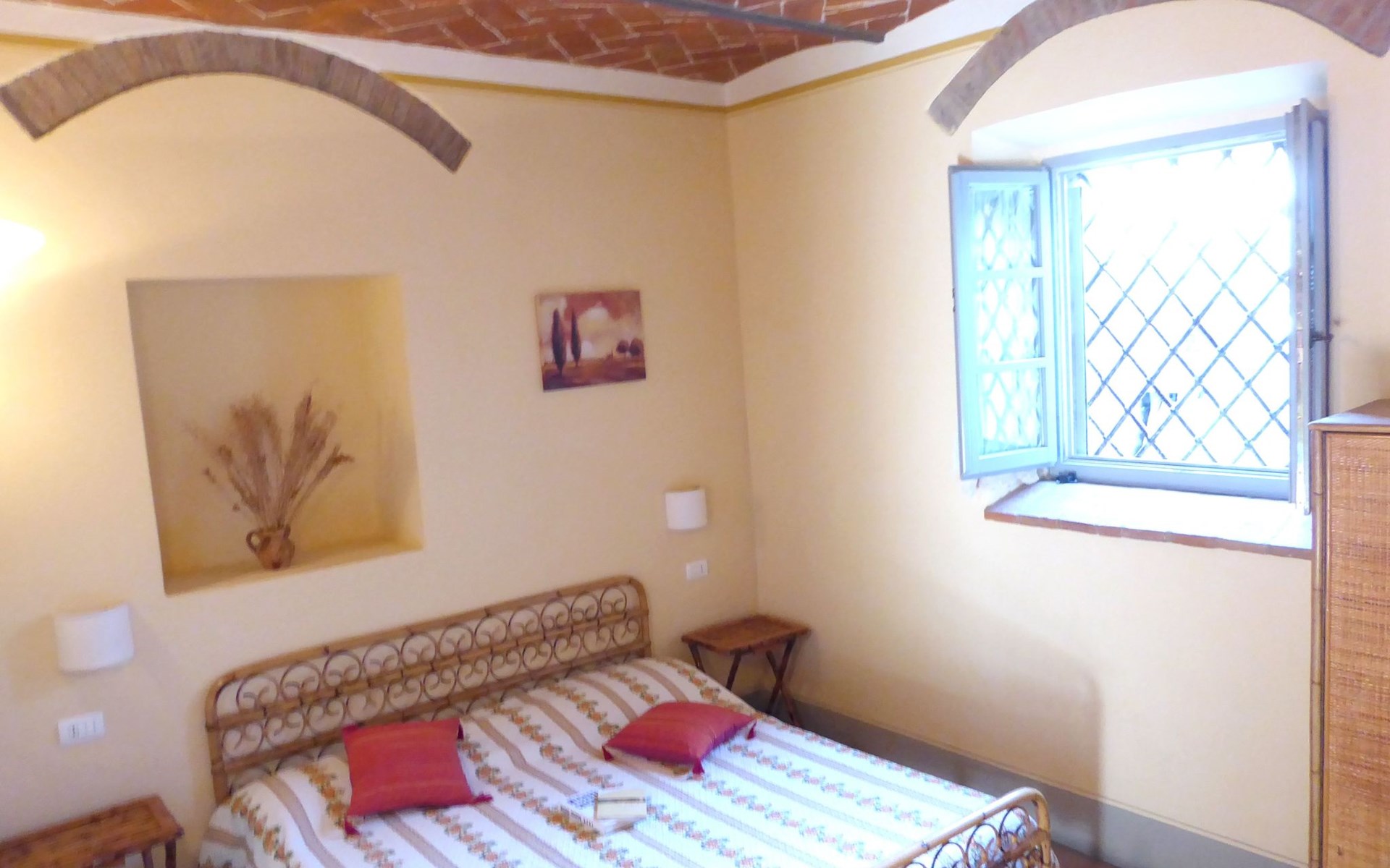 The Palazzo is situated in the Fratta region, a rural area in which a splendid chandelier – one of the most important examples of Etruscan civilization – was discovered. The path of Bonifica Leopoldina, from which you can enjoy a view of Cortona and the surrounding countryside, runs near to the Villa and can be explored on foot, by bicycle or on horseback.There are six apartments of various sizes, each of which contains antique furniture which fits harmoniously together with the vaulted ceilings, the terracotta-tiled floors and the arches, making the villa a beautiful and welcoming place to stay. The bedrooms are painted in warm colours matching the hues of the surrounding countryside. Air conditioning, satellite television and dishwashers are all available.The large garden, which surrounds The Palazzo, is equipped with chairs and tables, beach umbrellas, sunbeds, children’s games, bicycles, barbecue equipment and a beautiful swimming pool for the exclusive use of guests.The villa’s enchanting location, surrounded by orchards and farmland, makes it an ideal place for holidays, offering exquisite sunrises and breathtaking sunsets.Villa Il Palazzo is not far from the most beautiful towns and cities in Tuscany and Umbria, such as Florence, Siena, Arezzo, Pienza, Montepulciano, Montalcino, Lake Trasimeno, Perugia, Assisi, Gubbio, Orvieto, Spoleto, etc…. IT051017C23E6JCLDI
