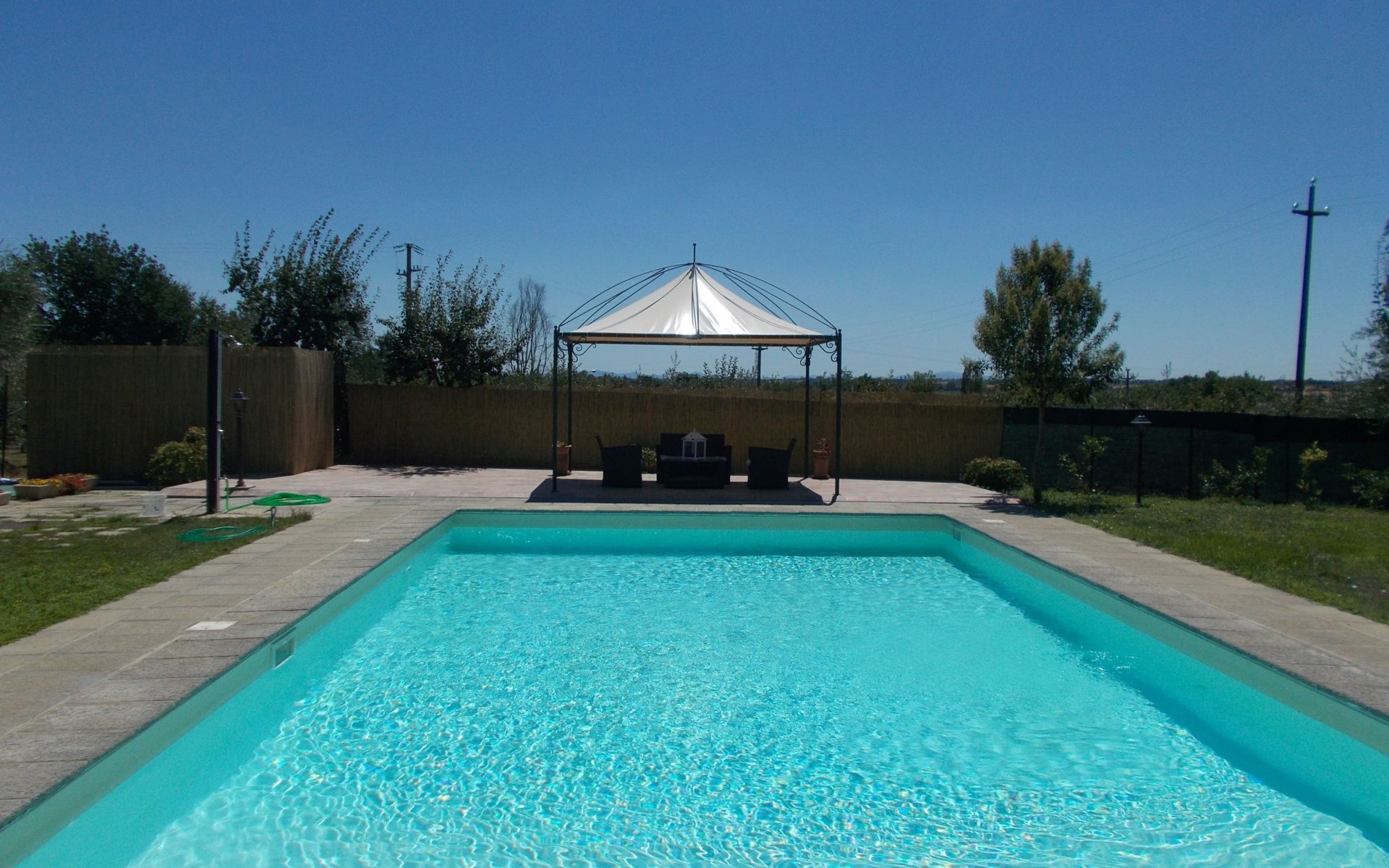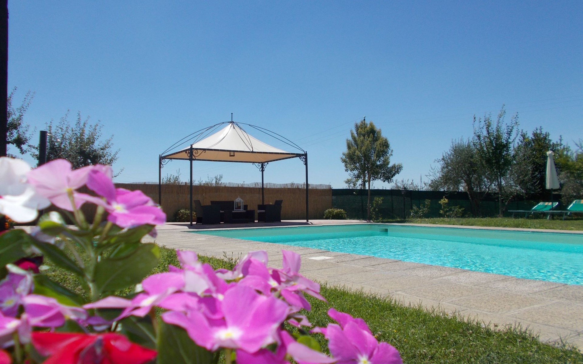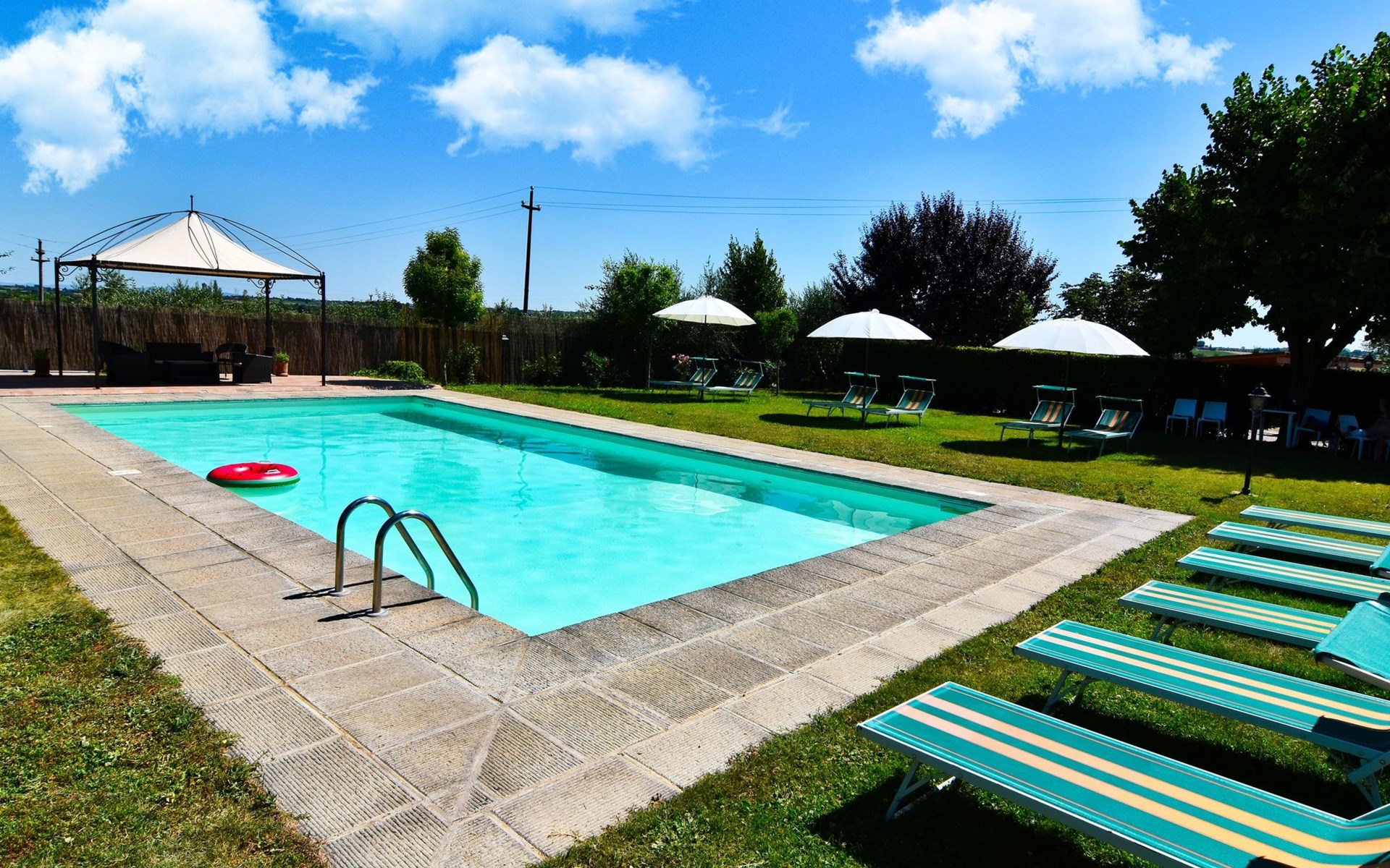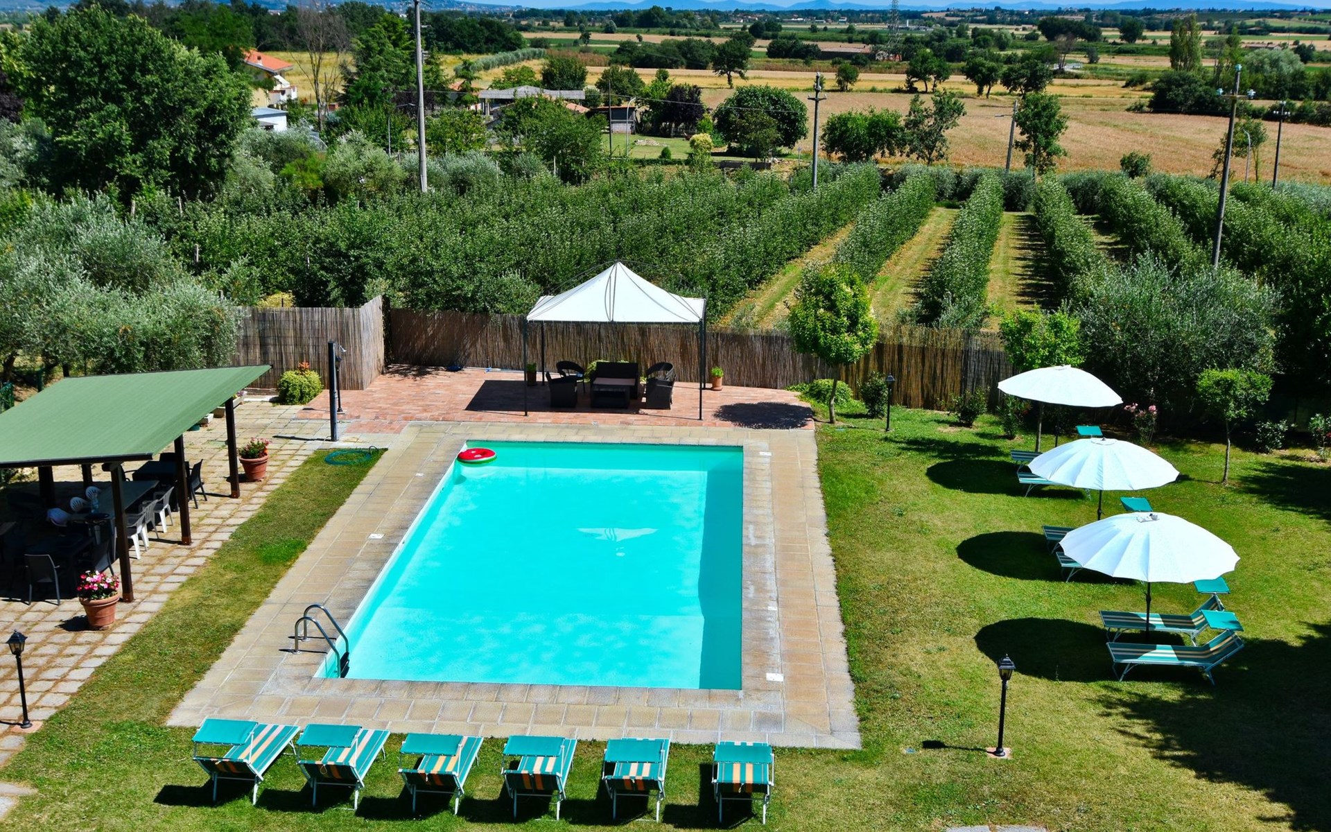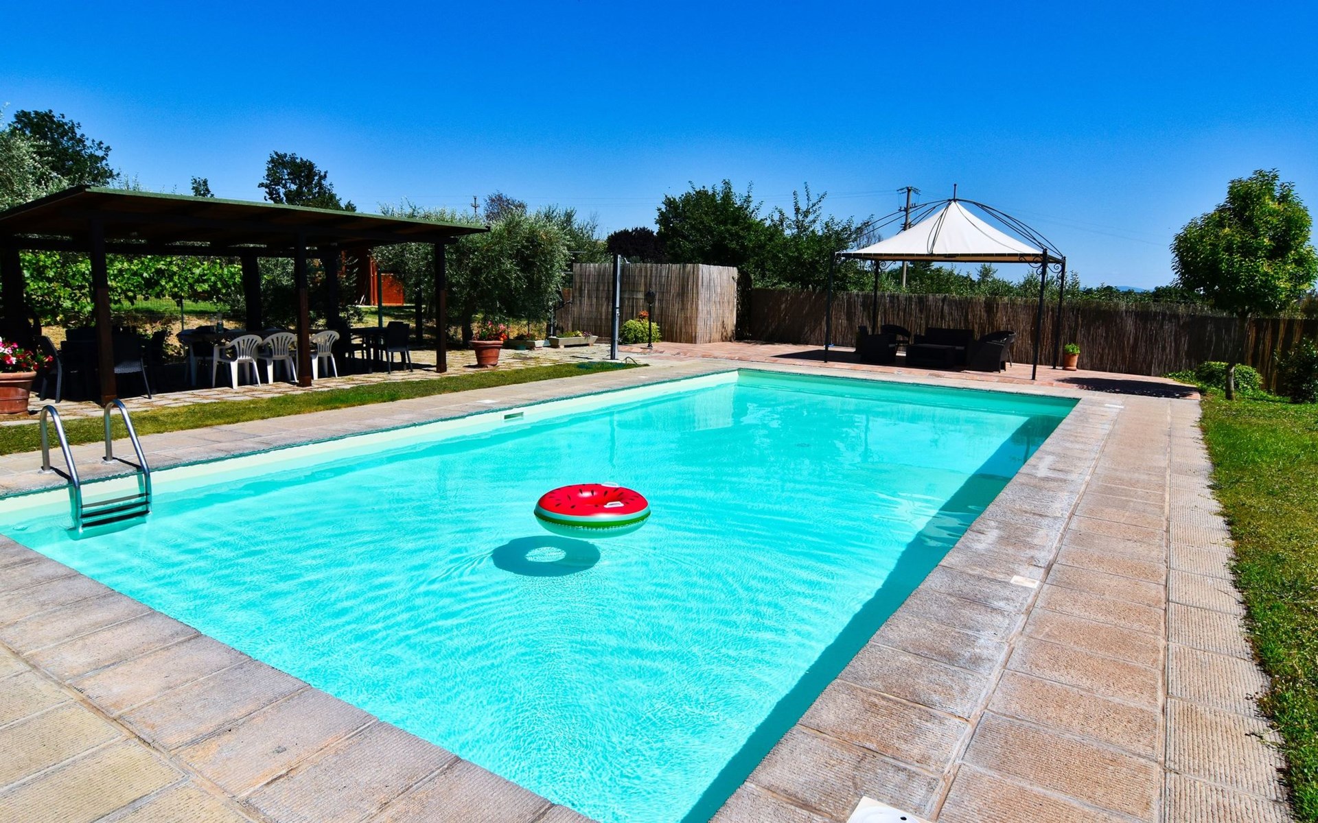 The Palazzo is situated in the Fratta region, a rural area in which a splendid chandelier – one of the most important examples of Etruscan civilization – was discovered. The path of Bonifica Leopoldina, from which you can enjoy a view of Cortona and the surrounding countryside, runs near to the Villa and can be explored on foot, by bicycle or on horseback.There are six apartments of various sizes, each of which contains antique furniture which fits harmoniously together with the vaulted ceilings, the terracotta-tiled floors and the arches, making the villa a beautiful and welcoming place to stay. The bedrooms are painted in warm colours matching the hues of the surrounding countryside. Air conditioning, satellite television and dishwashers are all available.The large garden, which surrounds The Palazzo, is equipped with chairs and tables, beach umbrellas, sunbeds, children’s games, bicycles, barbecue equipment and a beautiful swimming pool for the exclusive use of guests.The villa’s enchanting location, surrounded by orchards and farmland, makes it an ideal place for holidays, offering exquisite sunrises and breathtaking sunsets.Villa Il Palazzo is not far from the most beautiful towns and cities in Tuscany and Umbria, such as Florence, Siena, Arezzo, Pienza, Montepulciano, Montalcino, Lake Trasimeno, Perugia, Assisi, Gubbio, Orvieto, Spoleto, etc…. IT051017C23E6JCLDI