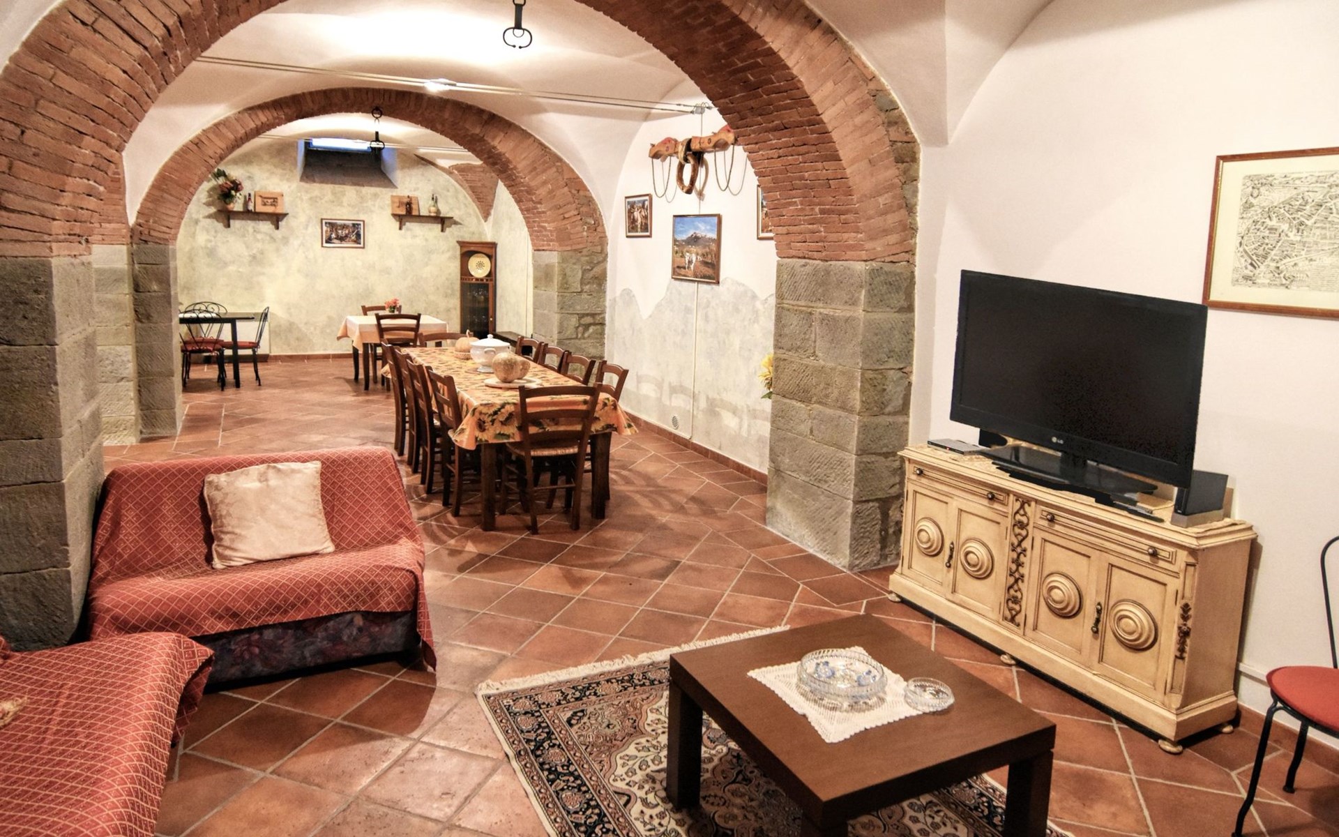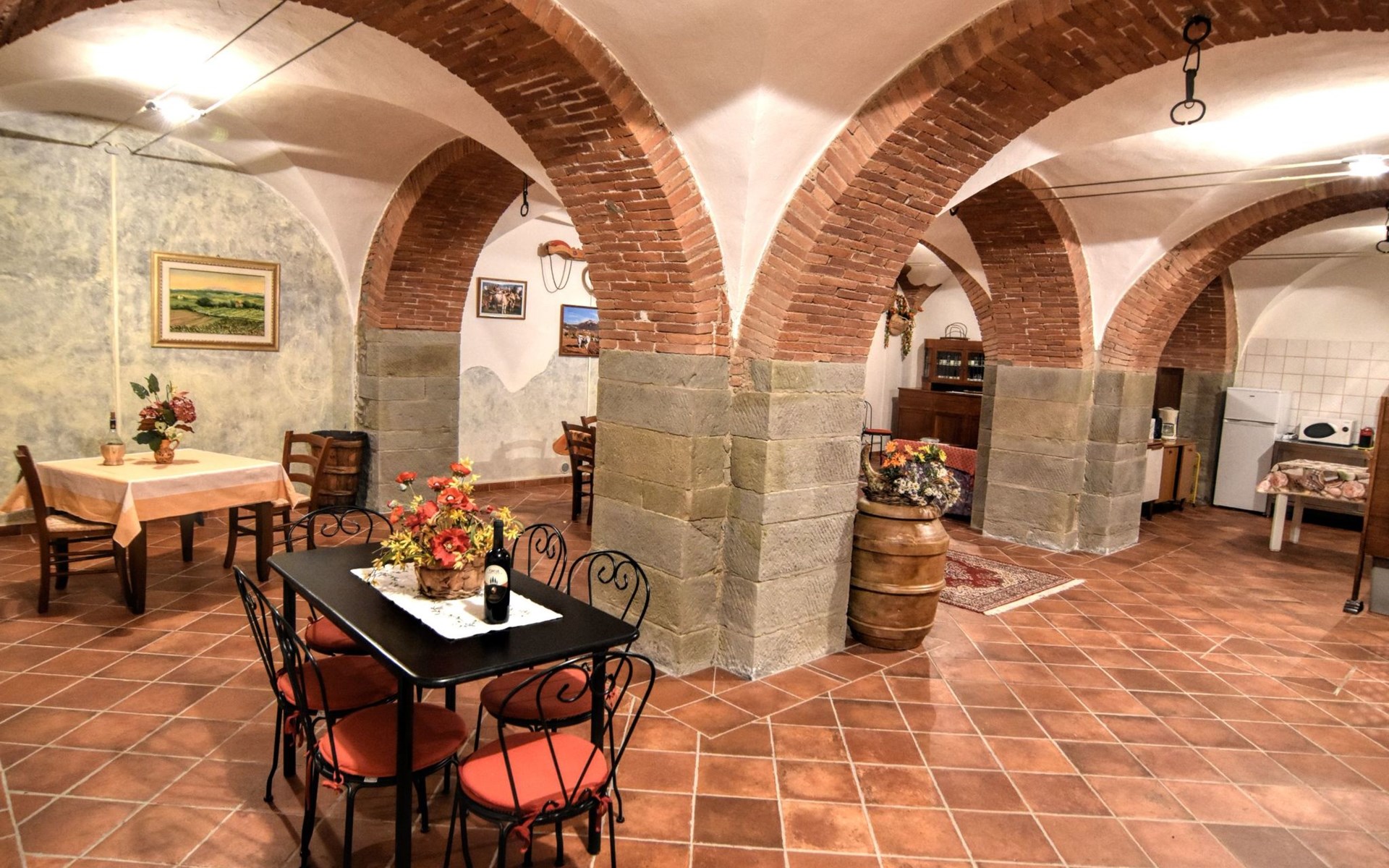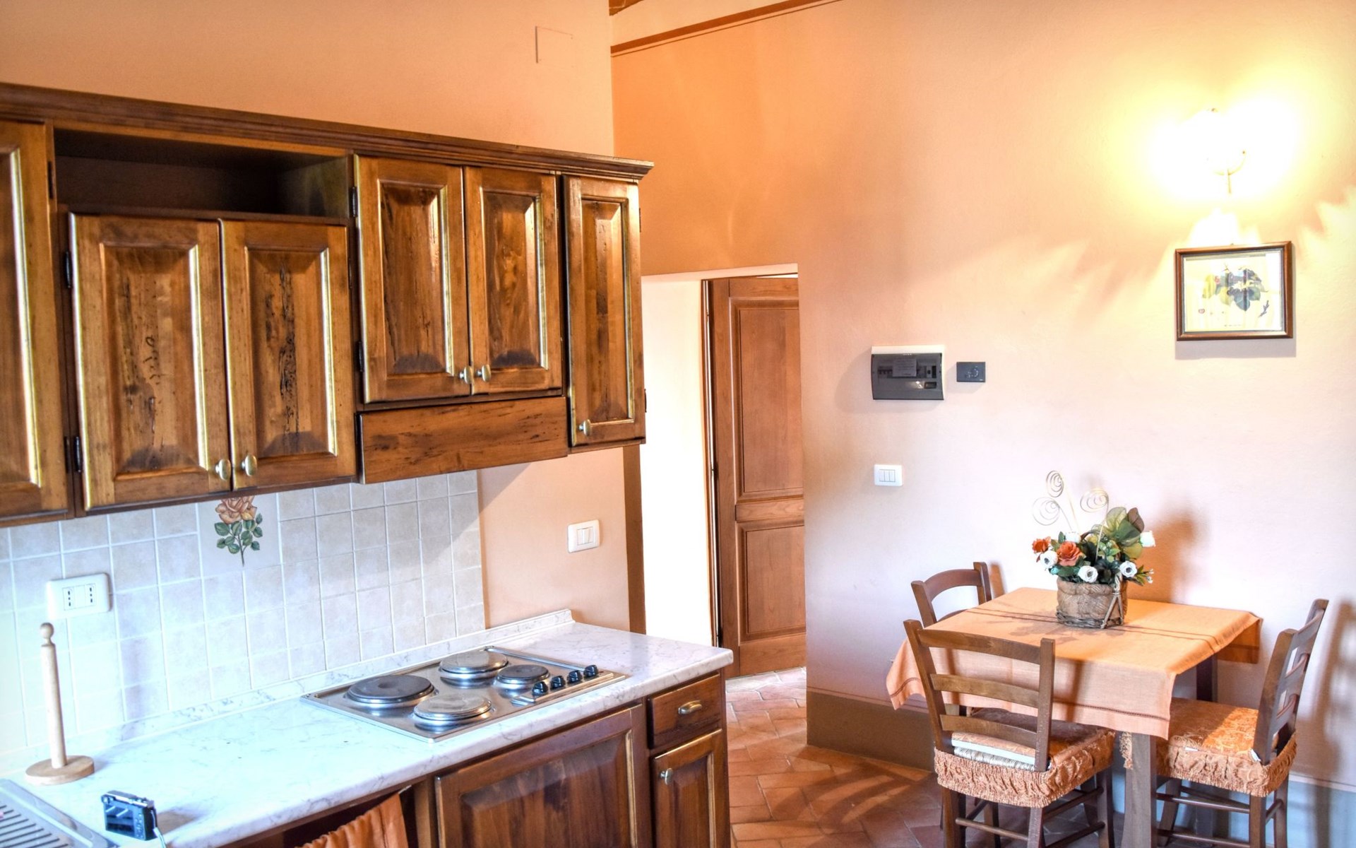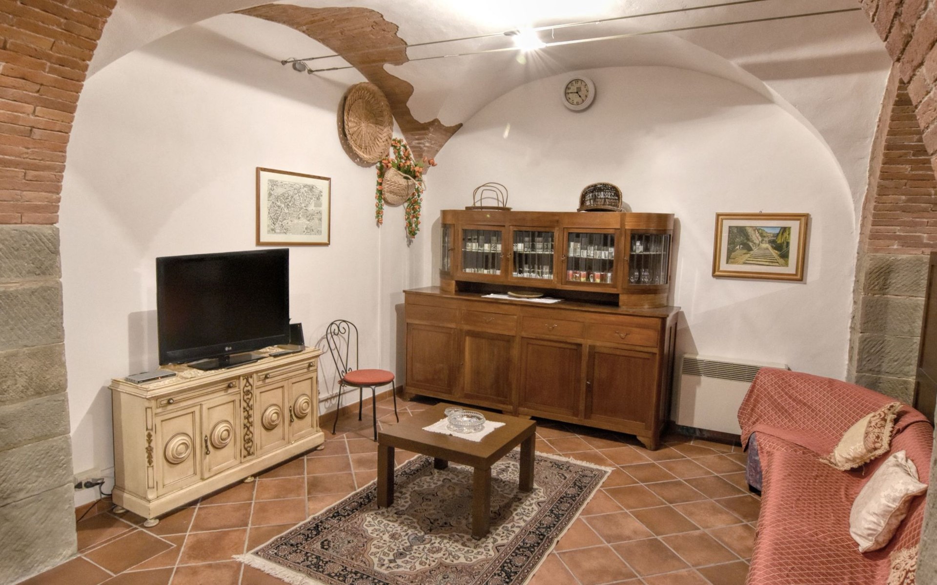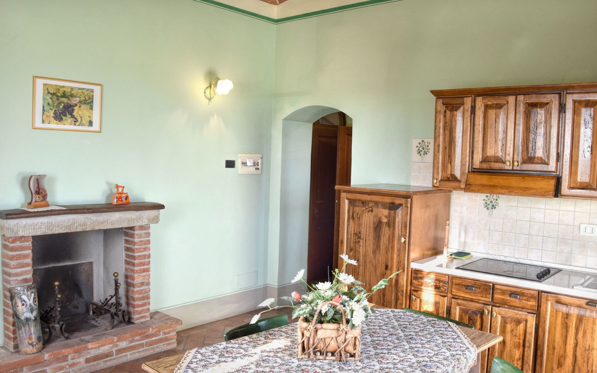 The Palazzo is situated in the Fratta region, a rural area in which a splendid chandelier – one of the most important examples of Etruscan civilization – was discovered. The path of Bonifica Leopoldina, from which you can enjoy a view of Cortona and the surrounding countryside, runs near to the Villa and can be explored on foot, by bicycle or on horseback.There are six apartments of various sizes, each of which contains antique furniture which fits harmoniously together with the vaulted ceilings, the terracotta-tiled floors and the arches, making the villa a beautiful and welcoming place to stay. The bedrooms are painted in warm colours matching the hues of the surrounding countryside. Air conditioning, satellite television and dishwashers are all available.The large garden, which surrounds The Palazzo, is equipped with chairs and tables, beach umbrellas, sunbeds, children’s games, bicycles, barbecue equipment and a beautiful swimming pool for the exclusive use of guests.The villa’s enchanting location, surrounded by orchards and farmland, makes it an ideal place for holidays, offering exquisite sunrises and breathtaking sunsets.Villa Il Palazzo is not far from the most beautiful towns and cities in Tuscany and Umbria, such as Florence, Siena, Arezzo, Pienza, Montepulciano, Montalcino, Lake Trasimeno, Perugia, Assisi, Gubbio, Orvieto, Spoleto, etc…. IT051017C23E6JCLDI